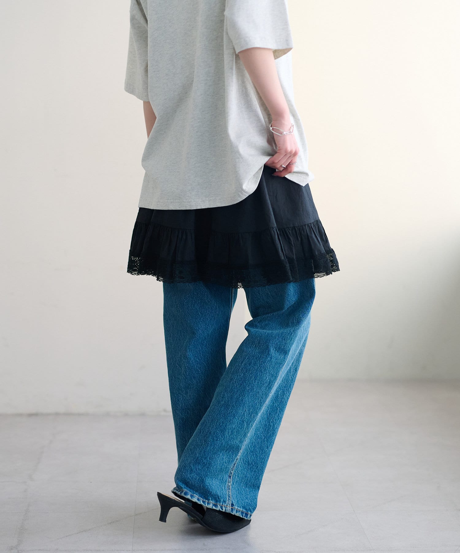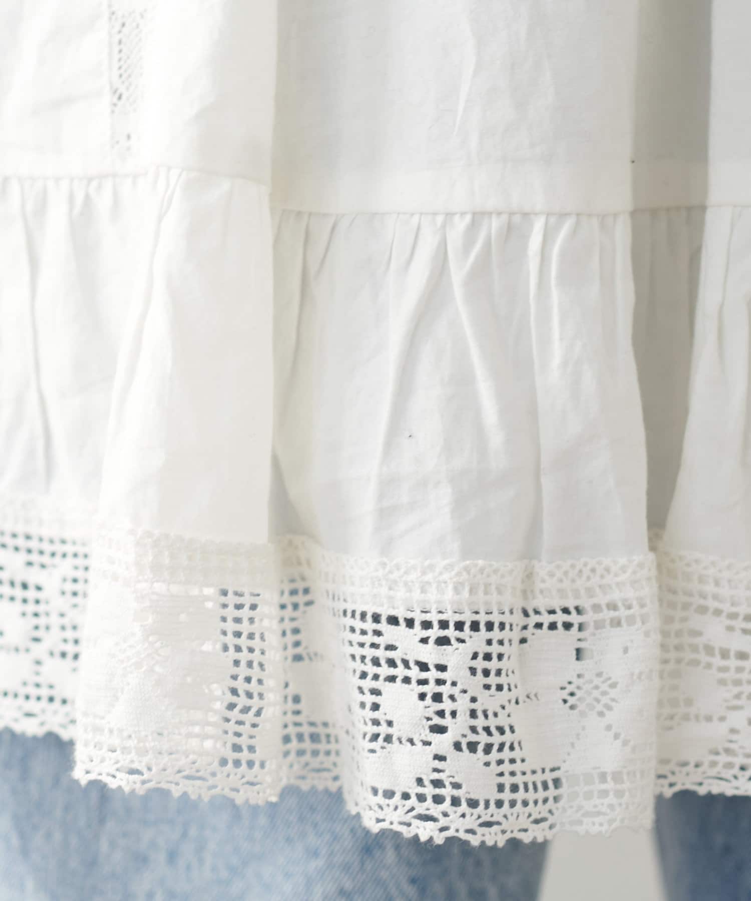 ふわりと広がるフレアなシルエットと、裾の繊細なレースのデザインが華やかさをプラス〇