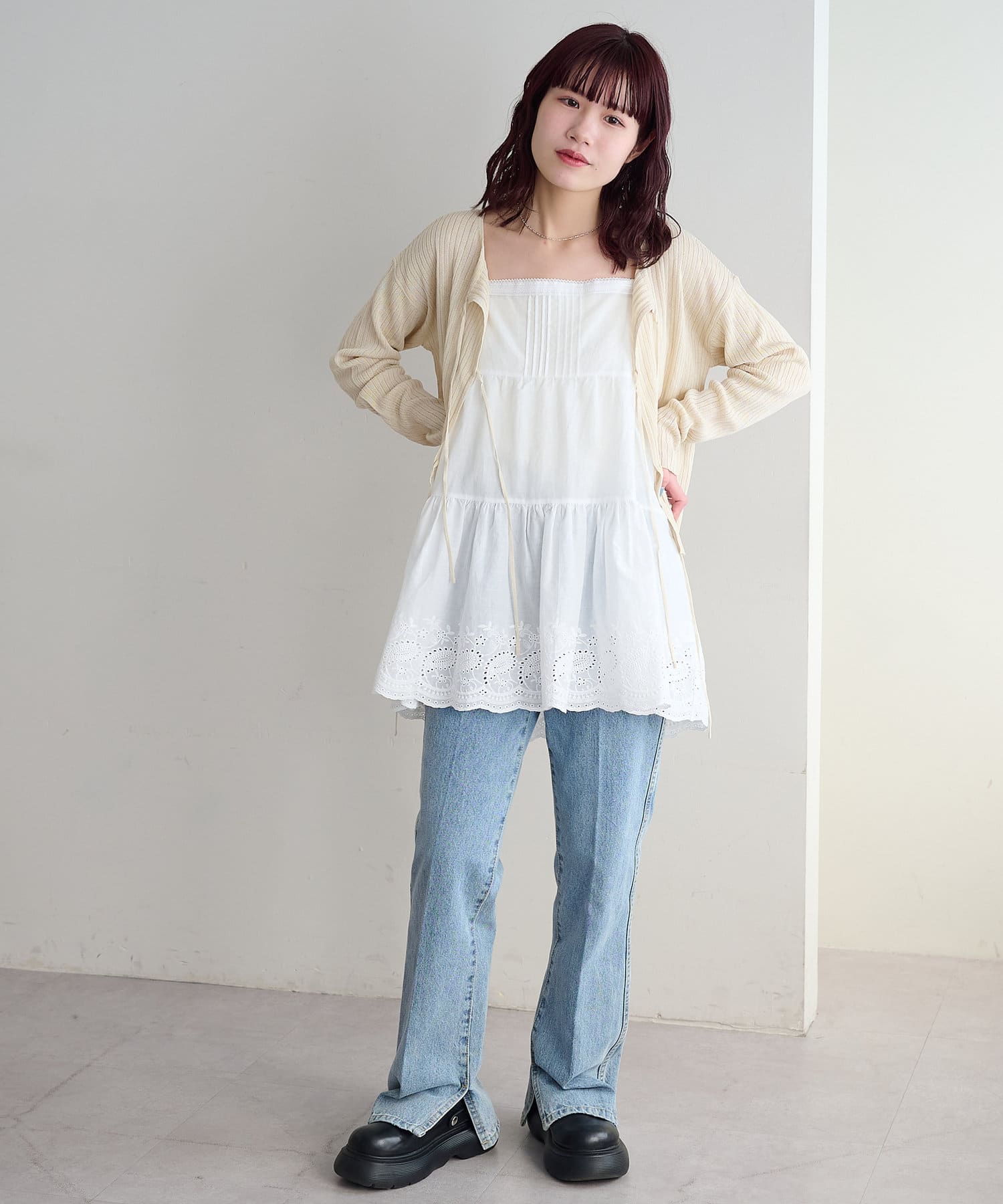 フロッキーメッシュのインナーやカーディガンとレイヤードして着ようと思います。