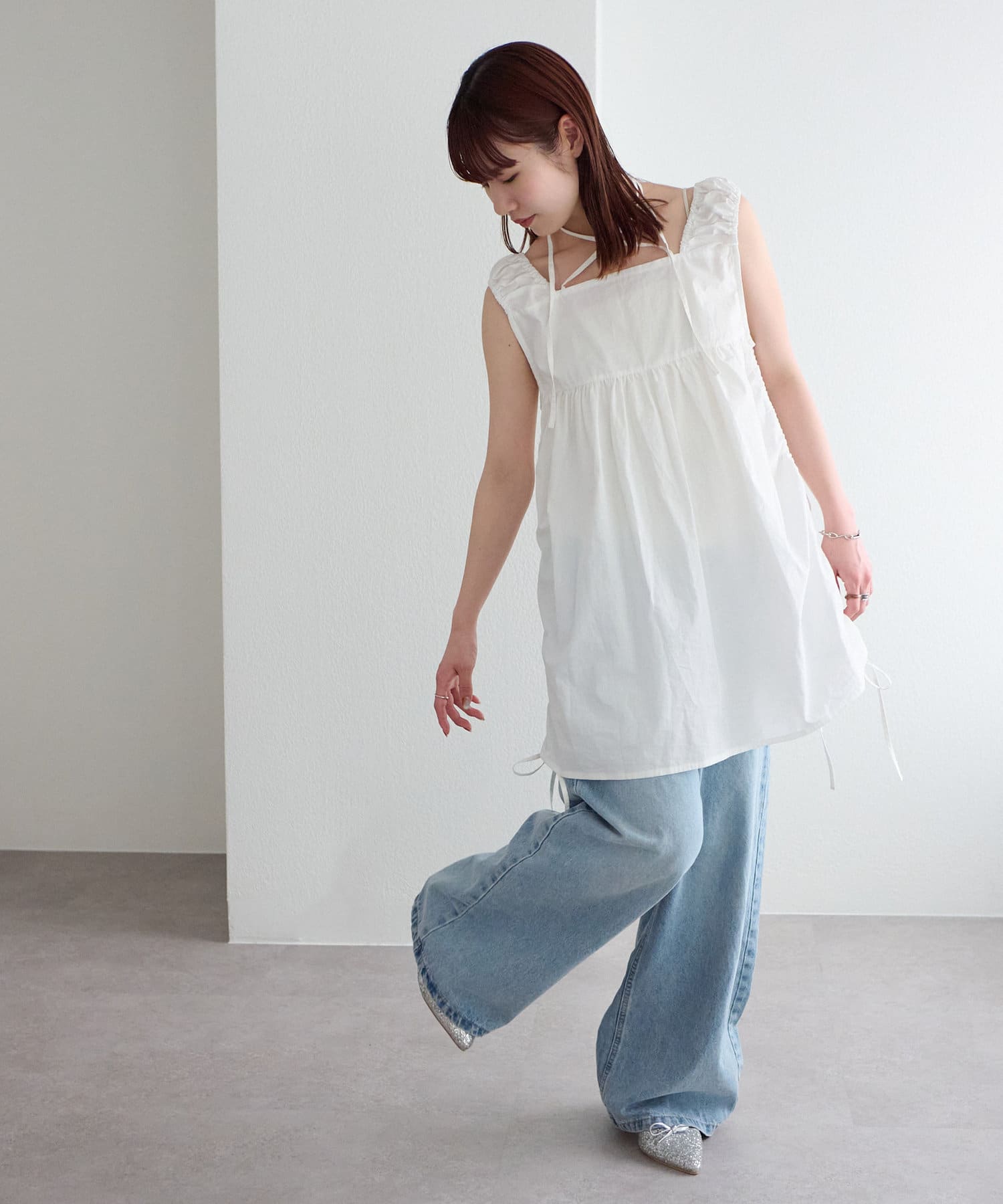デザイン性のあるワンピースなので、カップ付きインナーやタンクトップを合わせて、一枚で着ても◎