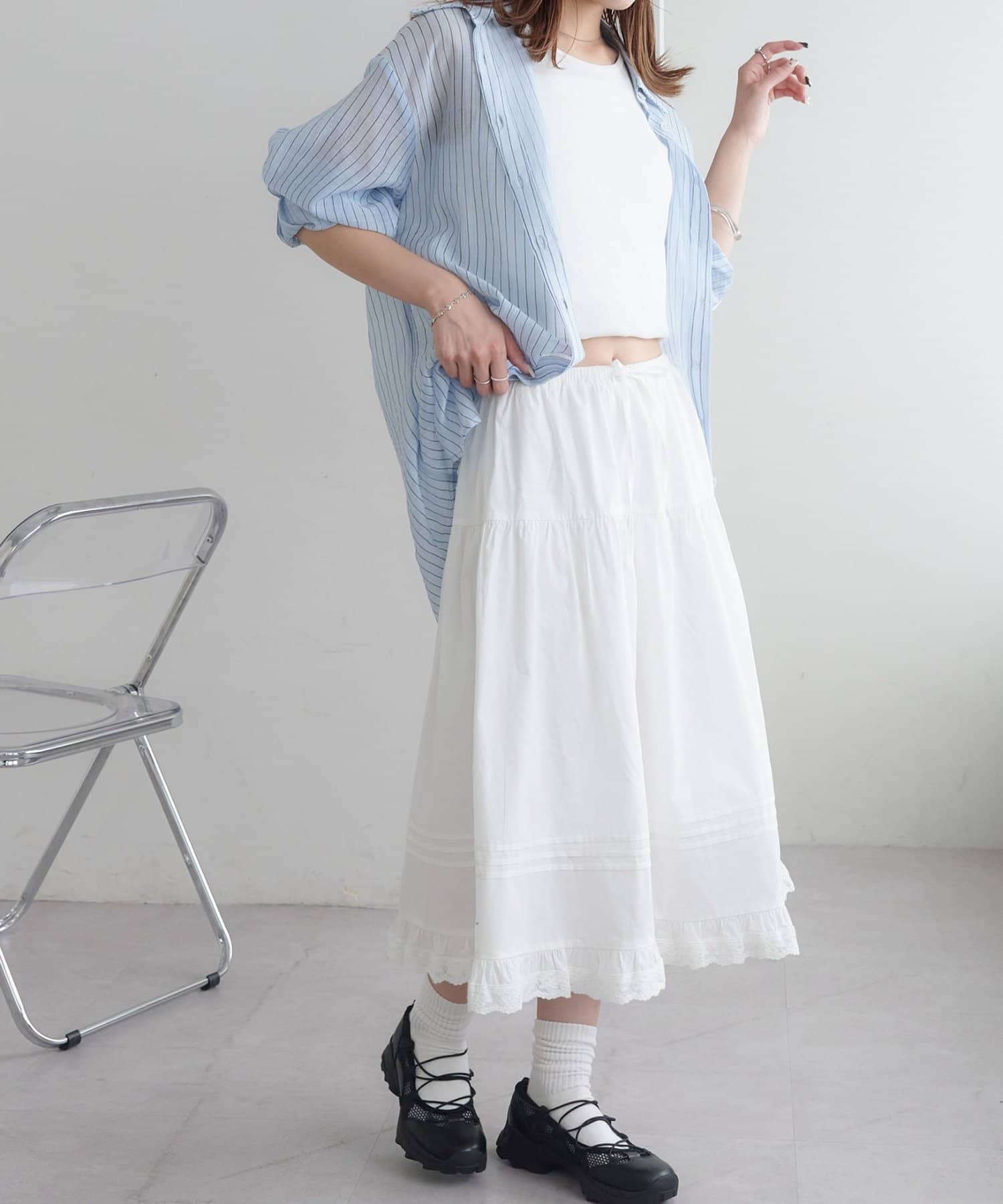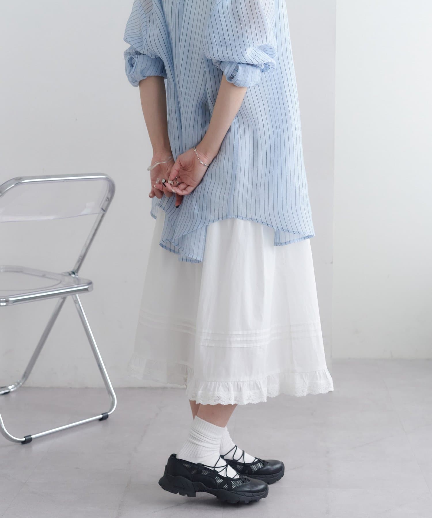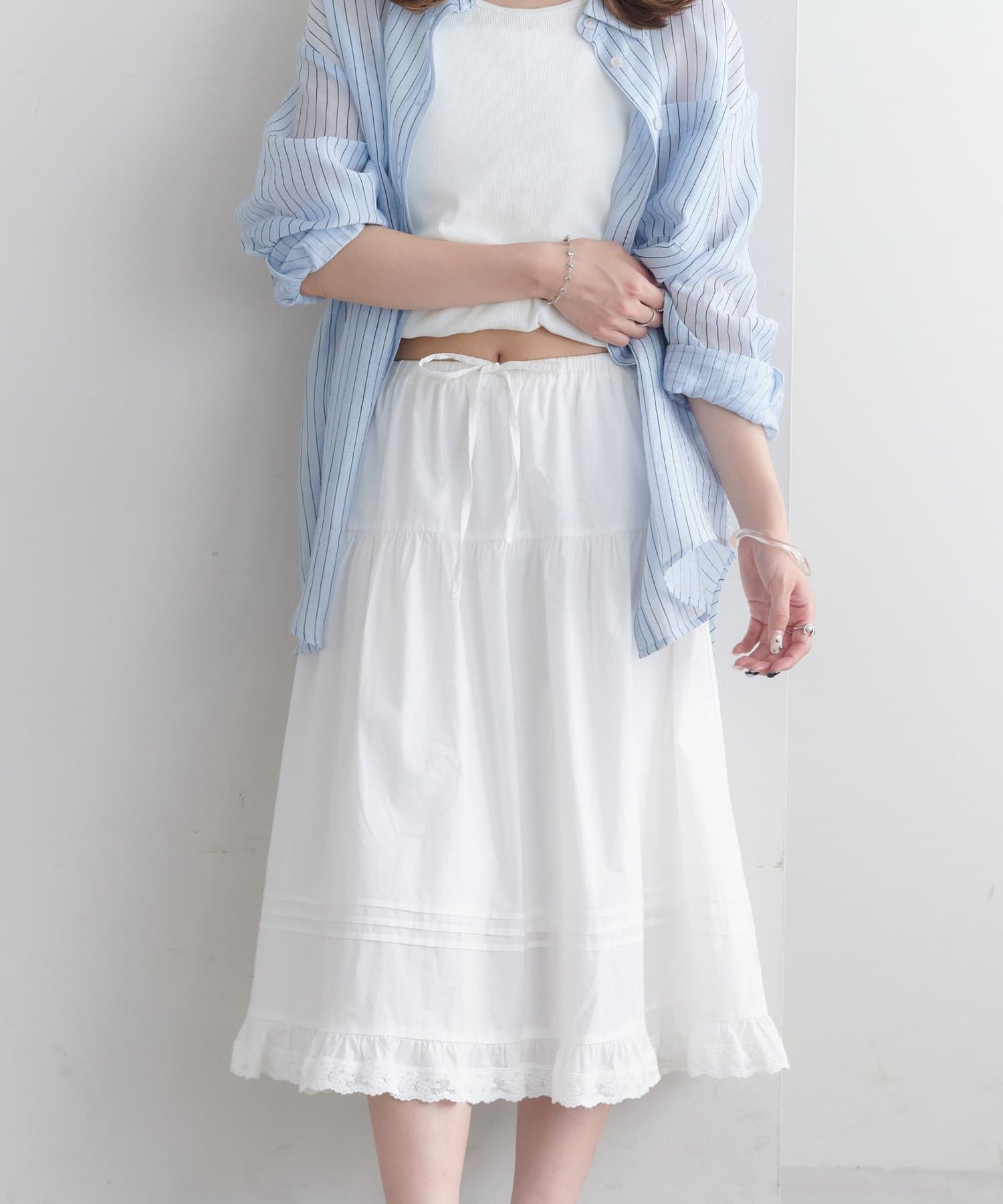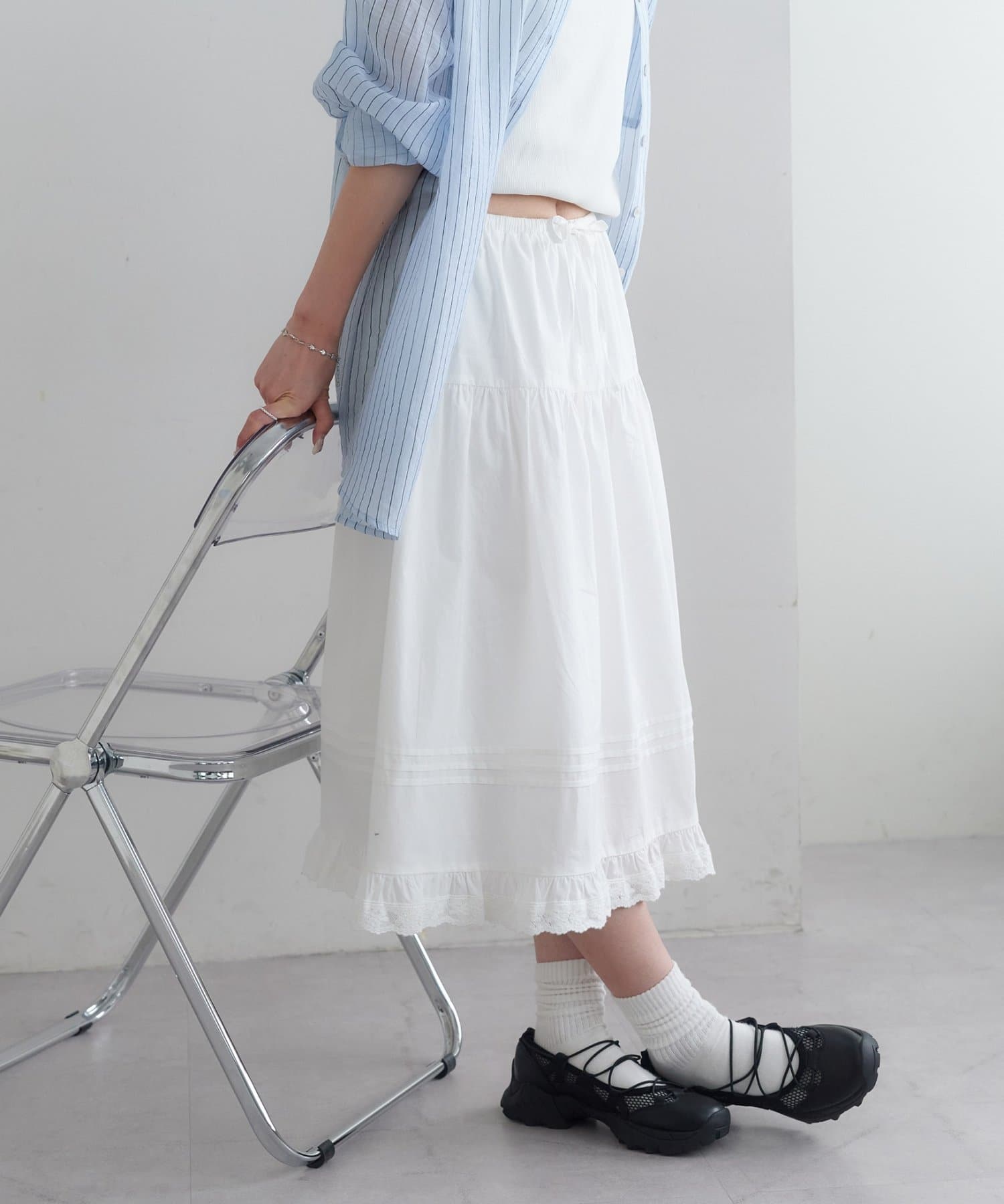 裾のレースディテールが全体の印象をぐっとフェミニンに