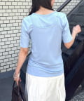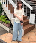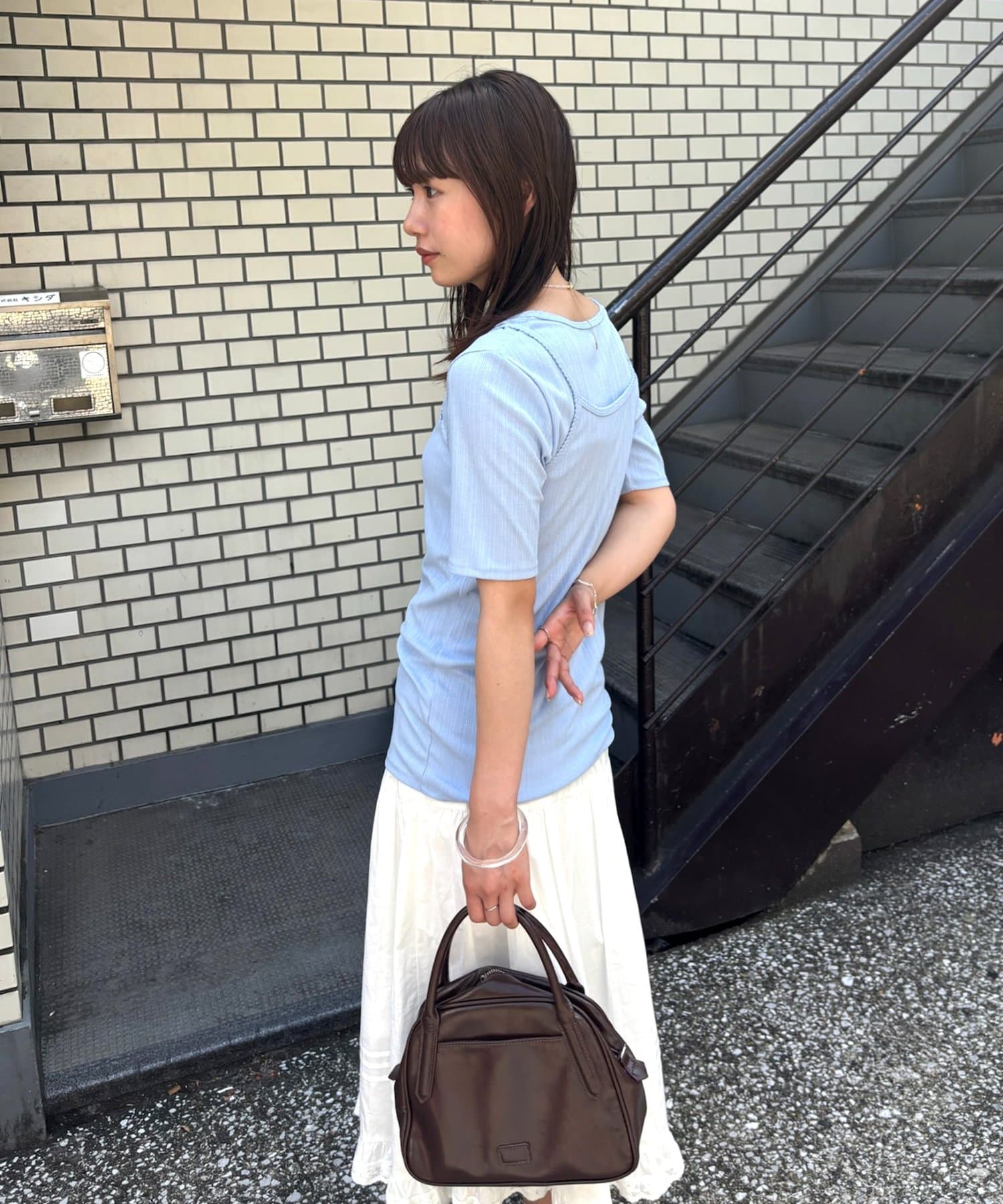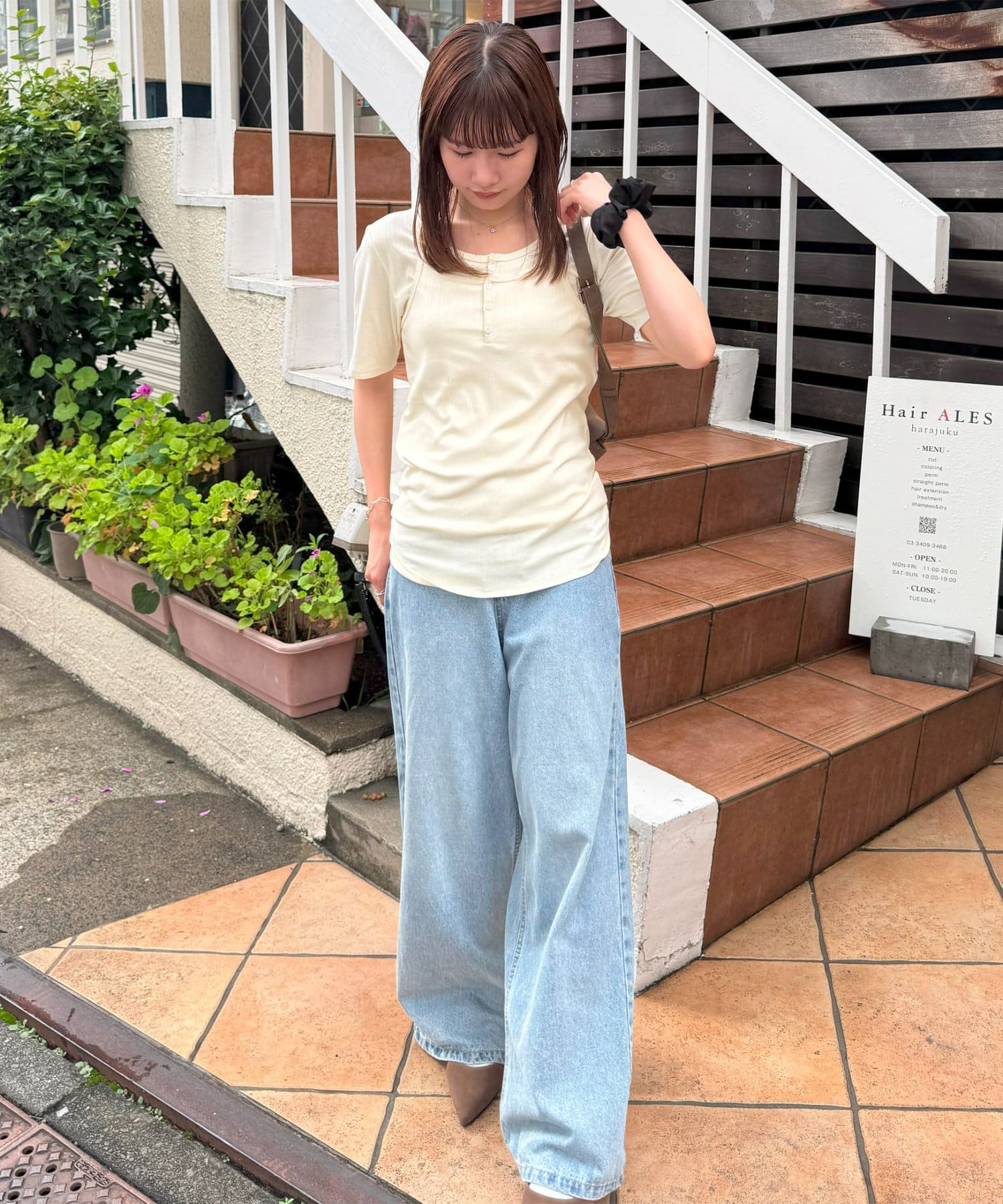 やや長めの丈感なので、裾をルーズにたゆませるとこなれた雰囲気になります。