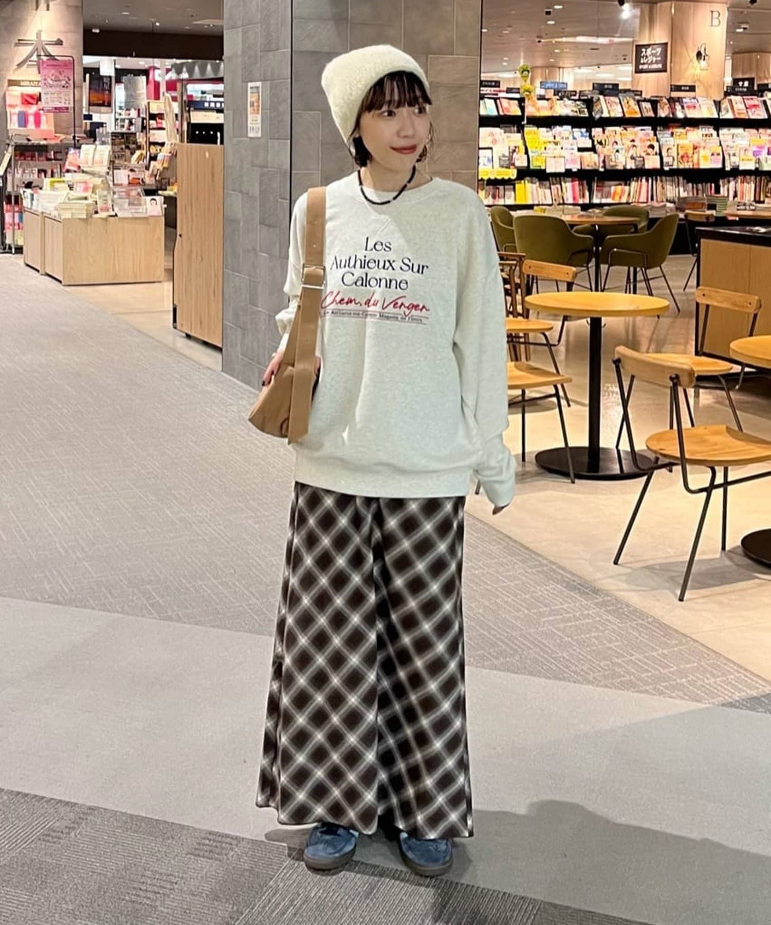 スウェットやニット、ショート丈のトップスを合わせれば、一気に韓国っぽムードに。