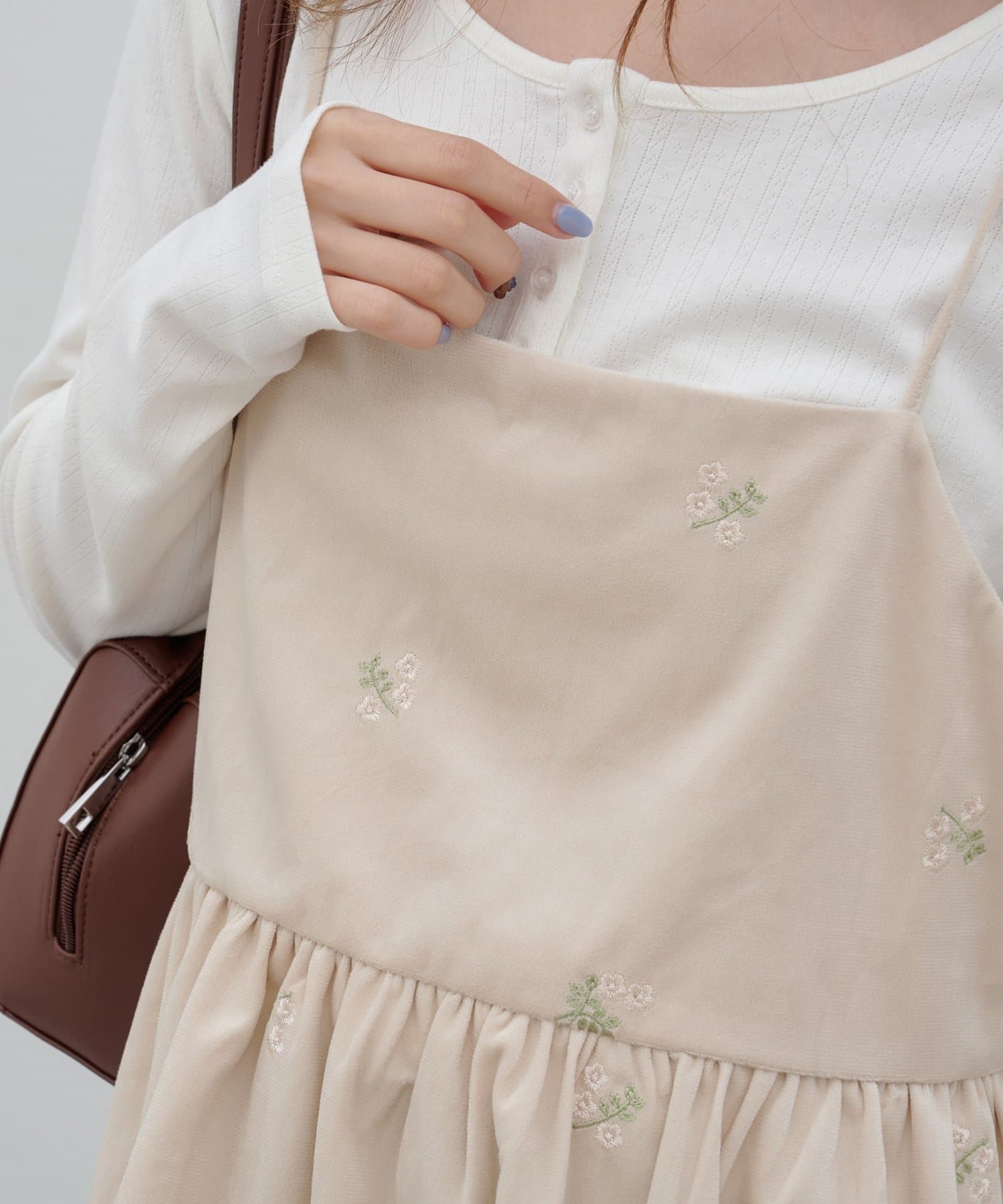 152cmスタッフ:柔らかく上品なベロアが可愛い♡お花の刺繍が入っているので、上からジャケットやカーディガンを羽織っても、コーディネートのポイントになるので、秋冬に活躍しそうです!