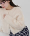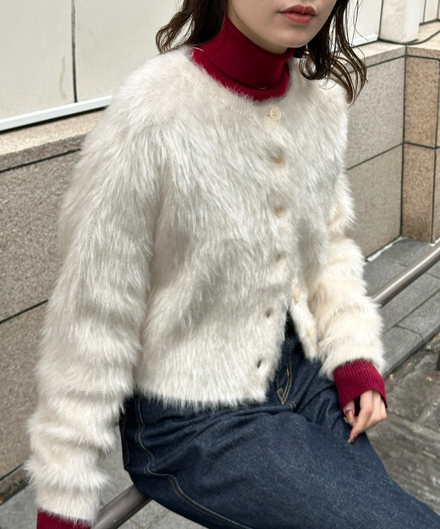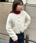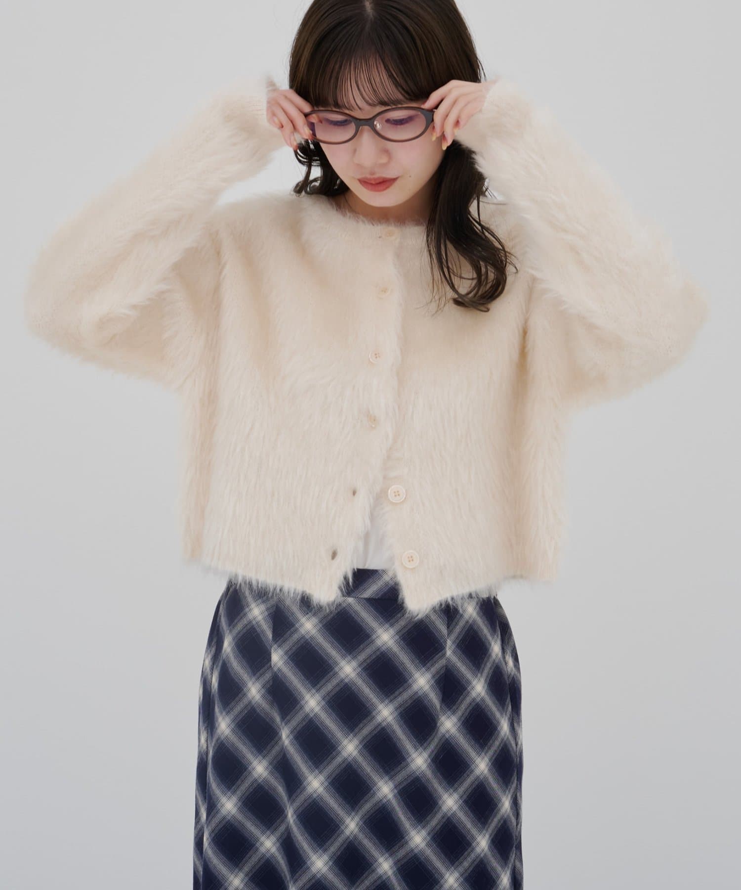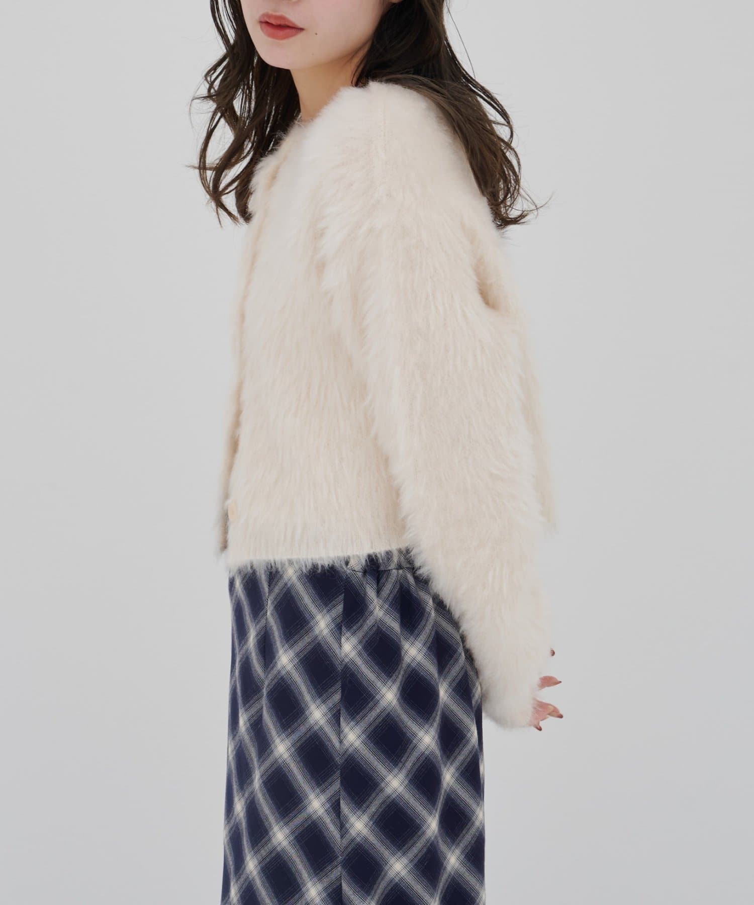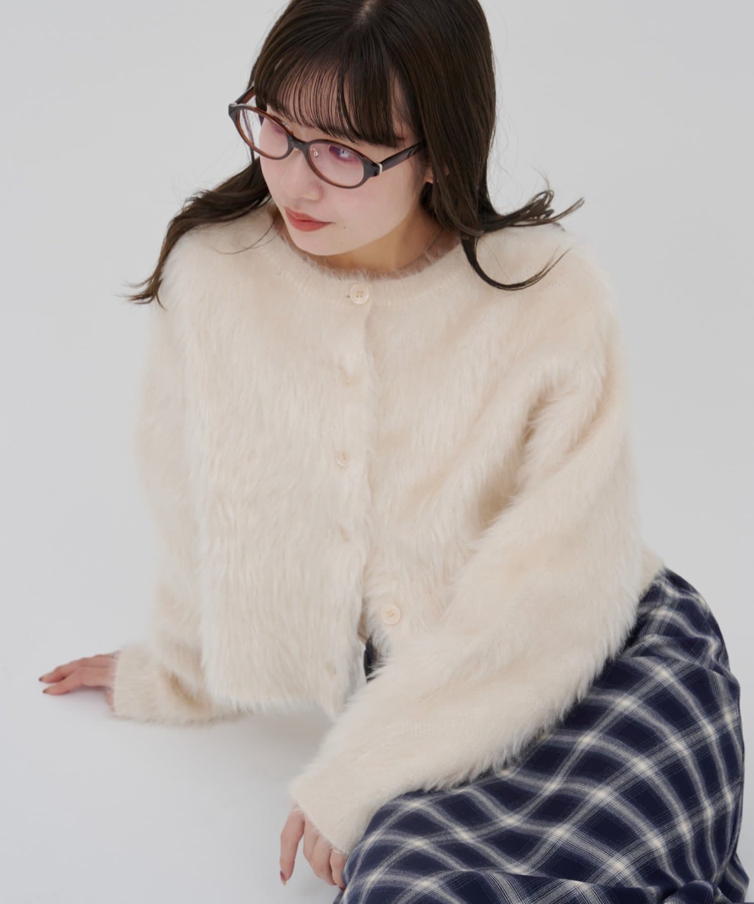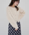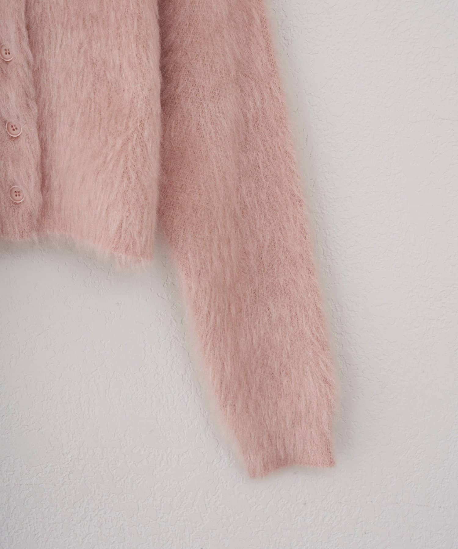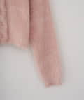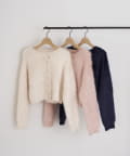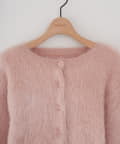 ふわふわのフェザーヤーンにラメ糸をミックスした、華やかで女性らしいカーディガン。