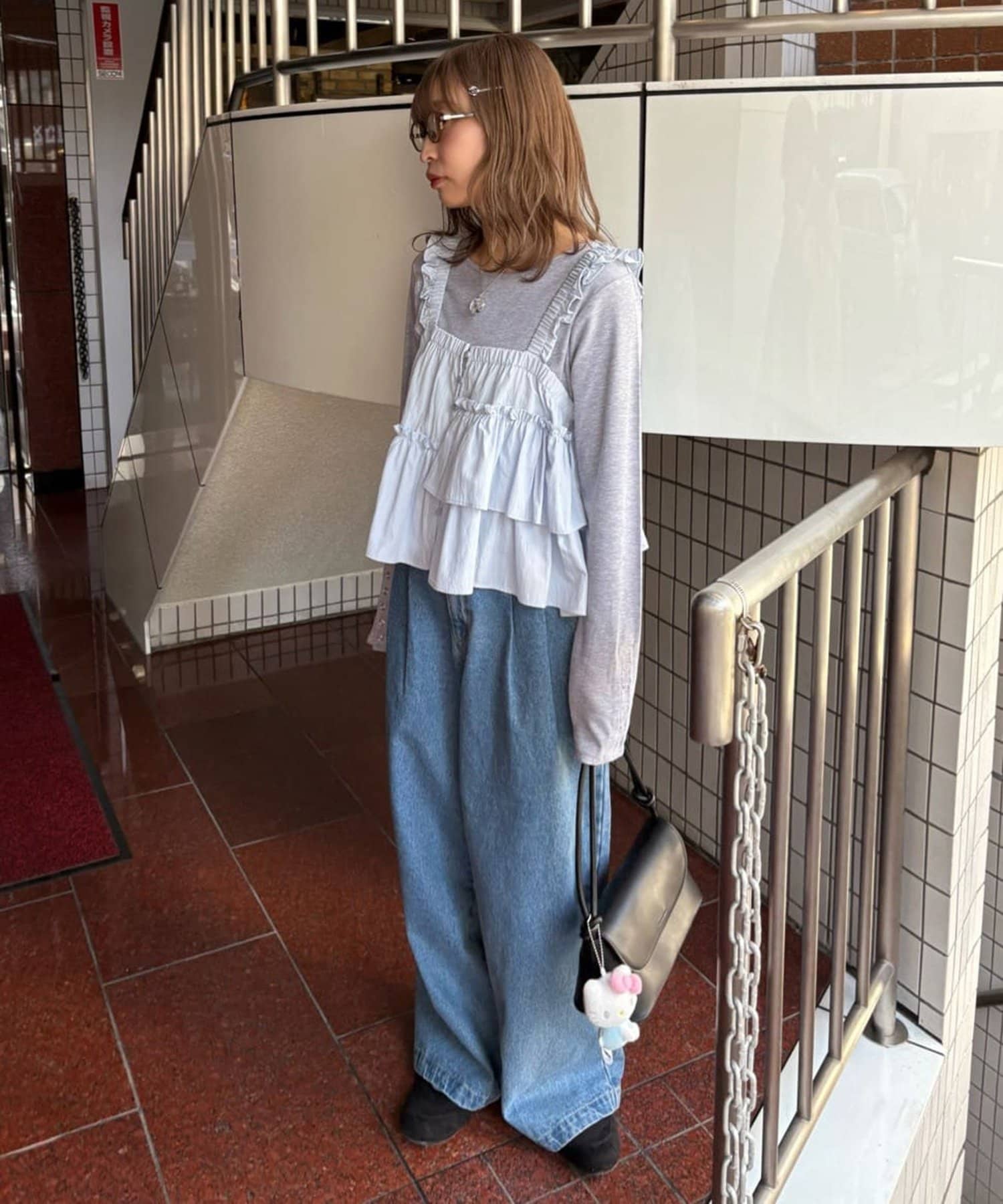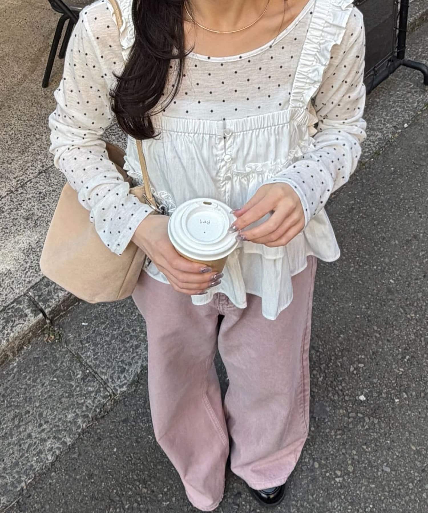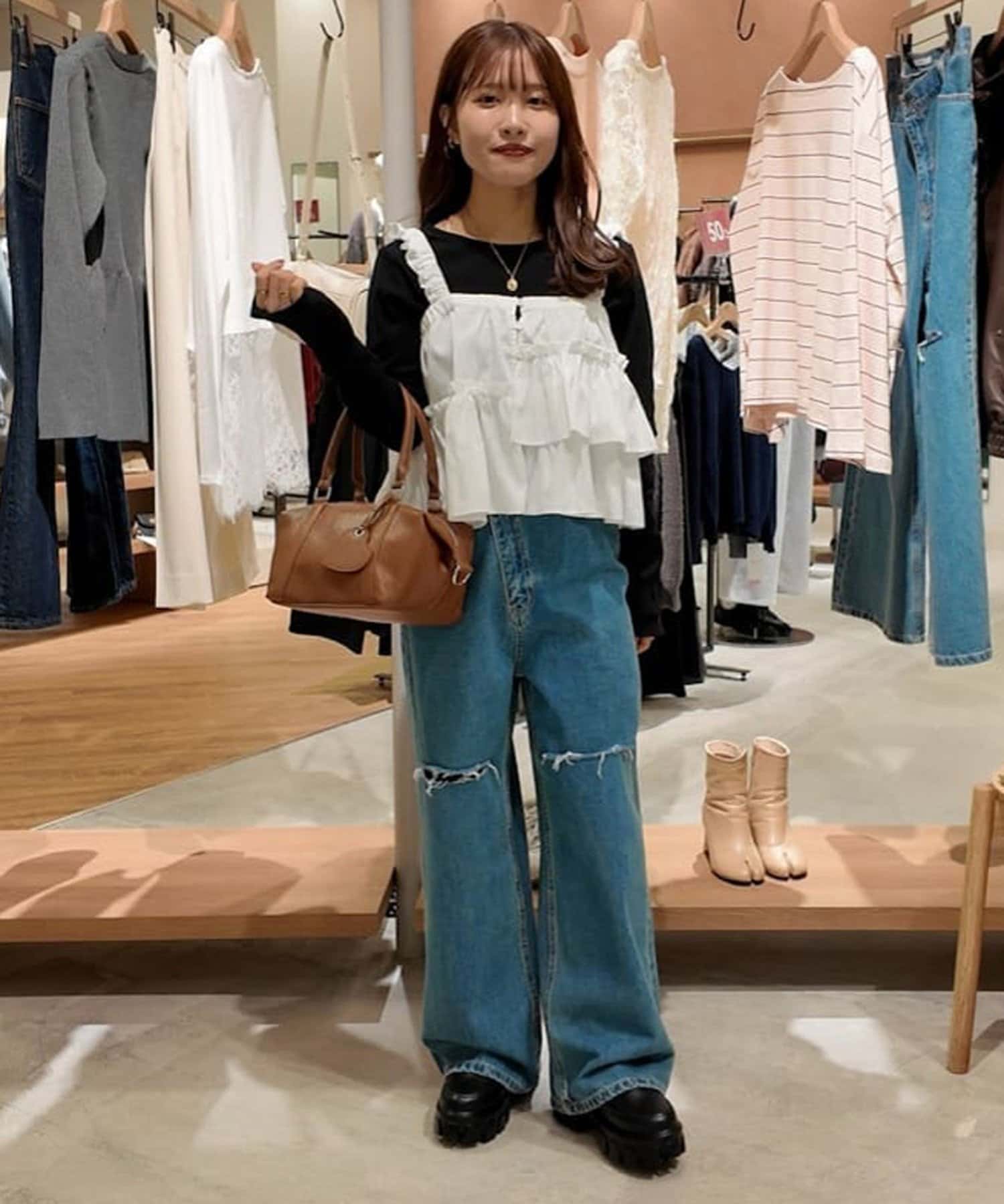 149cmスタッフ:コンパクトな着丈なので、低身長でも合わせやすいです。フリルですが、アシンメトリーになっていることで、ボリューム感はあまり気になりません!ハイウエストで着られるボトムスと合わせてすっきりとしたコーデにしたいです◎