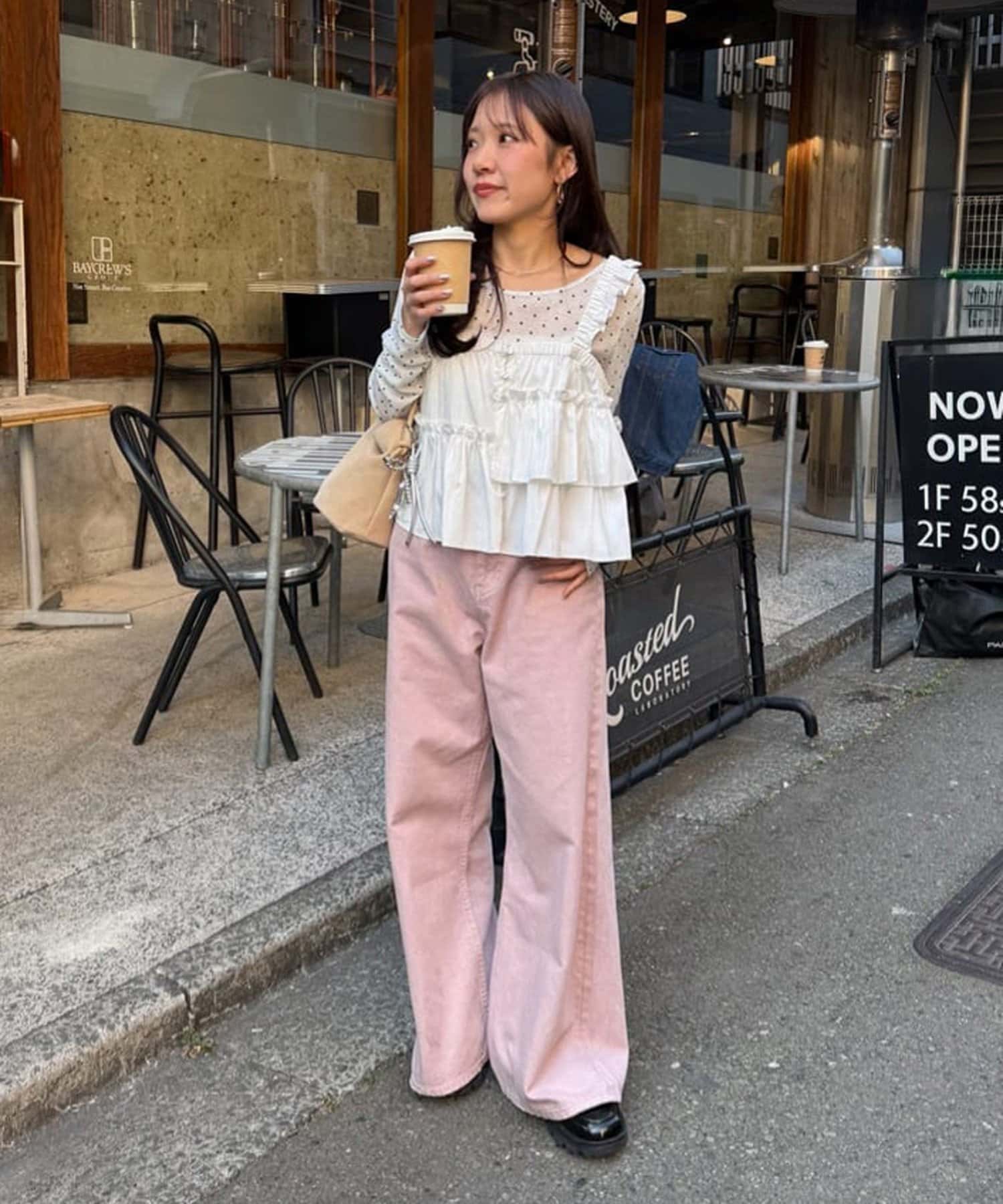160cmスタッフ:一見甘めに見えますが、スウェットパンツやデニムを合わせたら、カジュアルダウンして甘さが抑えられます◎腰回りは隠れない着丈ですが、フリルの立体感があるので、メリハリが出て気になりにくいです◎