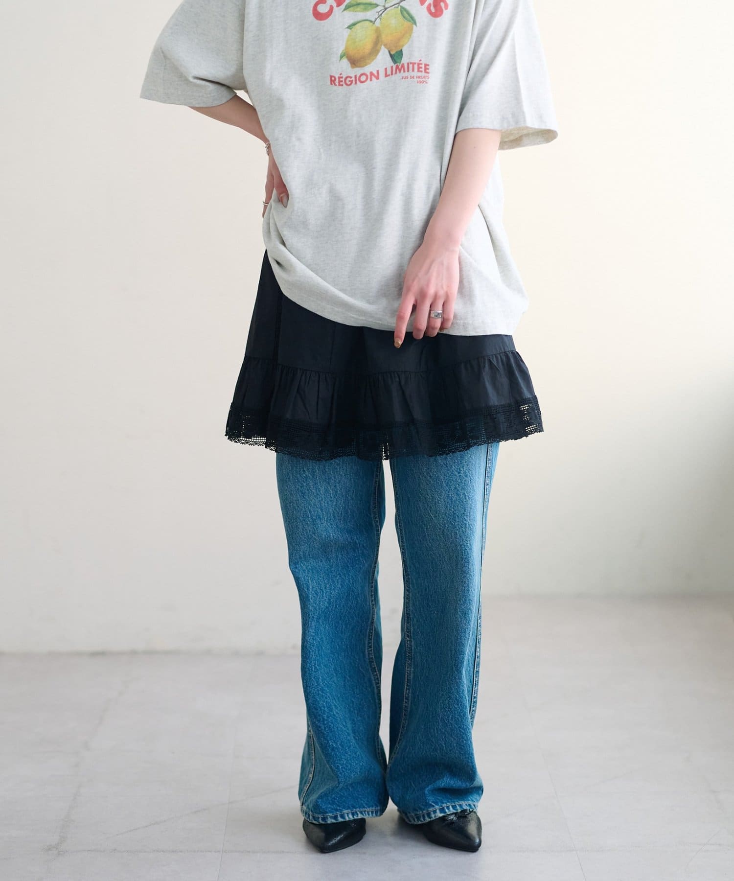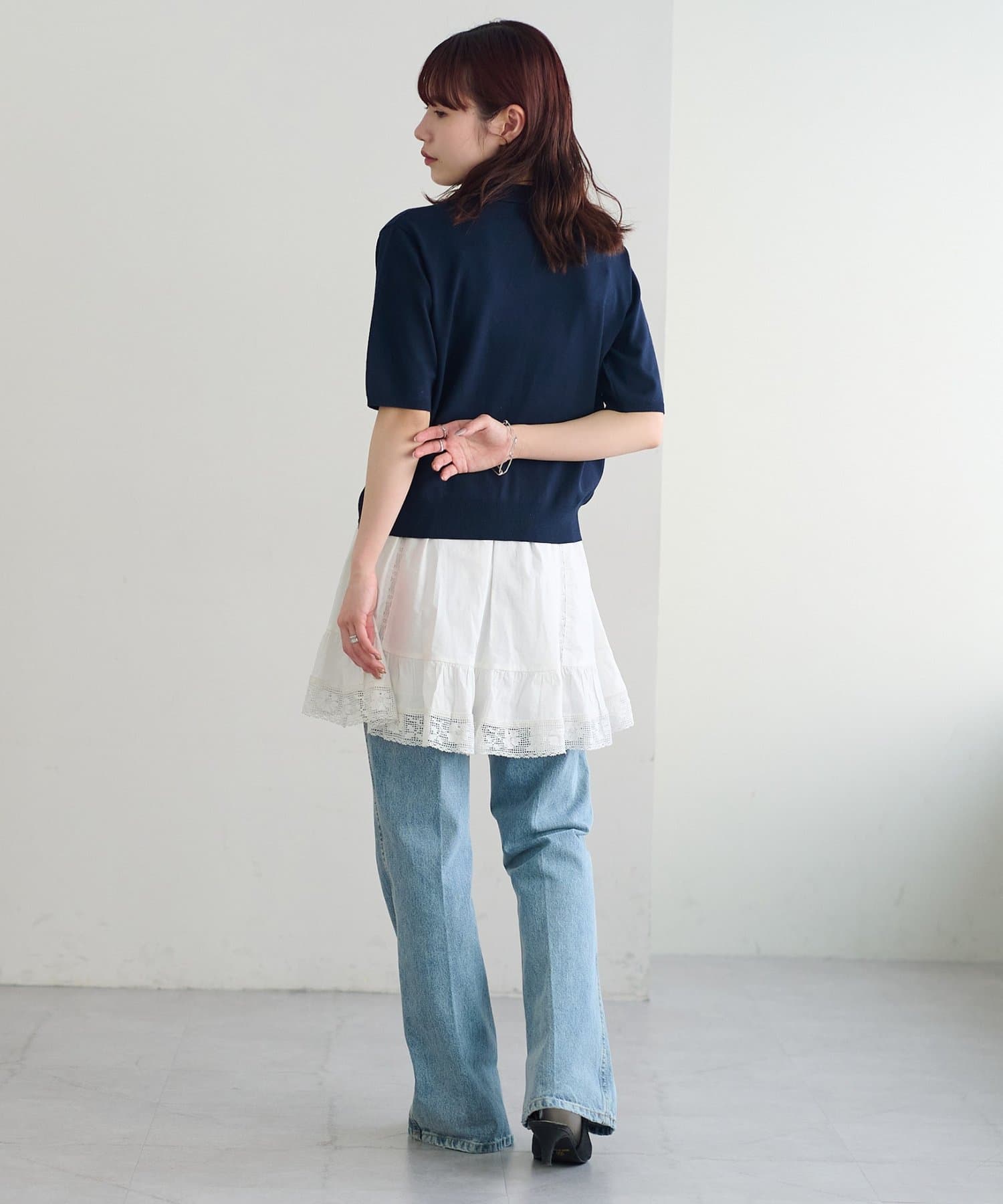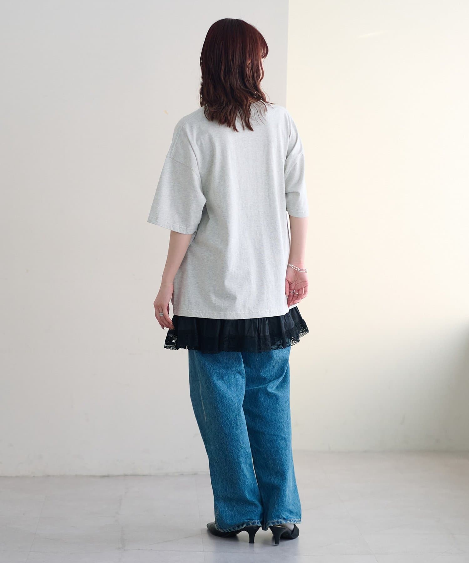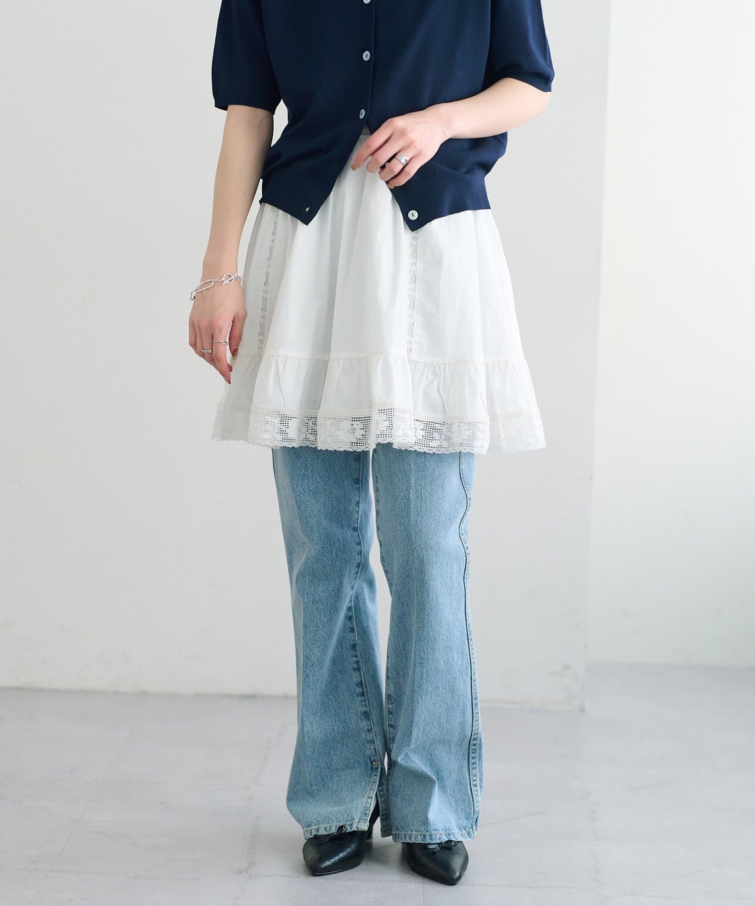 ふわりと広がるフレアなシルエットと、裾の繊細なレースのデザインが華やかさをプラス〇