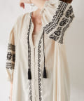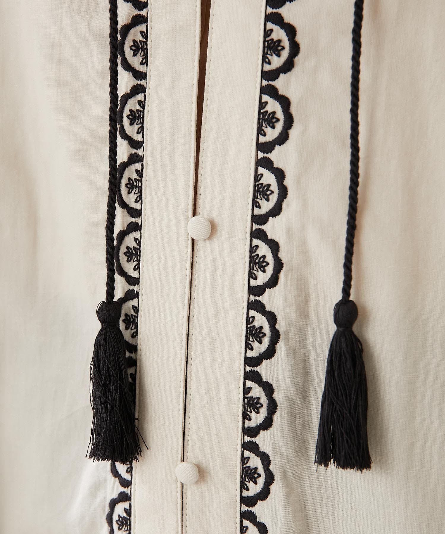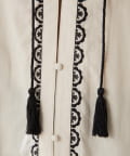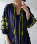 配色の刺繍模様を取り入れた、シーズンムードを盛り上げるワンピース。ゆったりとしたシルエットに、ドロップショルダーがリラックス感のある仕上がり。襟元にあしらわれたタッセルが、華やかなアクセントをプラスします。一枚着はもちろん、羽織としてもご活躍頂けるアイテム。暑さが残る時期から着用しやすいさらりとした素材感で、ワードローブにぴったりです♪