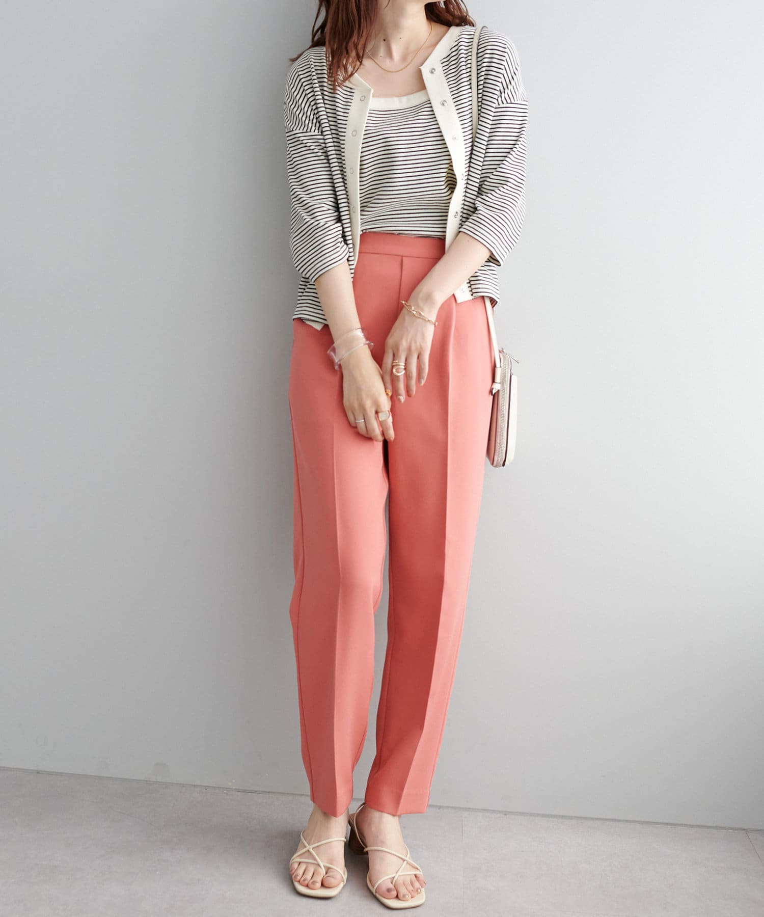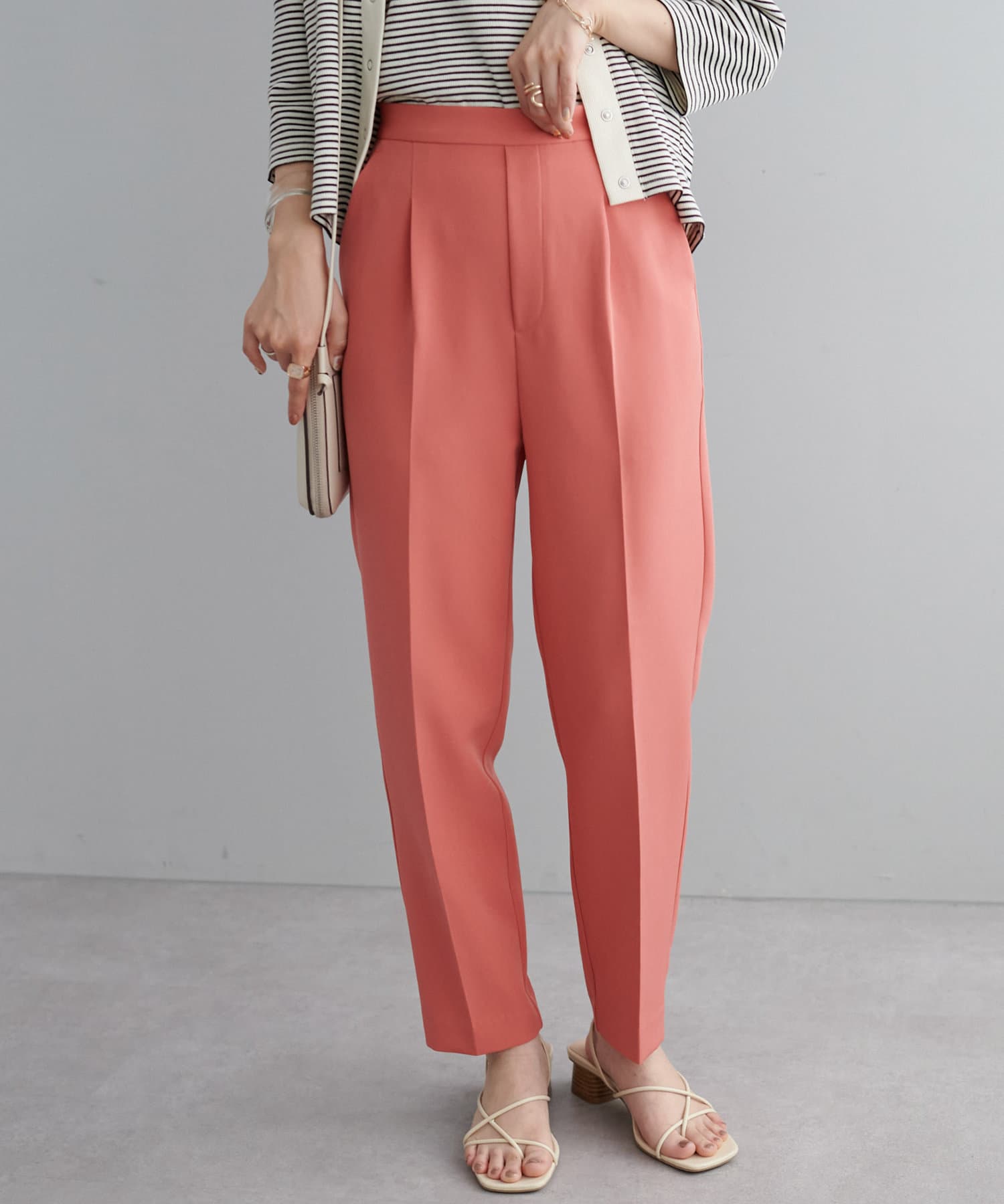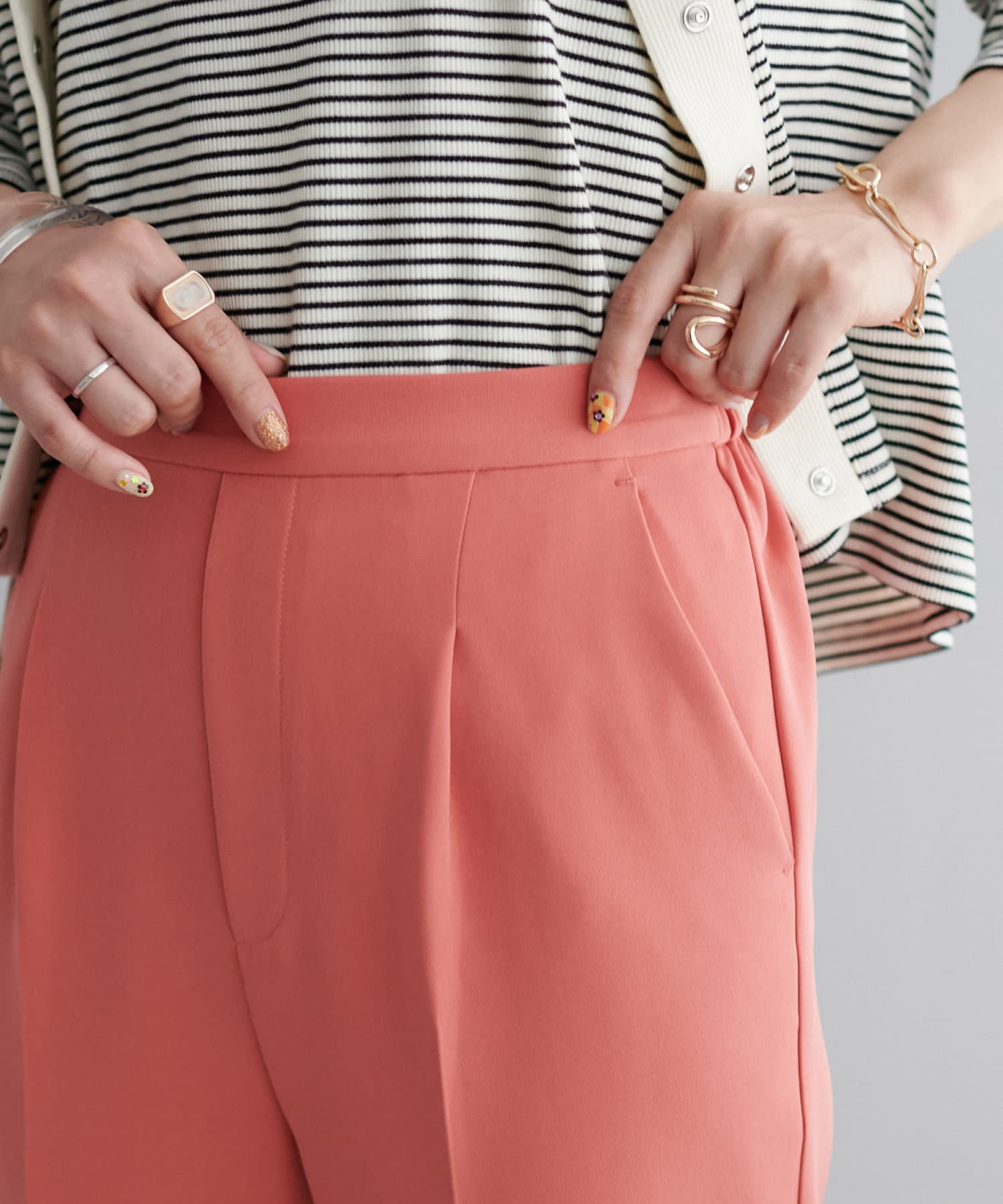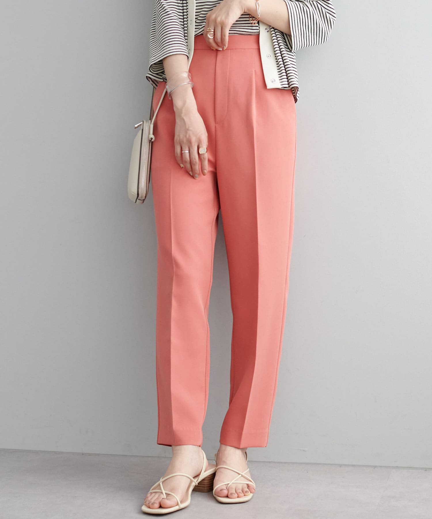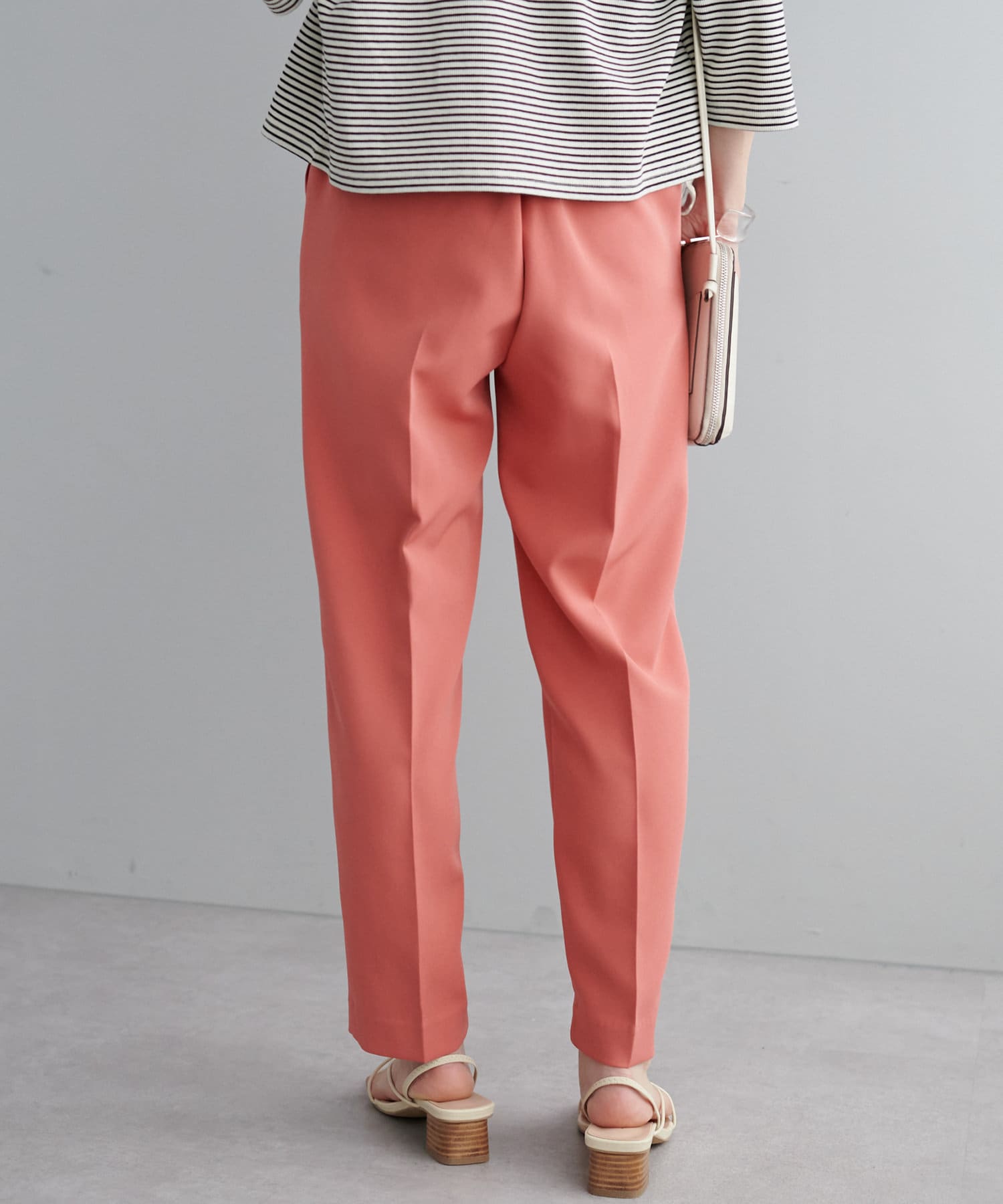 センタープレスを施した、すっきりとした印象のテーパードパンツ。足首にかけて細身になるシルエットが、穿くだけでスタイルアップ効果抜群です◎ウエストはバックゴム仕様で、リラックスした穿き心地も魅力。合わせるトップス次第で、幅広いスタイリングでご活躍頂けるアイテムです。ベーシックカラーに加え、アクセントになるサーモンピンクとピスタチオをご用意しました♪