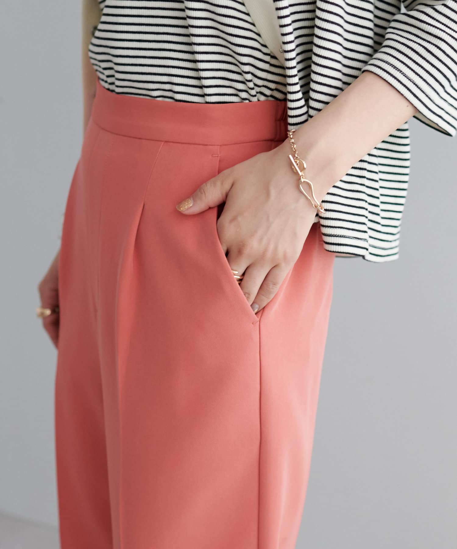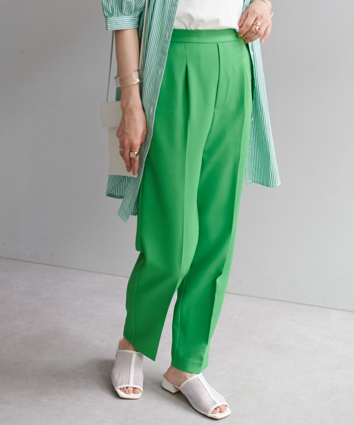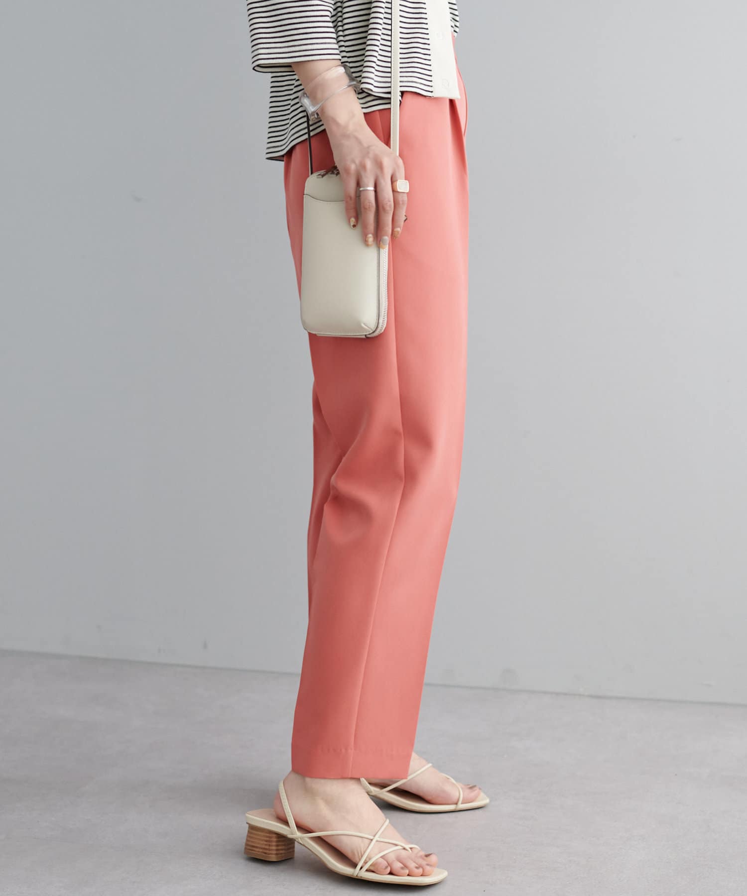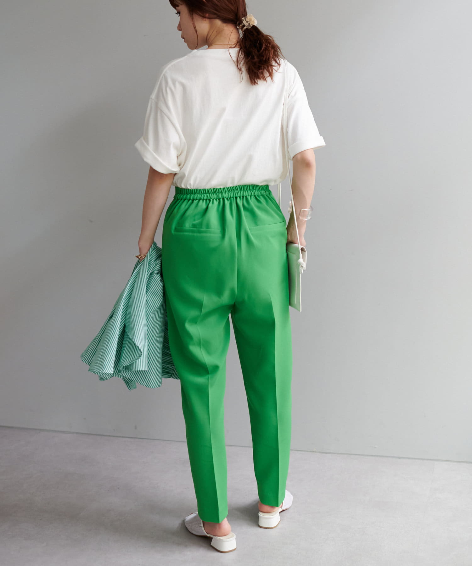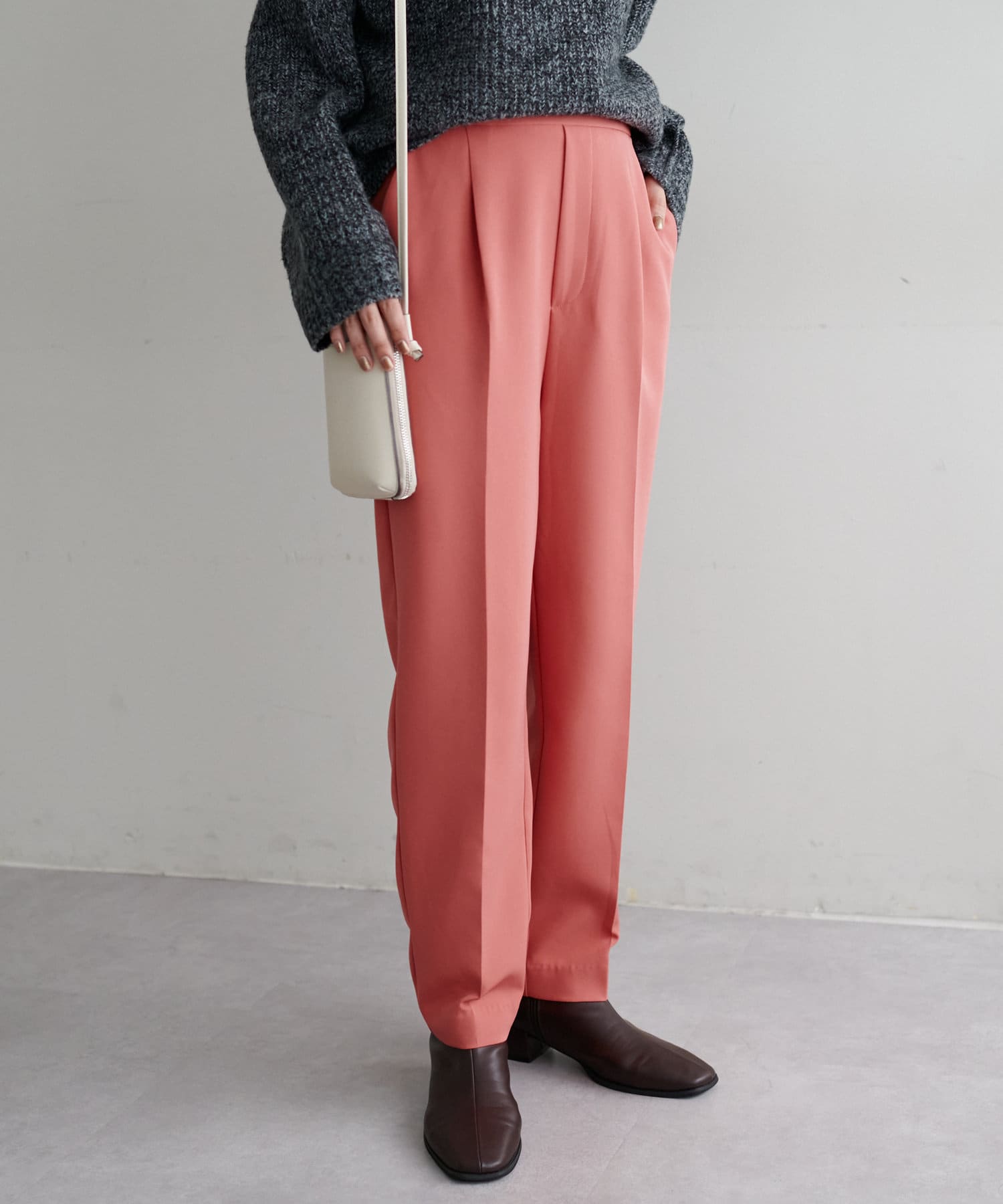 センタープレスを施した、すっきりとした印象のテーパードパンツ。足首にかけて細身になるシルエットが、穿くだけでスタイルアップ効果抜群です◎ウエストはバックゴム仕様で、リラックスした穿き心地も魅力。合わせるトップス次第で、幅広いスタイリングでご活躍頂けるアイテムです。ベーシックカラーに加え、アクセントになるサーモンピンクとピスタチオをご用意しました♪
