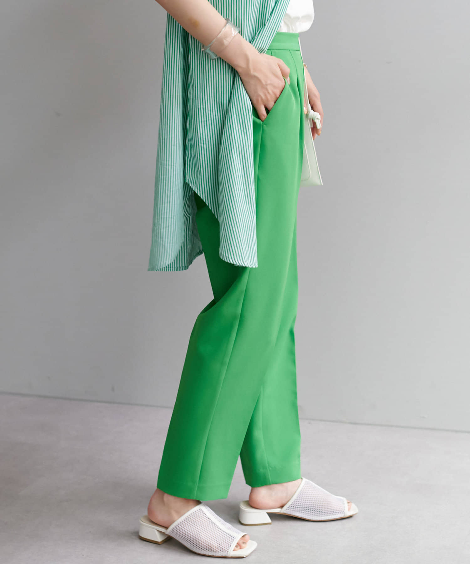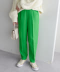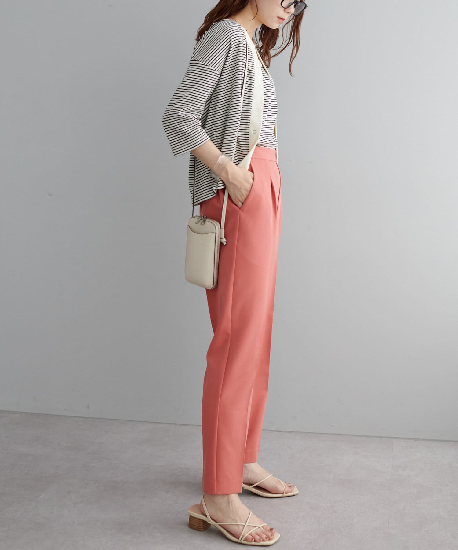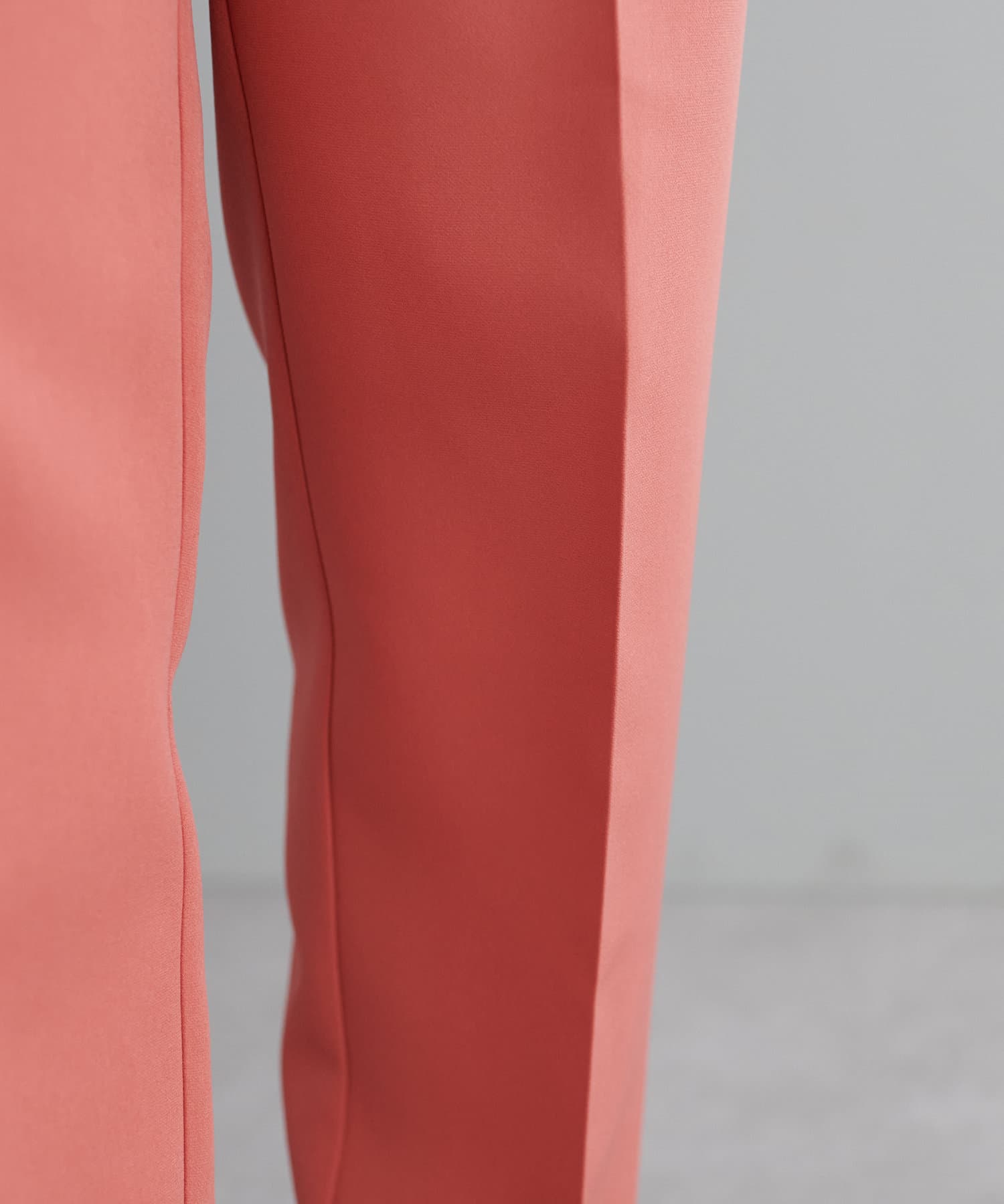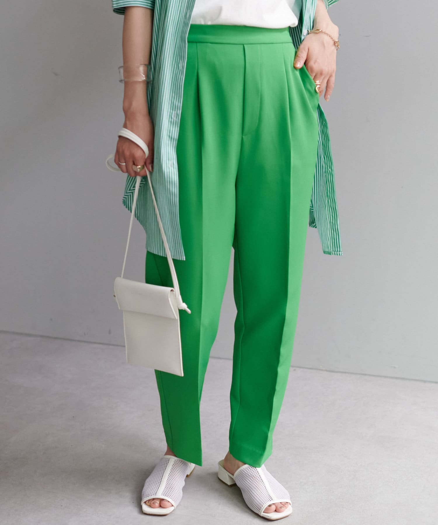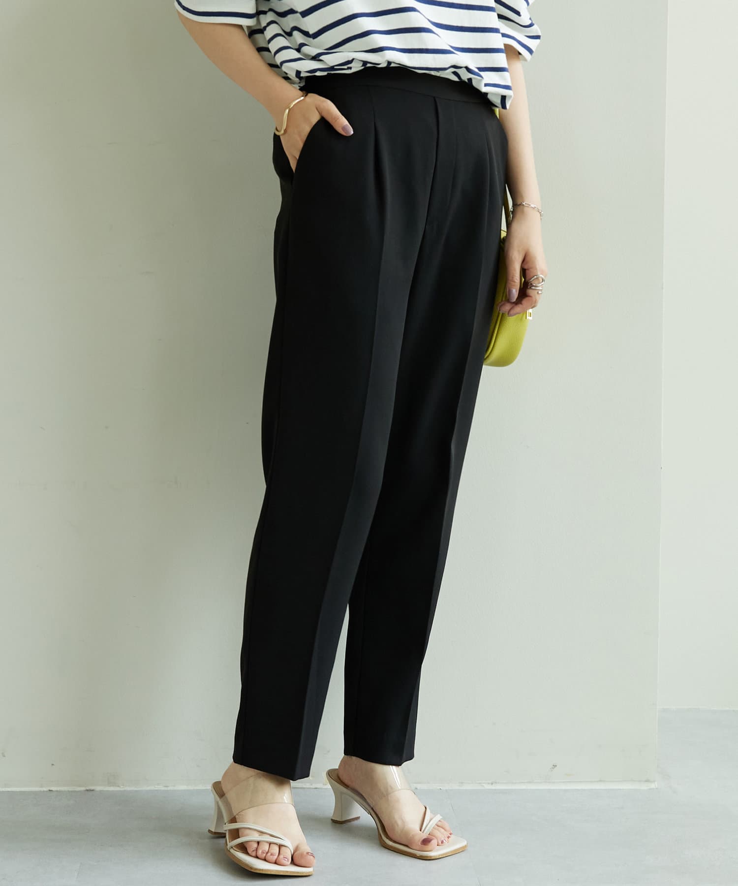 センタープレスを施した、すっきりとした印象のテーパードパンツ。足首にかけて細身になるシルエットが、穿くだけでスタイルアップ効果抜群です◎ウエストはバックゴム仕様で、リラックスした穿き心地も魅力。合わせるトップス次第で、幅広いスタイリングでご活躍頂けるアイテムです。ベーシックカラーに加え、アクセントになるサーモンピンクとピスタチオをご用意しました♪