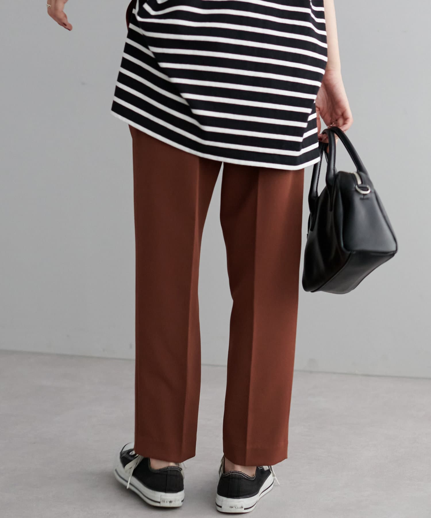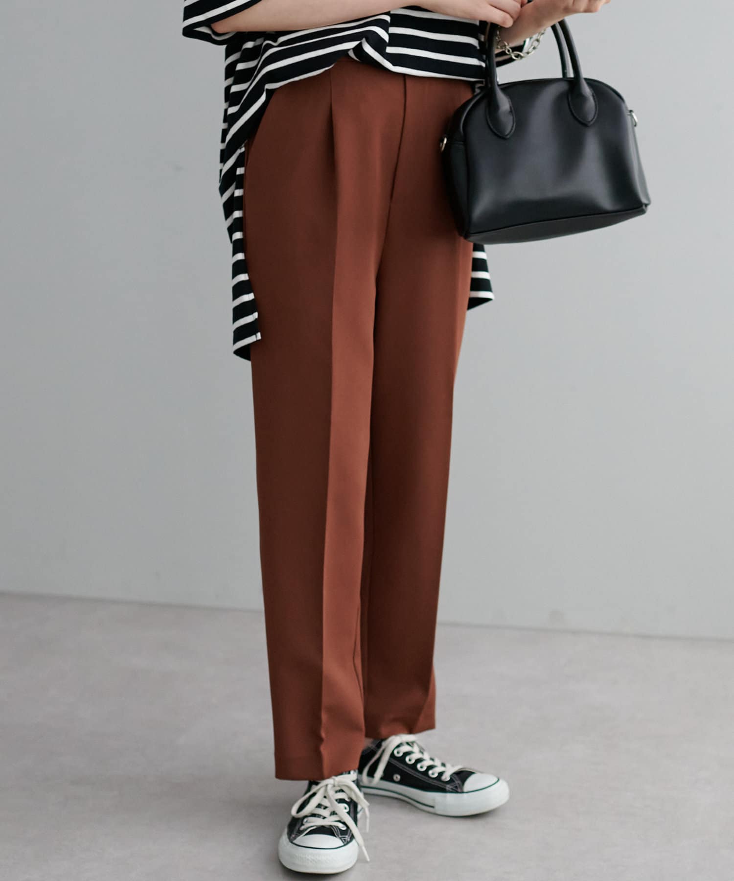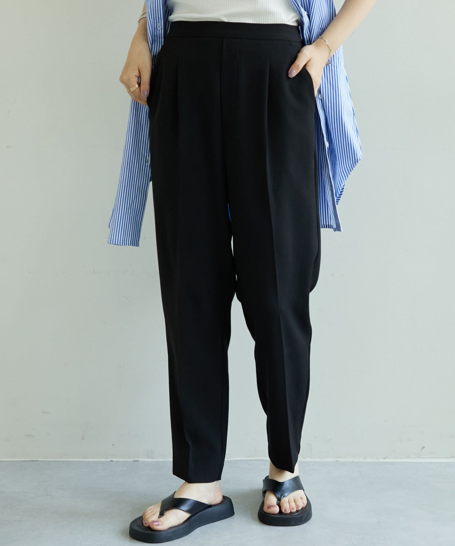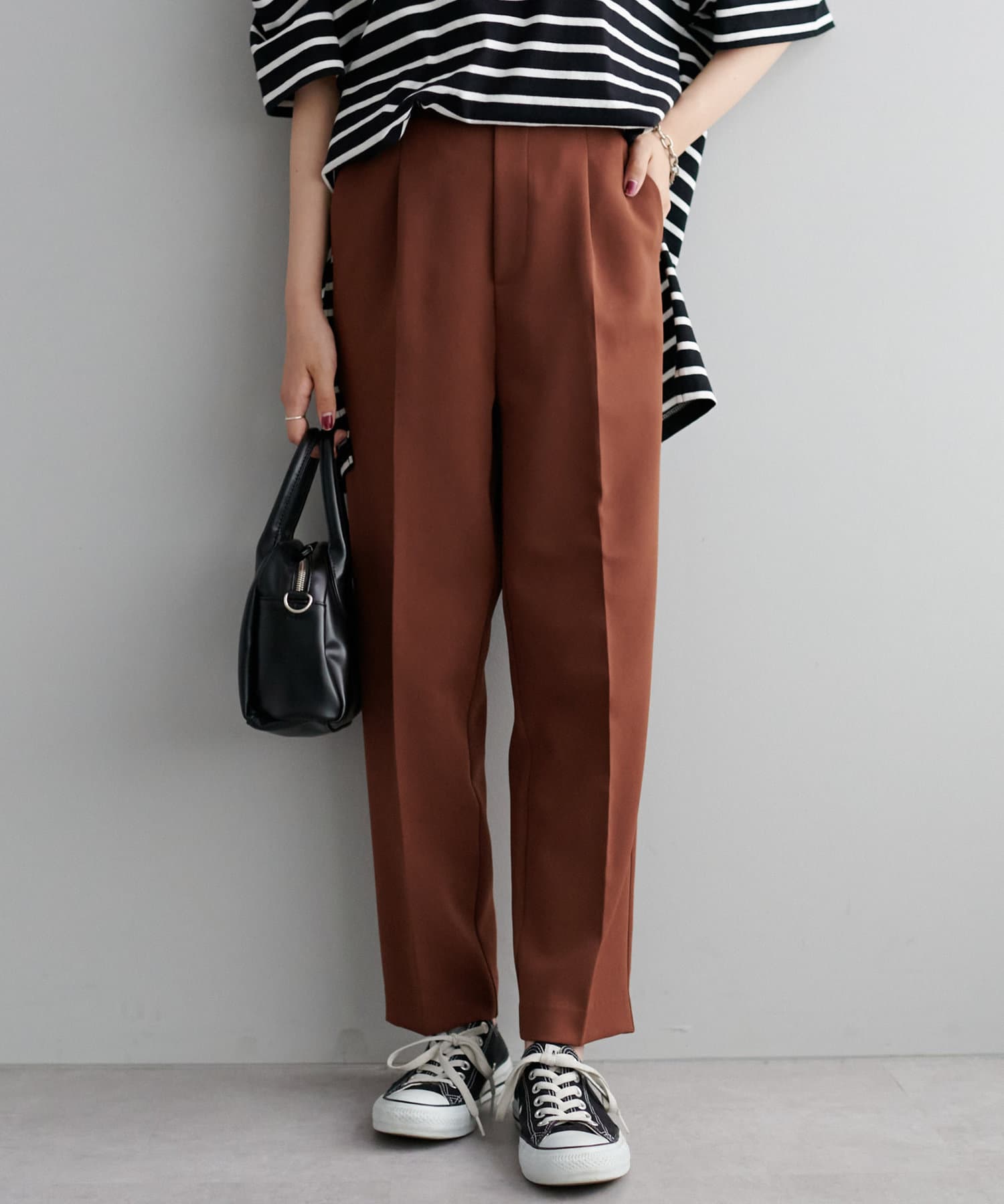 センタープレスを施した、すっきりとした印象のテーパードパンツ。足首にかけて細身になるシルエットが、穿くだけでスタイルアップ効果抜群です◎ウエストはバックゴム仕様で、リラックスした穿き心地も魅力。合わせるトップス次第で、幅広いスタイリングでご活躍頂けるアイテムです。ベーシックカラーに加え、アクセントになるサーモンピンクとピスタチオをご用意しました♪