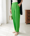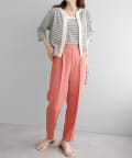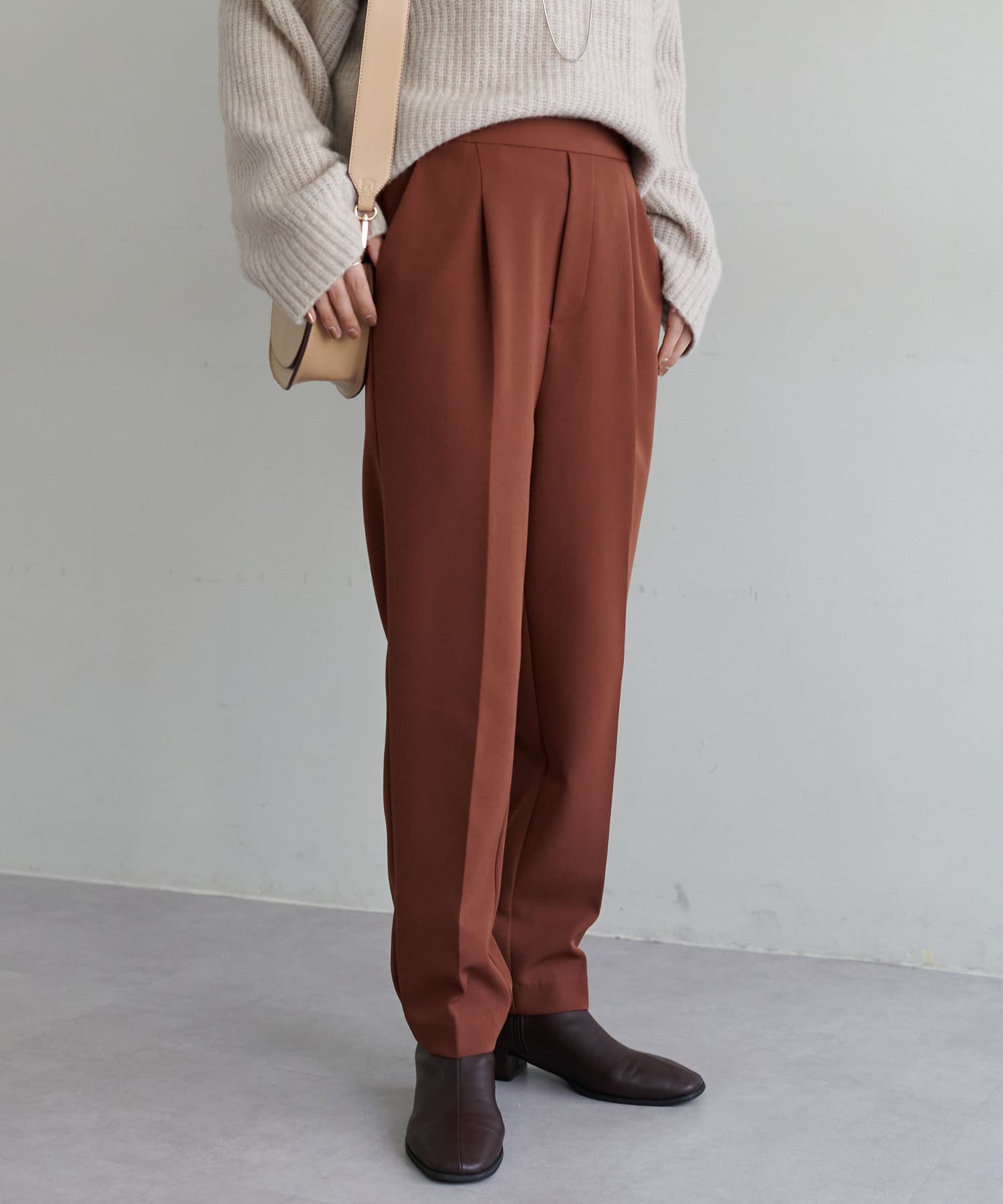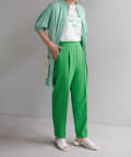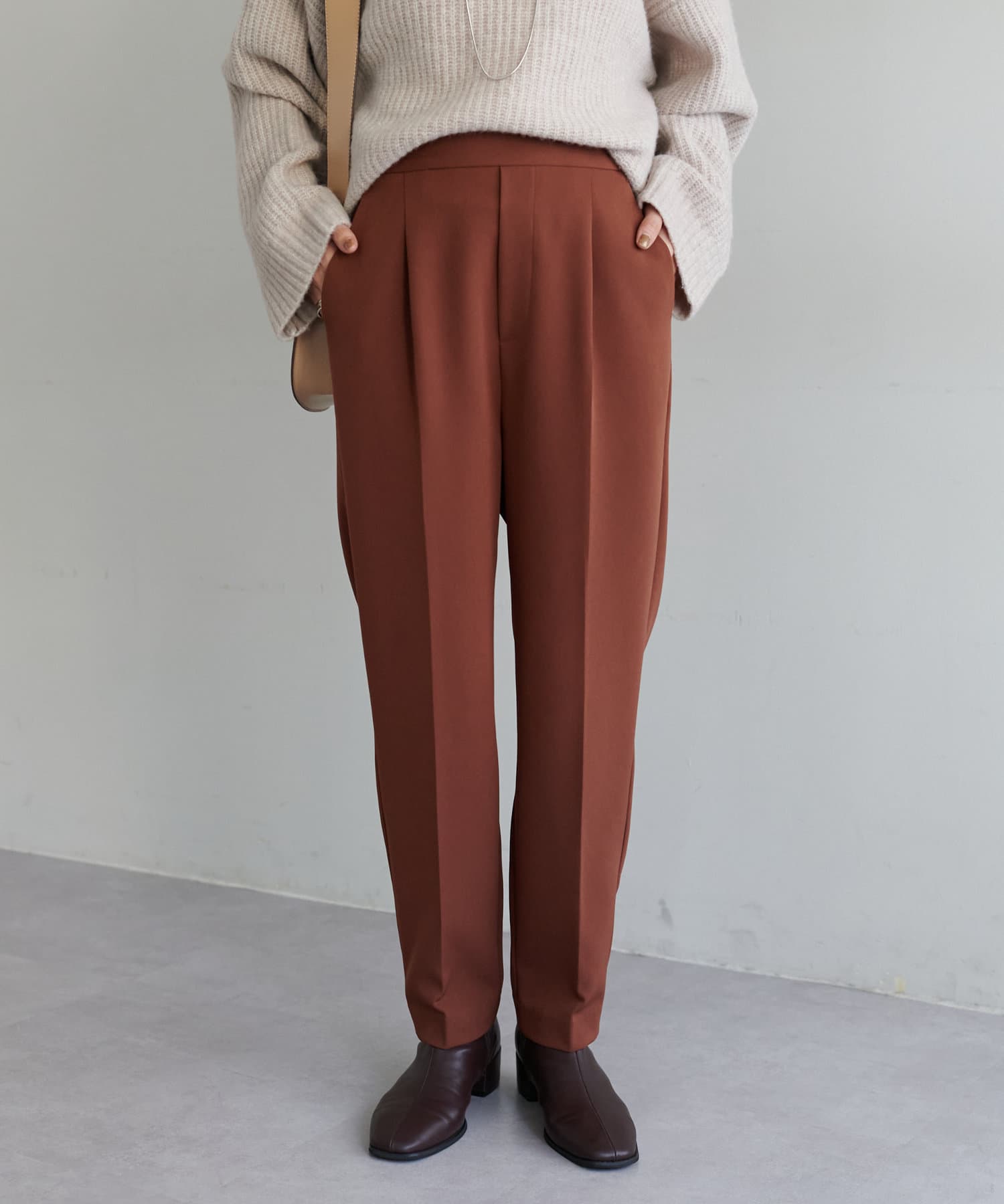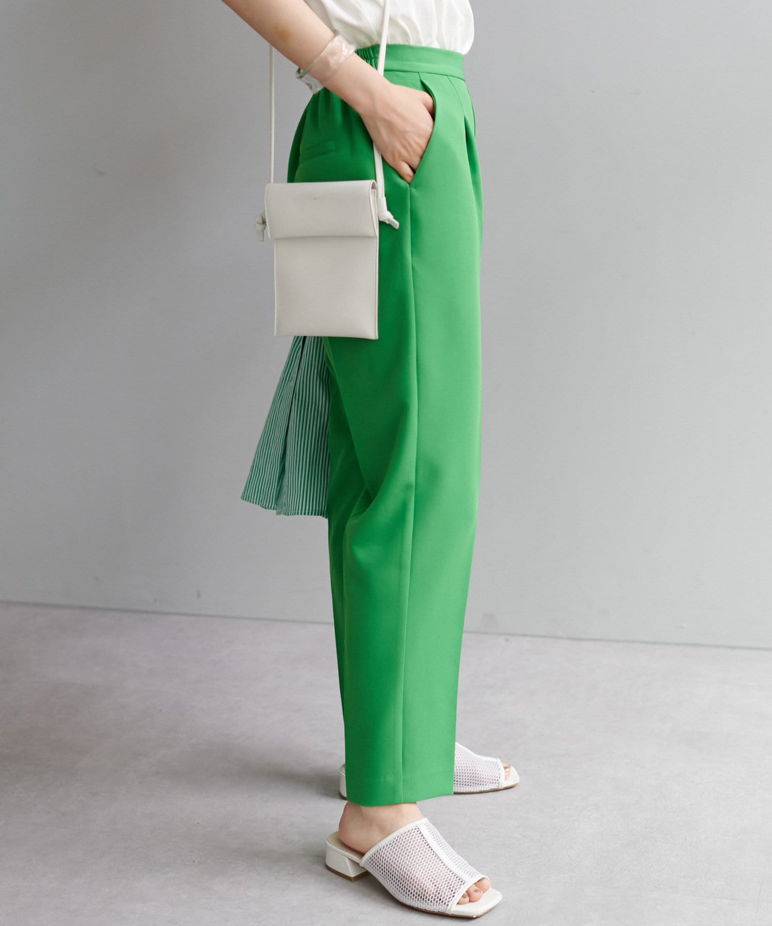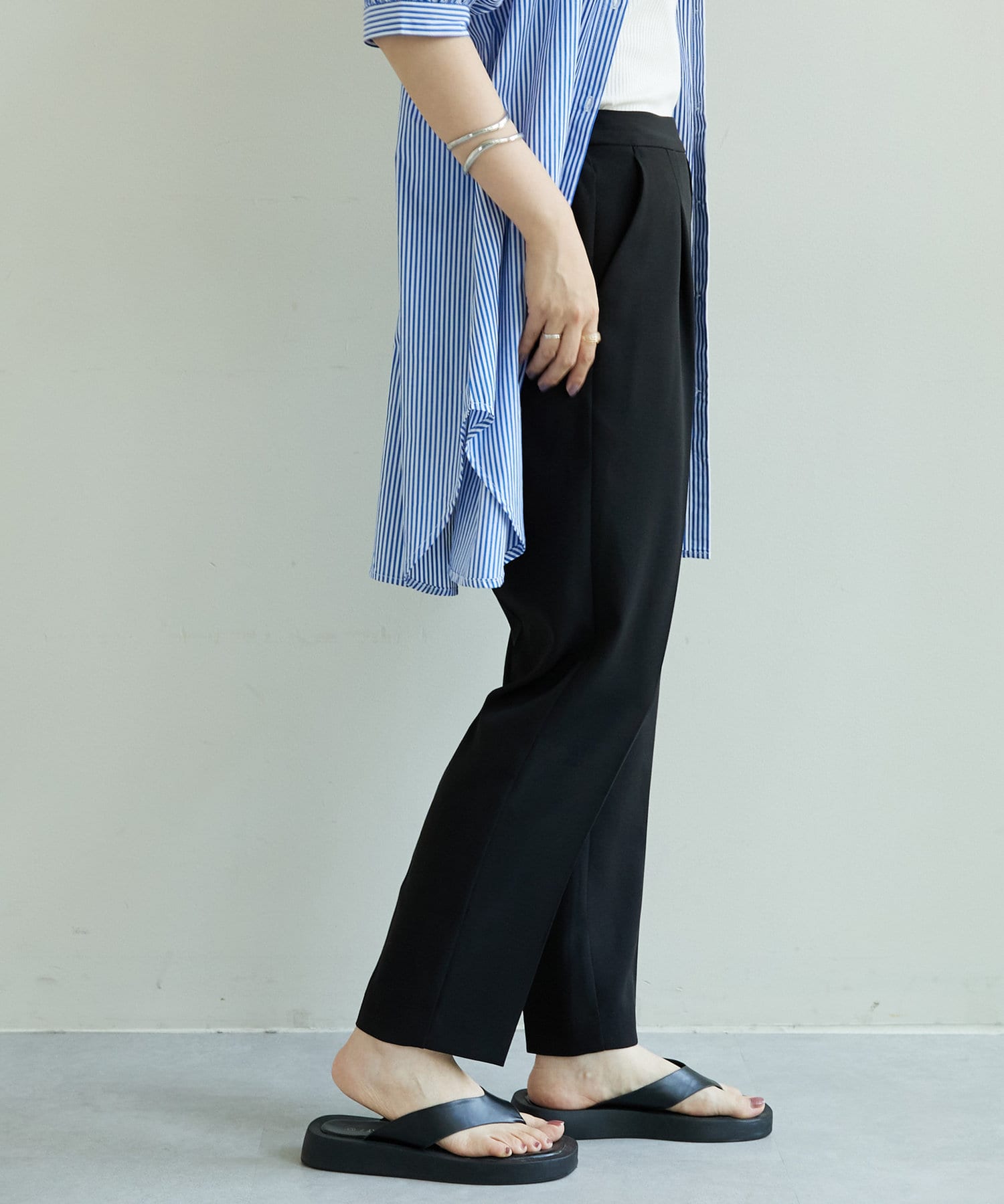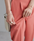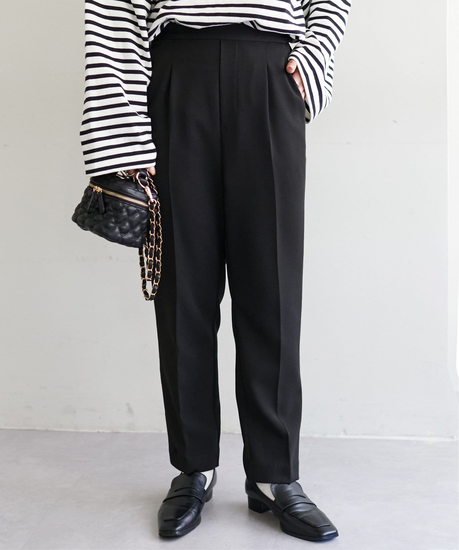 センタープレスを施した、すっきりとした印象のテーパードパンツ。足首にかけて細身になるシルエットが、穿くだけでスタイルアップ効果抜群です◎ウエストはバックゴム仕様で、リラックスした穿き心地も魅力。合わせるトップス次第で、幅広いスタイリングでご活躍頂けるアイテムです。ベーシックカラーに加え、アクセントになるサーモンピンクとピスタチオをご用意しました♪