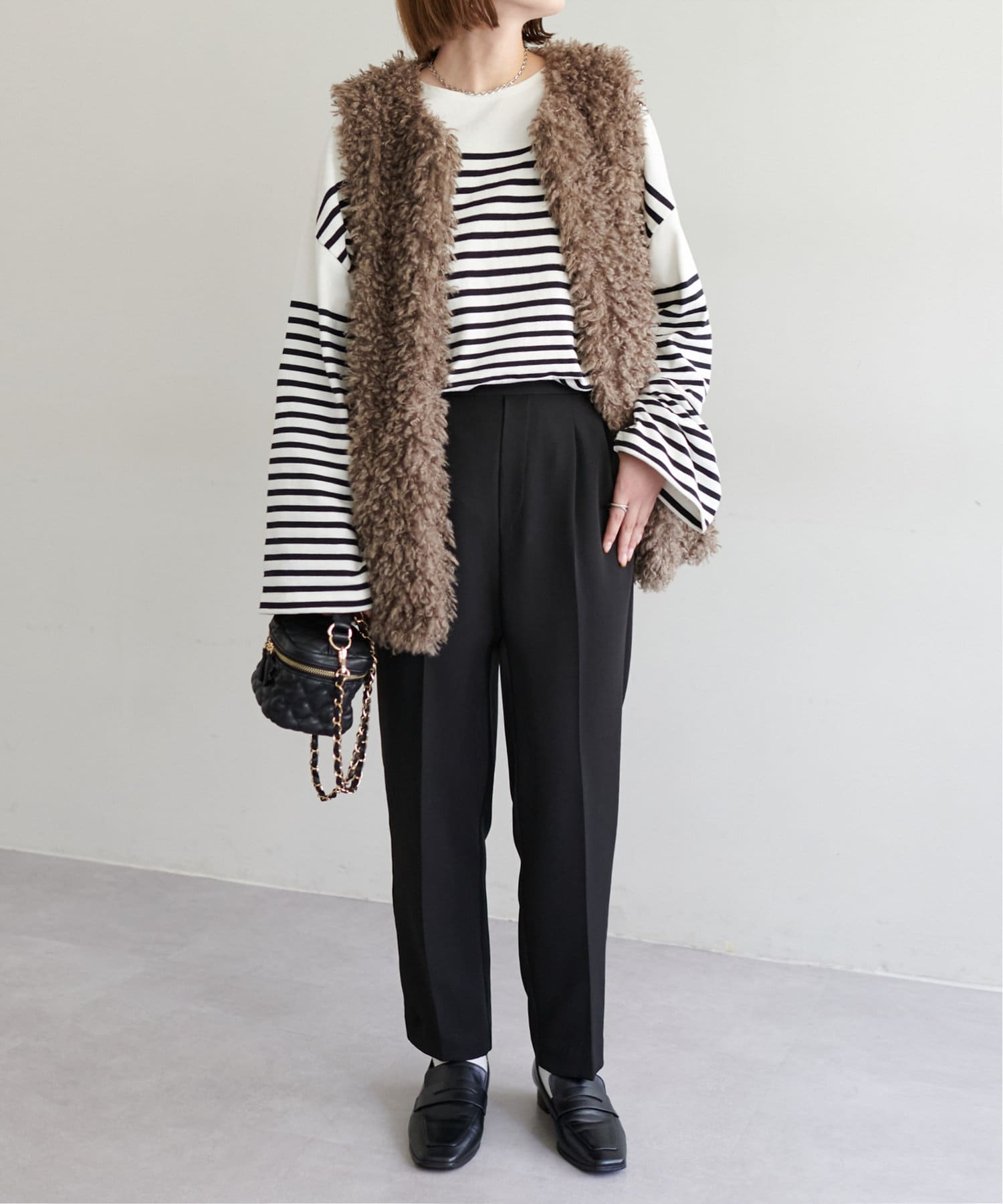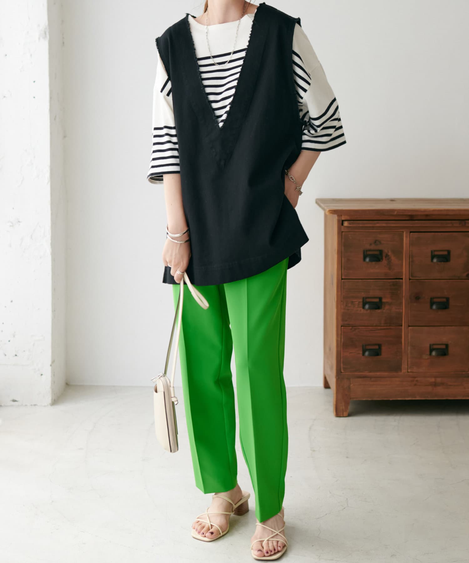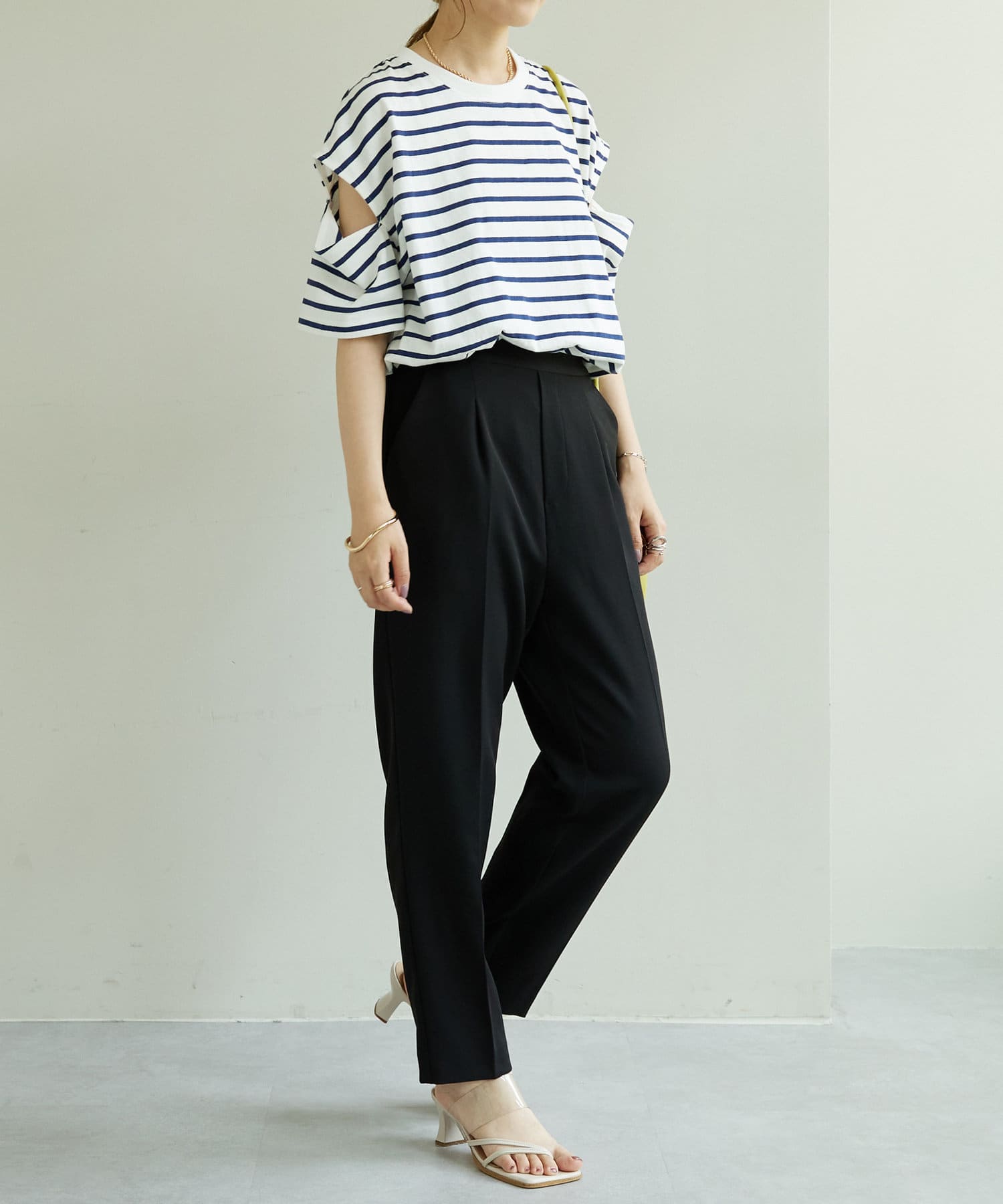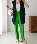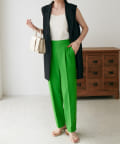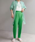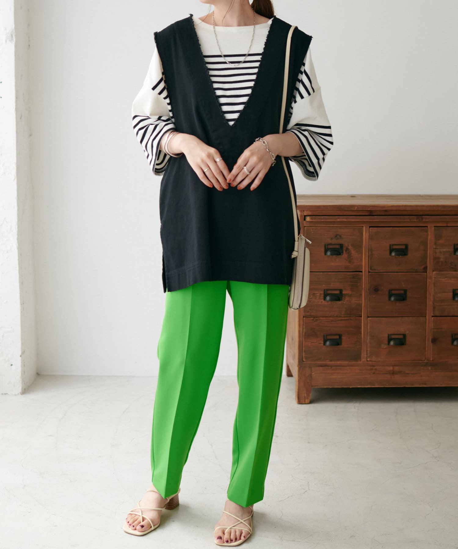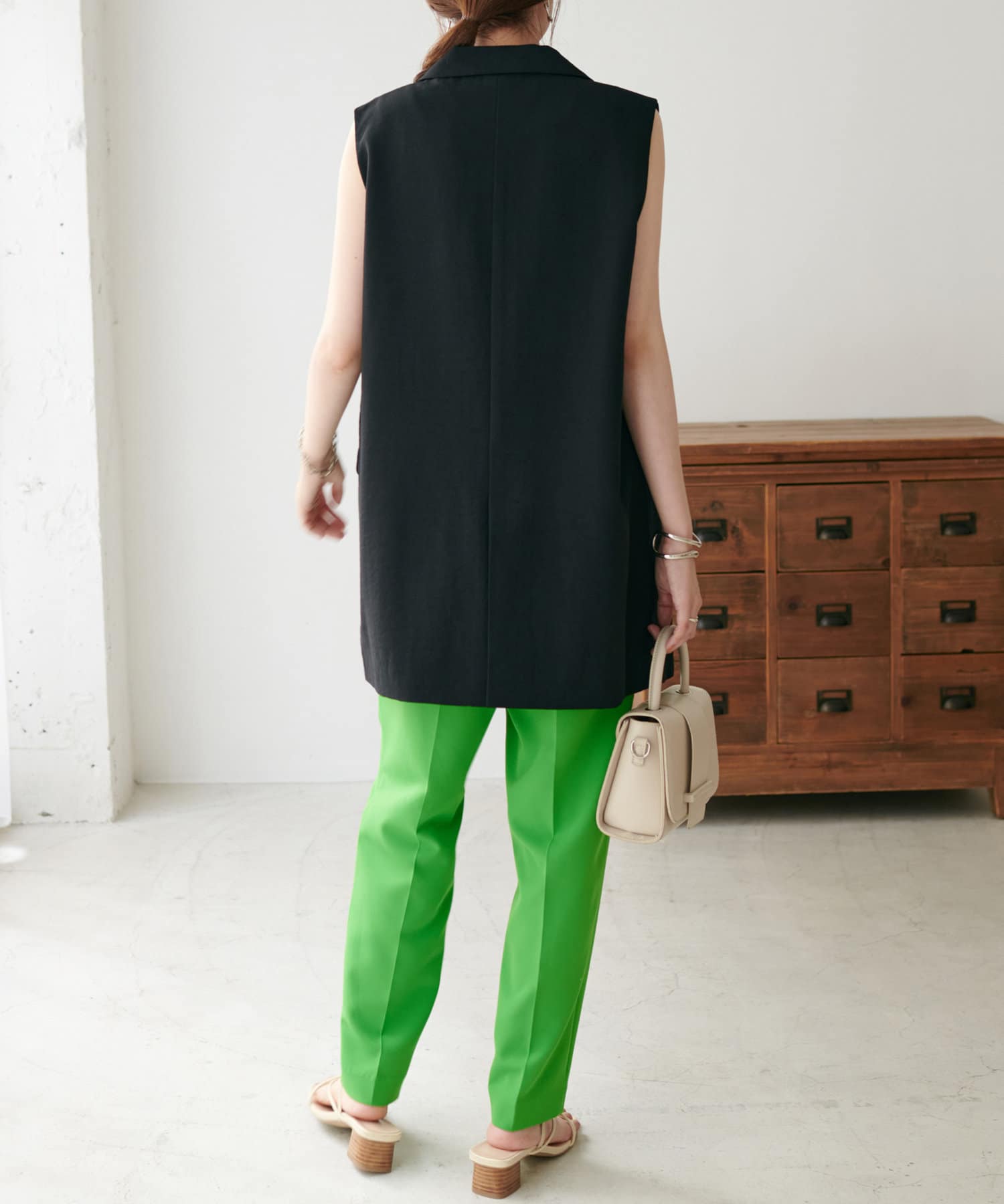 センタープレスを施した、すっきりとした印象のテーパードパンツ。足首にかけて細身になるシルエットが、穿くだけでスタイルアップ効果抜群です◎ウエストはバックゴム仕様で、リラックスした穿き心地も魅力。合わせるトップス次第で、幅広いスタイリングでご活躍頂けるアイテムです。ベーシックカラーに加え、アクセントになるサーモンピンクとピスタチオをご用意しました♪