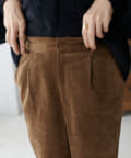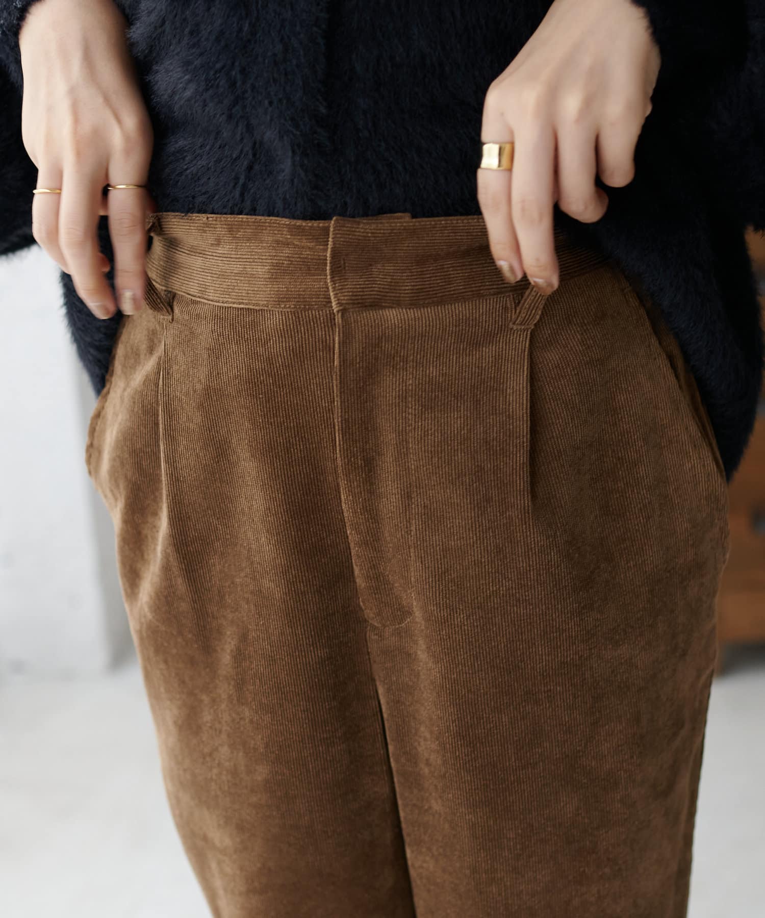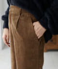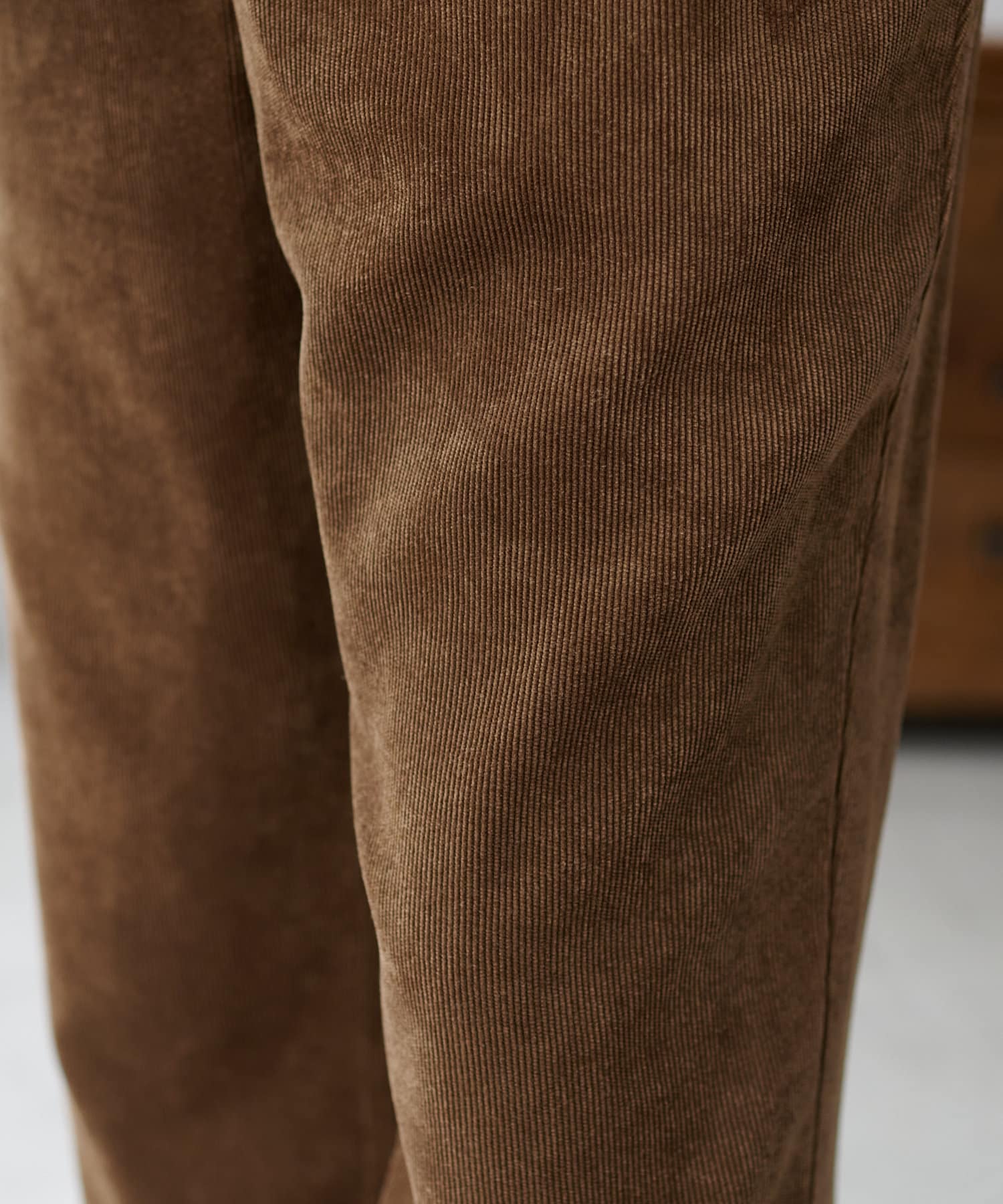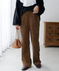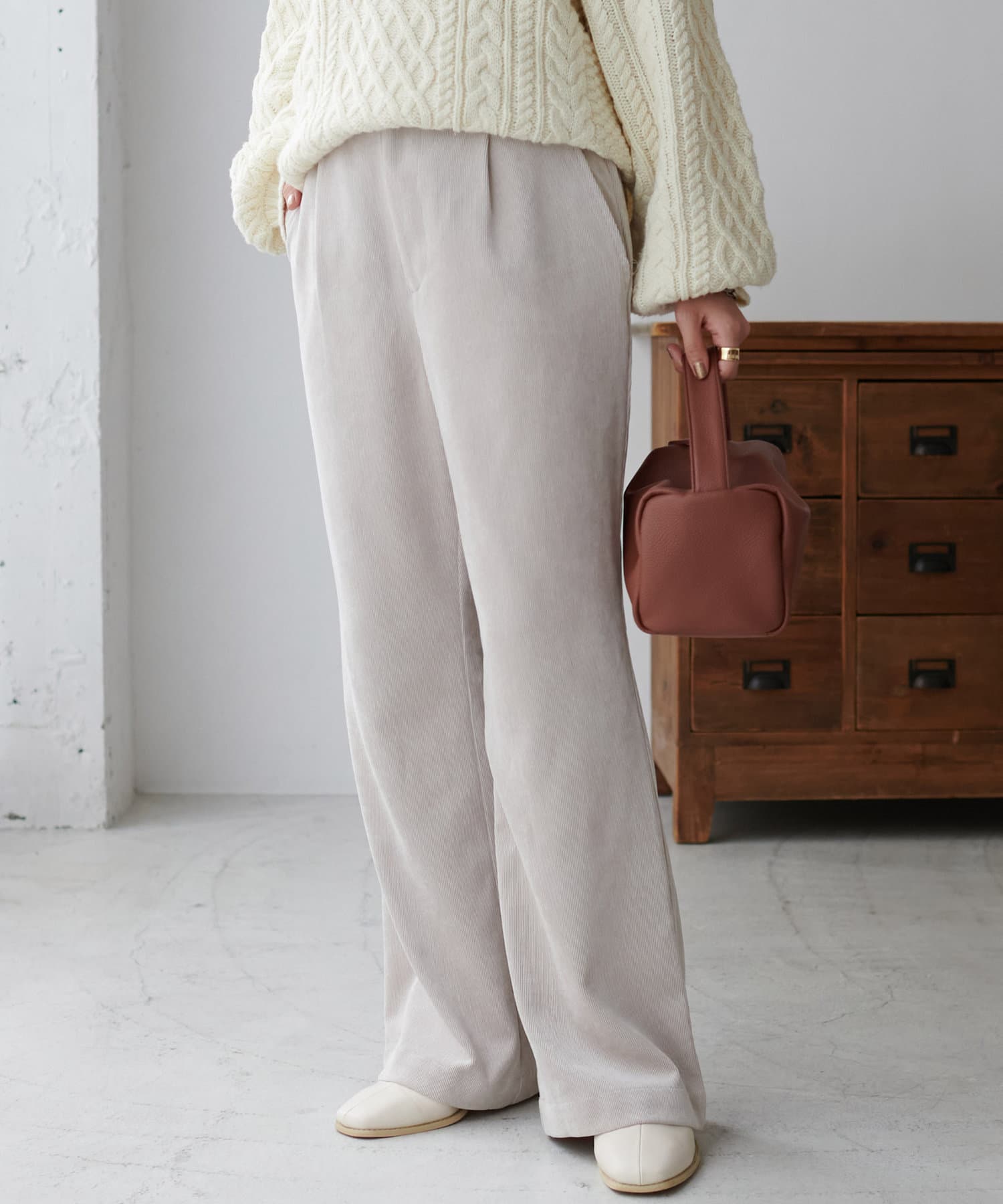 シーズンムードを高めるコーデュロイ生地で仕立てたフレアパンツ。カジュアルな印象ながら、裾に向かって広がるフレアラインが女性らしい着こなしを演出。タックを施したフロントに、後ろ側はゴム仕様で楽な穿き心地を叶えます。合わせるものを選ばないシンプルなルックスは、幅広いスタイリングで活躍すること間違いなし♪ベーシックカラーに加え、落ち着いトーンで取り入れやすいブルーをご用意しました。