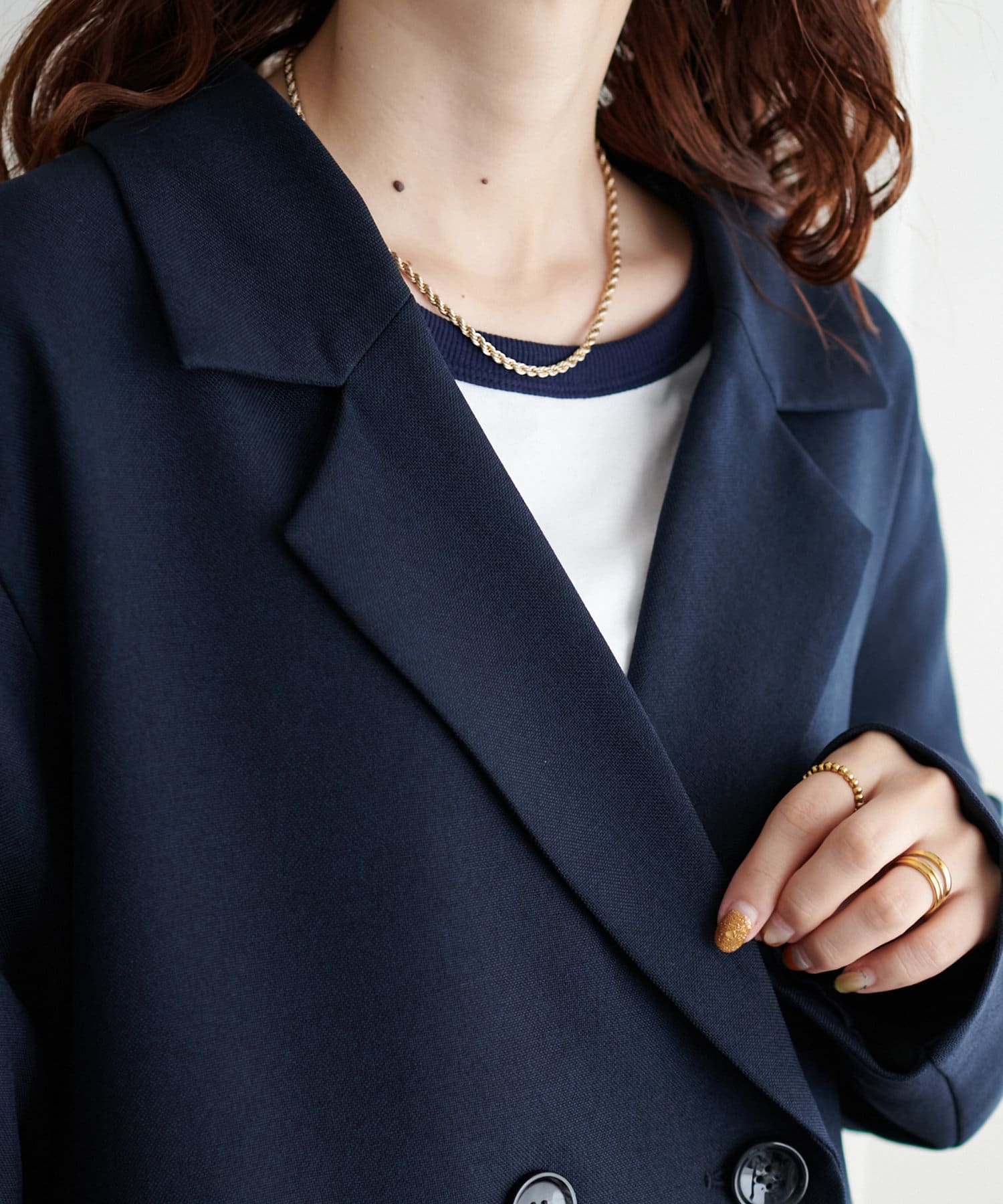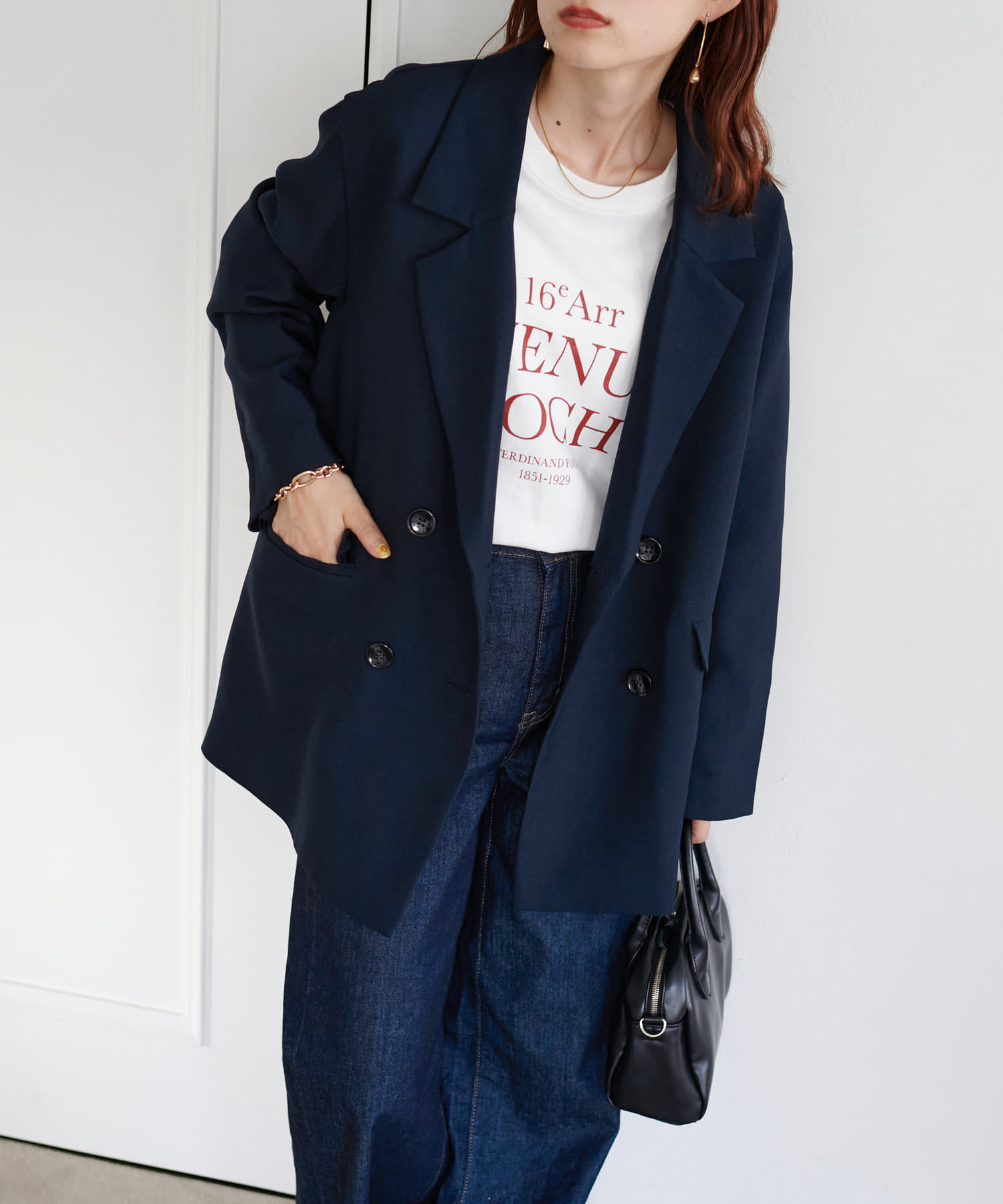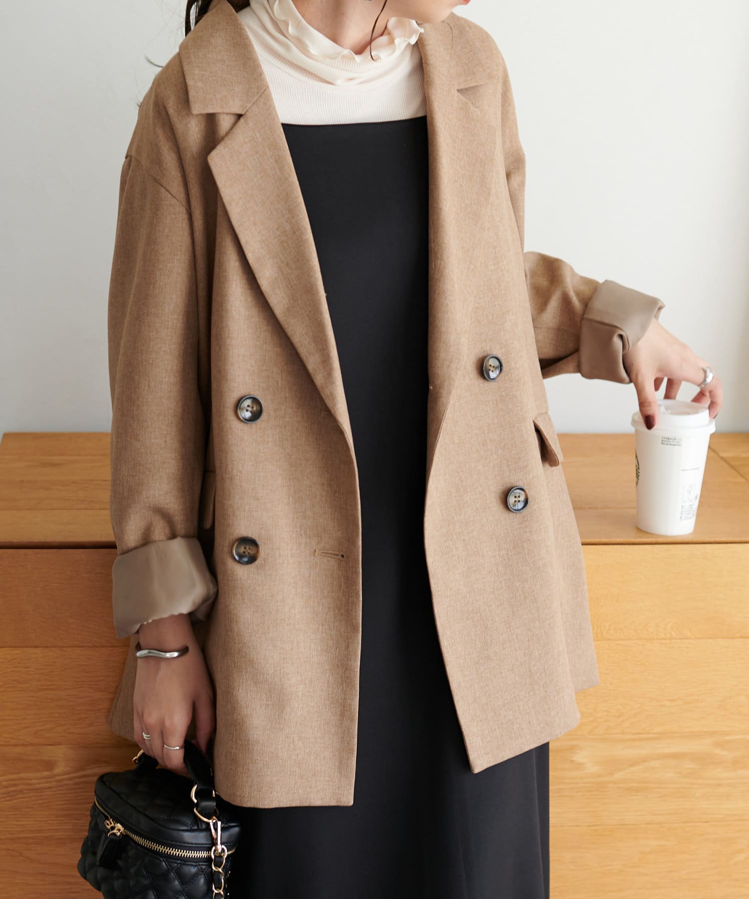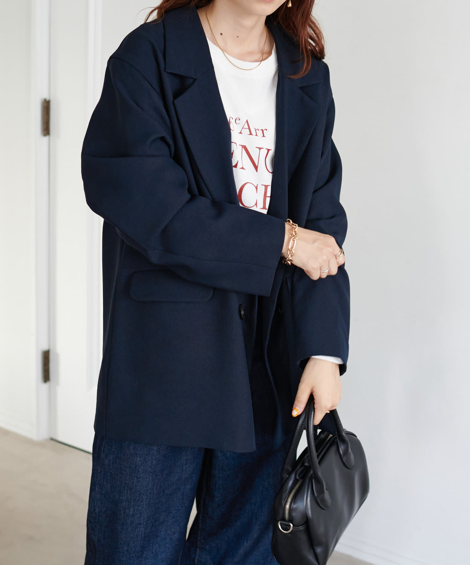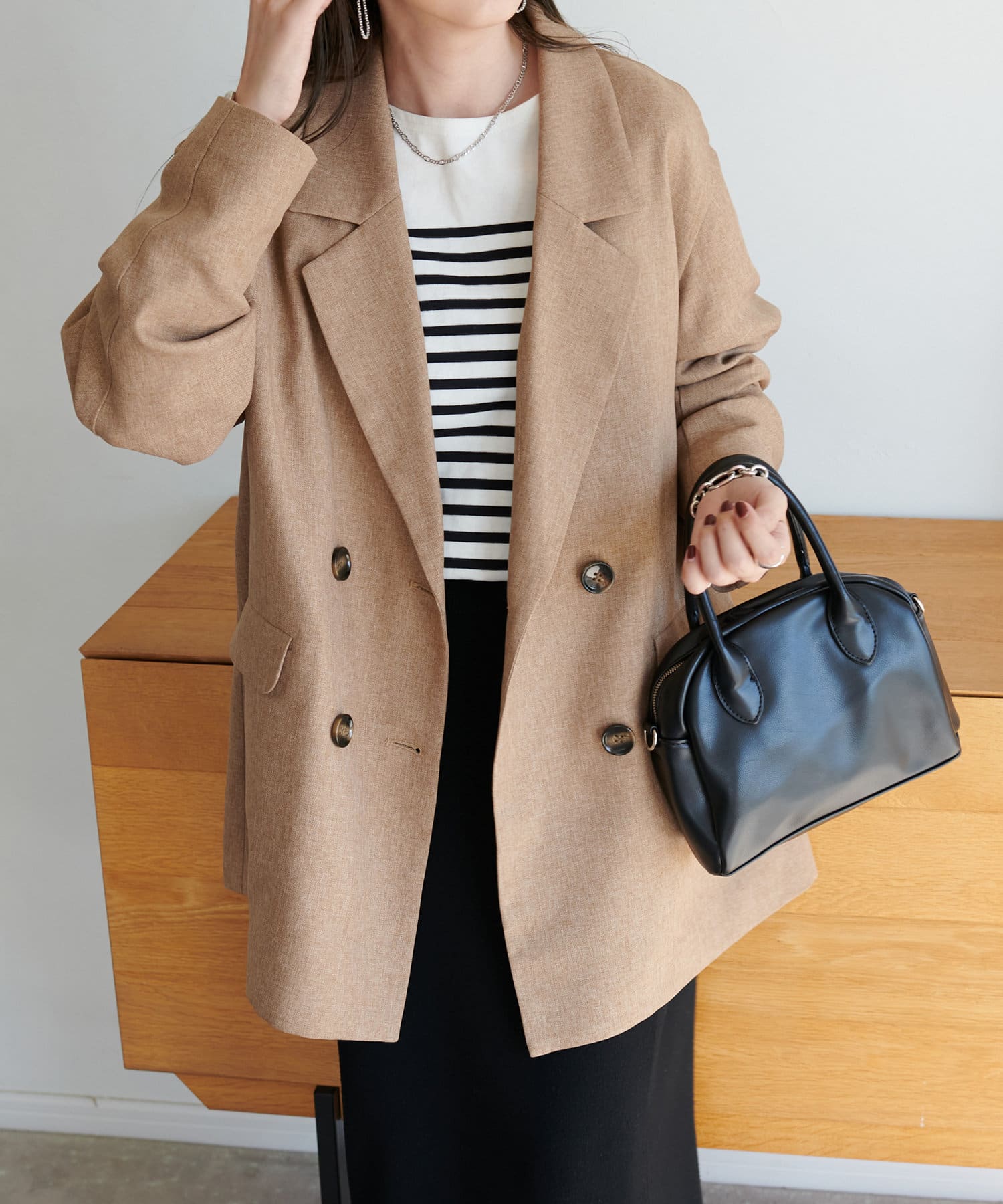 マニッシュな着こなしを楽しめる、ダブルブレストのテーラードジャケット。ゆったりとしたシルエットに、ヒップにかかる着丈バランスがトレンドムードを演出。さらりとした肌触りでシワになりにくく、デイリー使いしやすいのも魅力です。バックスタイルにはベンツを施すことで、動きやすいデザインに◎幅広いシーンで活躍ができるジャケットは、ワードローブの強い味方です♪
