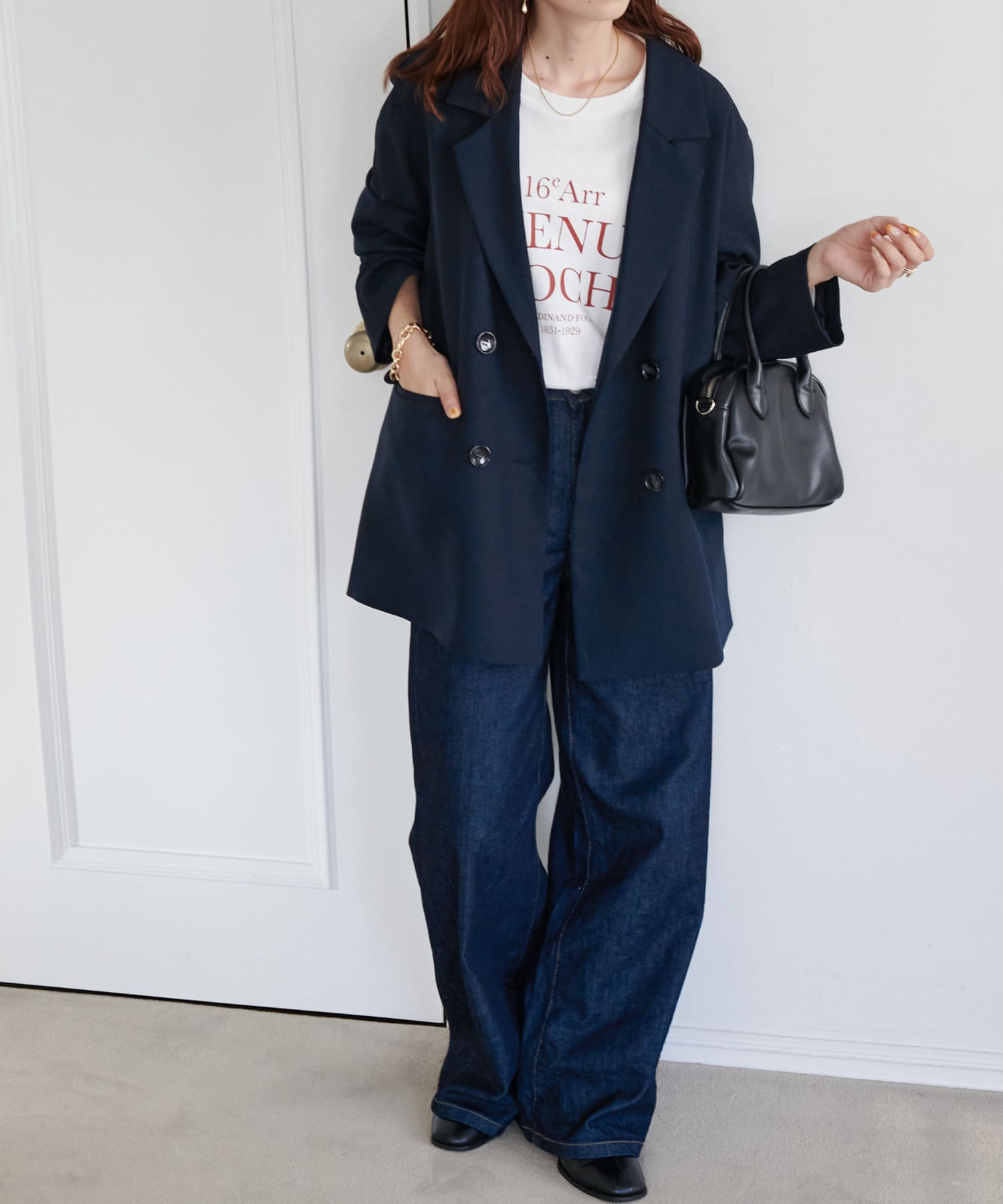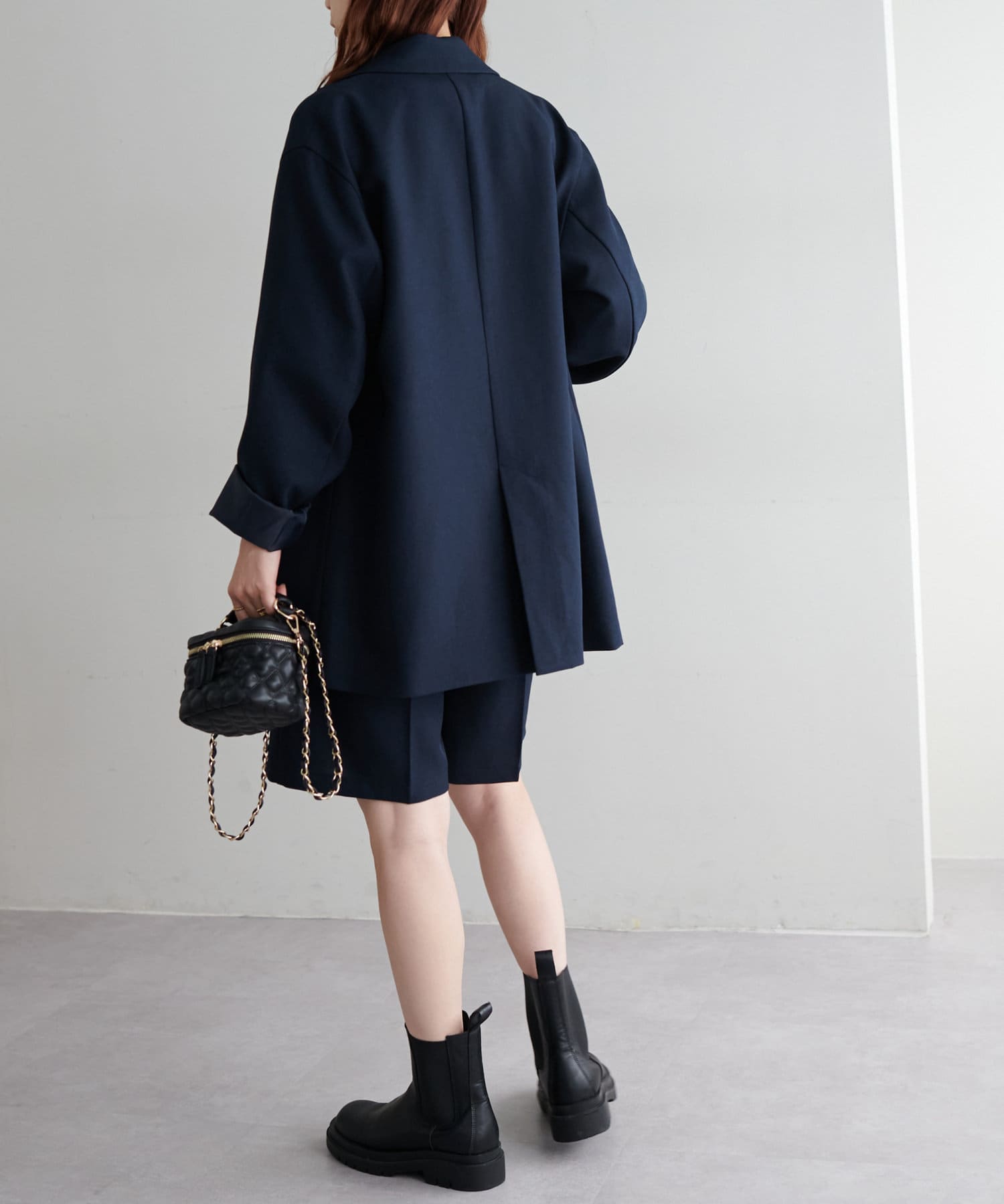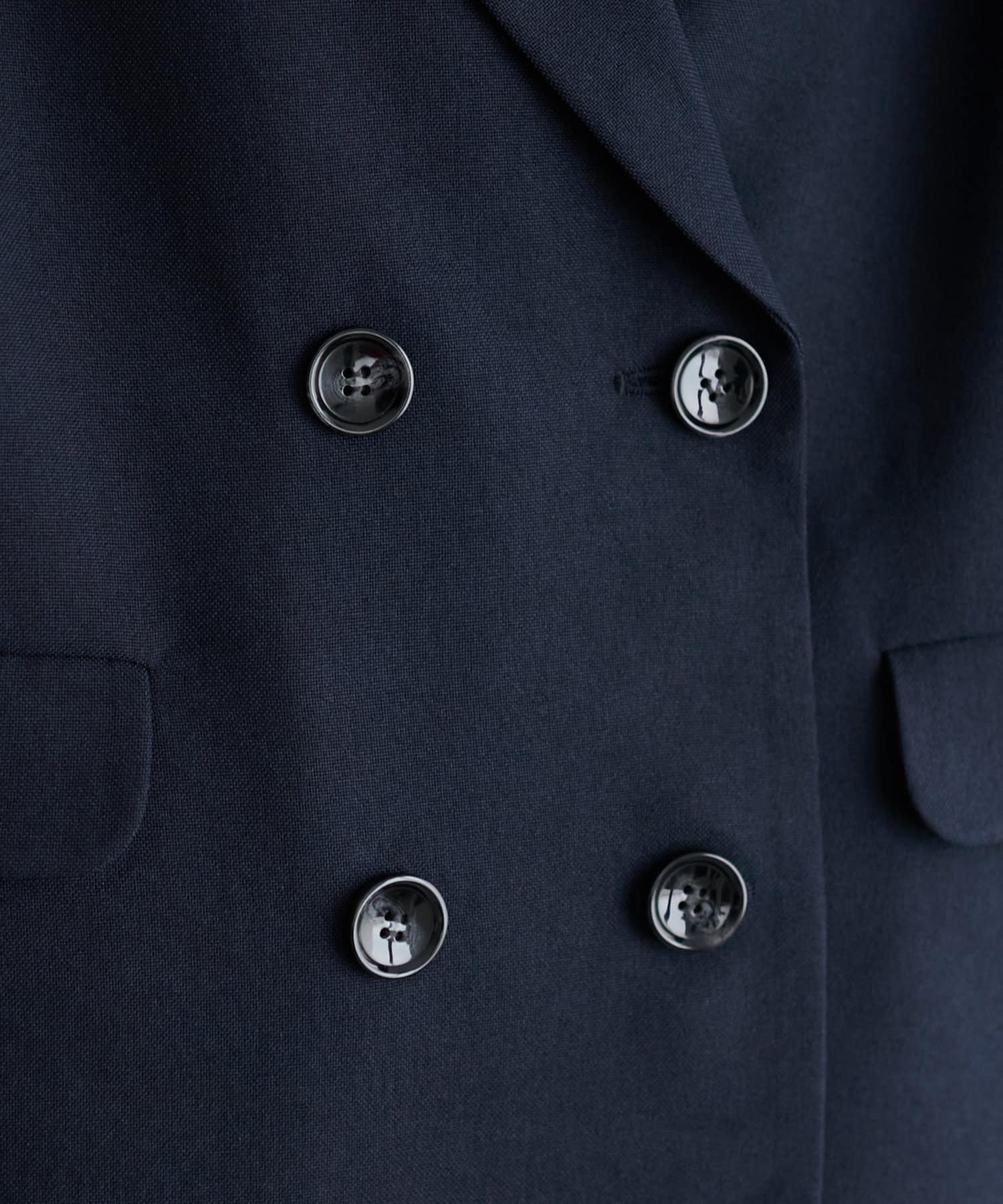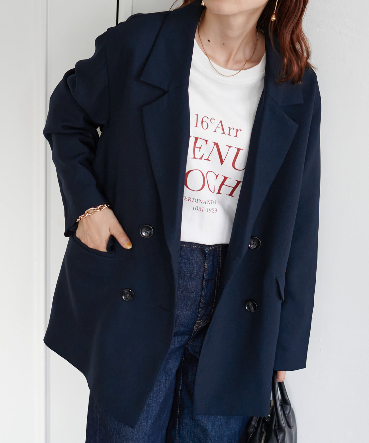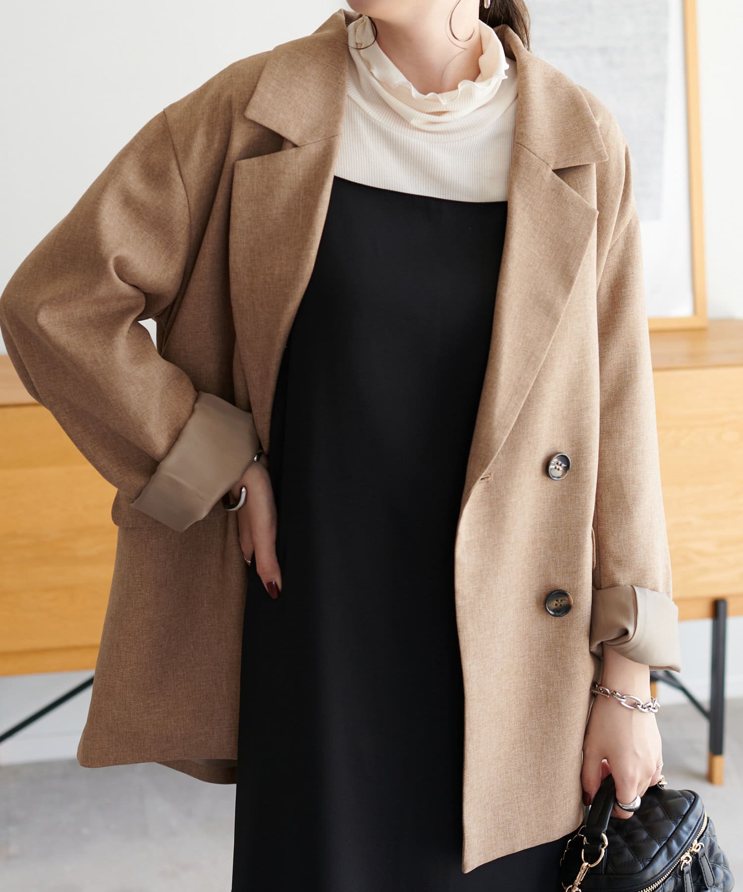 マニッシュな着こなしを楽しめる、ダブルブレストのテーラードジャケット。ゆったりとしたシルエットに、ヒップにかかる着丈バランスがトレンドムードを演出。さらりとした肌触りでシワになりにくく、デイリー使いしやすいのも魅力です。バックスタイルにはベンツを施すことで、動きやすいデザインに◎幅広いシーンで活躍ができるジャケットは、ワードローブの強い味方です♪