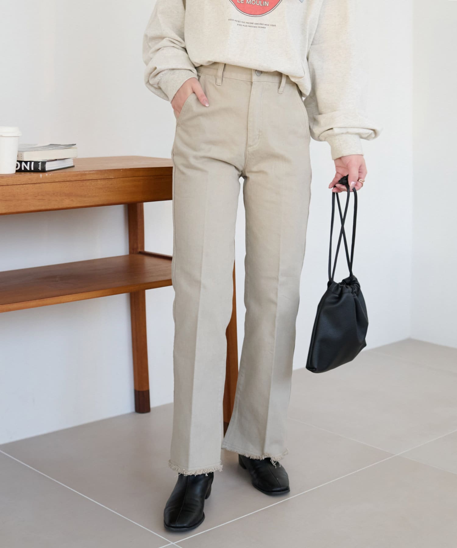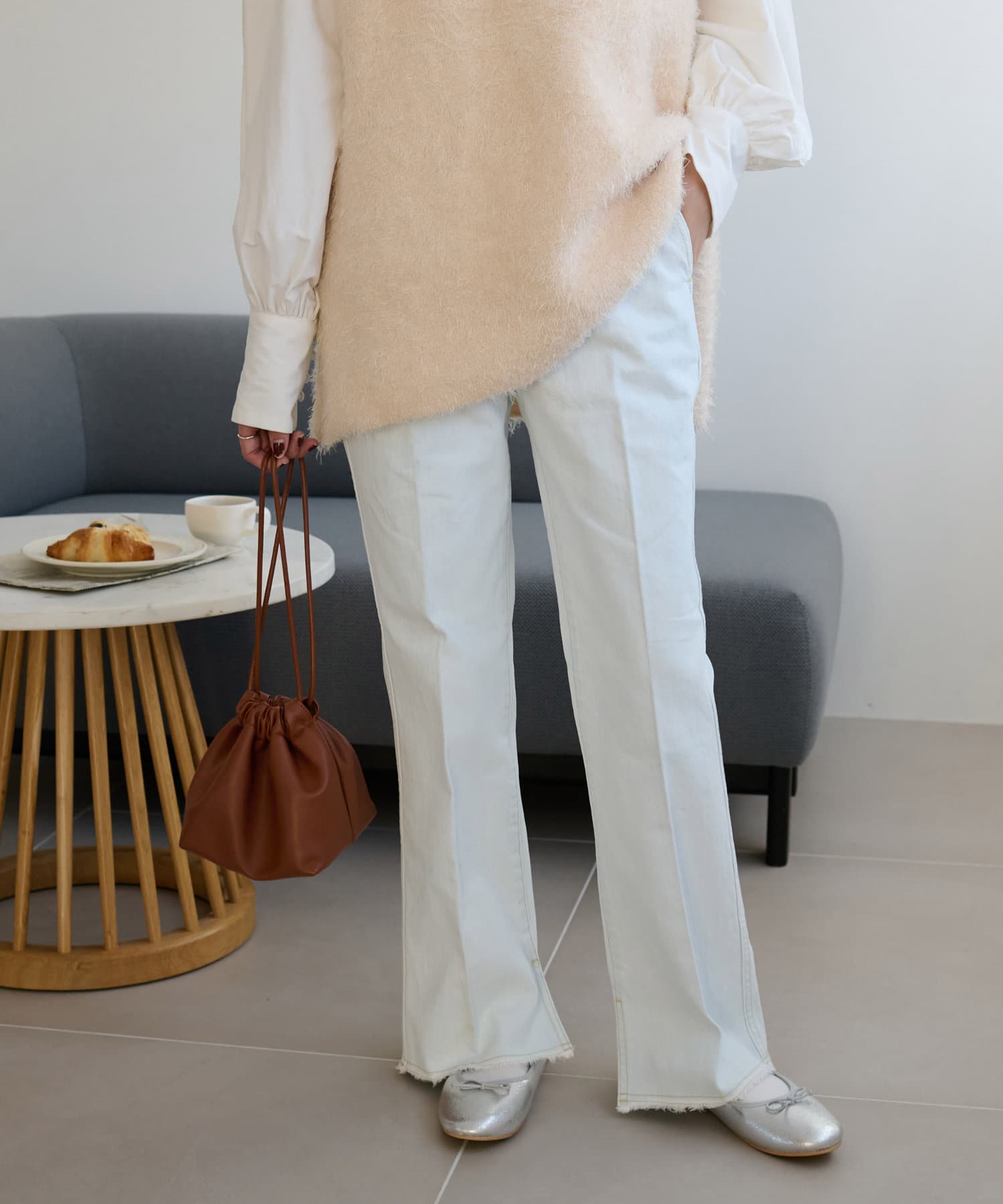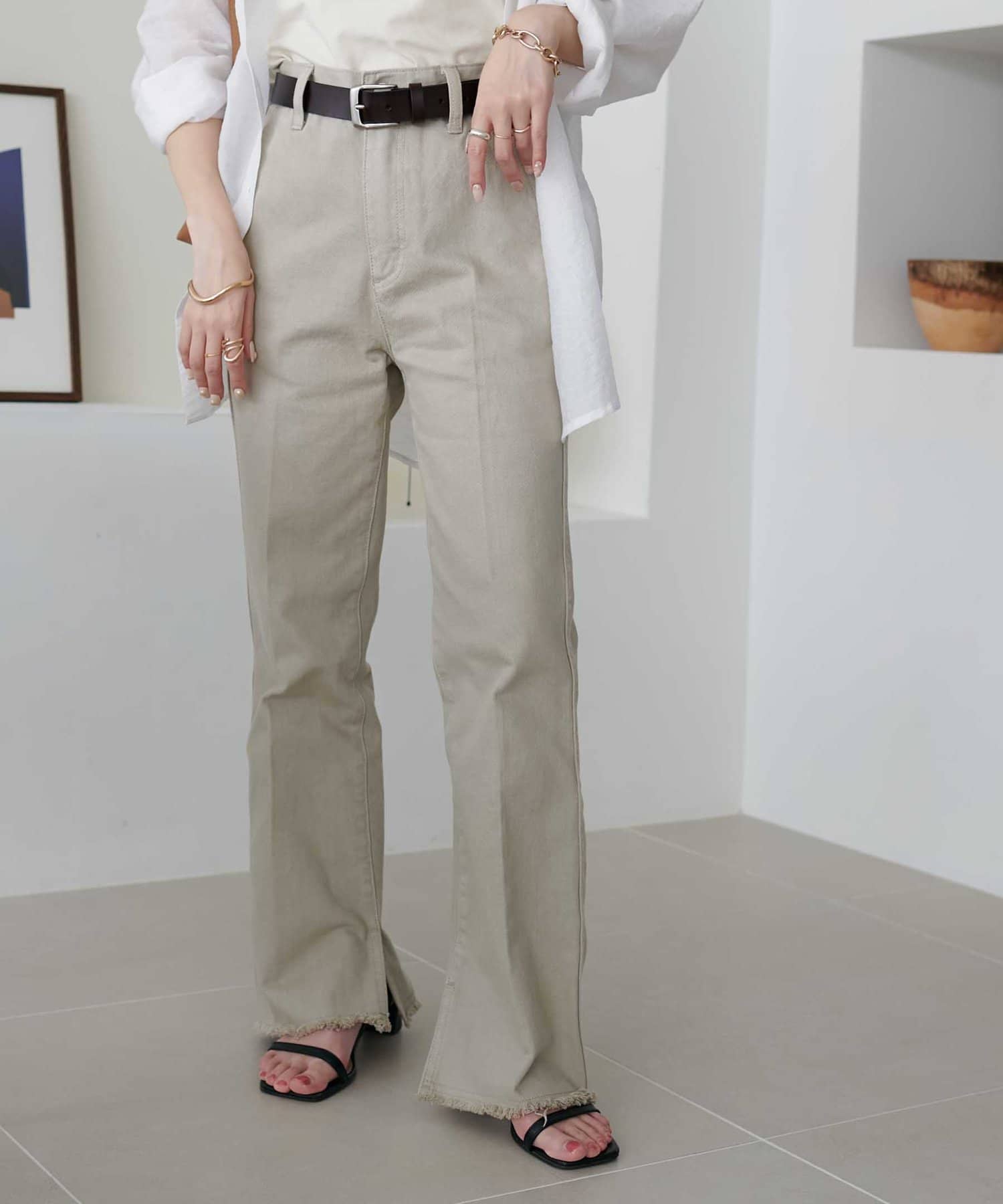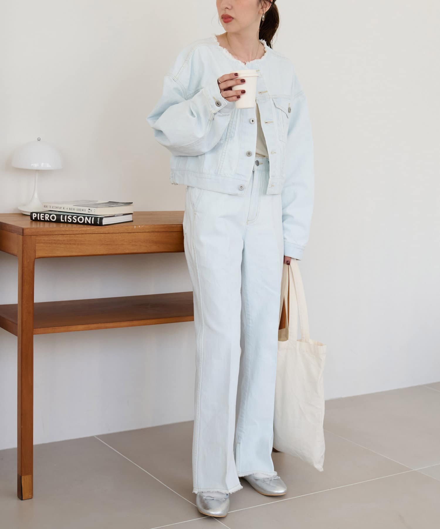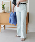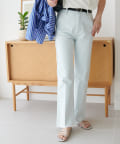 さり気ないフレアシルエットと、裾のカットオフディテールが特徴のデニムパンツ。今シーズンは全体的にサイズを小さくし、よりフィット感のあるシルエットにリニューアルしました!カジュアルな印象のデニムも、センタープレス入りで女性らしい雰囲気に。オールシーズン使える素材感で、ワードローブの定番としておすすめのアイテムです。カラーは定番のサックスブルー、ネイビー、ブルーに加え、柔らかい雰囲気のアイボリー、大人めなブラックの5色展開です♪