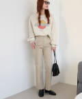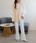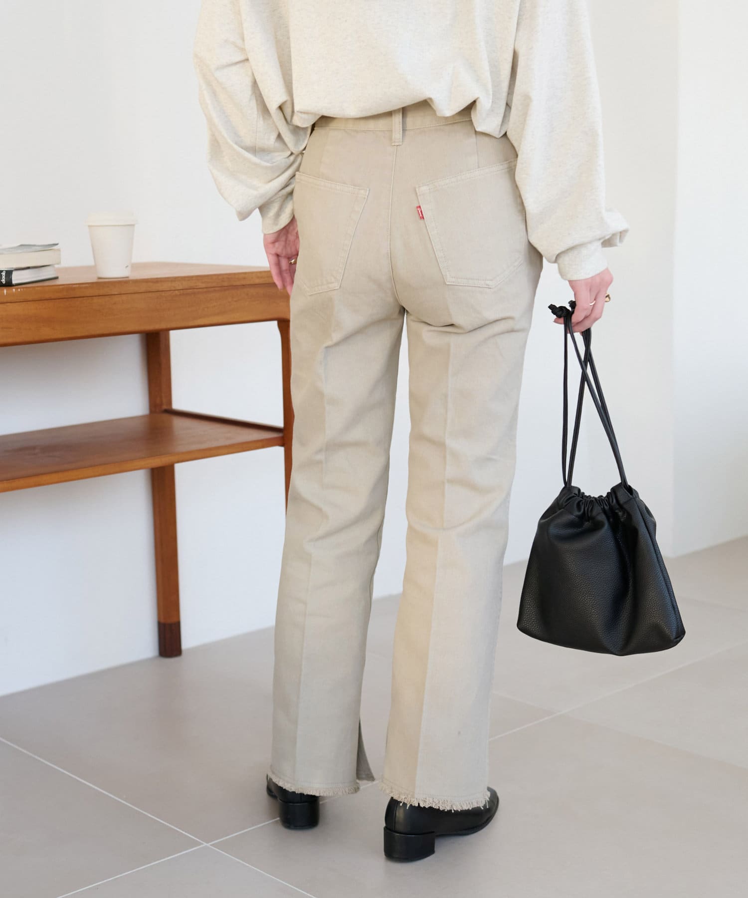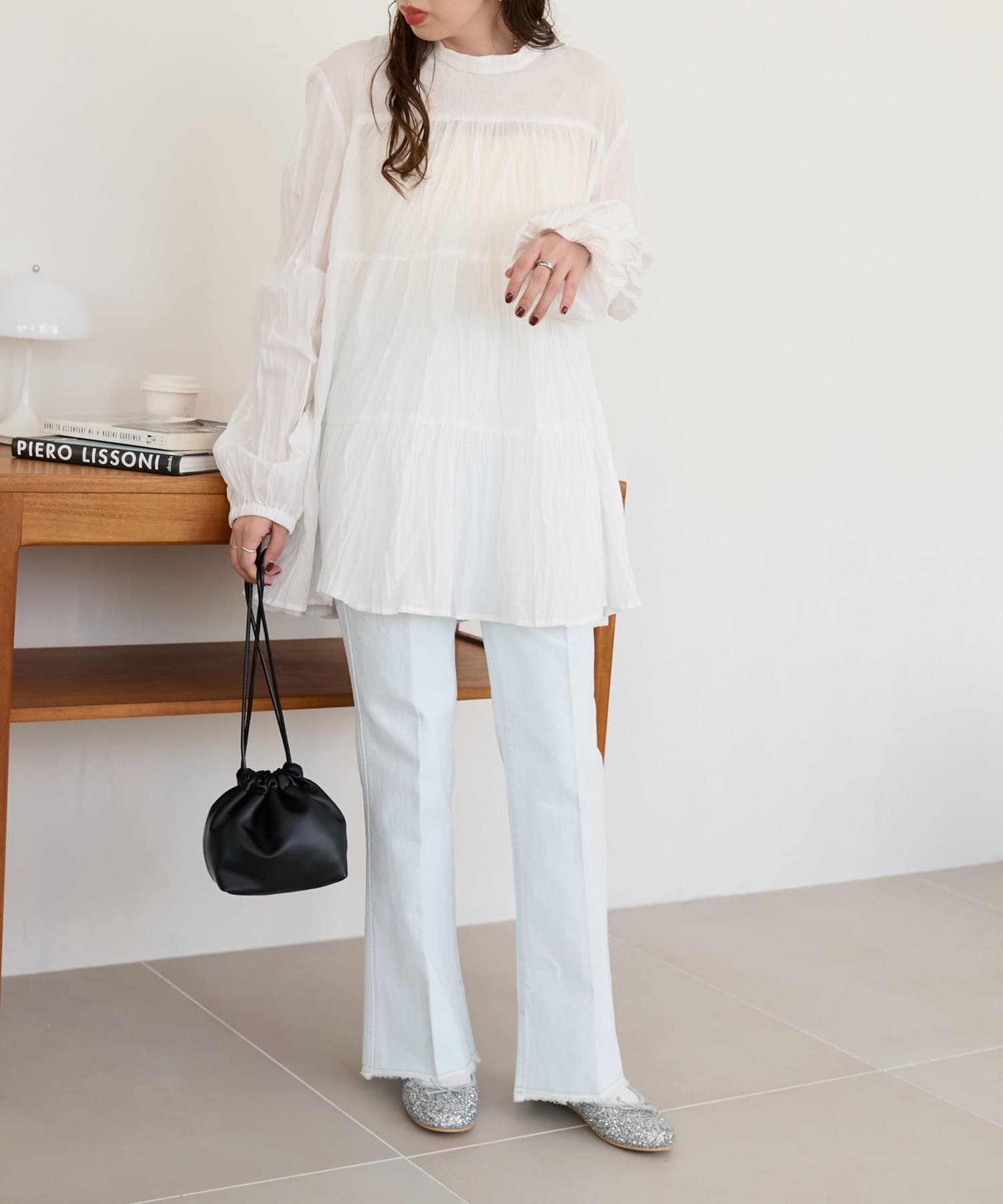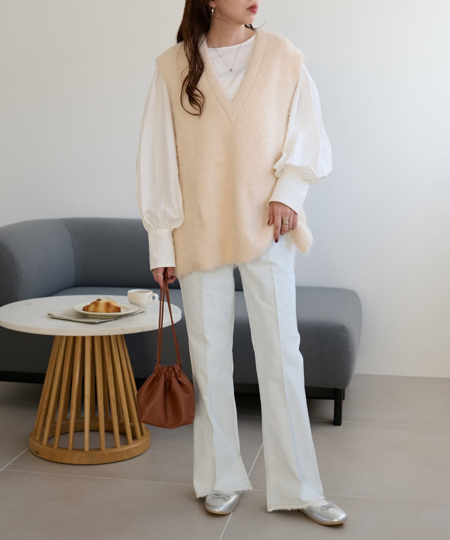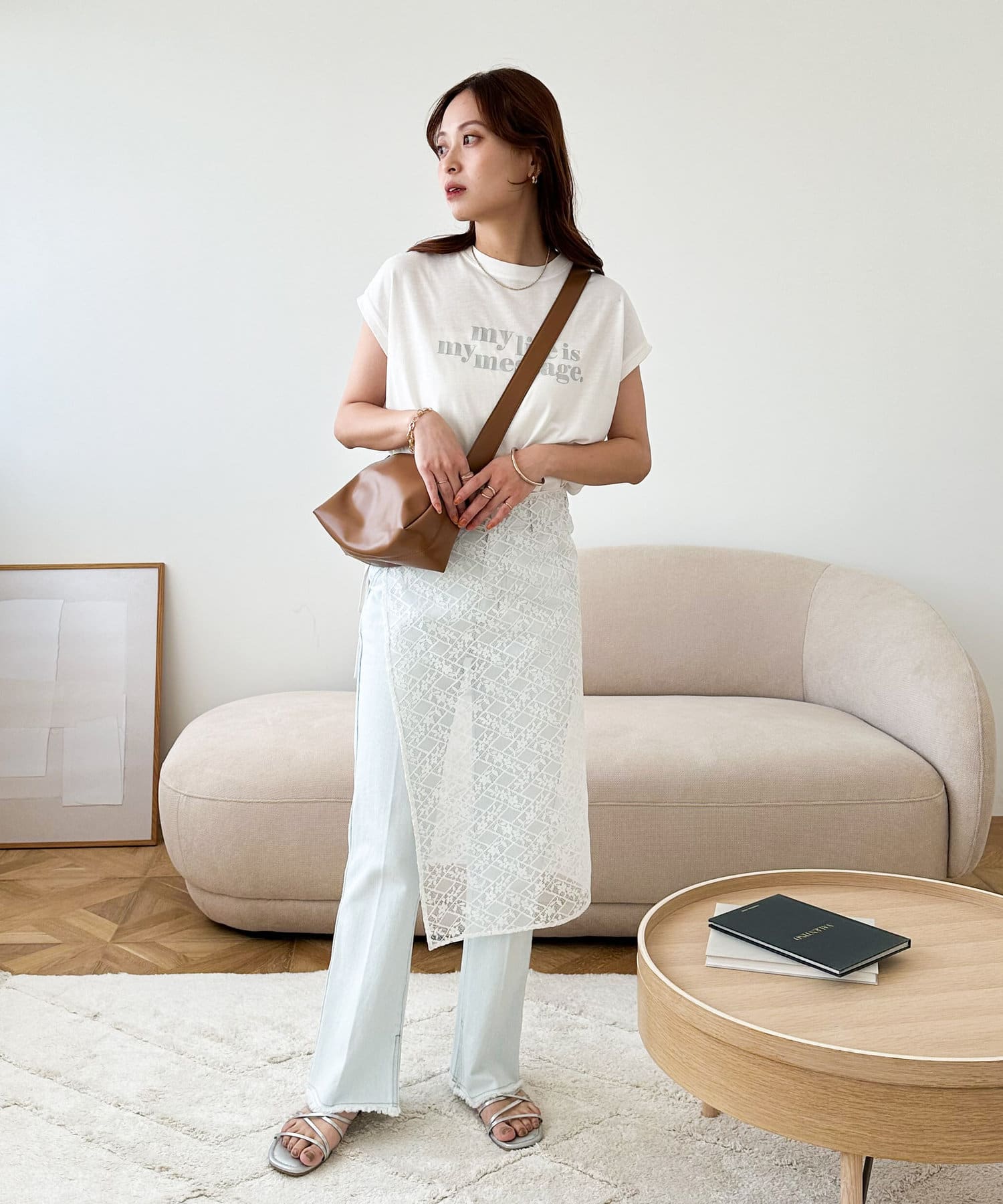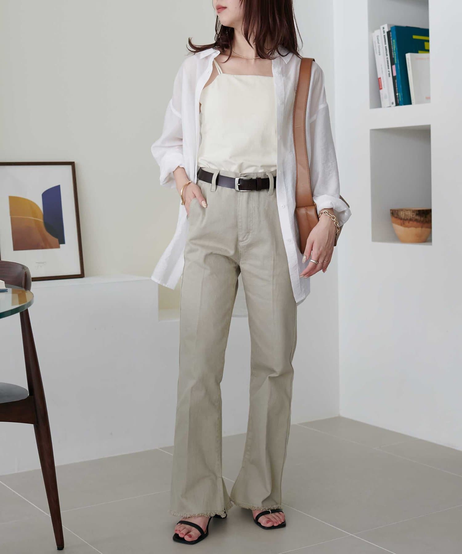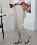 甘めのブラウスやワンピースと合わせたミックススタイルがおすすめ。すっきりとしたシルエットなので、オーバーサイズのトップスとも合わせて頂きやすいです。