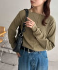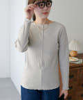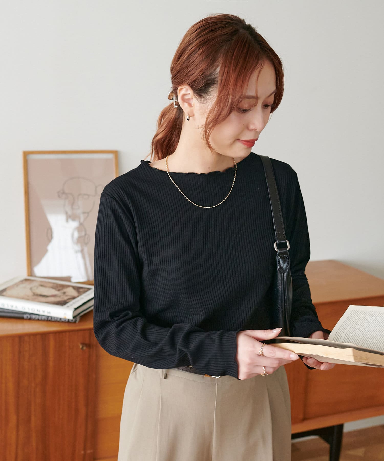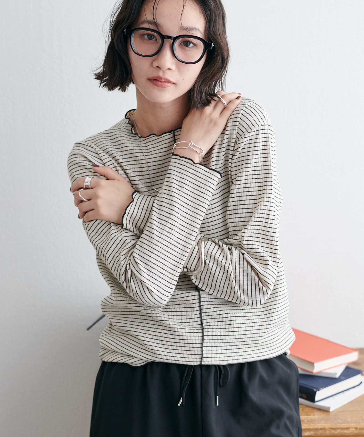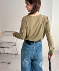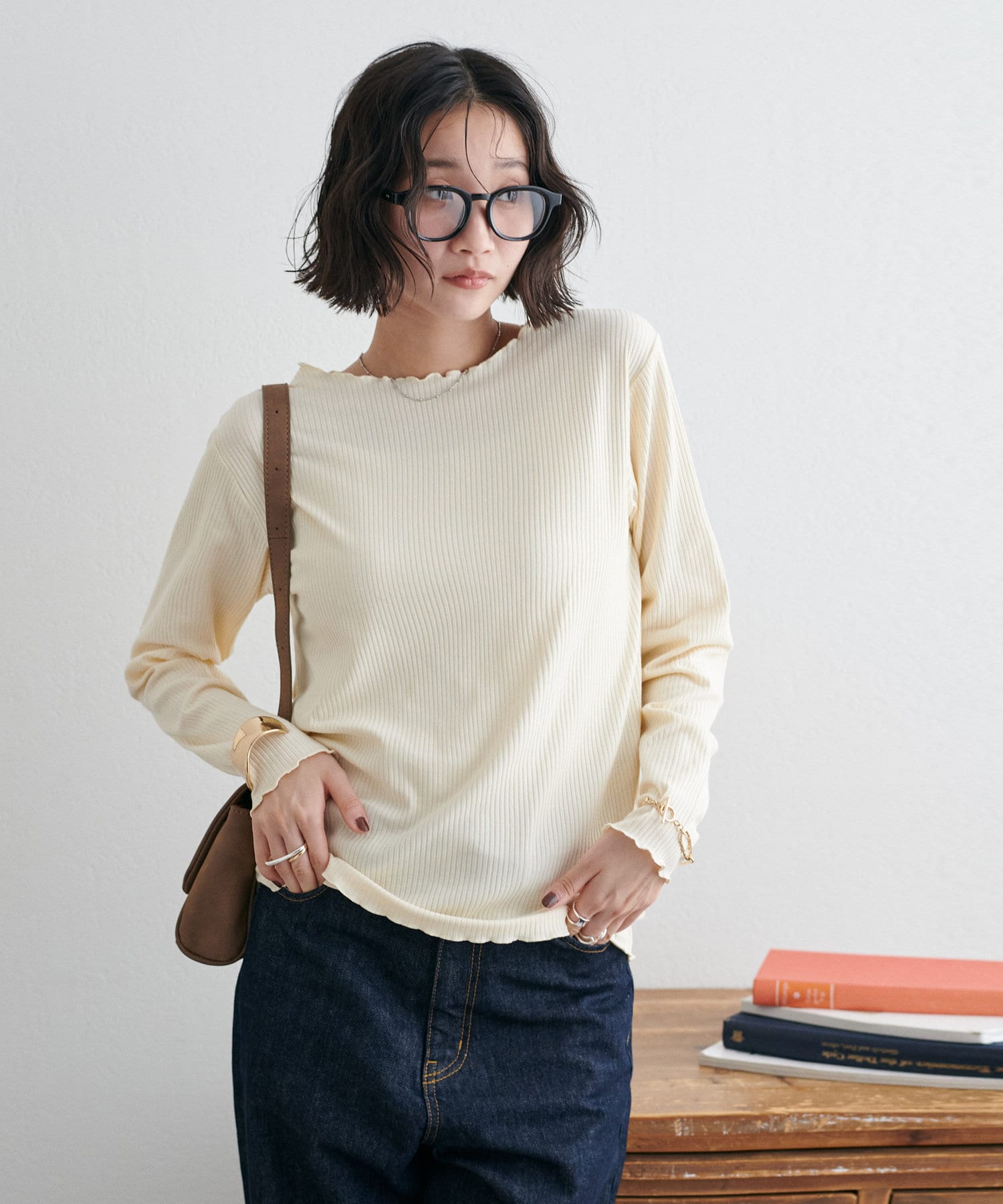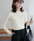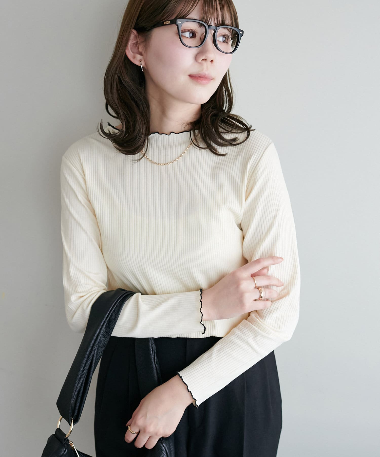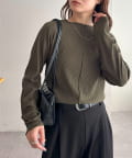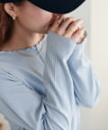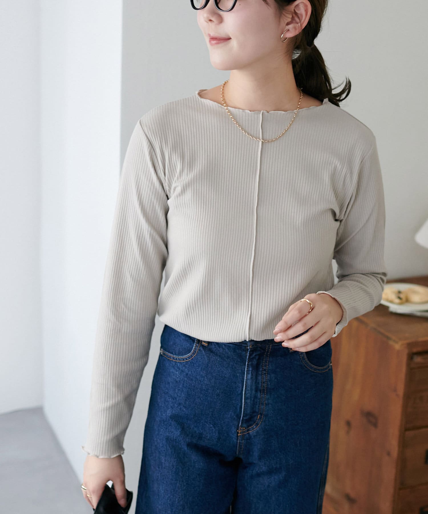 155cmレディーススタッフ(Fサイズ着用):首元や袖、裾のメロー仕立てがさりげないアクセントになっていて、1枚でもレイヤードのインナーとしても映えます。やわらかな肌あたりで、長時間着ても快適でした!