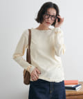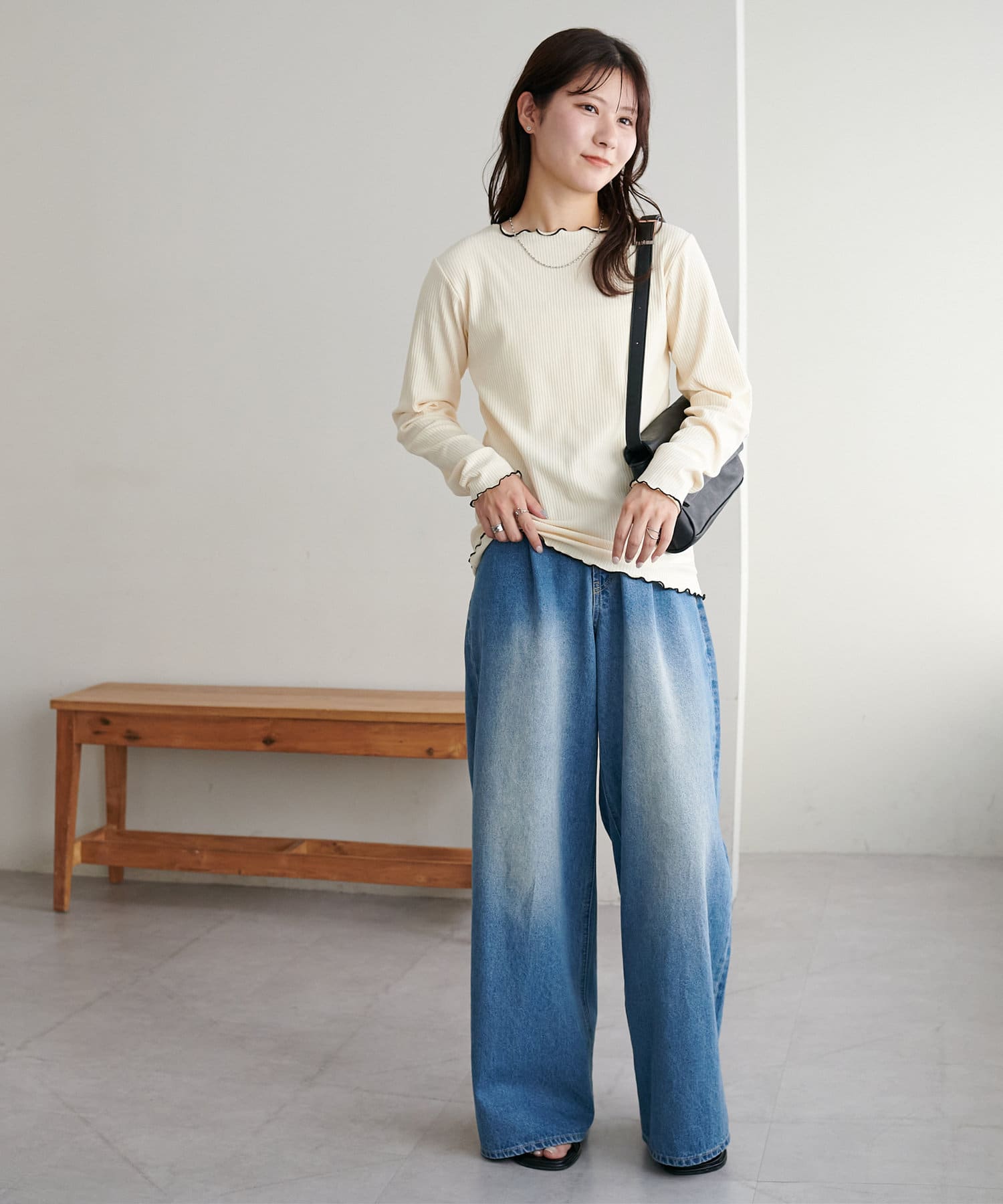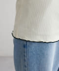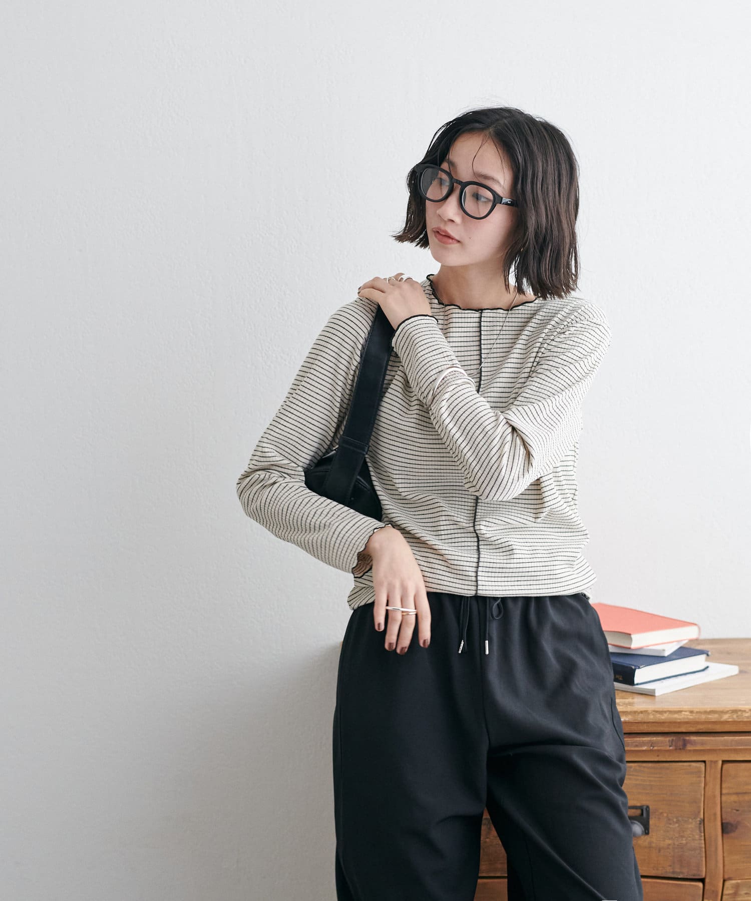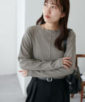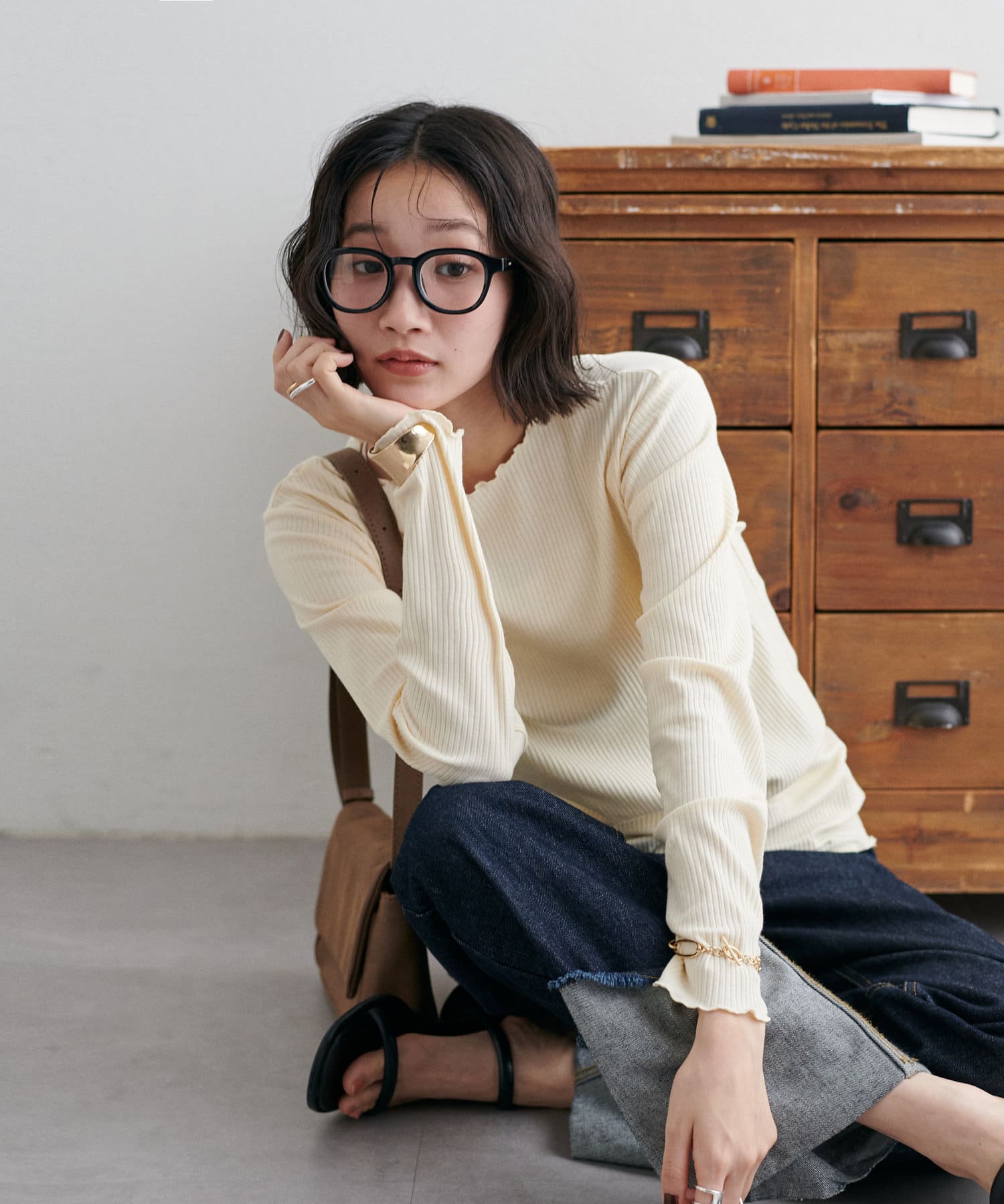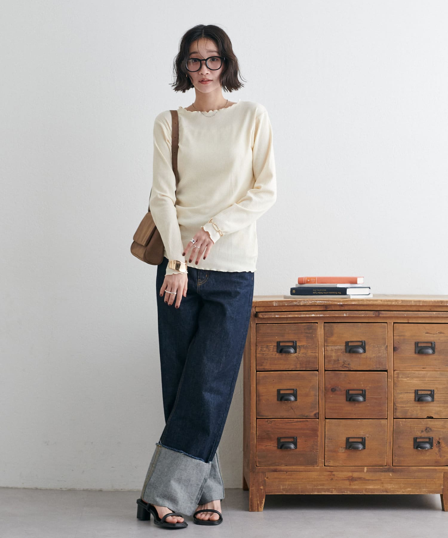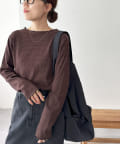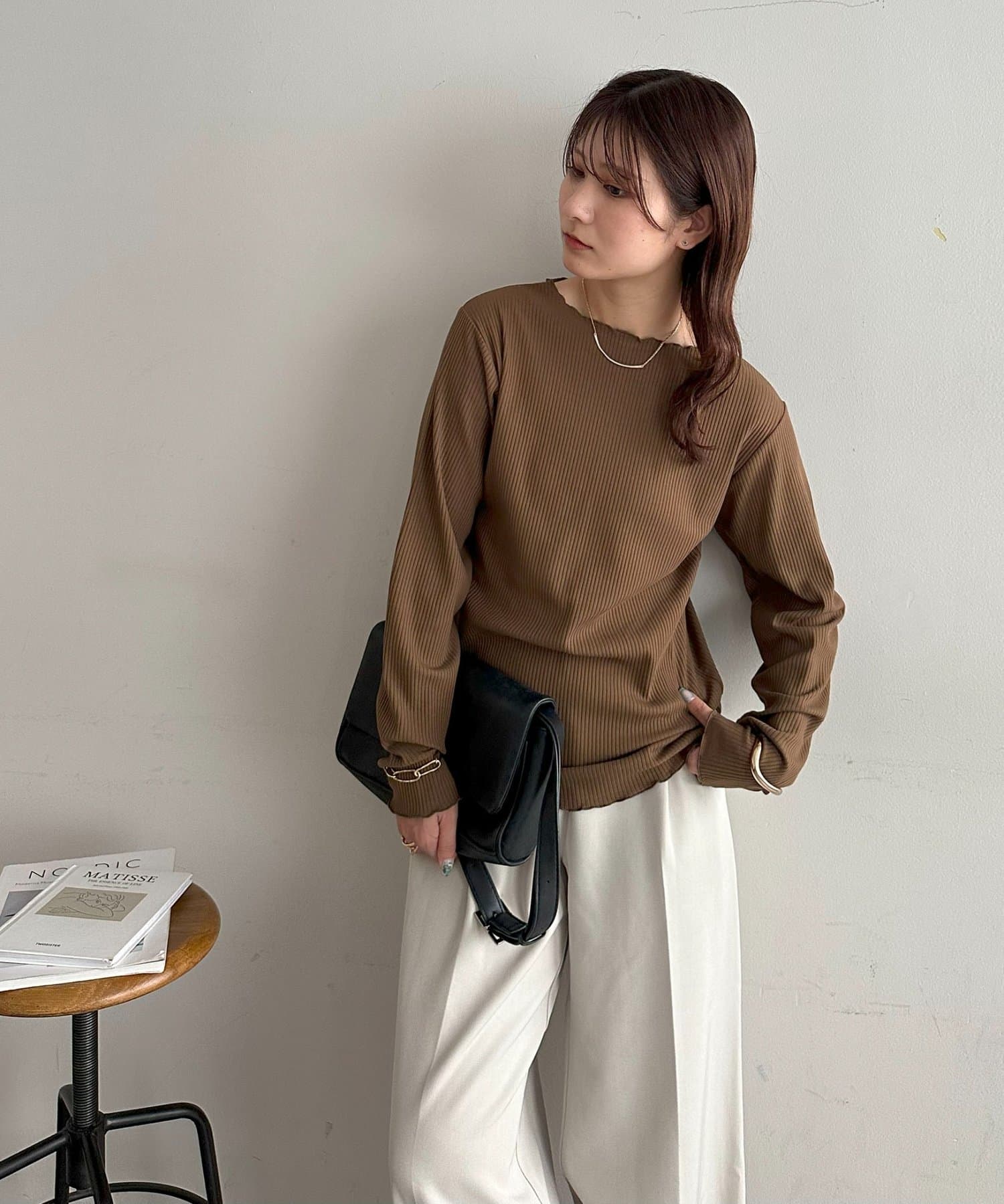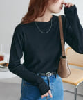 155cmレディーススタッフ(Fサイズ着用):首元や袖、裾のメロー仕立てがさりげないアクセントになっていて、1枚でもレイヤードのインナーとしても映えます。やわらかな肌あたりで、長時間着ても快適でした!
