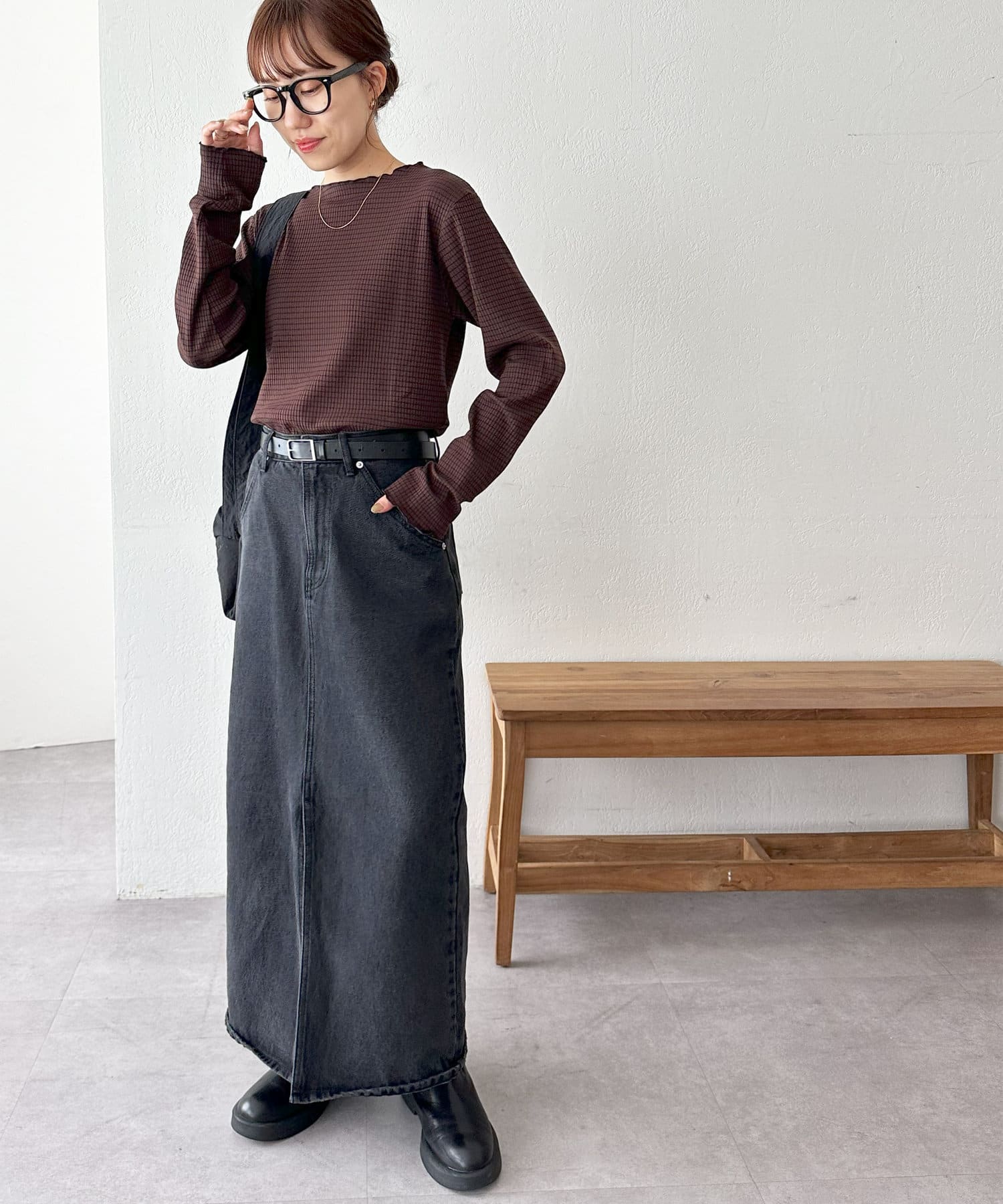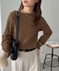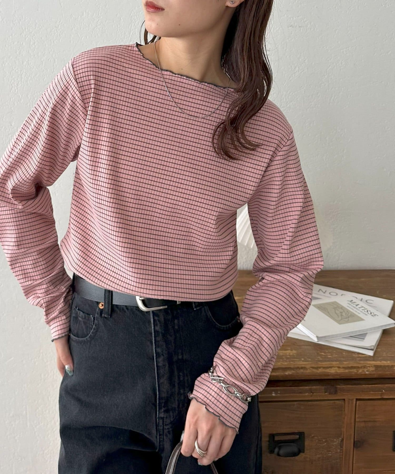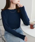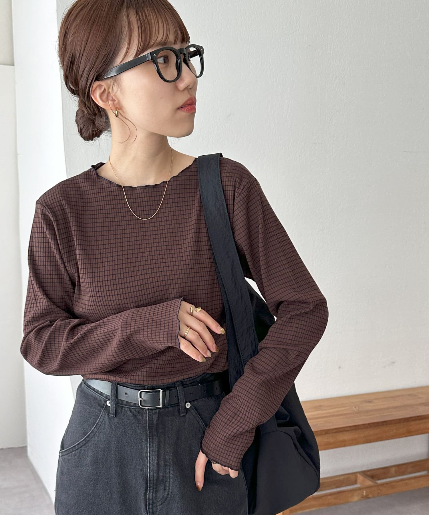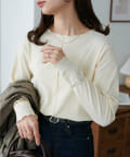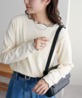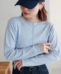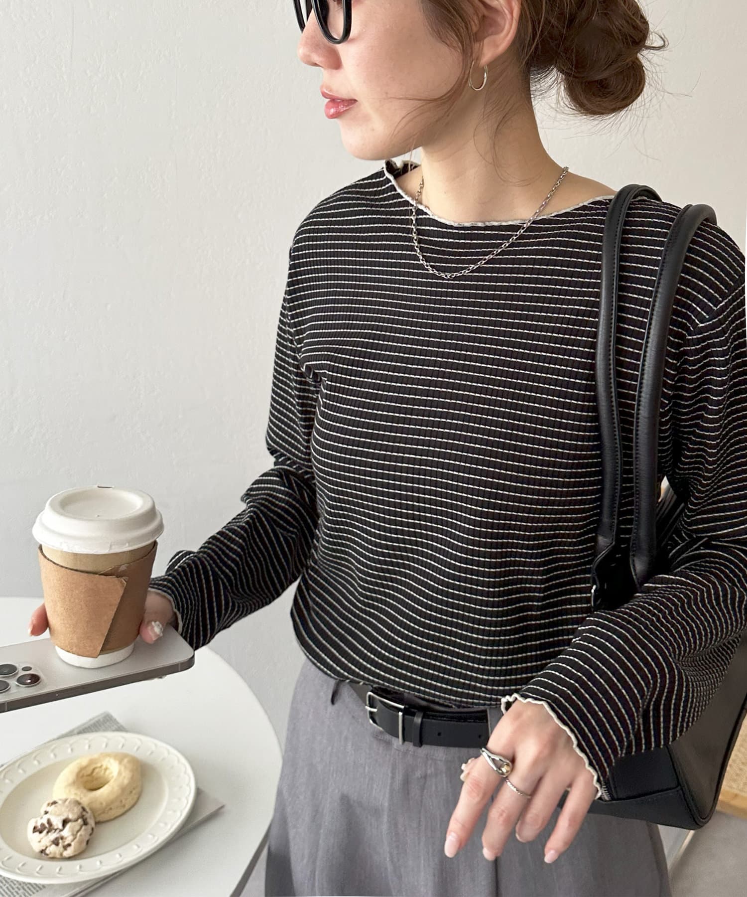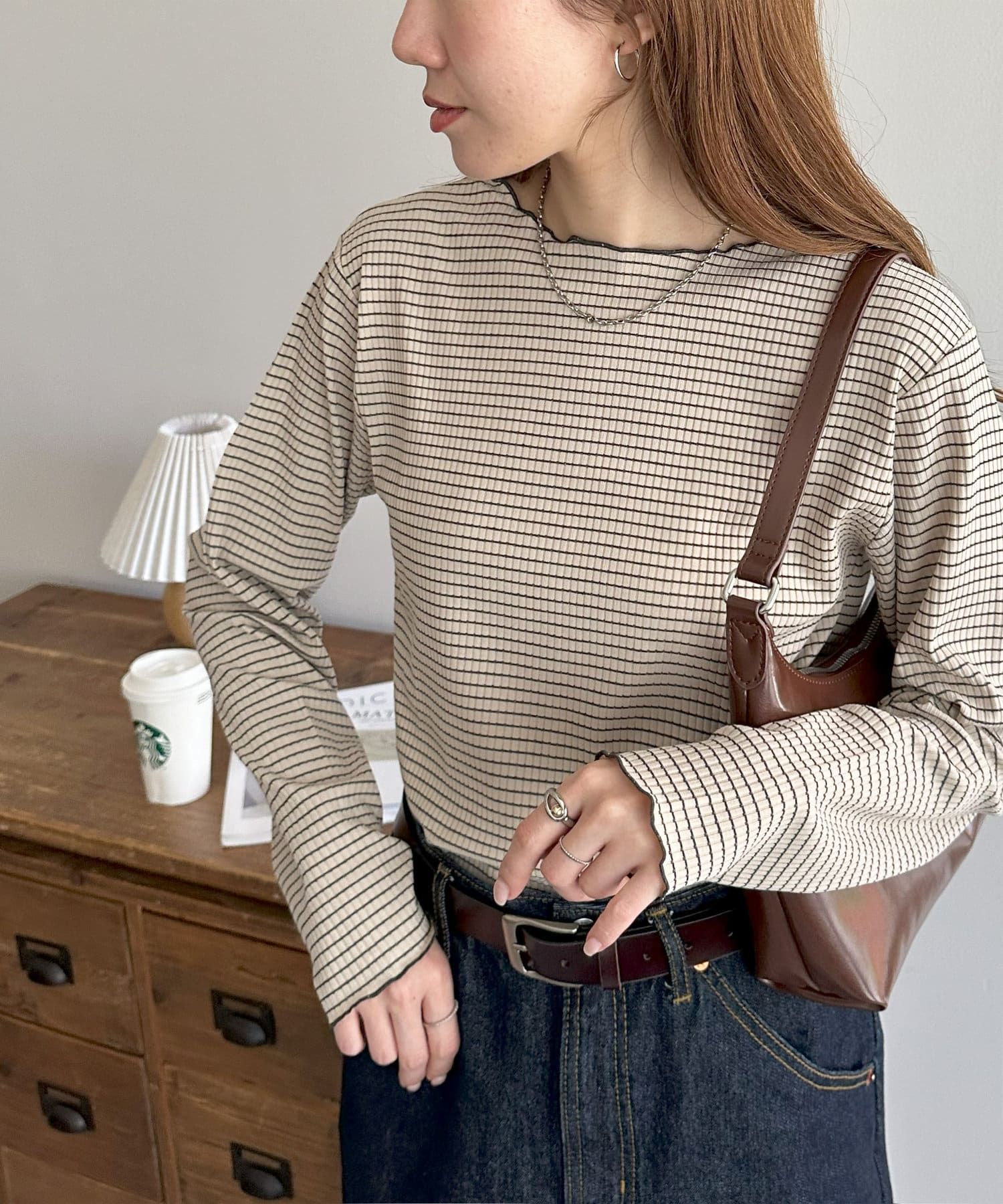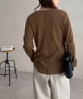 155cmレディーススタッフ(Fサイズ着用):首元や袖、裾のメロー仕立てがさりげないアクセントになっていて、1枚でもレイヤードのインナーとしても映えます。やわらかな肌あたりで、長時間着ても快適でした!