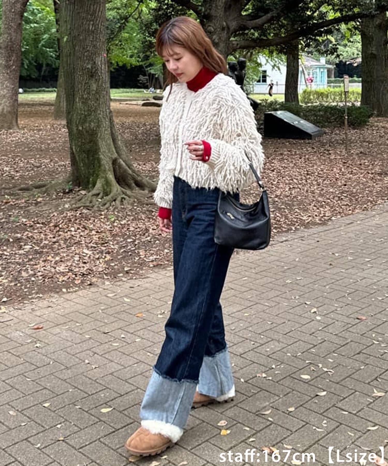 152cmスタッフ(Sサイズ着用):ヒール、ブーツを合わせると低身長でも挑戦できるサイズ感です。