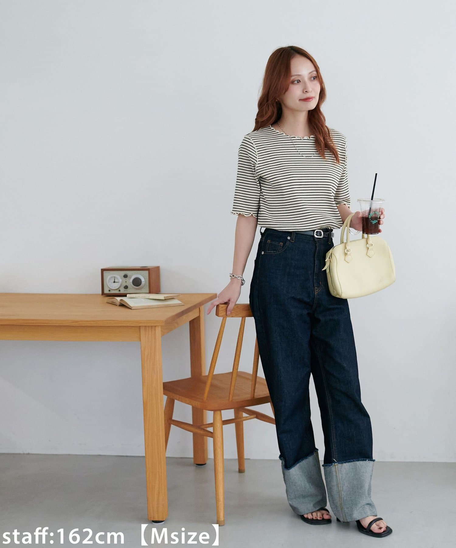 168cmスタッフ(Lサイズ着用):折り返しタイプが新鮮なデニムパンツはハイウエストでやや長めなので、高身長には嬉しいデザインです◎
