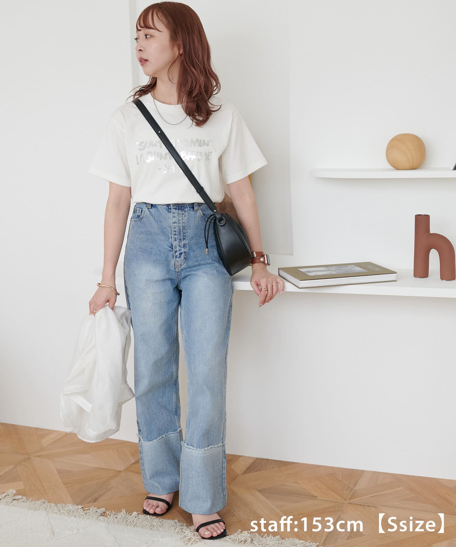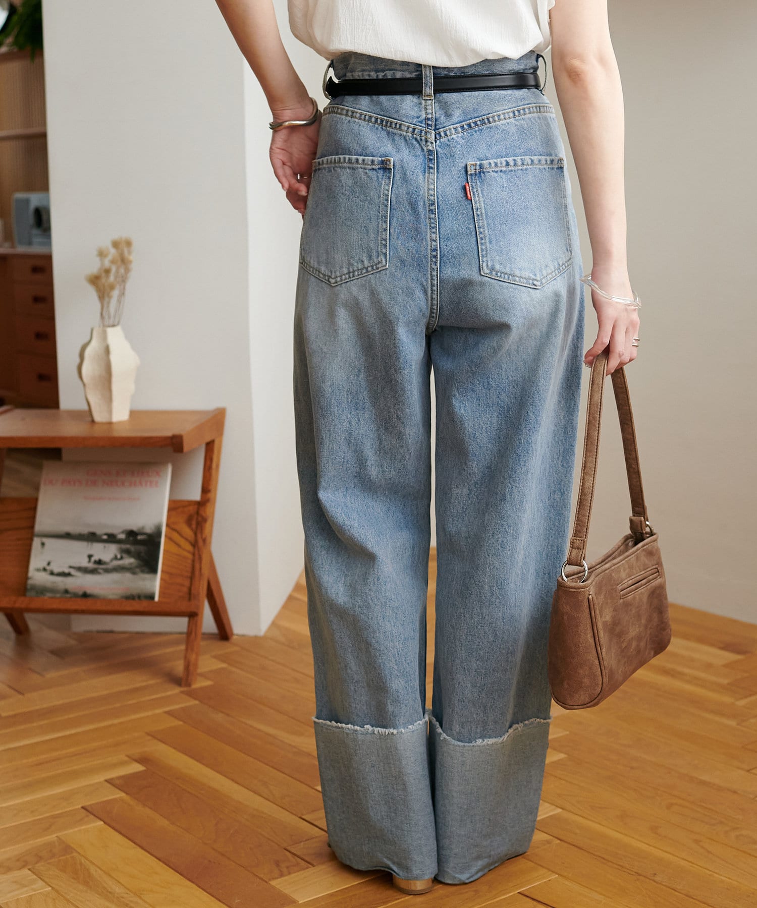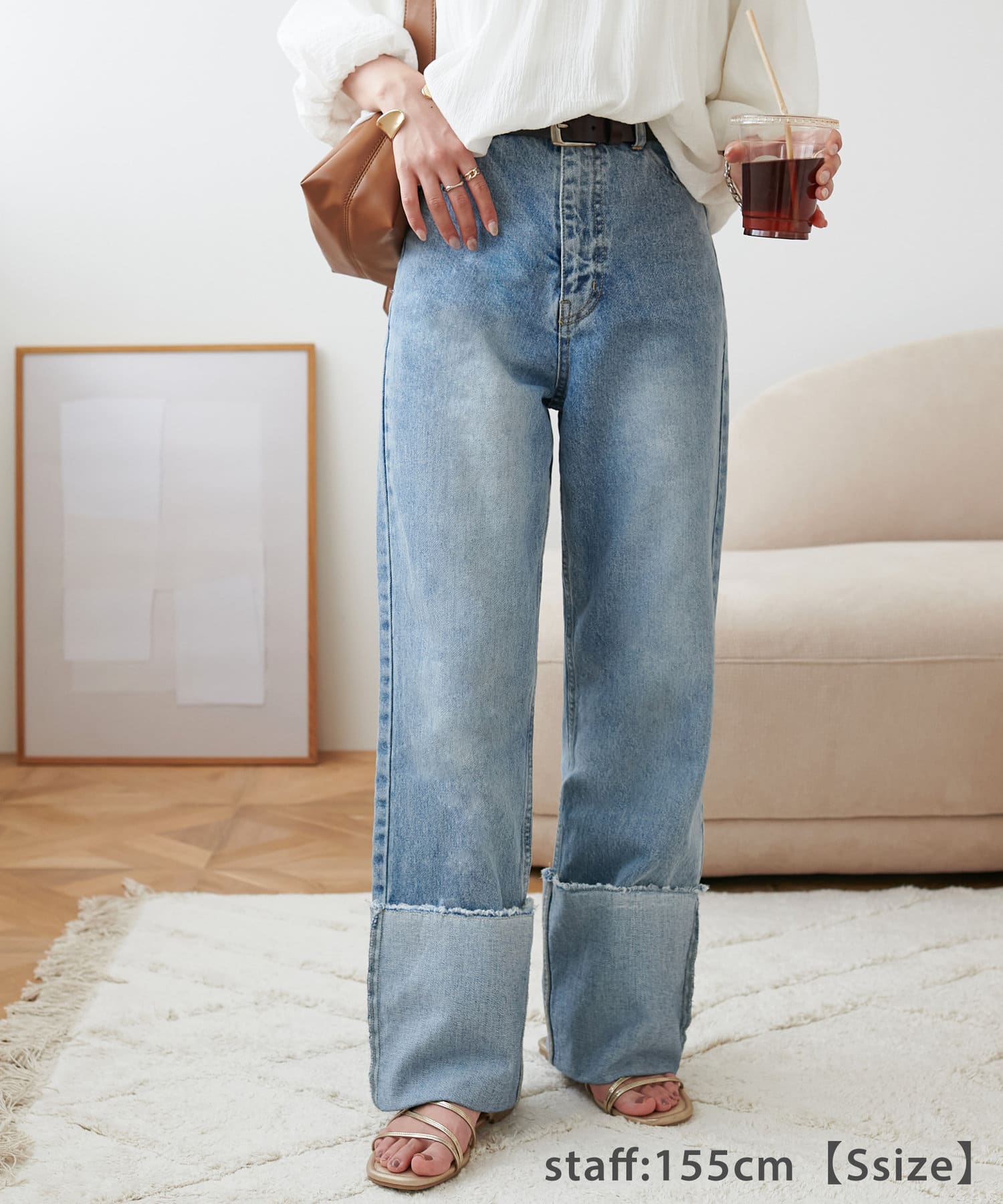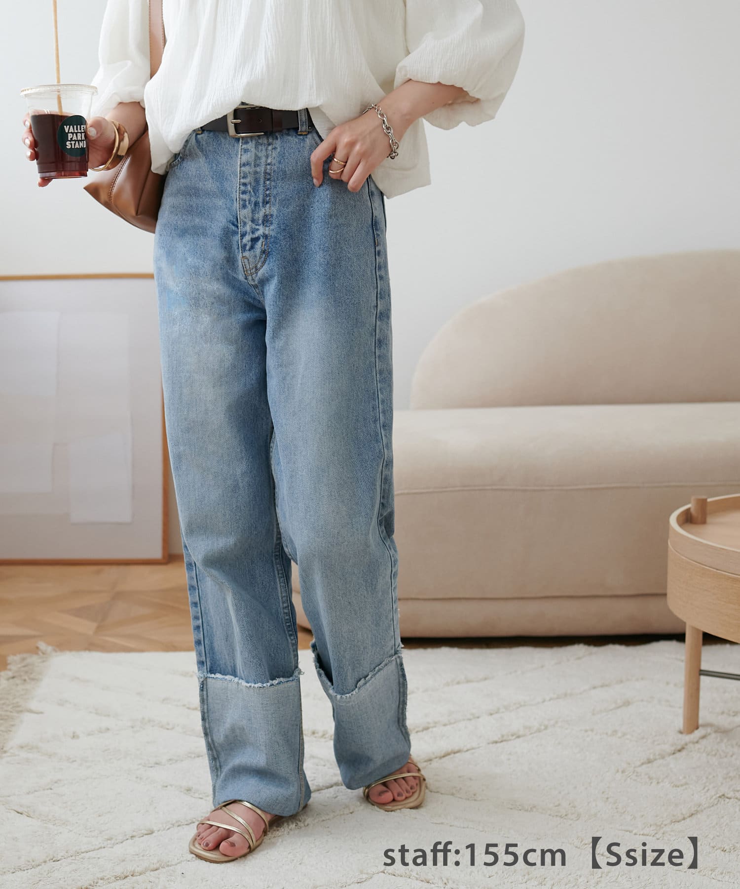 168cmスタッフ(Lサイズ着用):折り返しタイプが新鮮なデニムパンツはハイウエストでやや長めなので、高身長には嬉しいデザインです◎