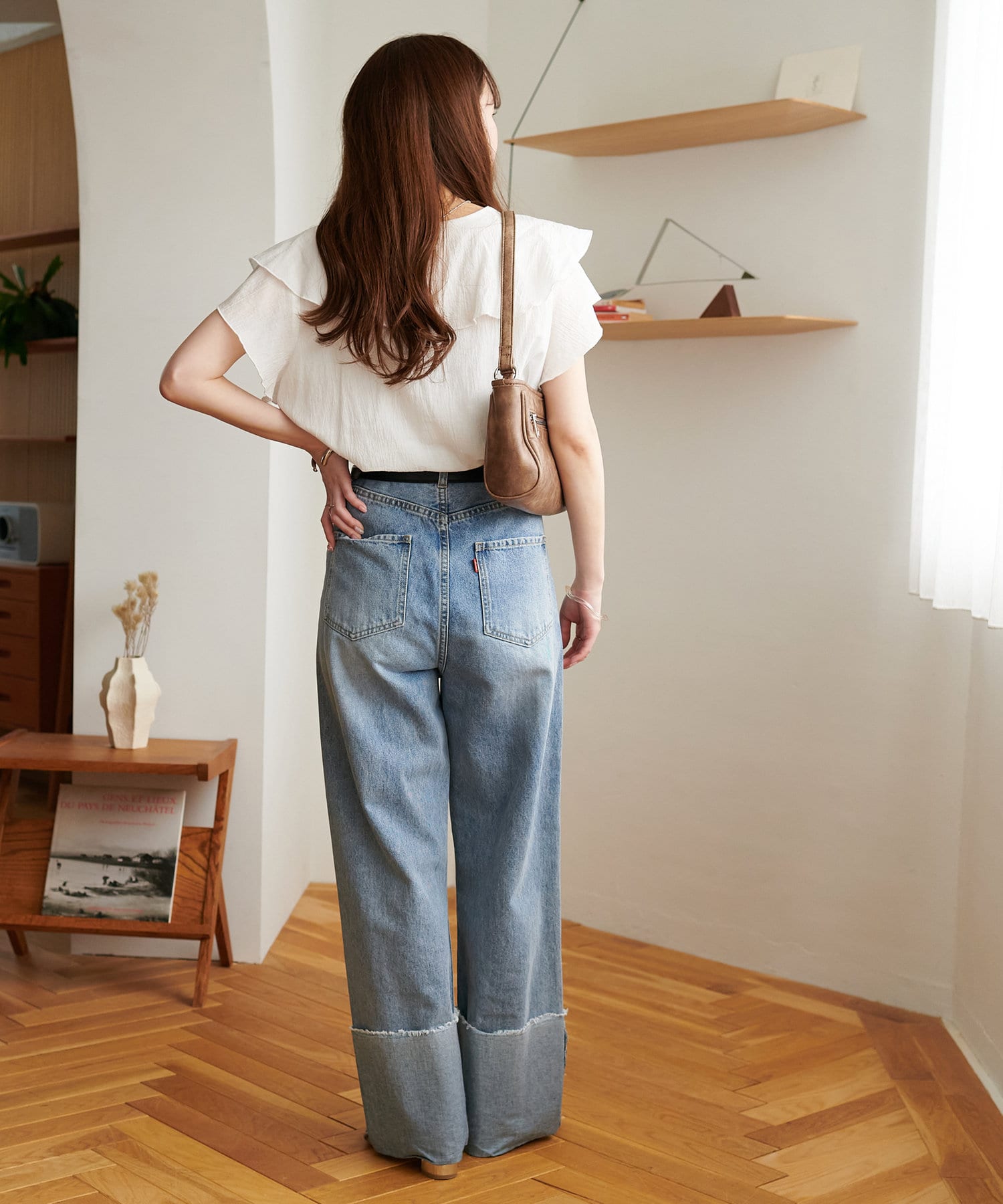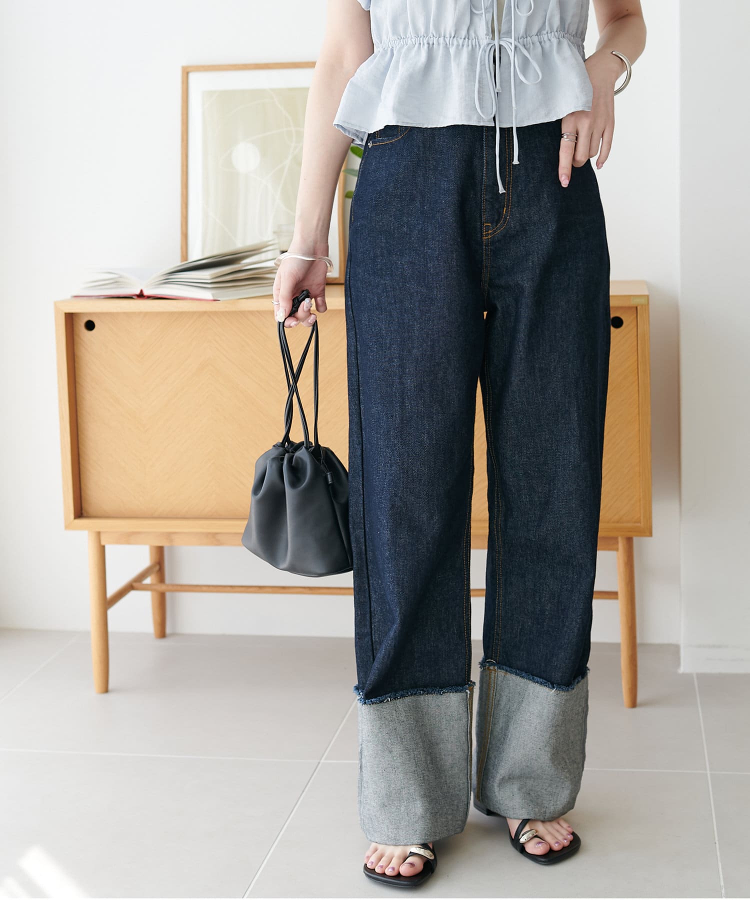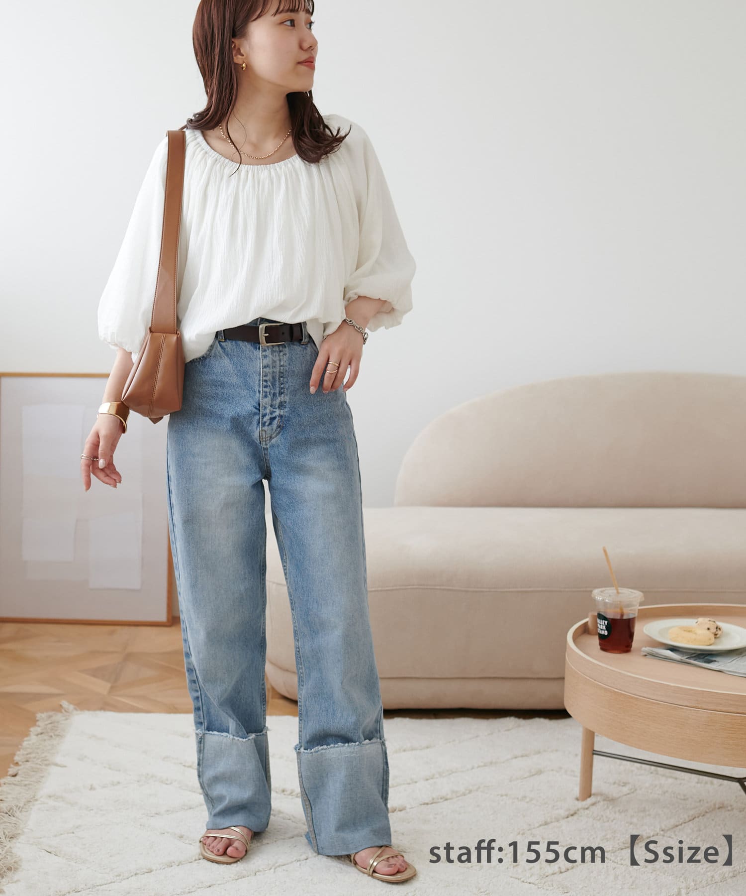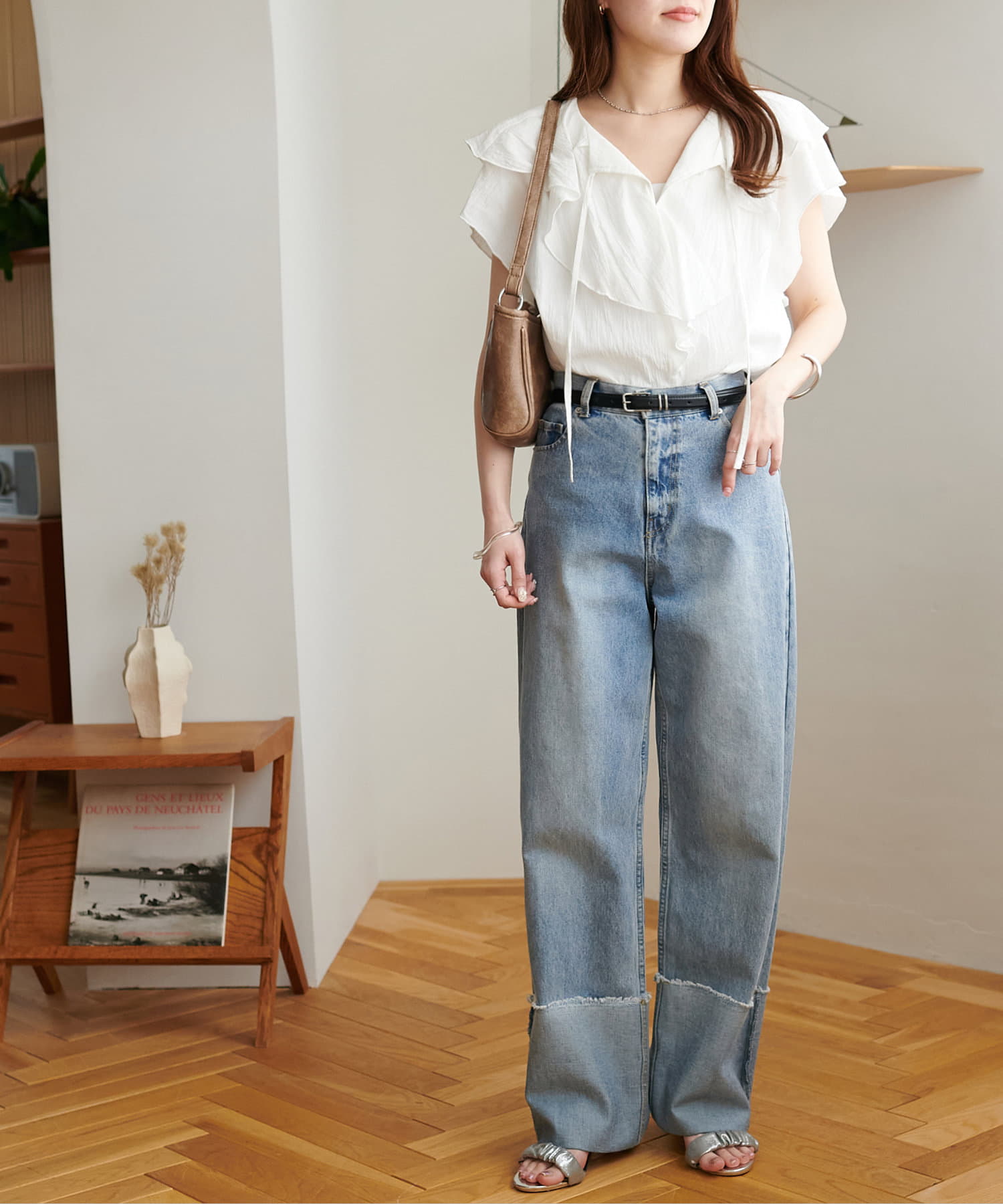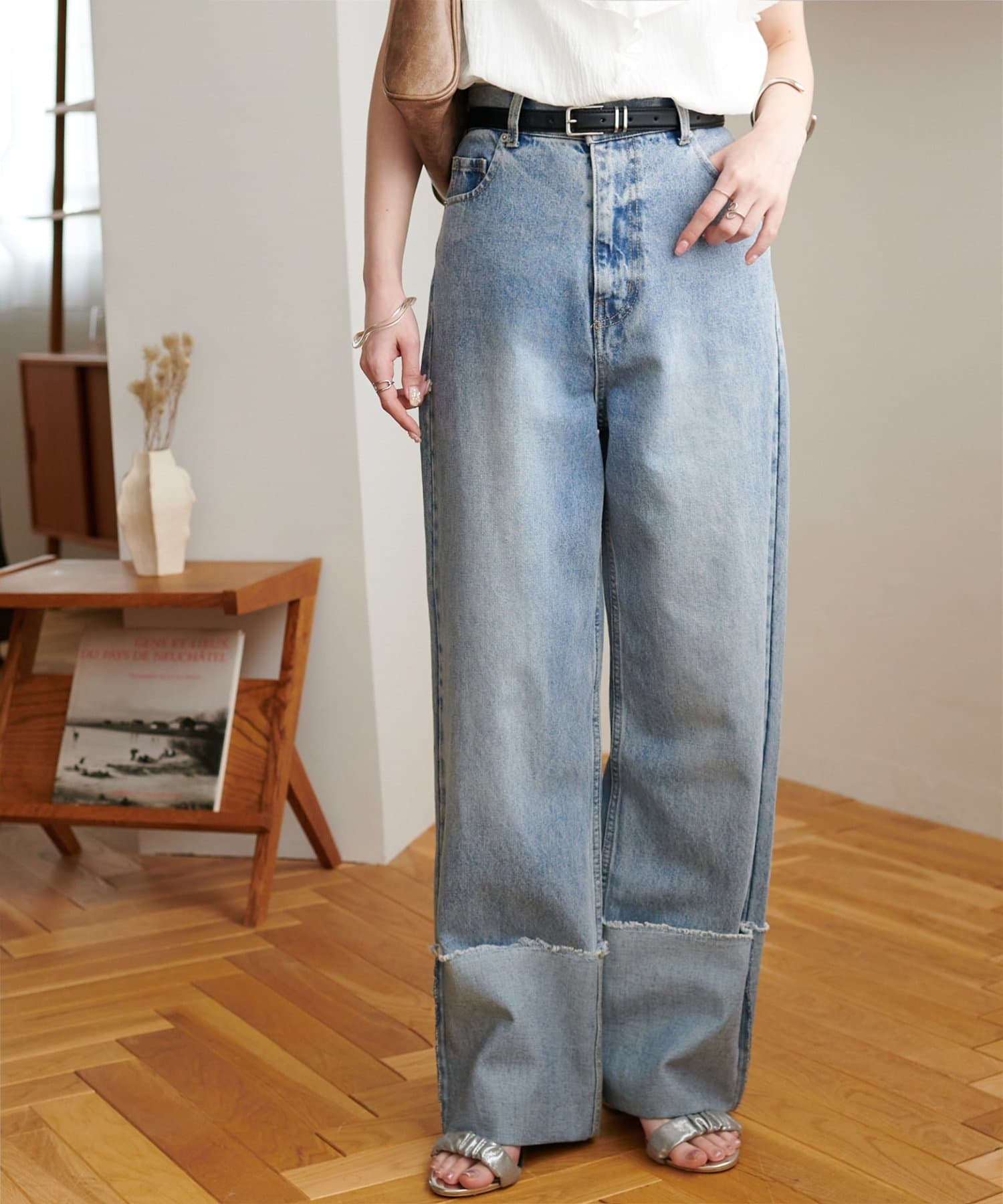 168cmスタッフ(Lサイズ着用):折り返しタイプが新鮮なデニムパンツはハイウエストでやや長めなので、高身長には嬉しいデザインです◎