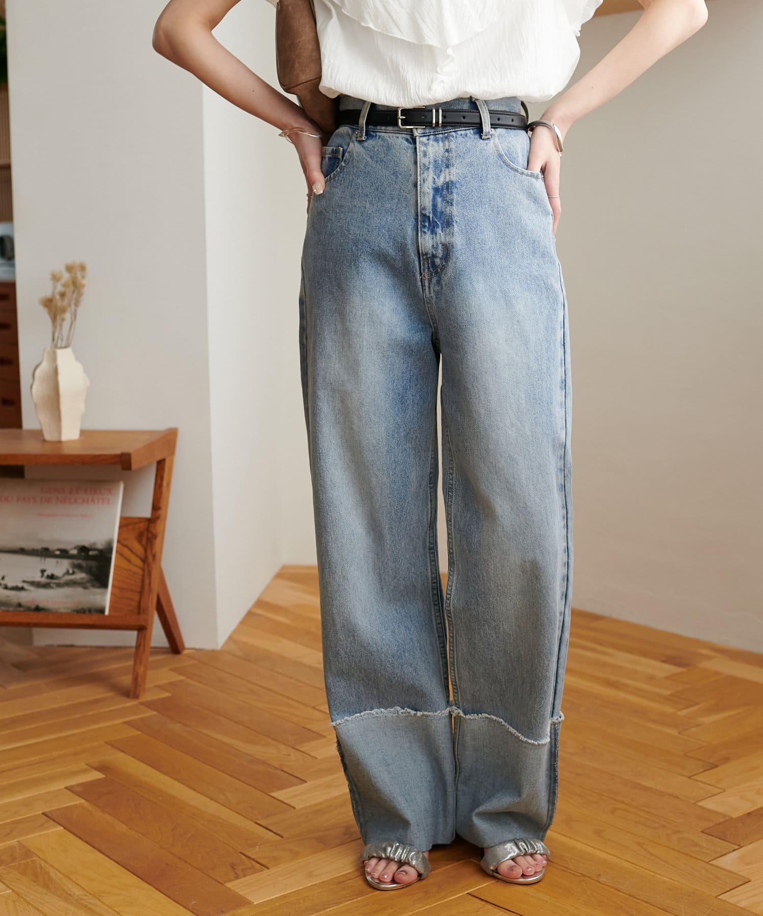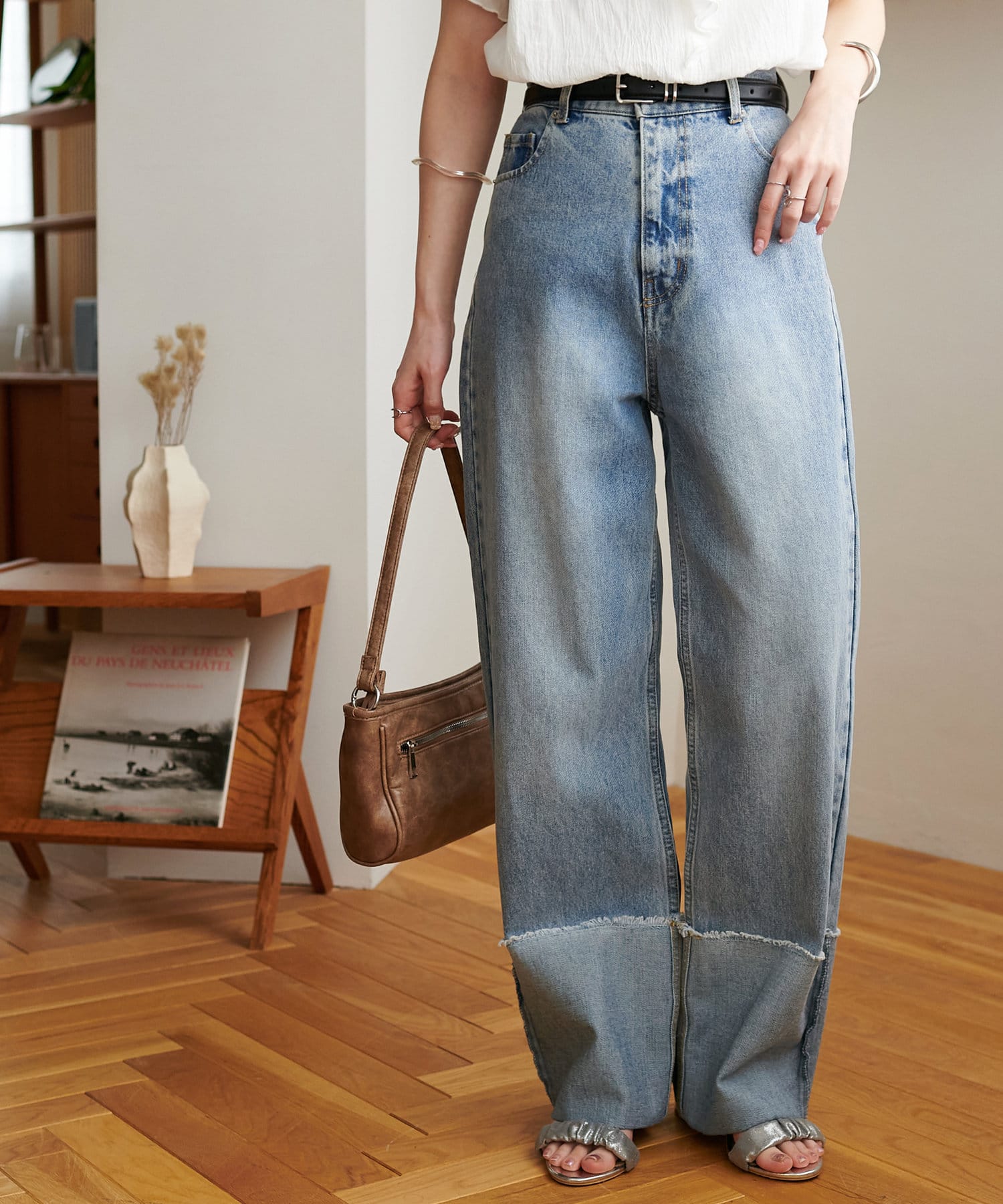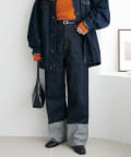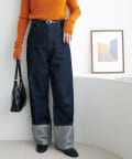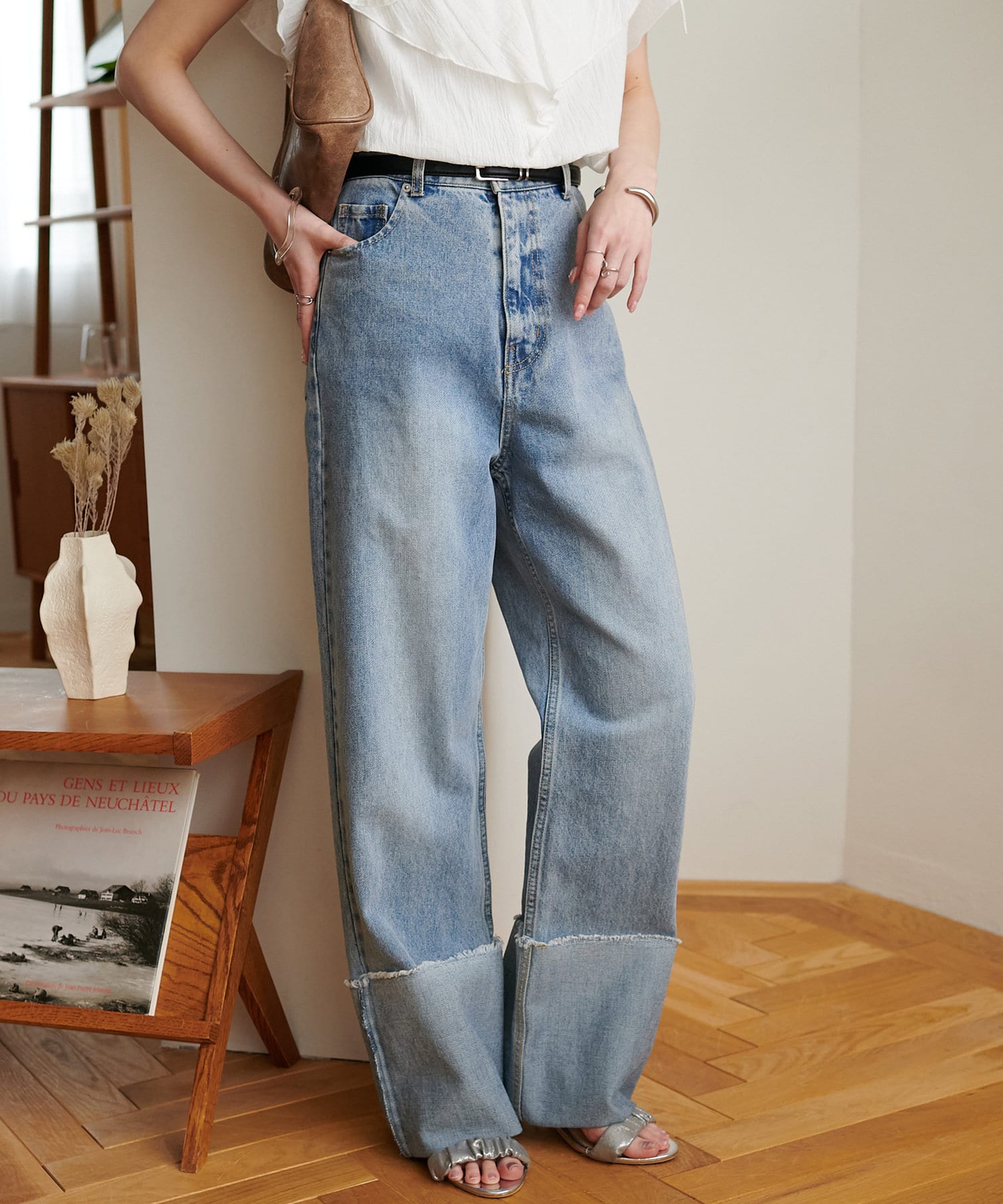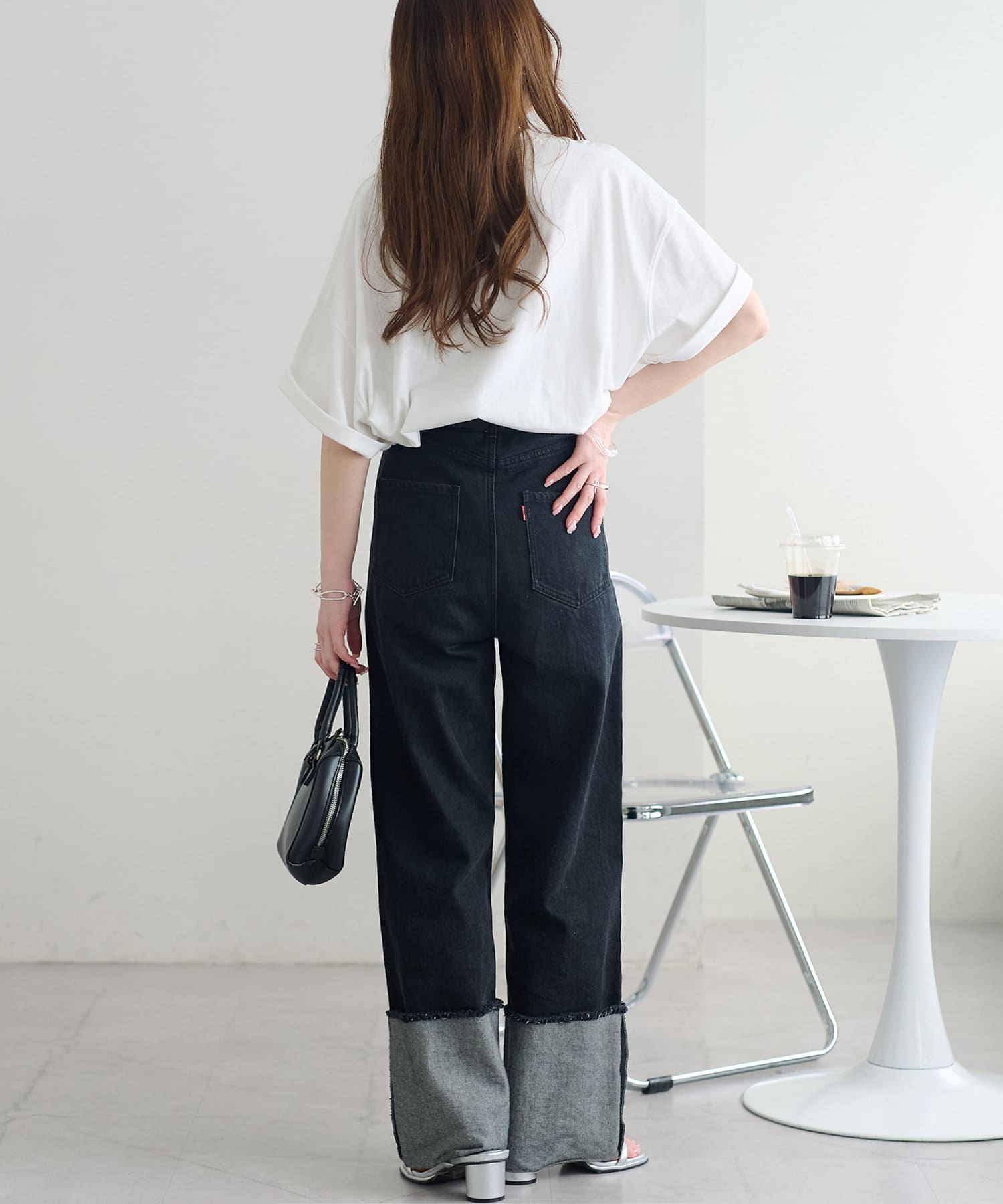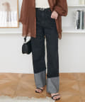168cmスタッフ(Lサイズ着用):折り返しタイプが新鮮なデニムパンツはハイウエストでやや長めなので、高身長には嬉しいデザインです◎