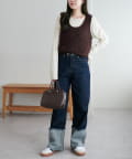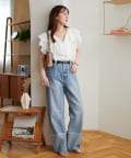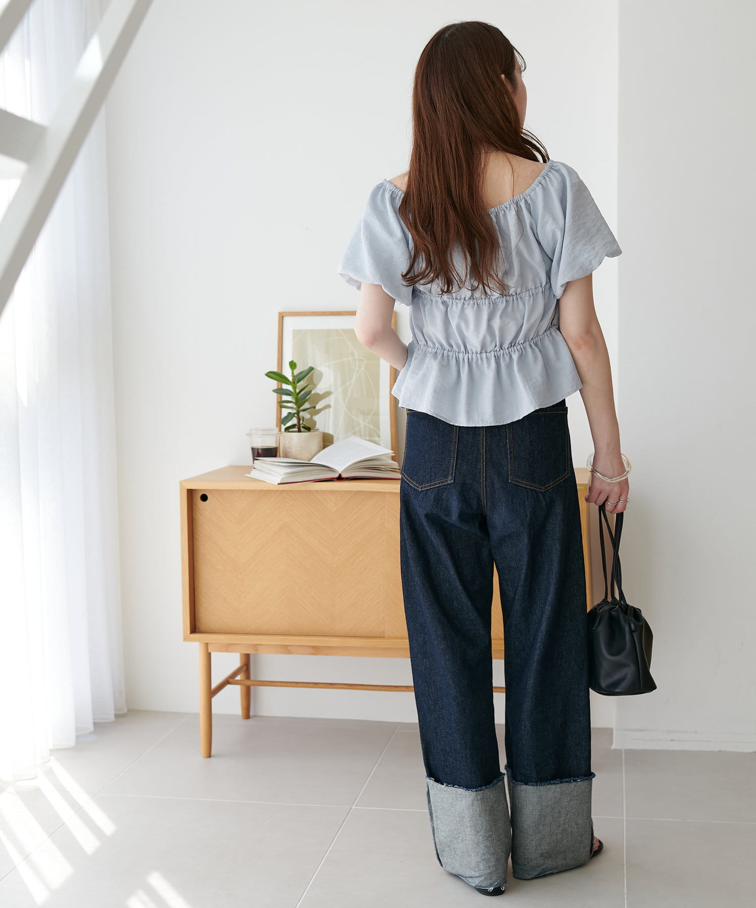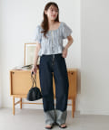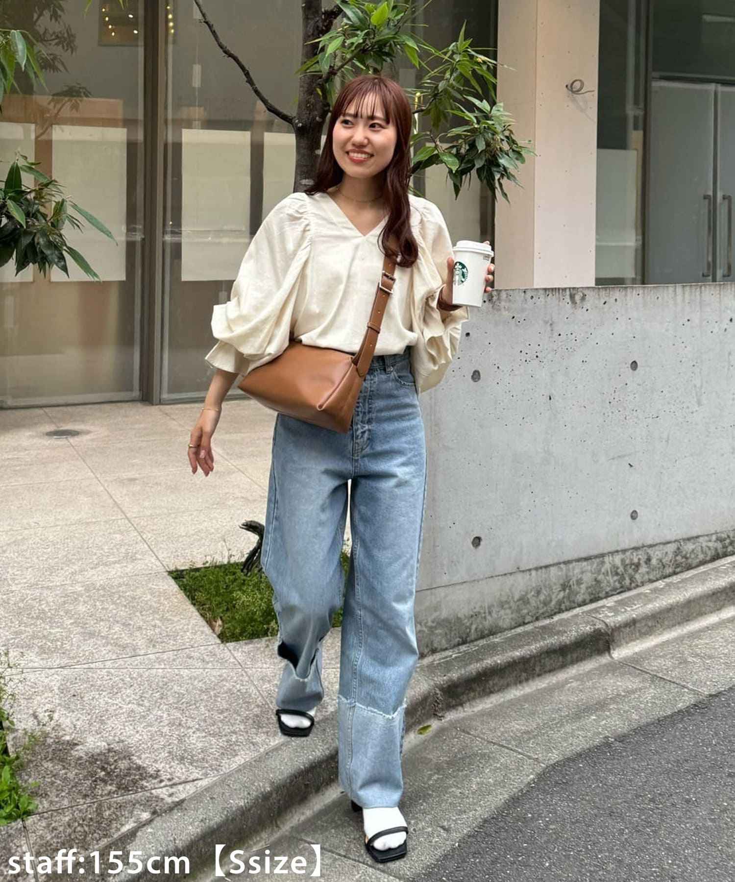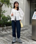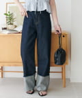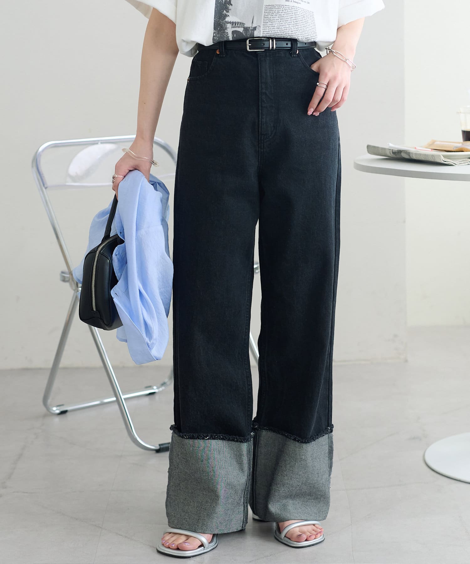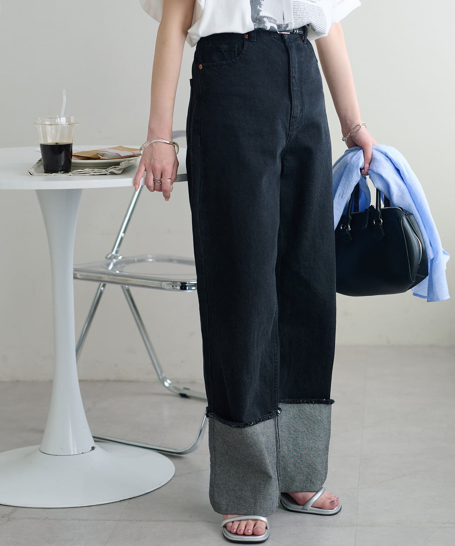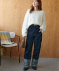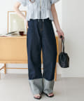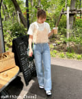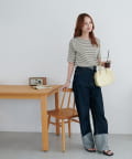 168cmスタッフ(Lサイズ着用):折り返しタイプが新鮮なデニムパンツはハイウエストでやや長めなので、高身長には嬉しいデザインです◎