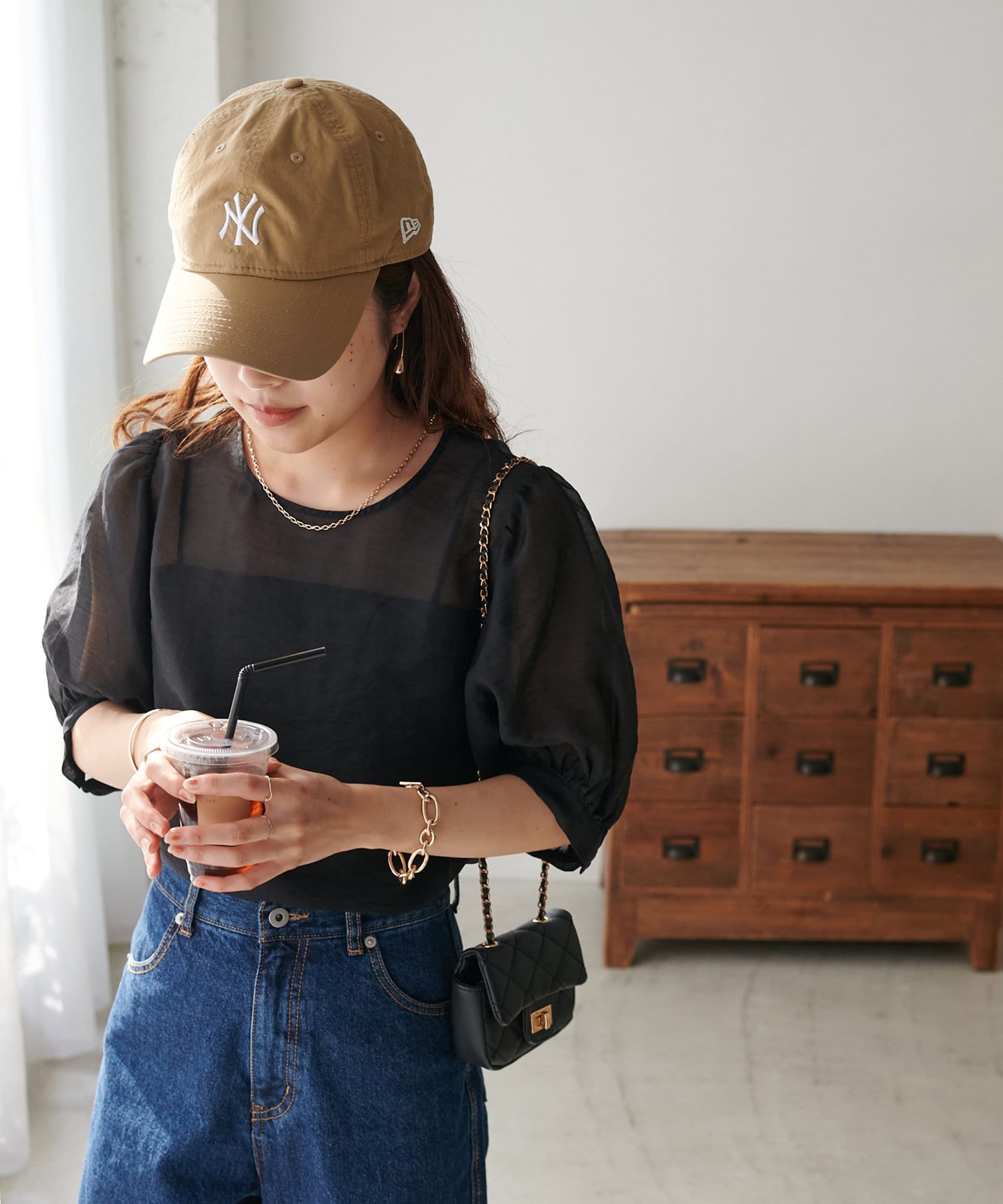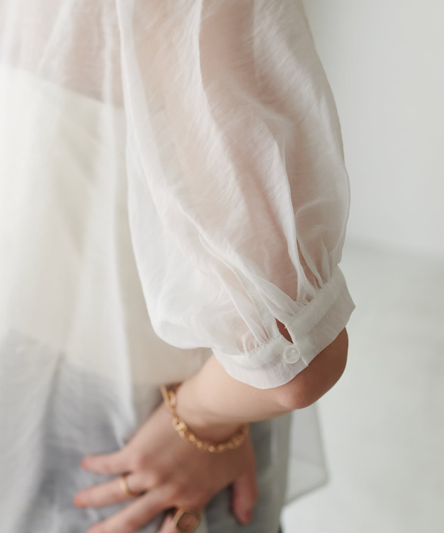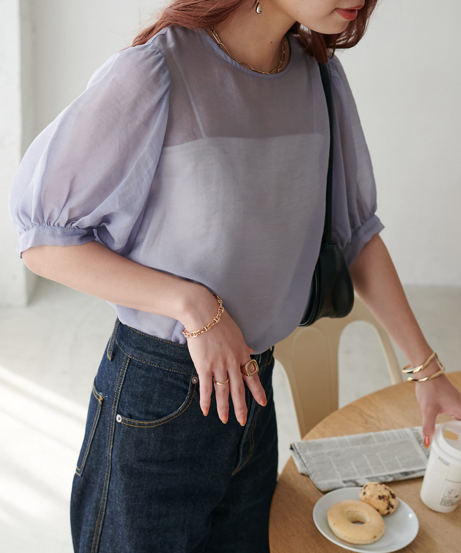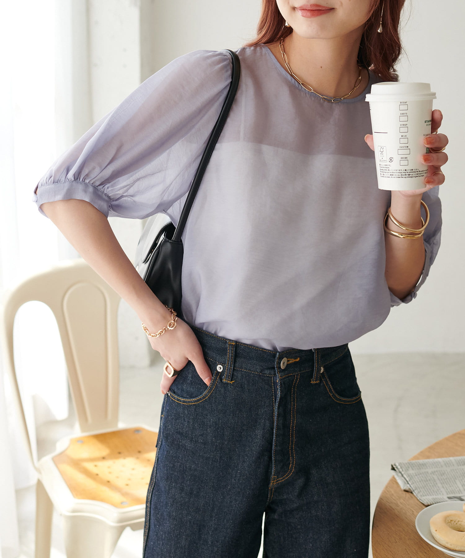 袖丈が5分袖のデザインで今から長く使えるアイテム。透け感のある素材が、軽やかな雰囲気に仕上げてくれるブラウスです。肩と袖口にギャザーを入れたふんわりとしたシルエットが、女性らしい印象に。オンオフ問わず使えて、合わせるボトムス次第でカジュアルにもキレイメにも着回せるアイテムです♪
