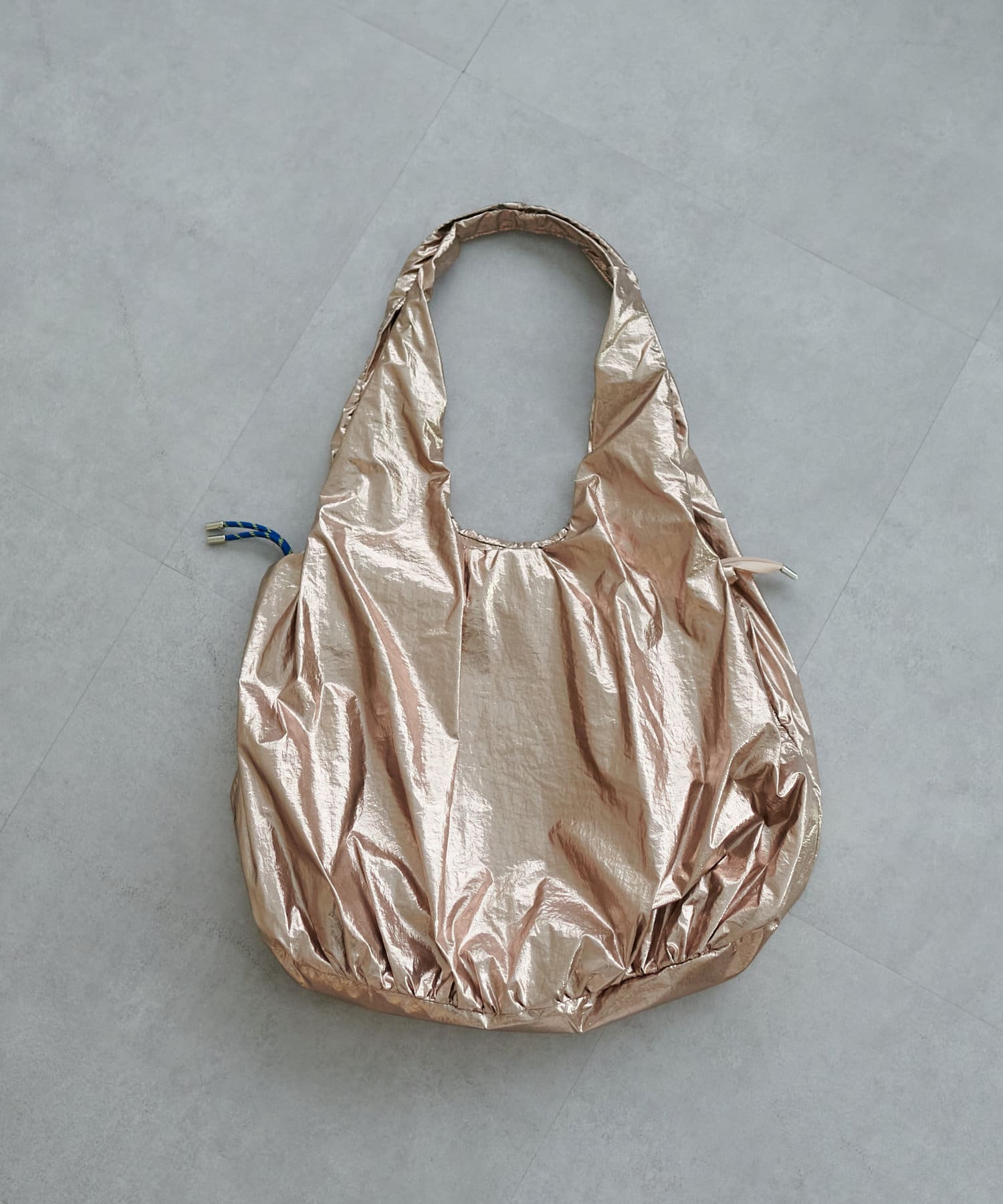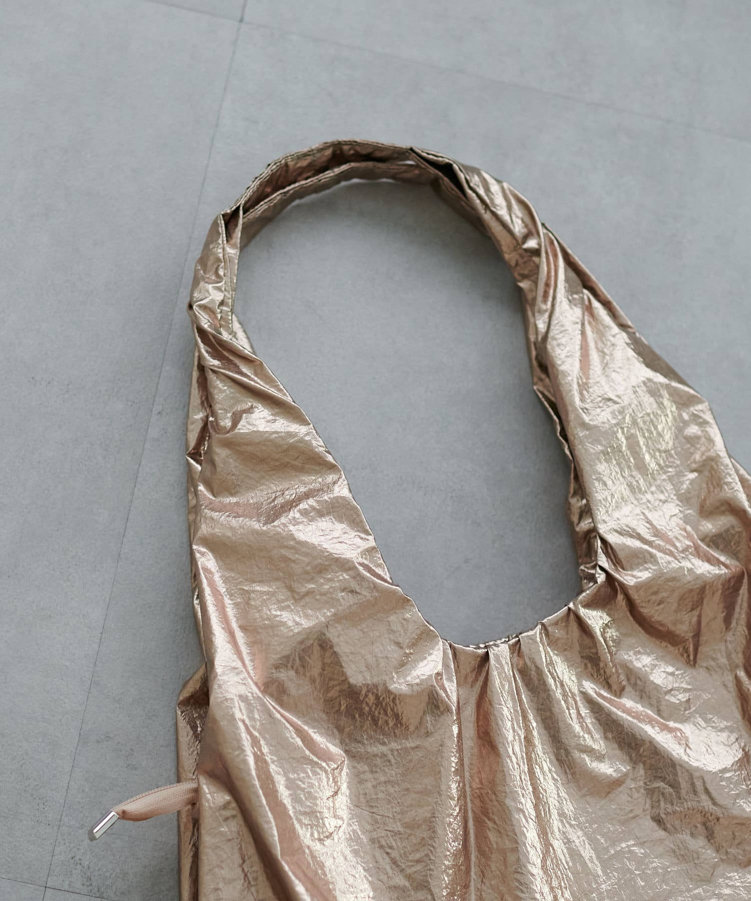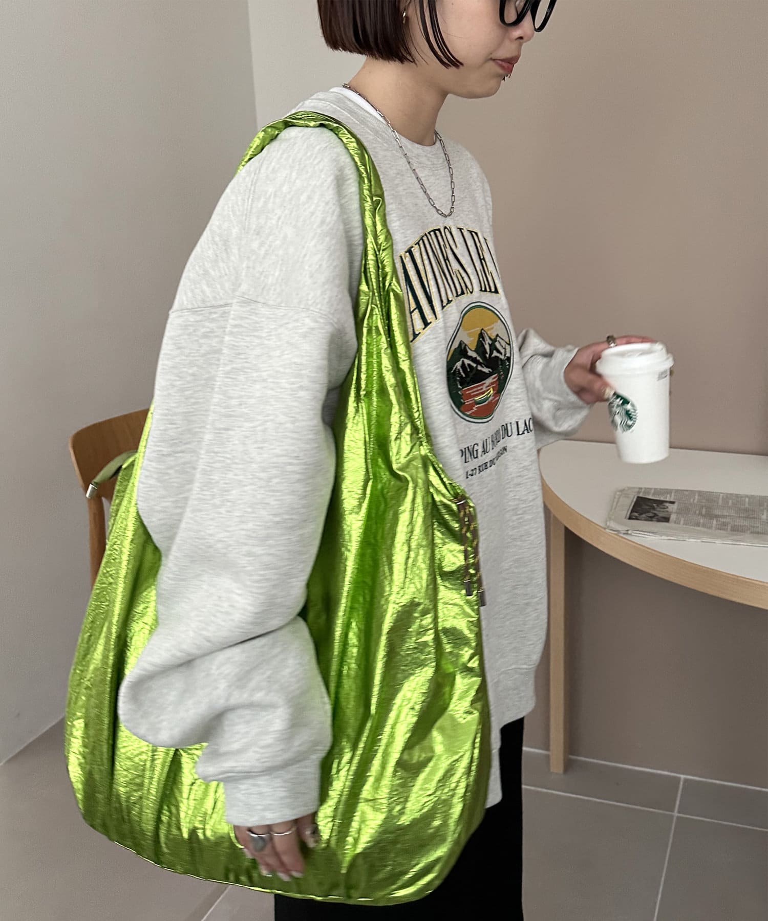 主役級の存在感のトートバッグ。キラキラとしたメタリック素材が特徴的で、目を引きます。サイズは高さ36㎝、幅57㎝と大きめで、大容量◎なのでちょっとした旅行の際にも大活躍間違いなしです。また、雑誌やiPadなども楽々入るので、通勤や通学にもオススメ◎持ち手が長めなので、腕回りにゆとりがあり、厚手のスウェットやアウターの上からでも問題なくスムーズに肩掛けできます◎季節問わずシーズンレスでお使いいただけるアイテムです。素材自体は柔らかく、軽いので、畳んでサブバッグとして持ち歩くのもオススメです。ファスナーにはそれぞれのカラーに合わせたストラップ紐が付いているなど、拘りのつまったアイテムです♪