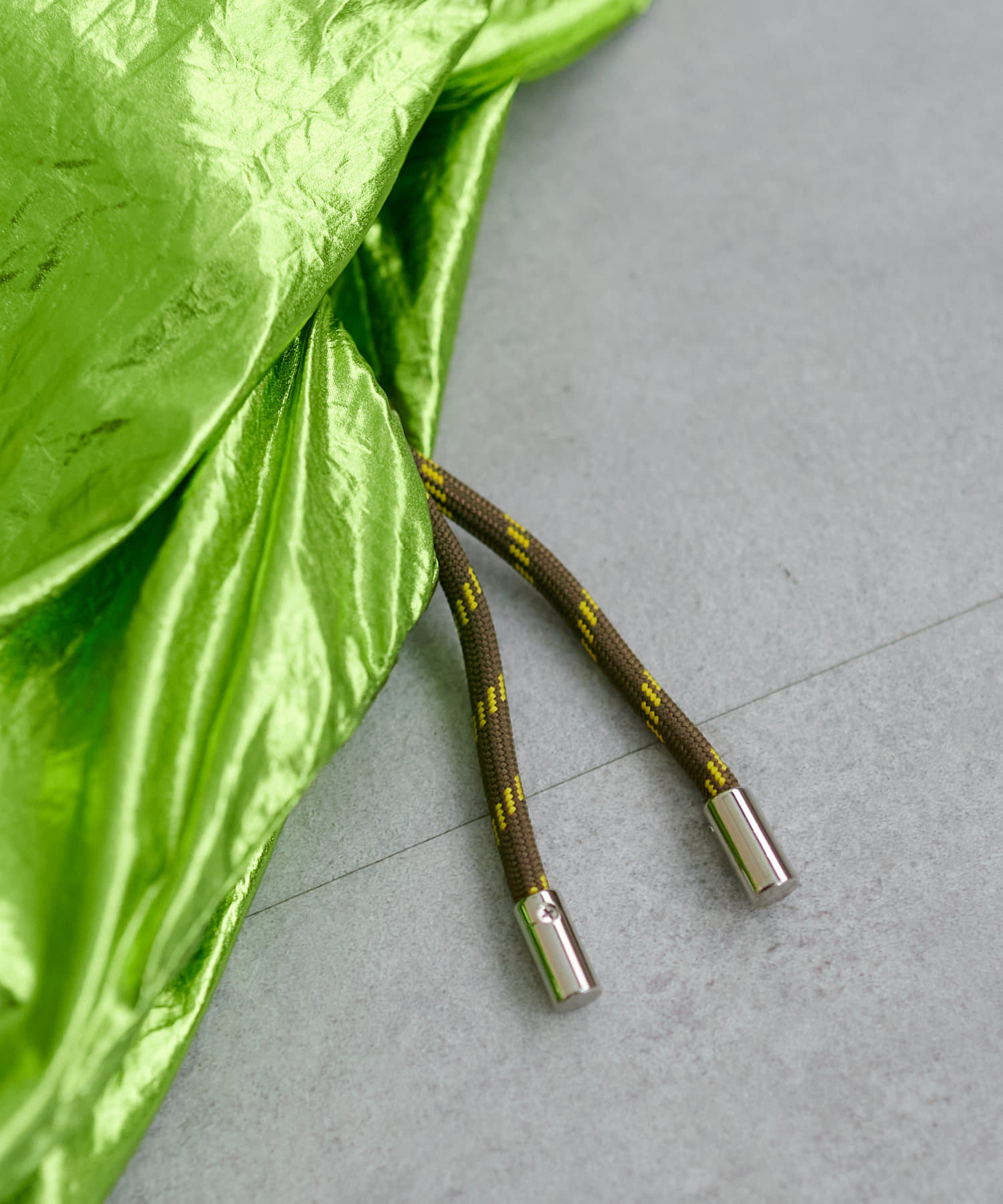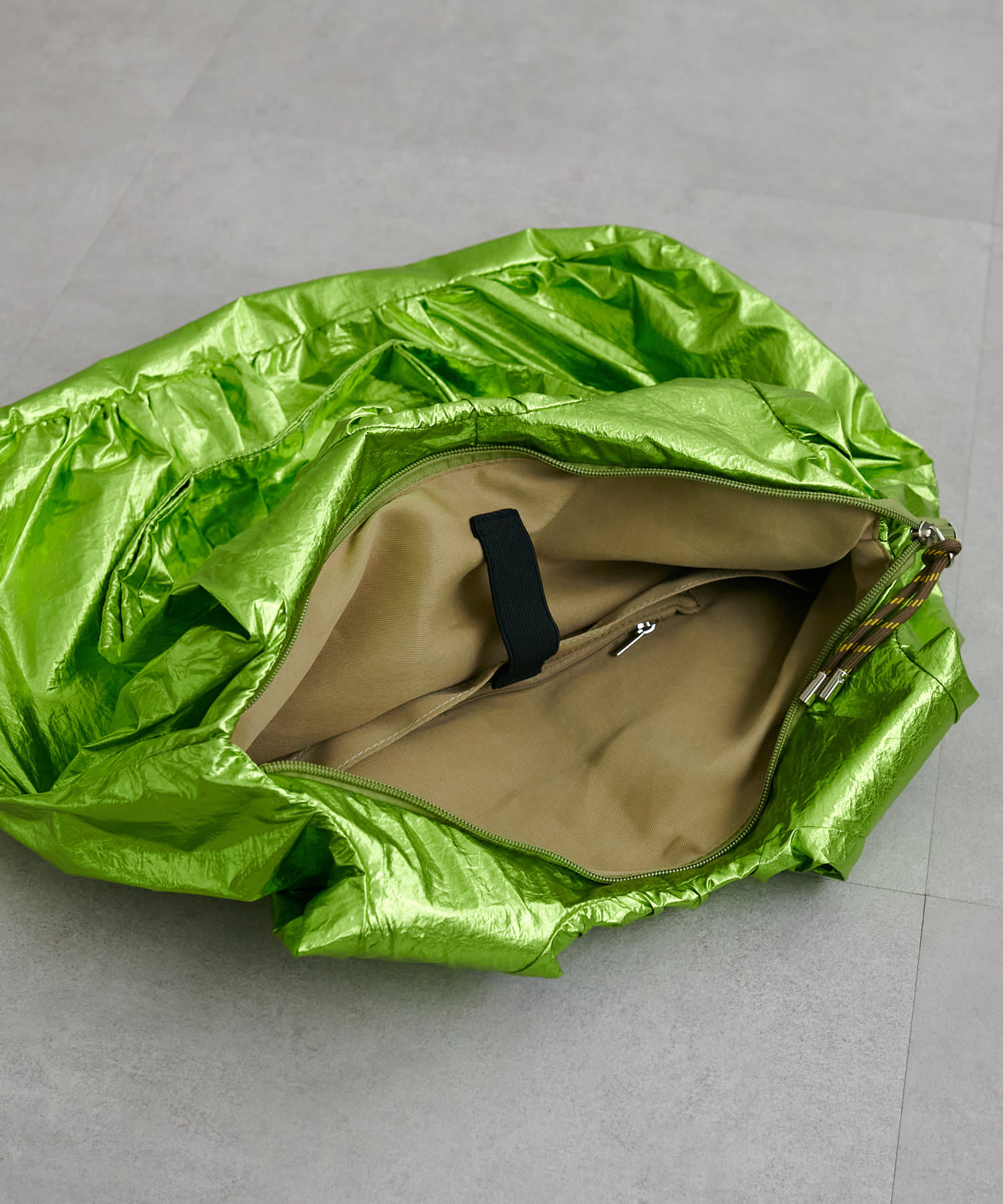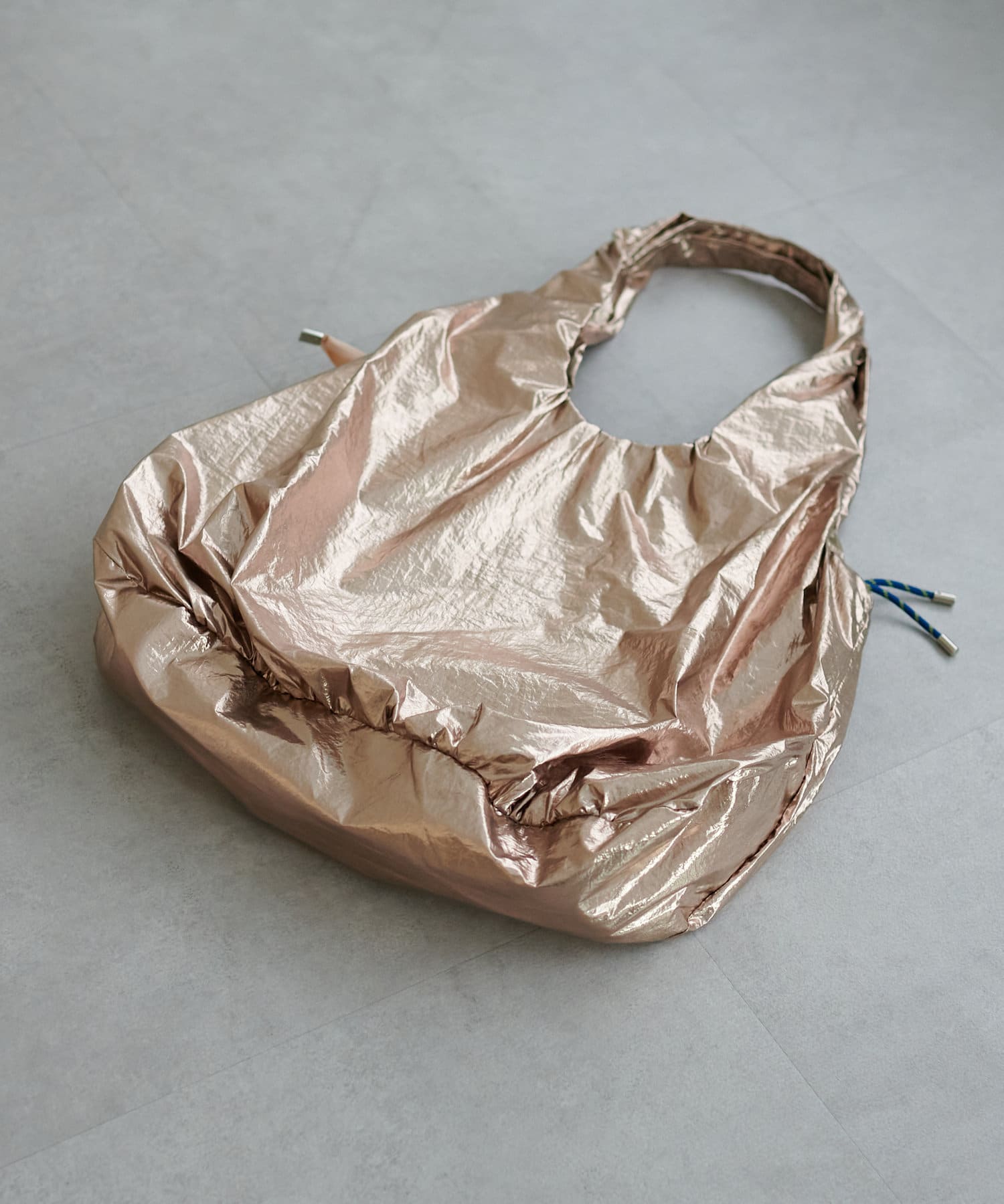 主役級の存在感のトートバッグ。キラキラとしたメタリック素材が特徴的で、目を引きます。サイズは高さ36㎝、幅57㎝と大きめで、大容量◎なのでちょっとした旅行の際にも大活躍間違いなしです。また、雑誌やiPadなども楽々入るので、通勤や通学にもオススメ◎持ち手が長めなので、腕回りにゆとりがあり、厚手のスウェットやアウターの上からでも問題なくスムーズに肩掛けできます◎季節問わずシーズンレスでお使いいただけるアイテムです。素材自体は柔らかく、軽いので、畳んでサブバッグとして持ち歩くのもオススメです。ファスナーにはそれぞれのカラーに合わせたストラップ紐が付いているなど、拘りのつまったアイテムです♪