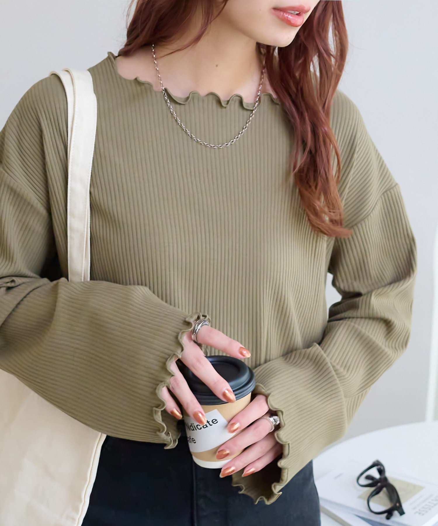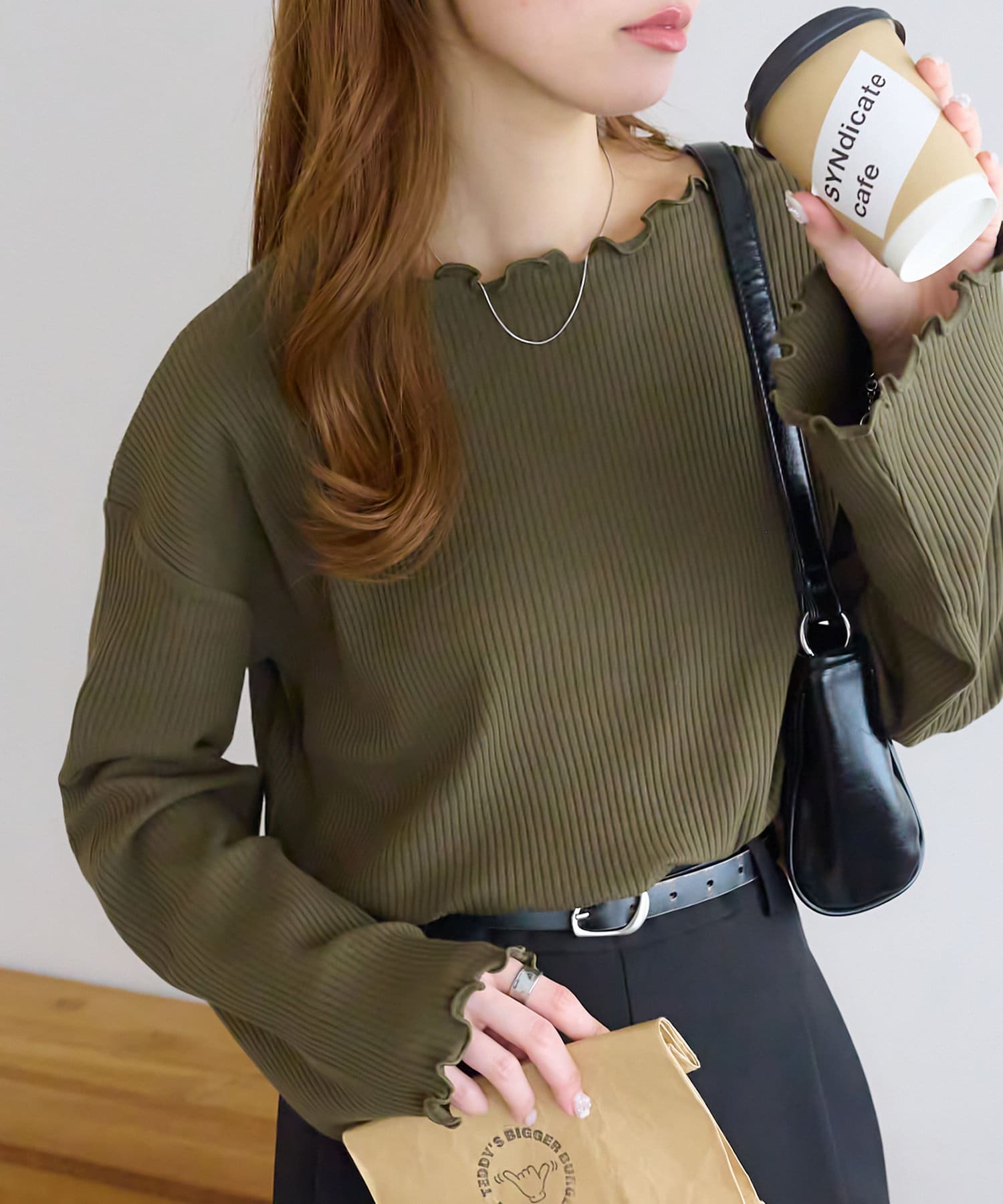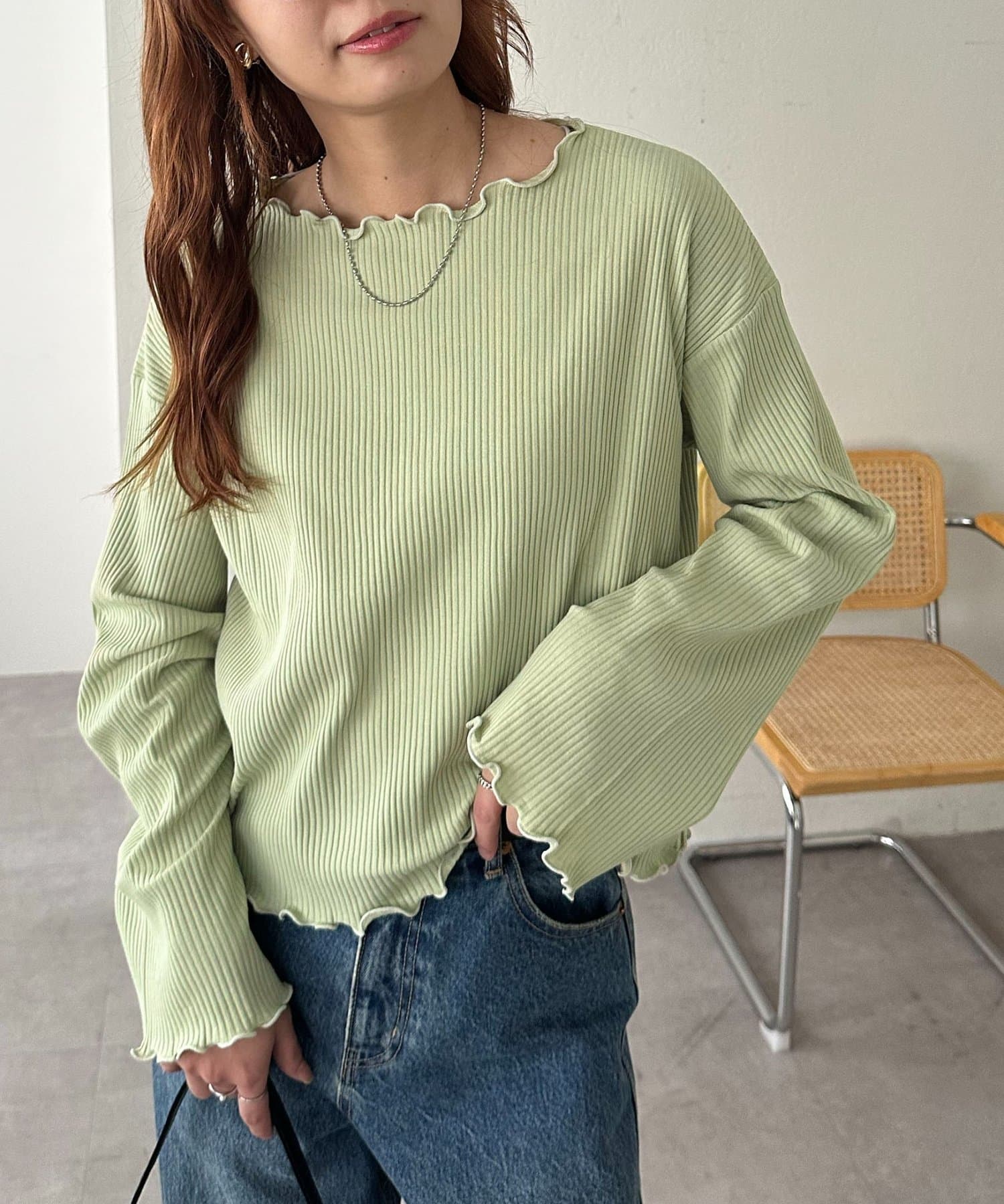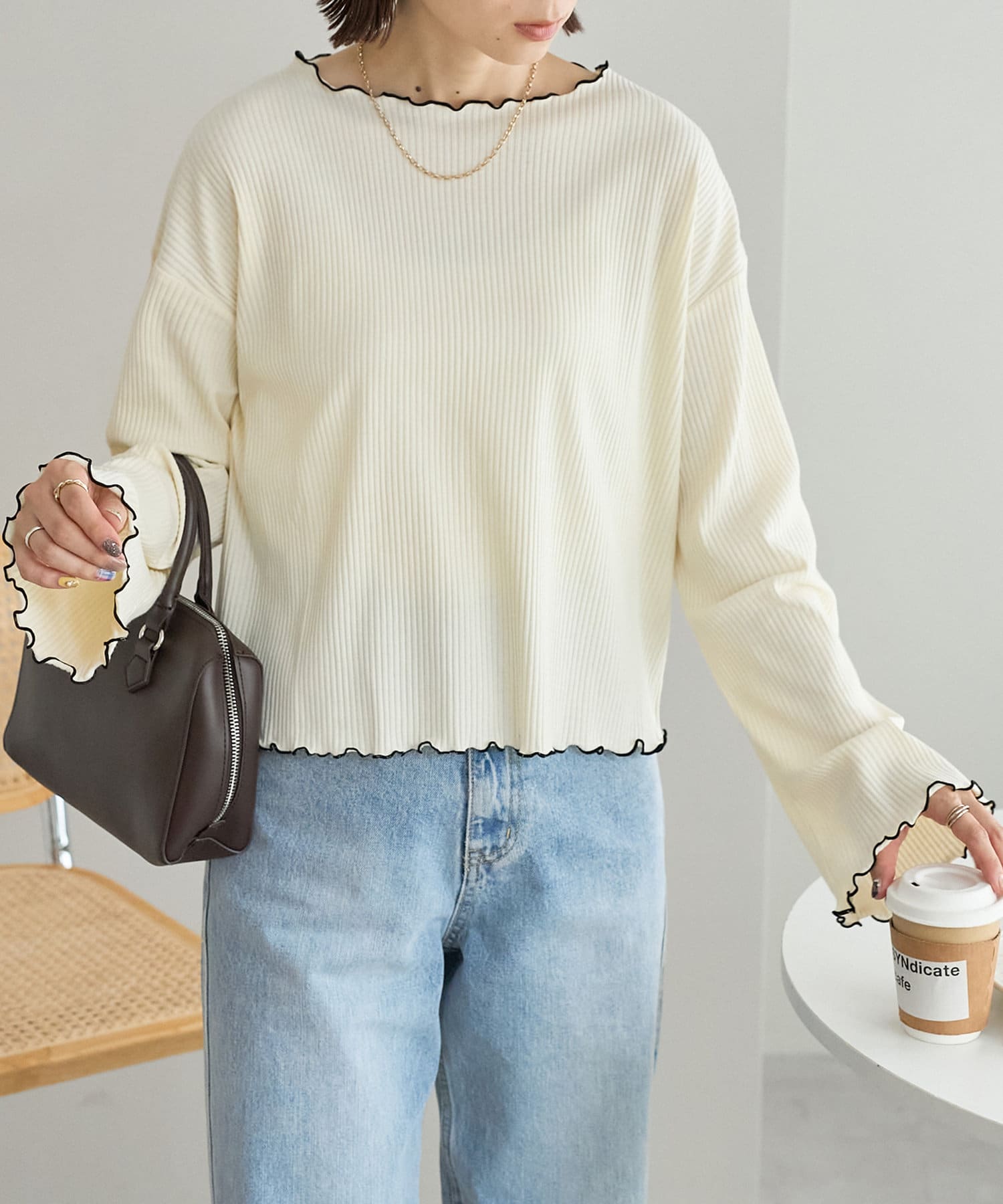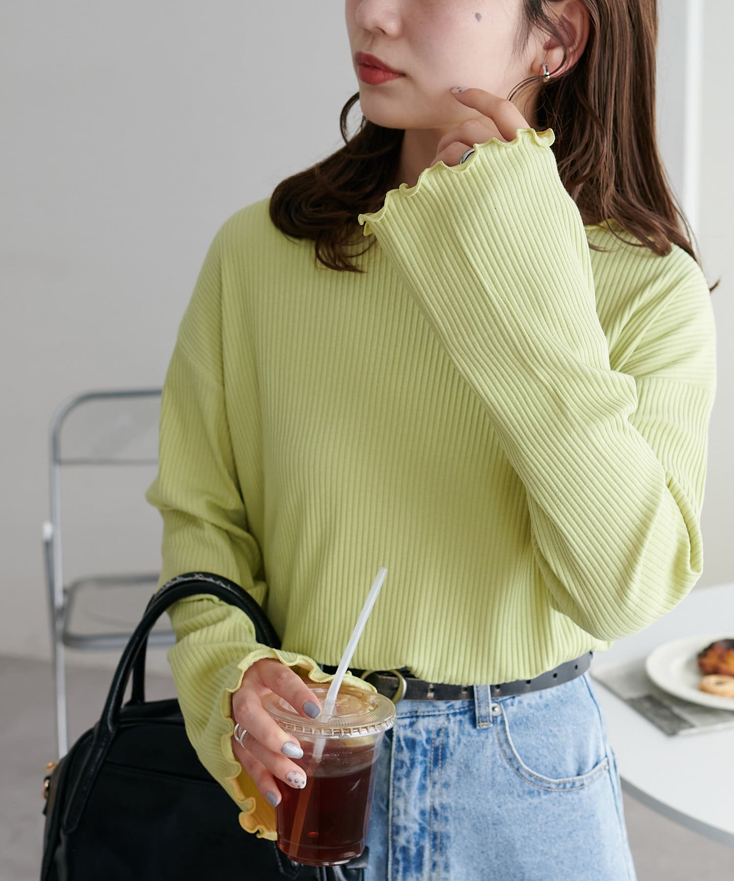 袖口、裾口、首元のメローデザインがポイントのリブトップス。