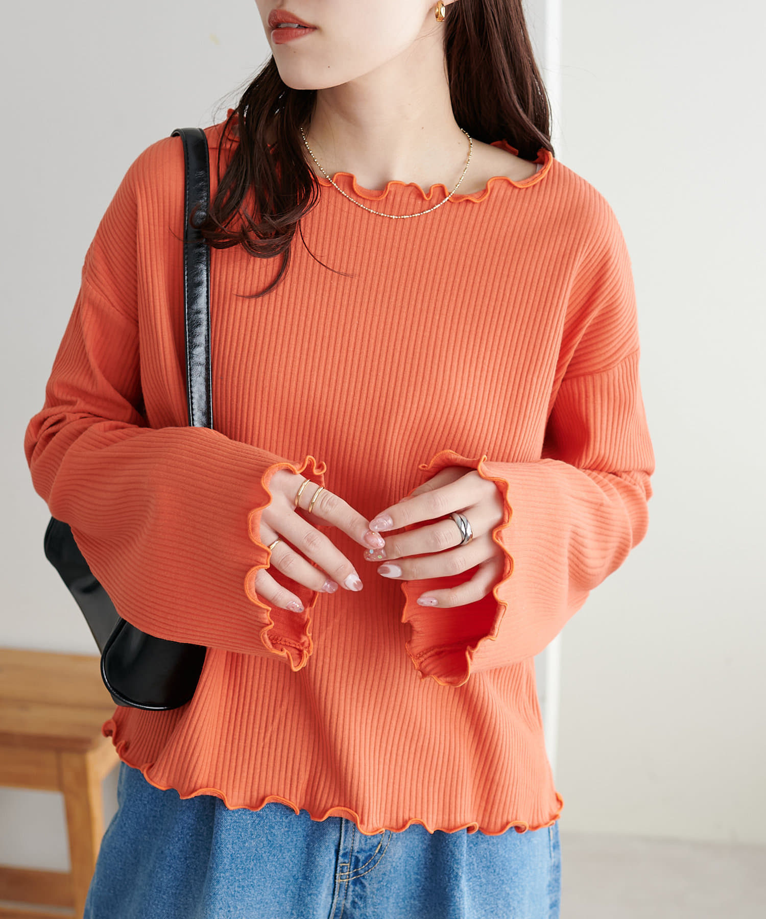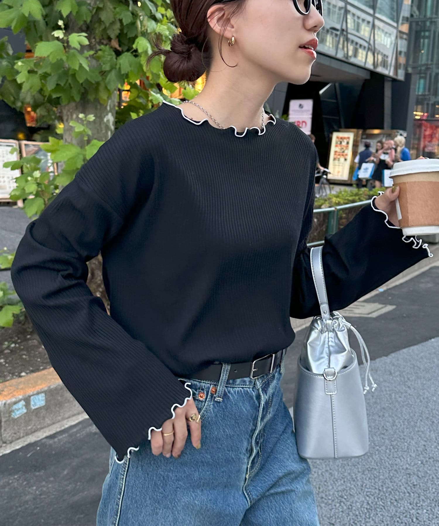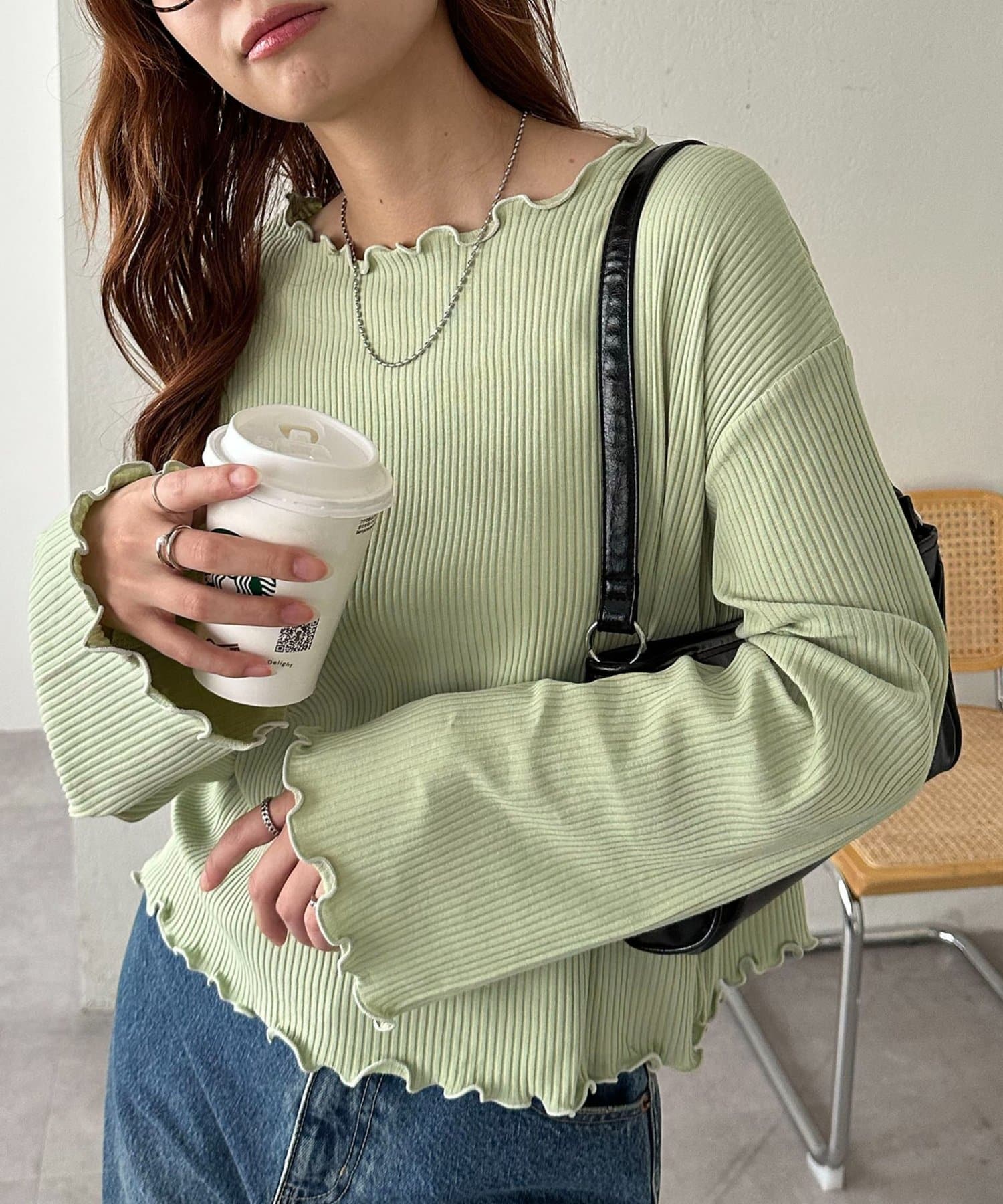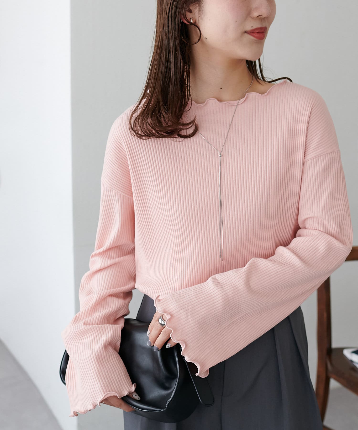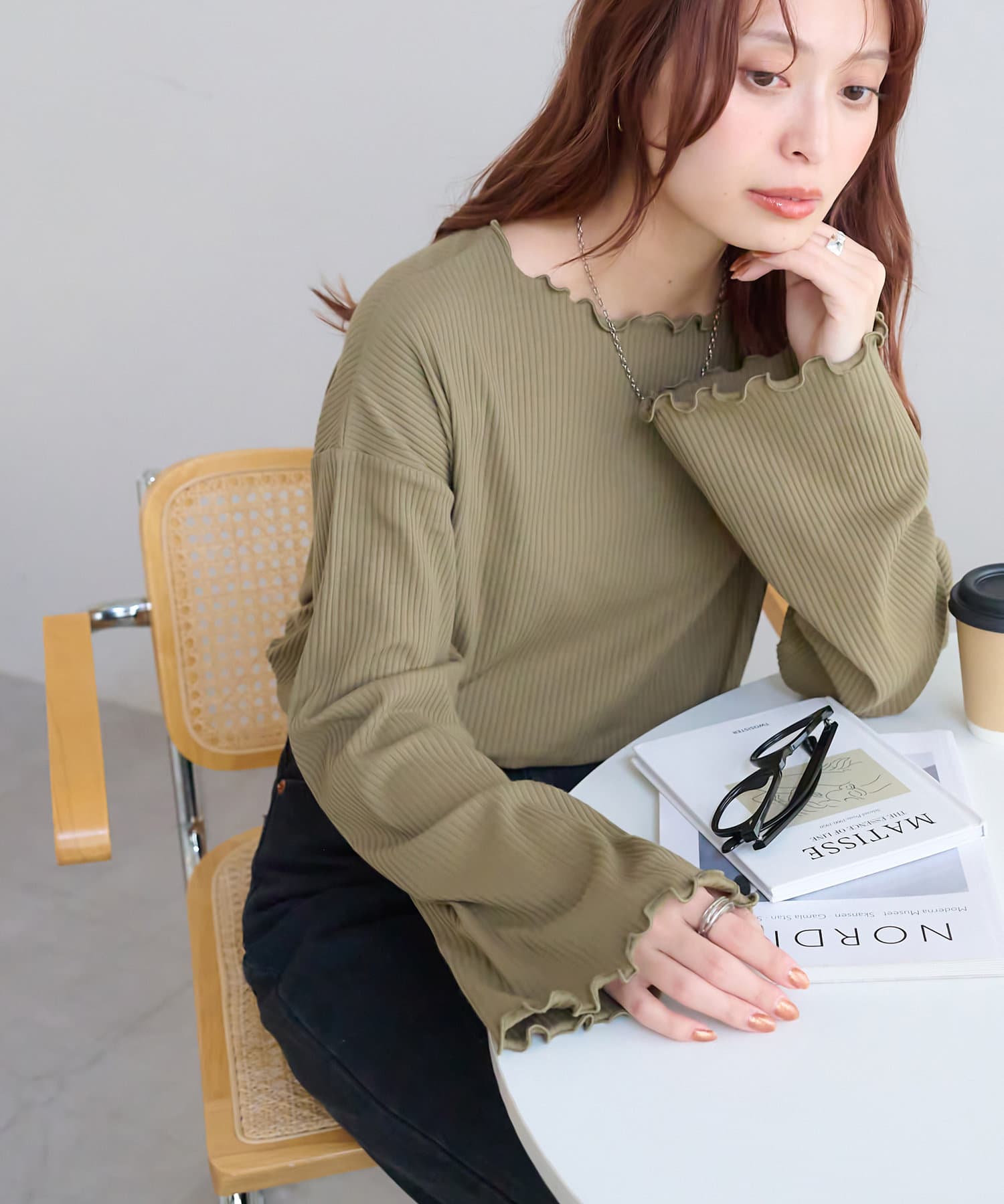 袖口、裾口、首元のメローデザインがポイントのリブトップス。