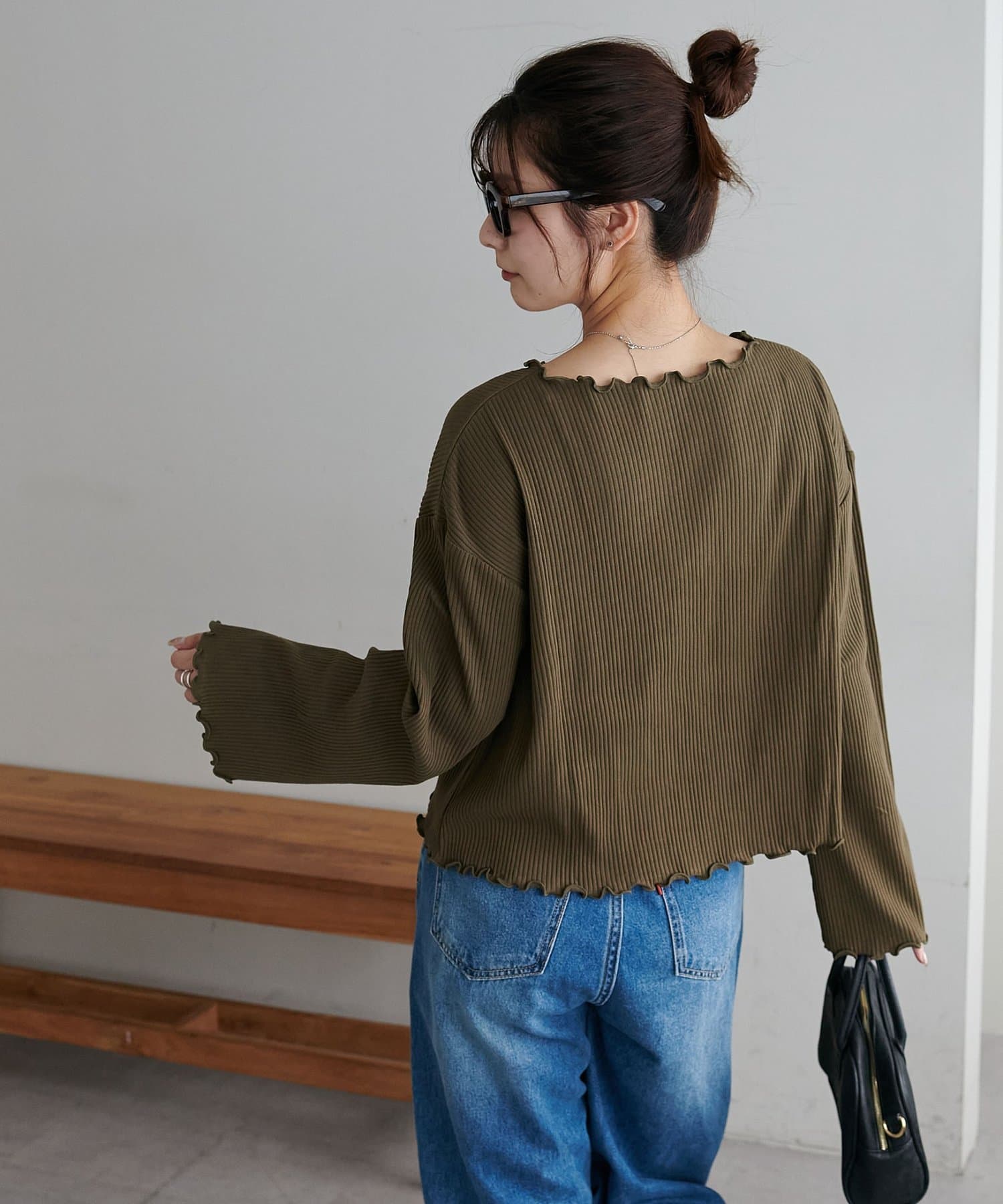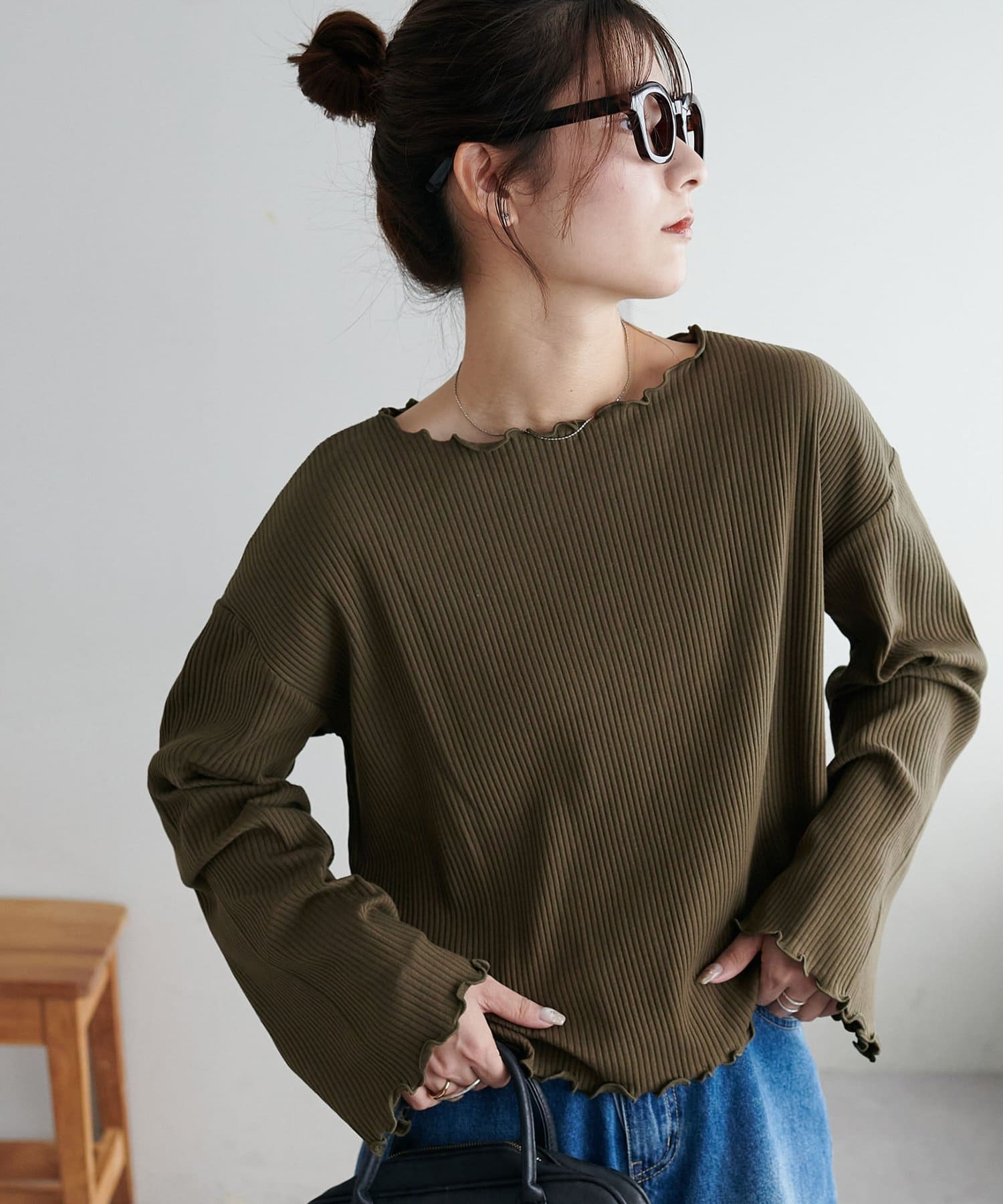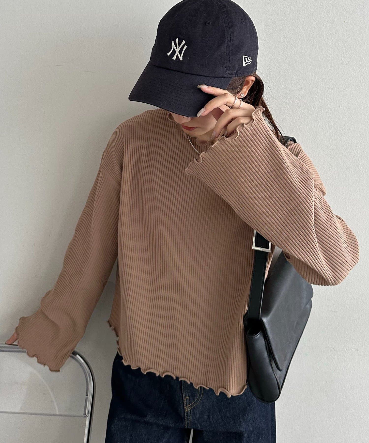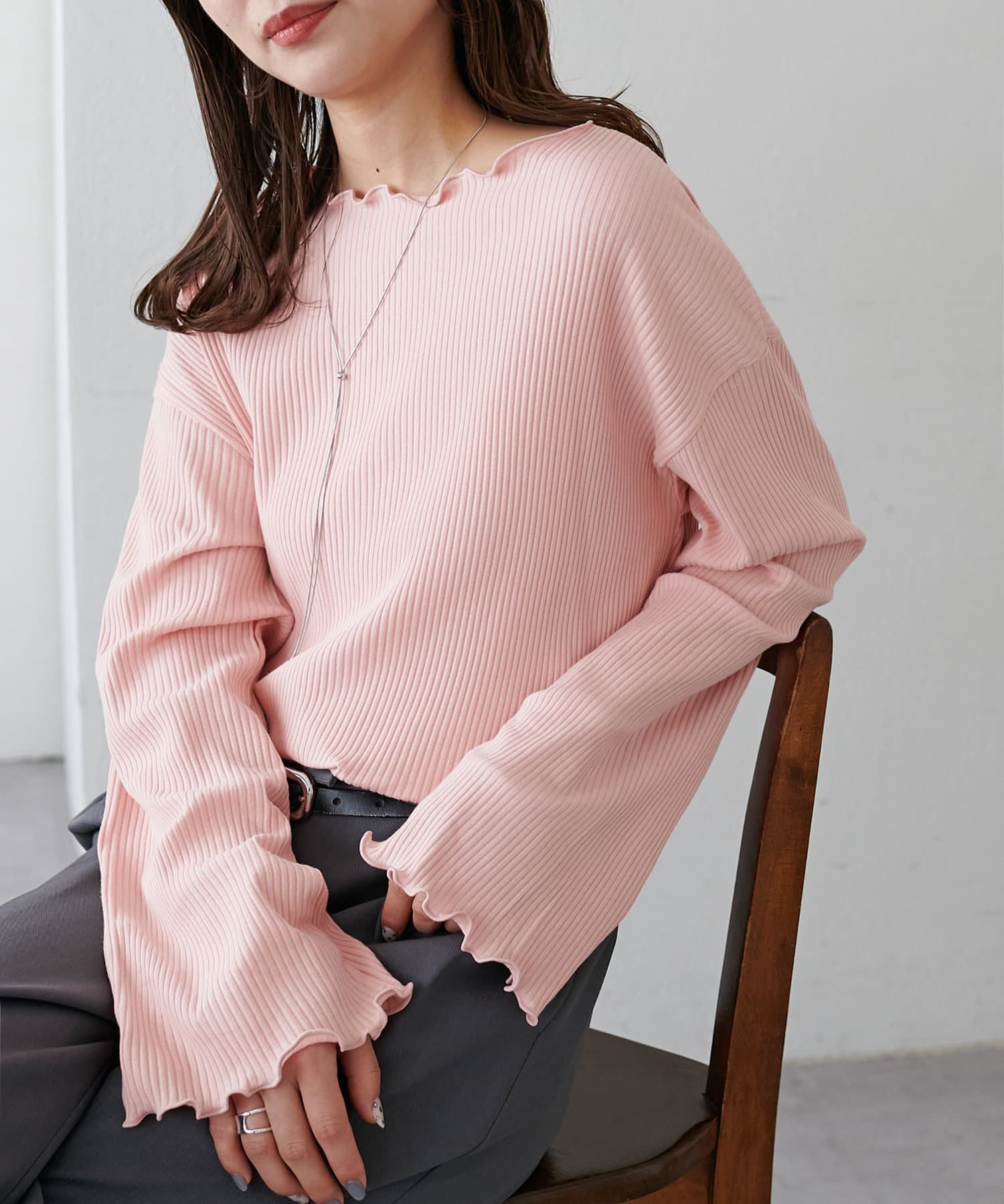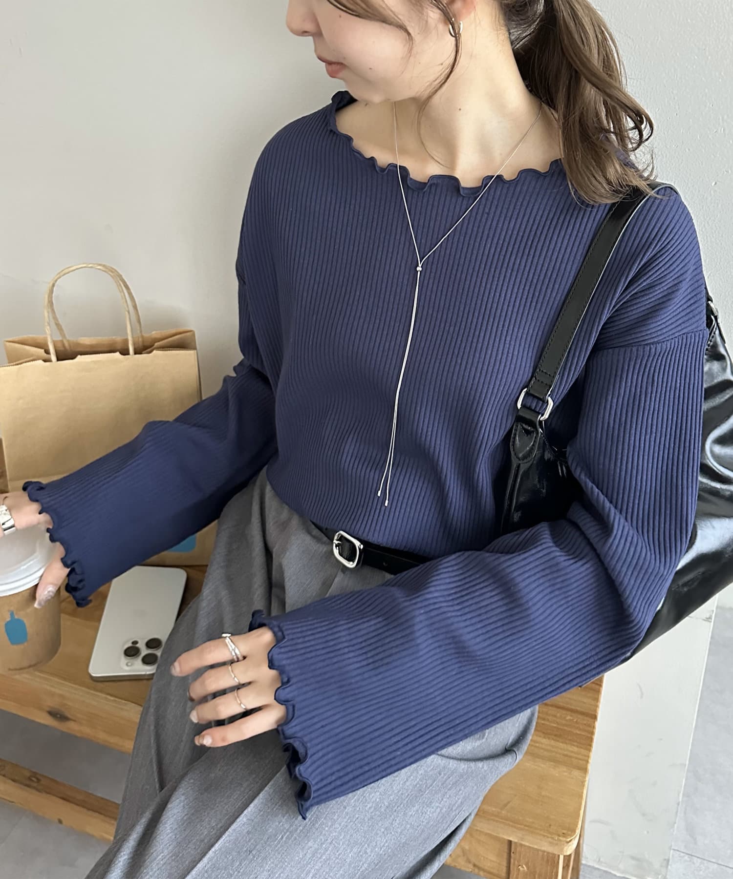 袖口、裾口、首元のメローデザインがポイントのリブトップス。