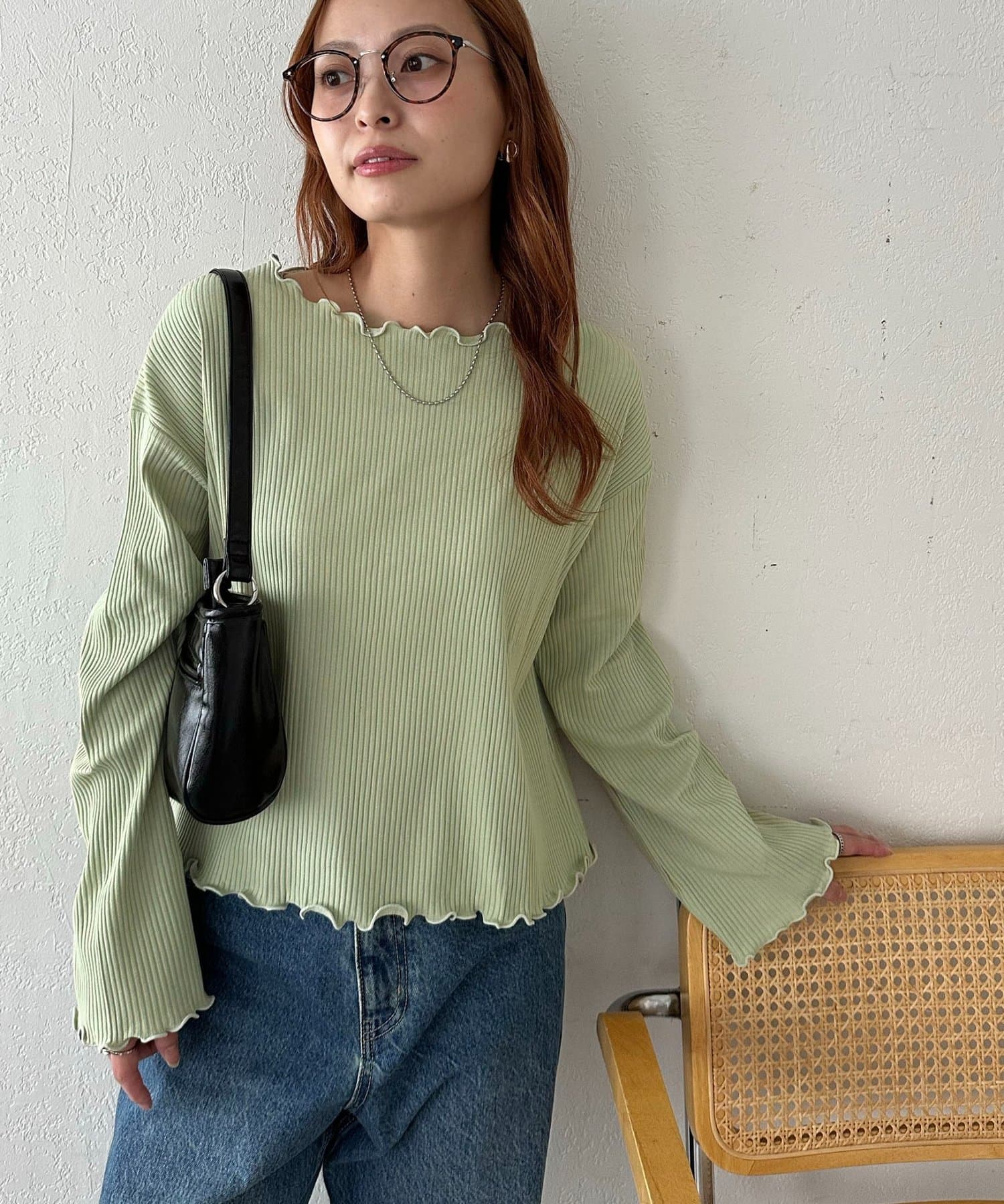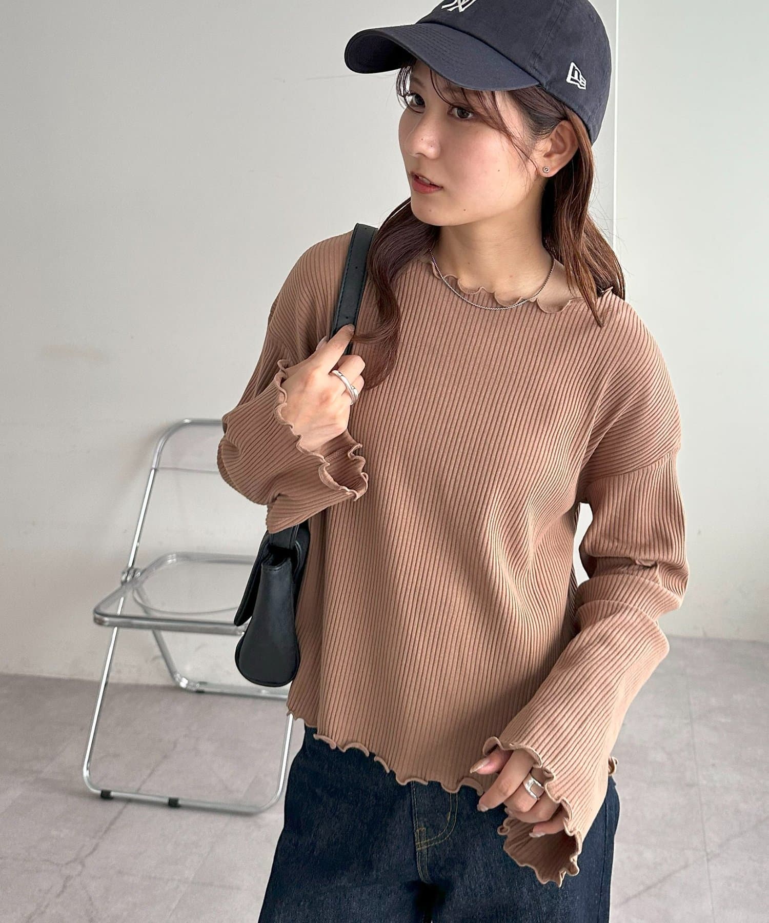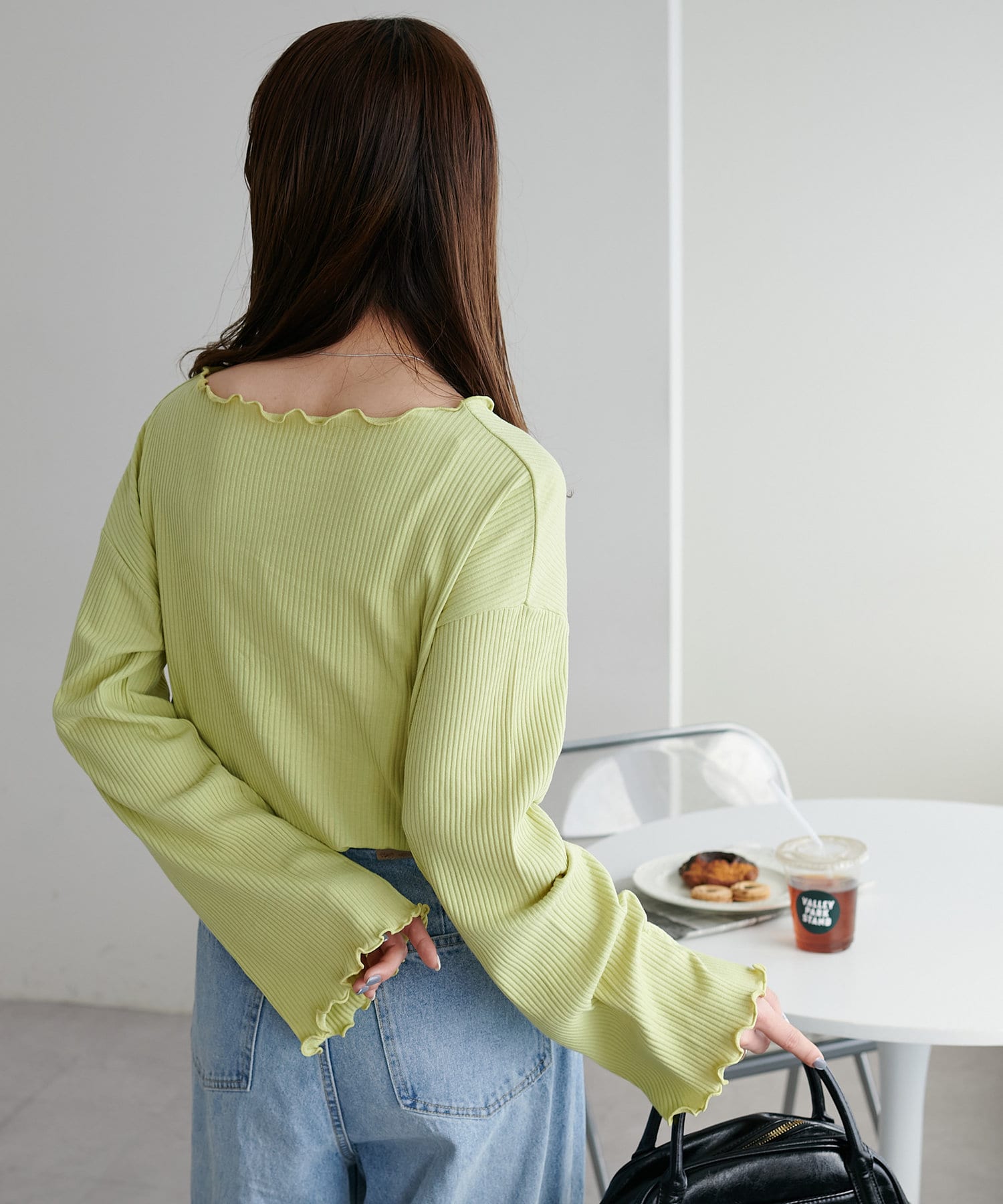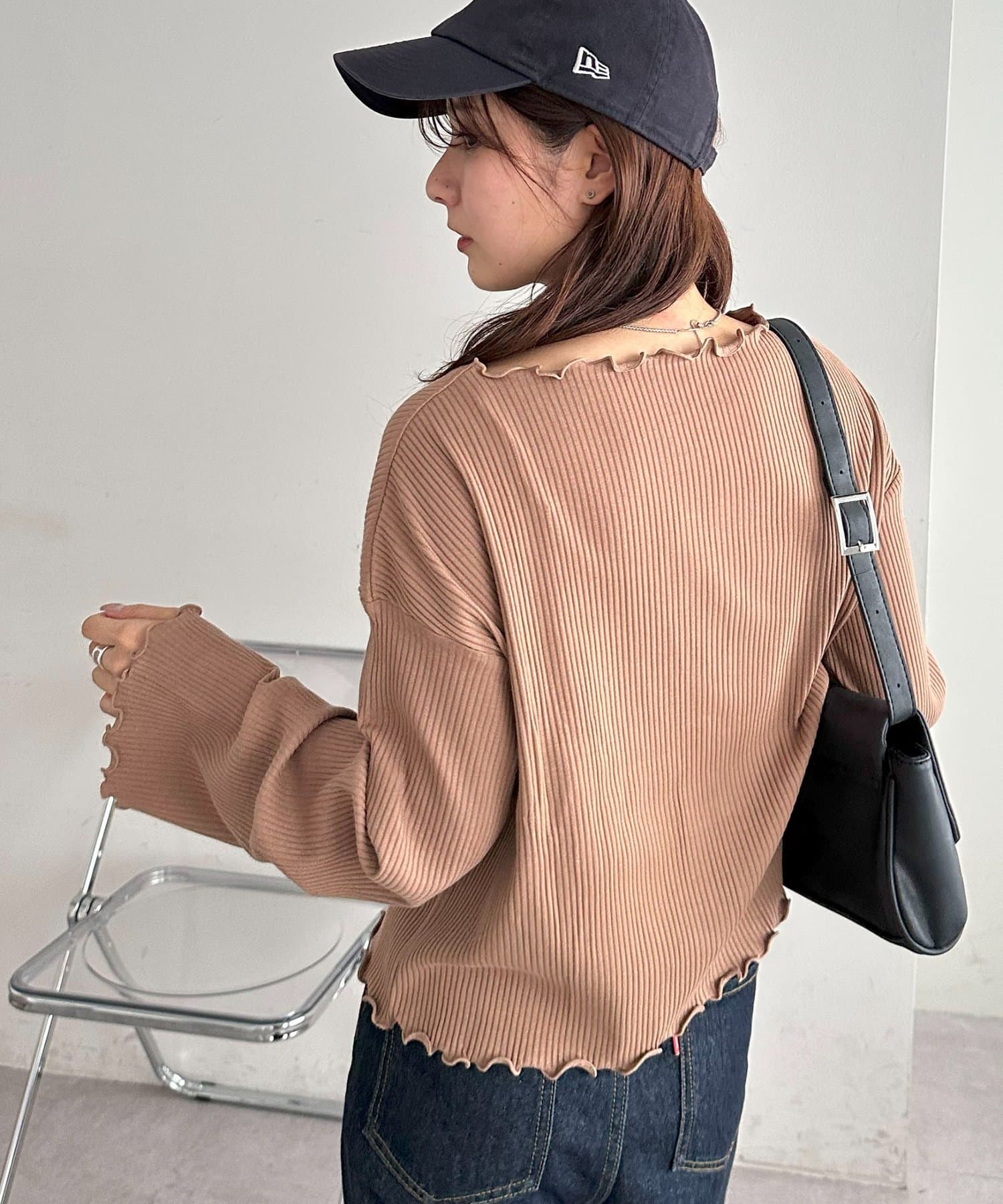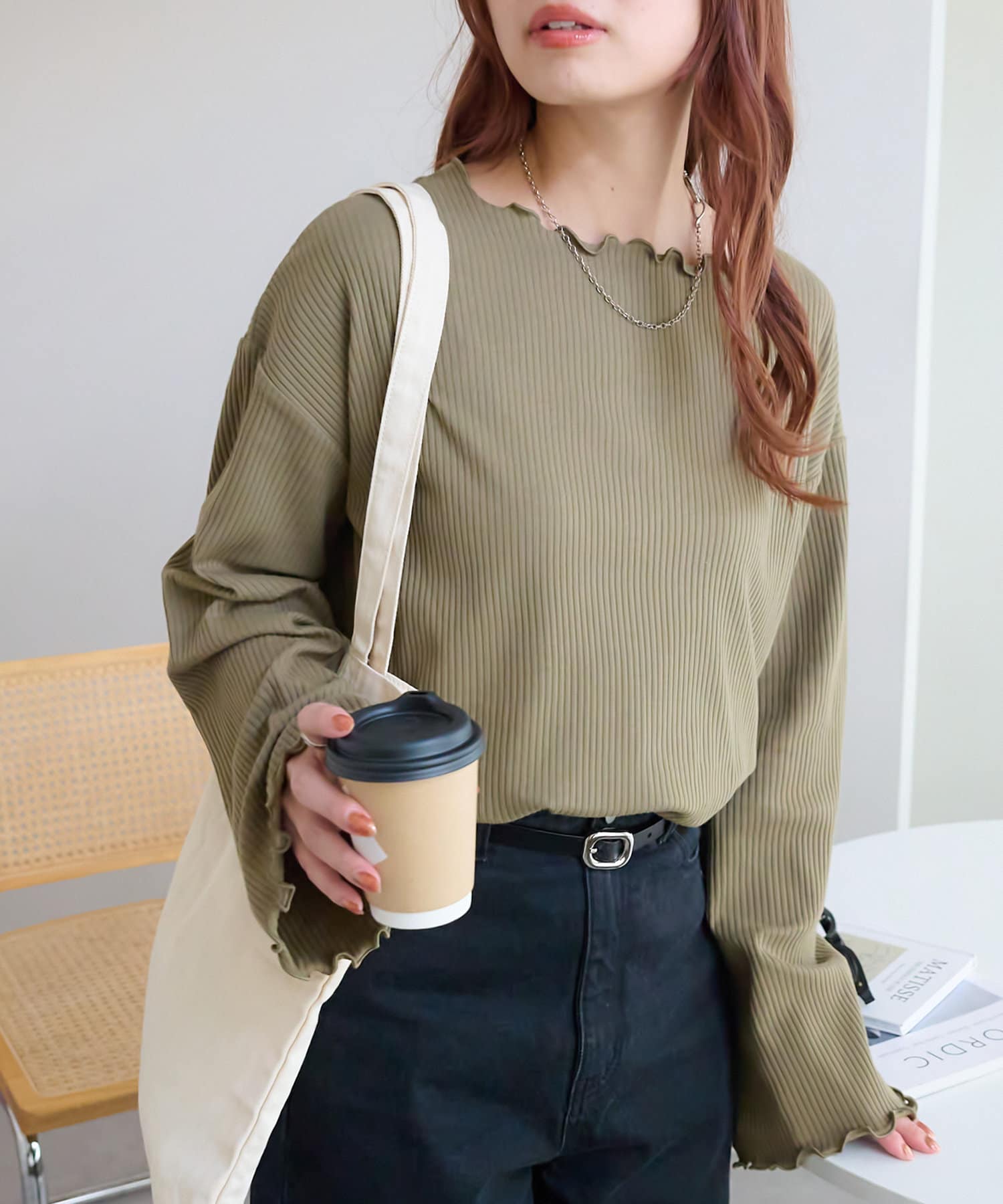 袖口、裾口、首元のメローデザインがポイントのリブトップス。