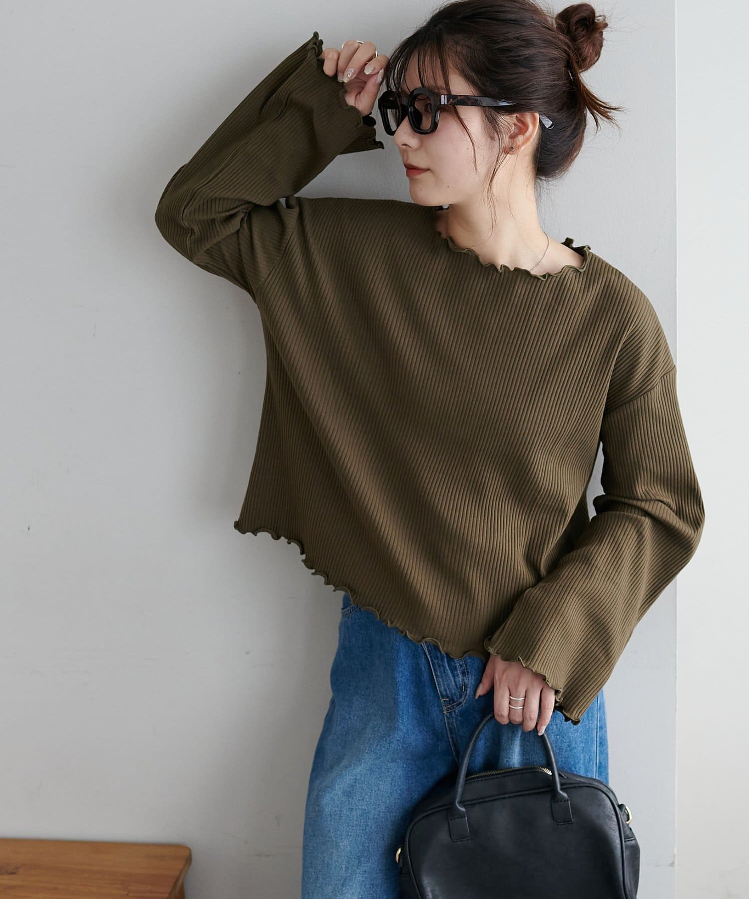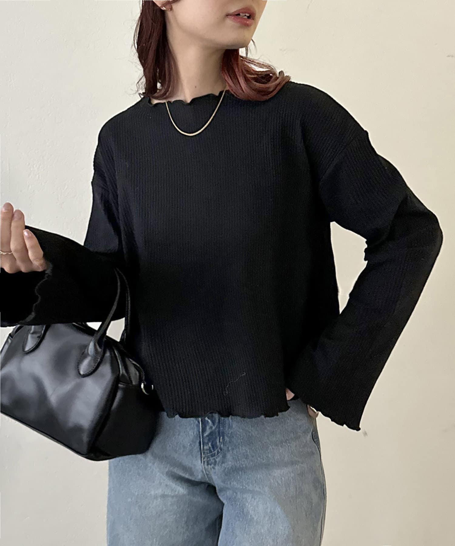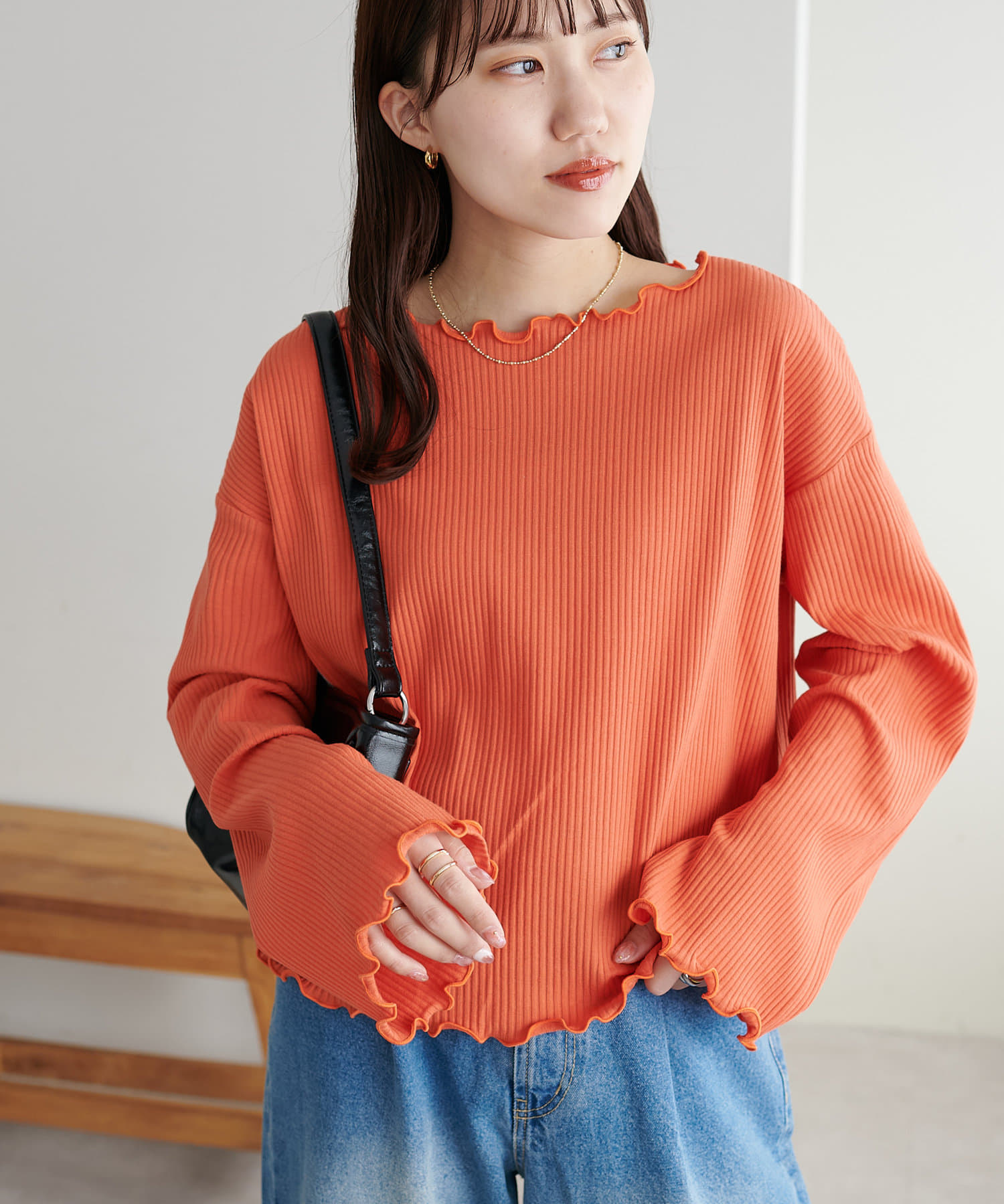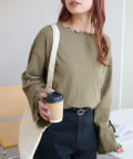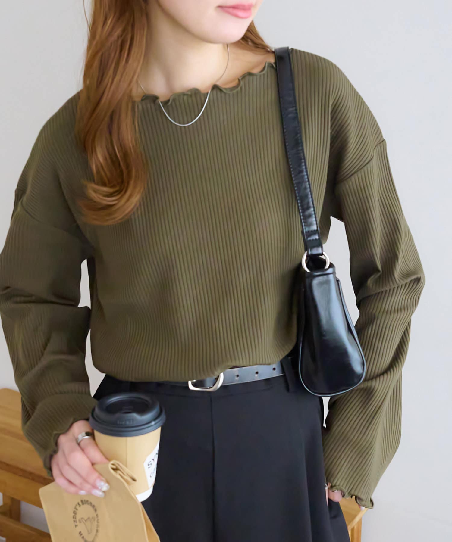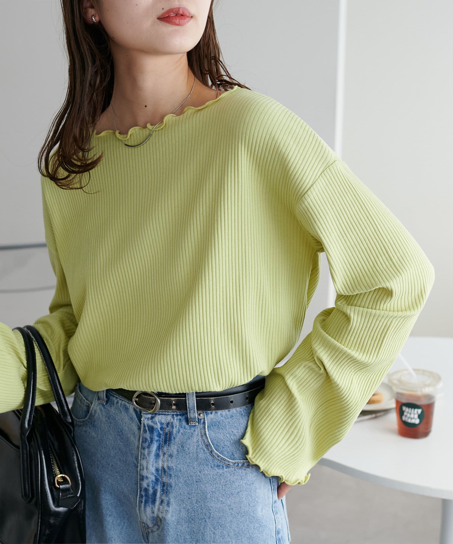 袖口、裾口、首元のメローデザインがポイントのリブトップス。