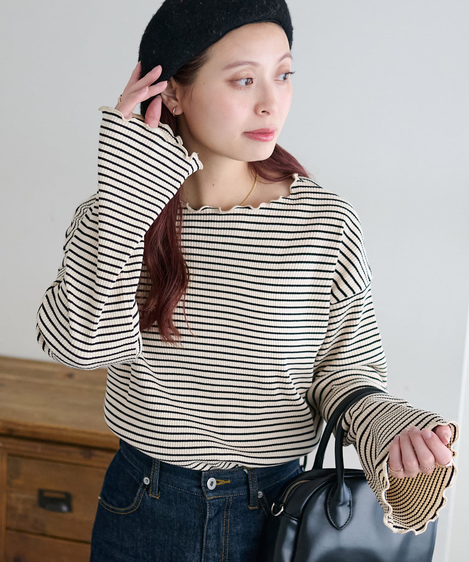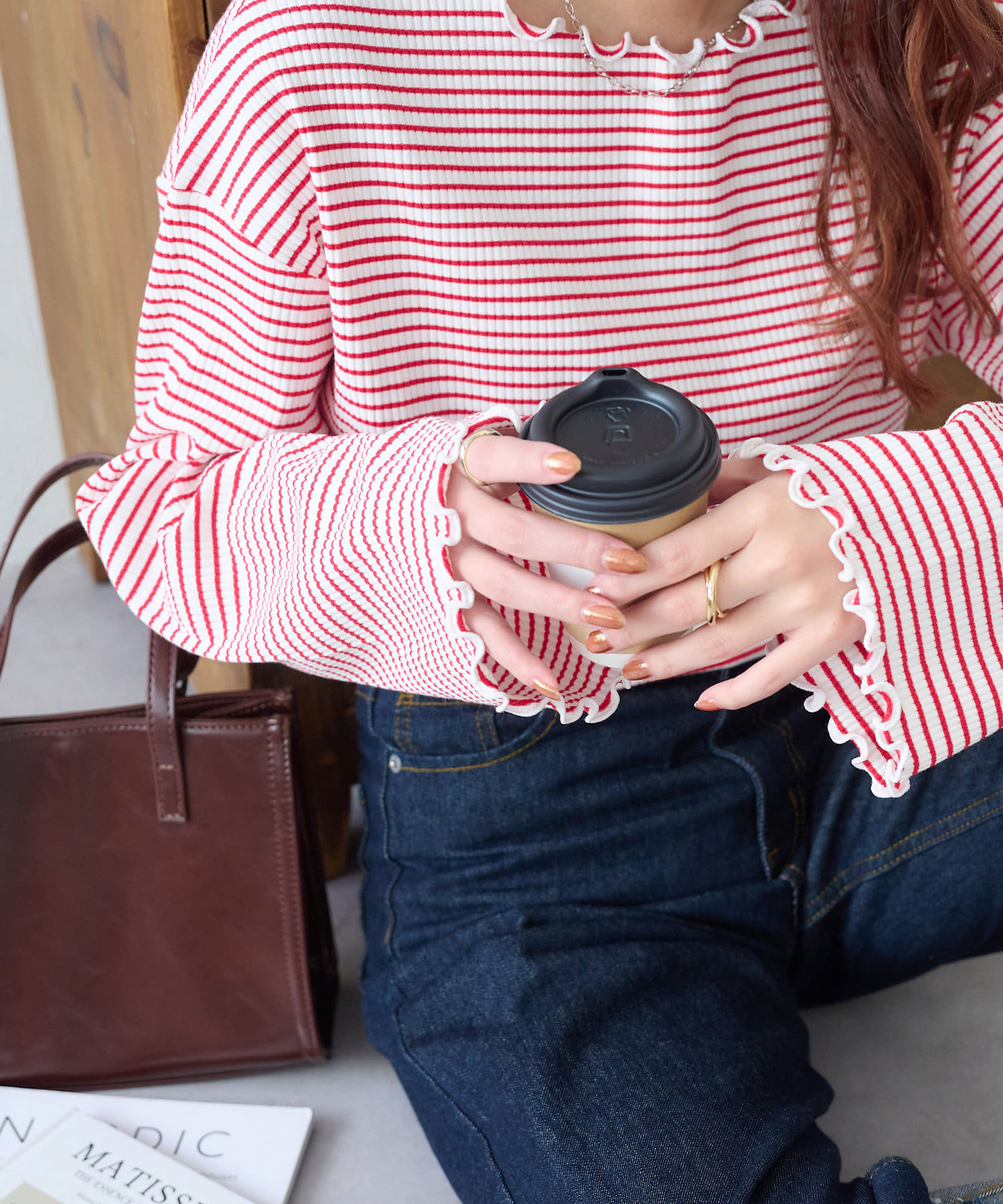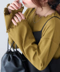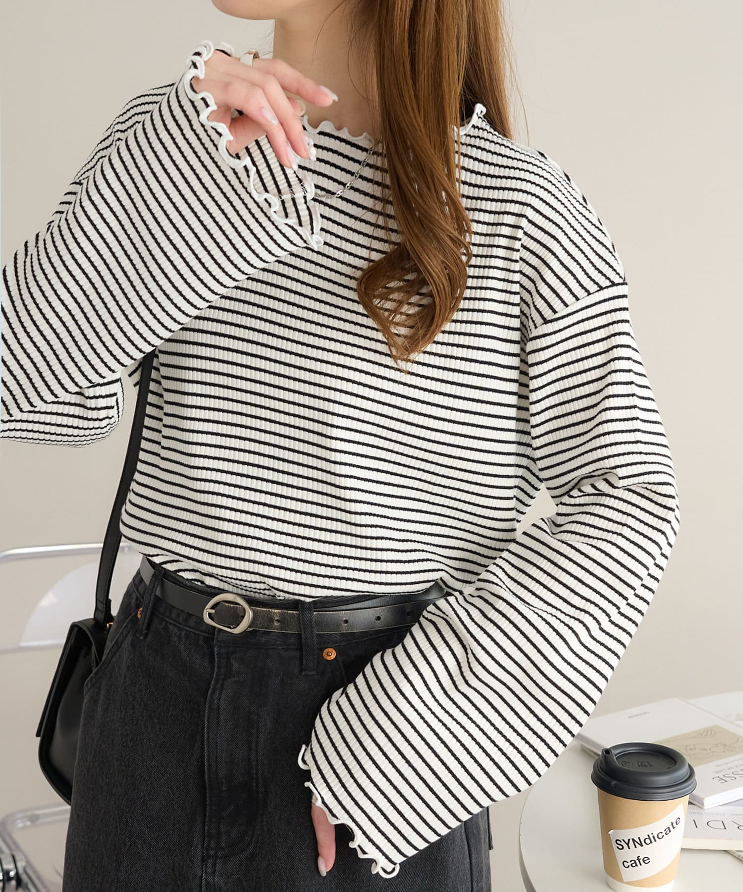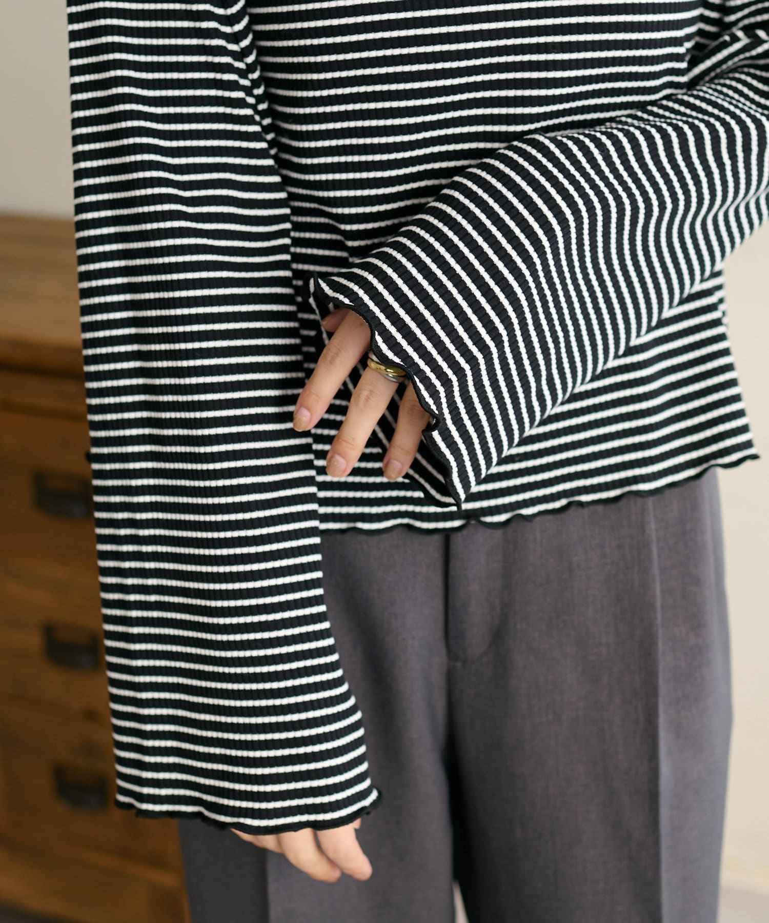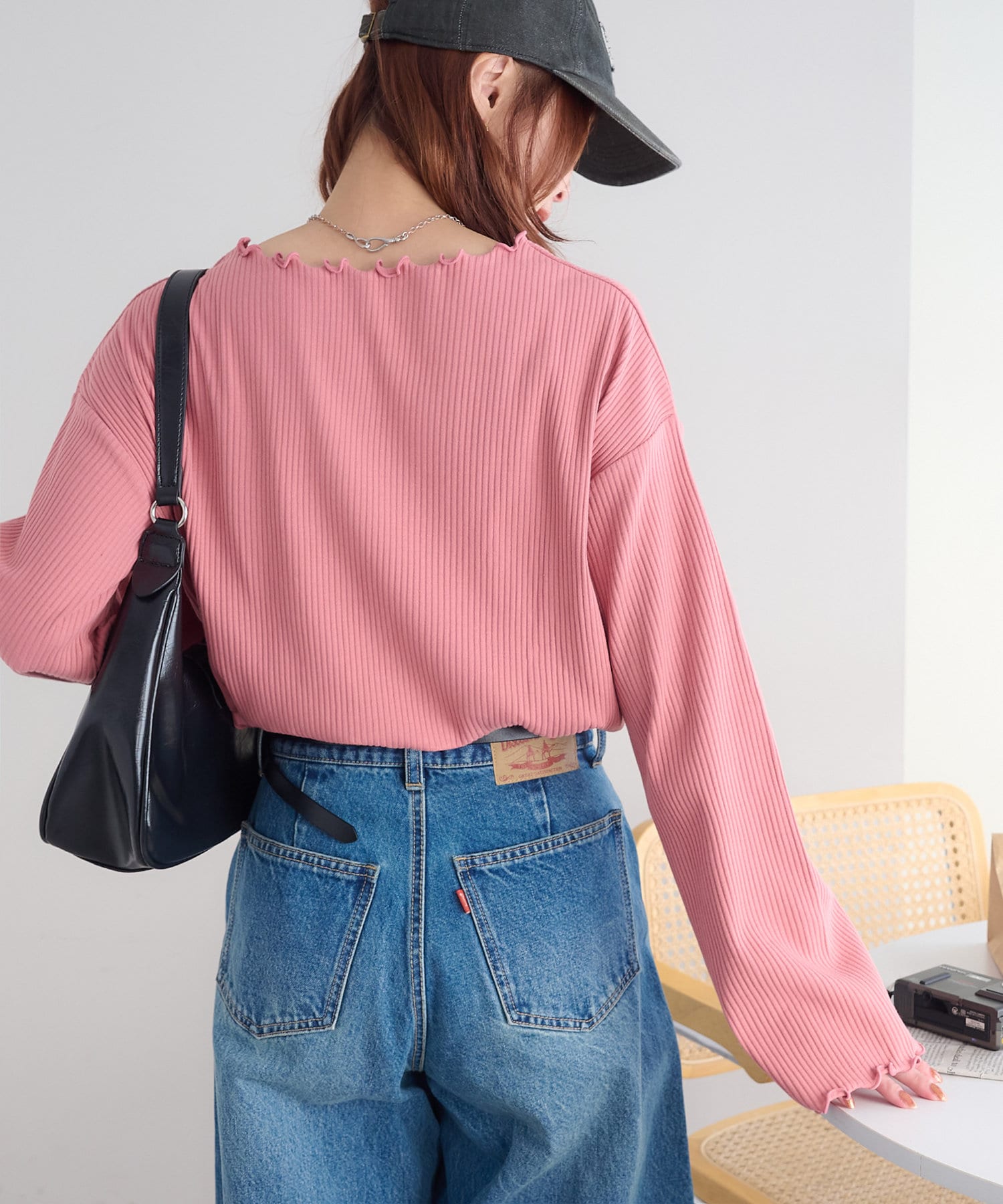 袖口、裾口、首元のメローデザインがポイントのリブトップス。
