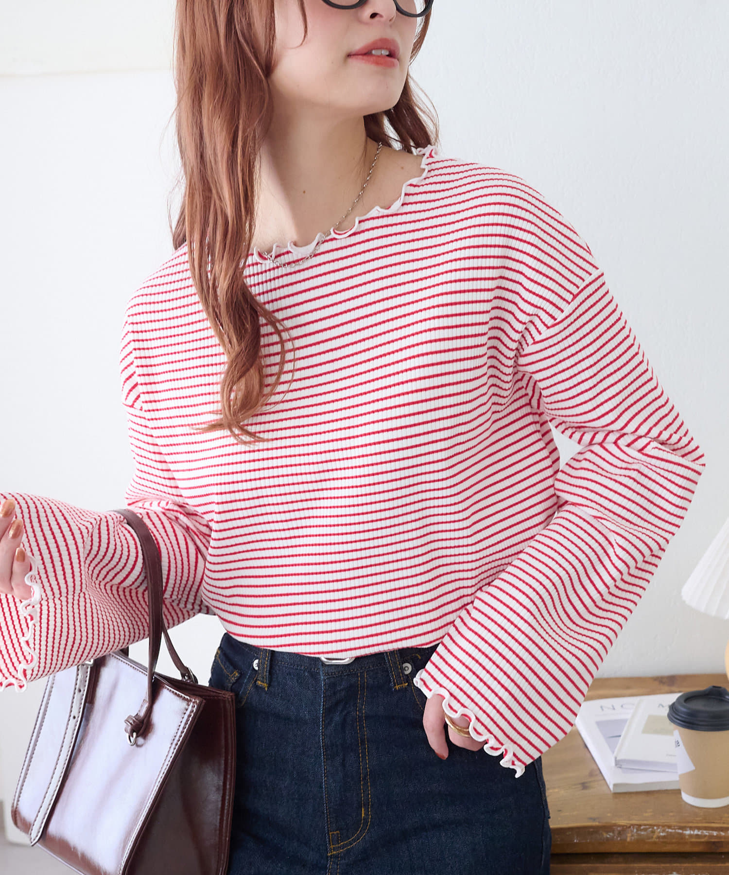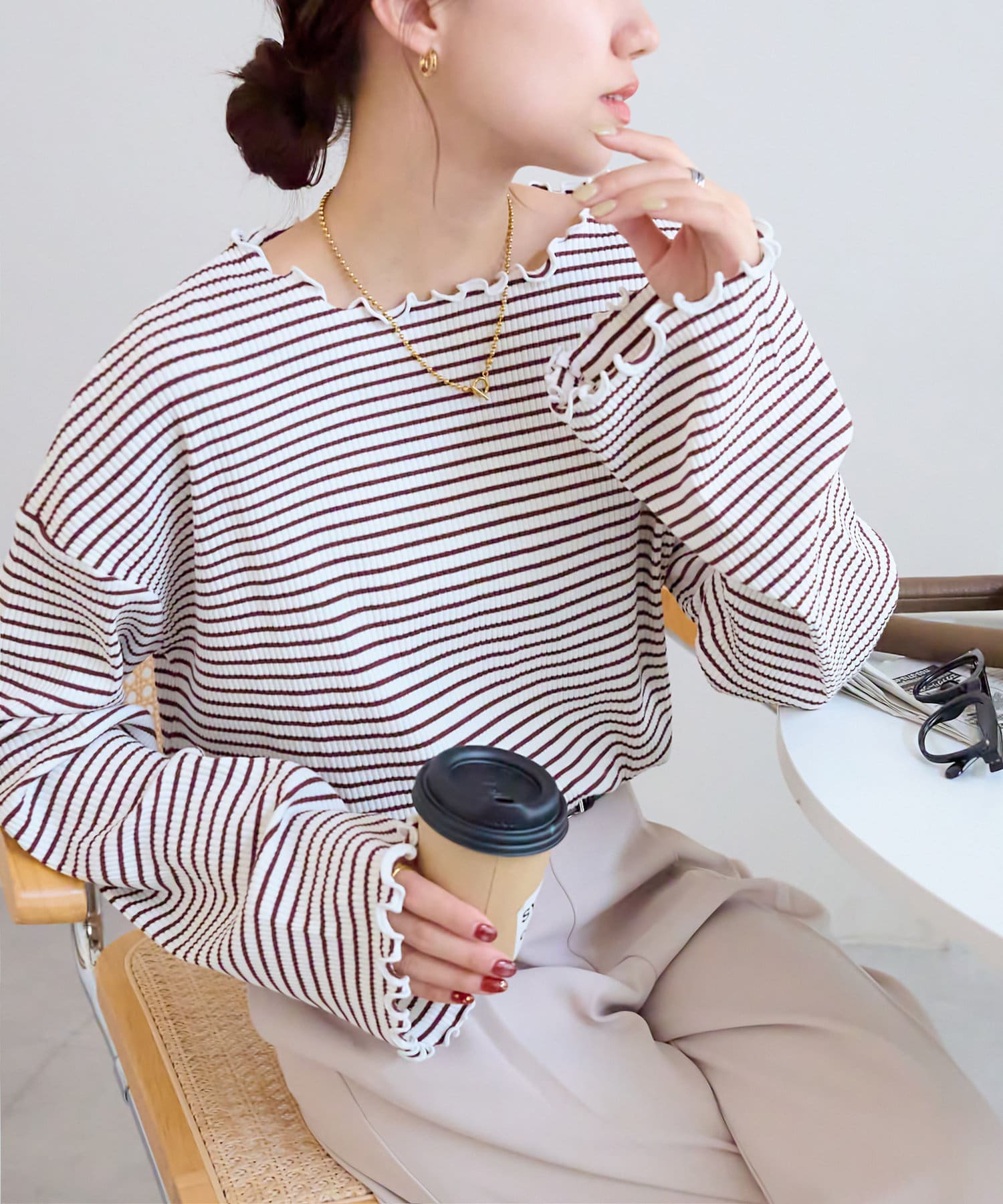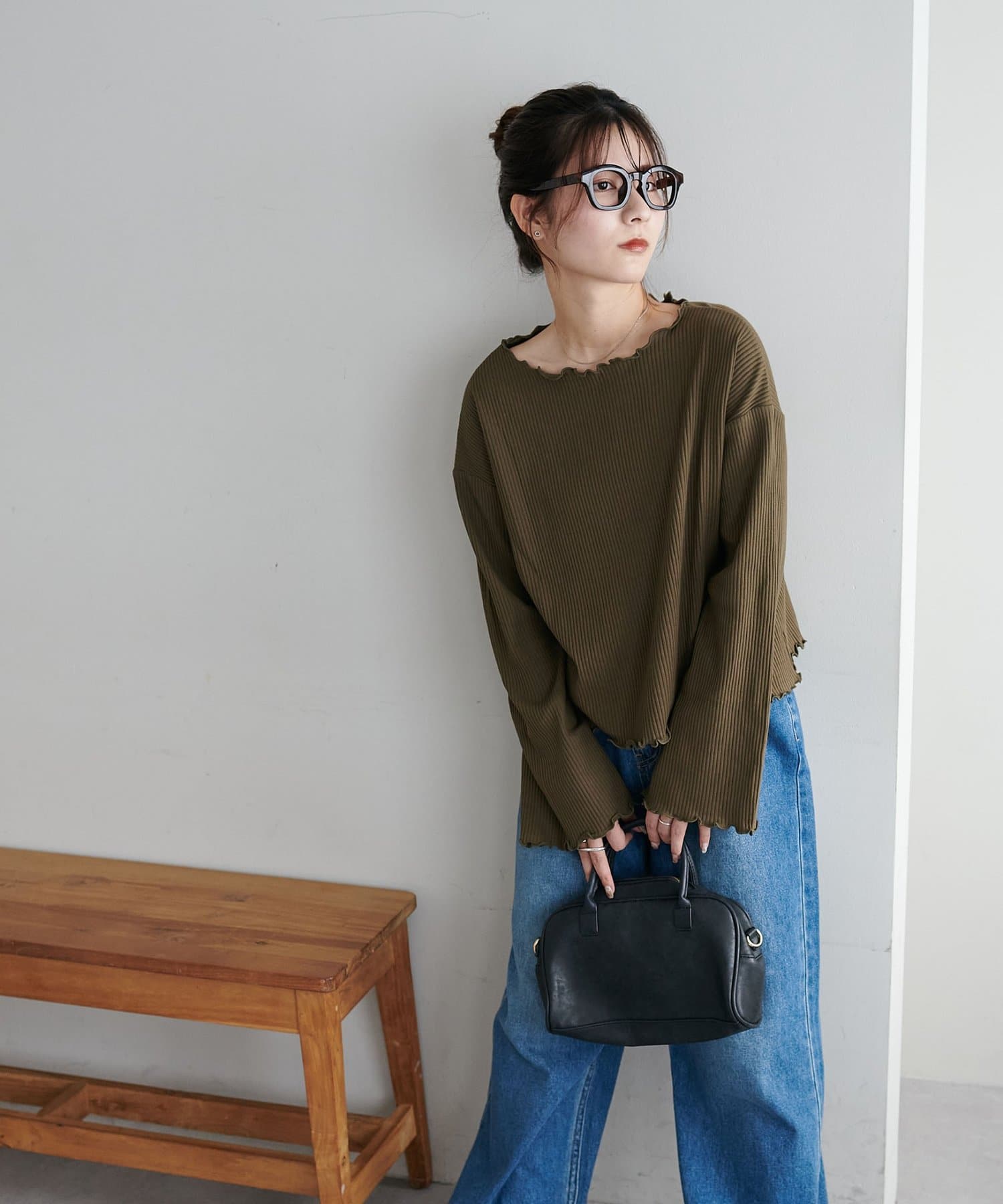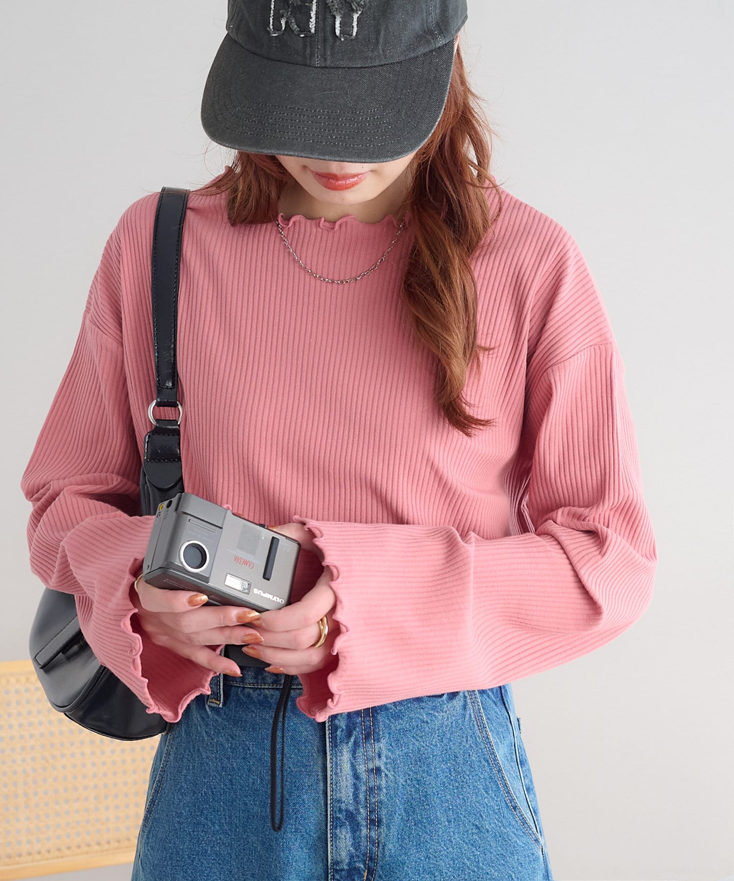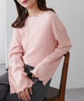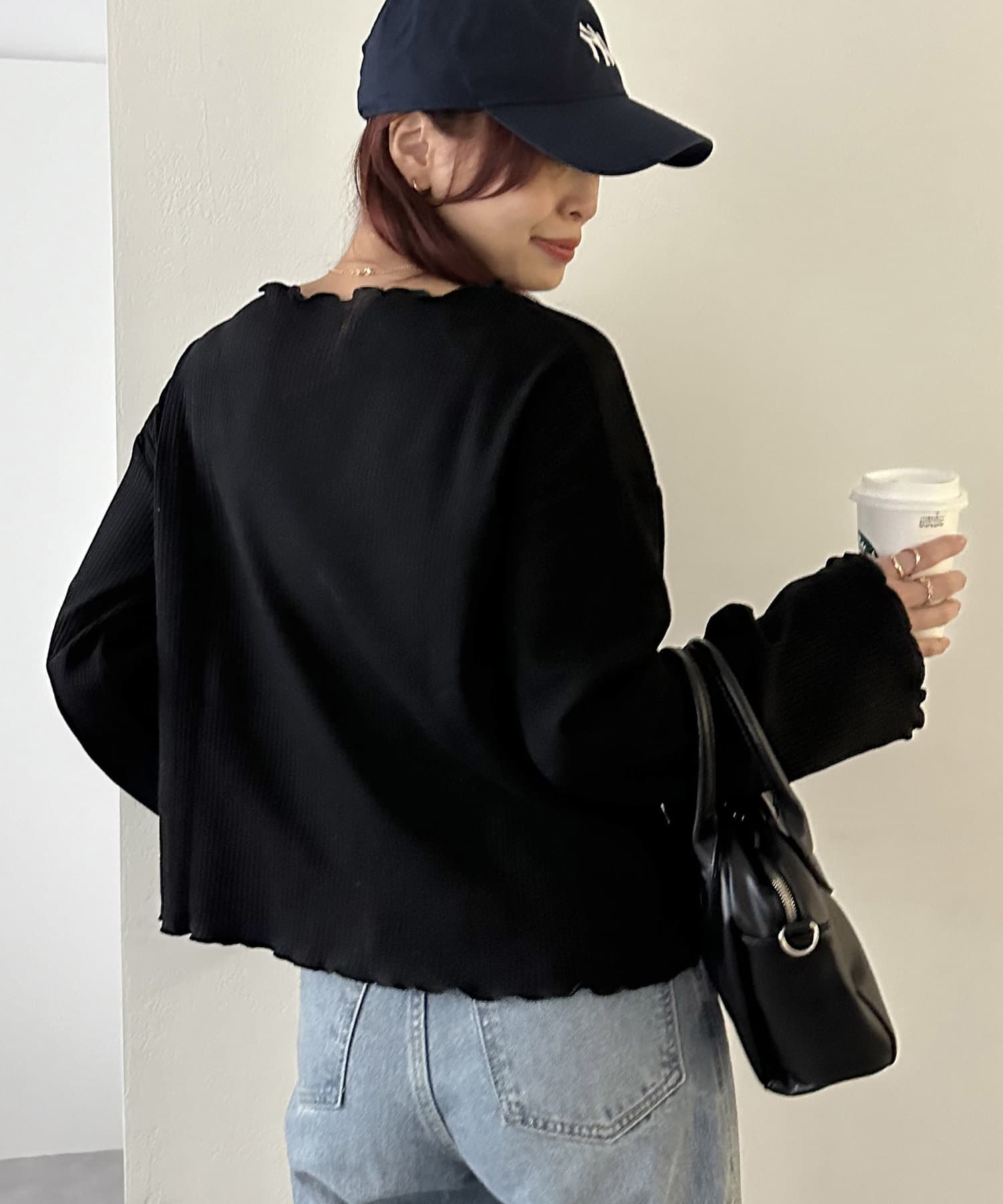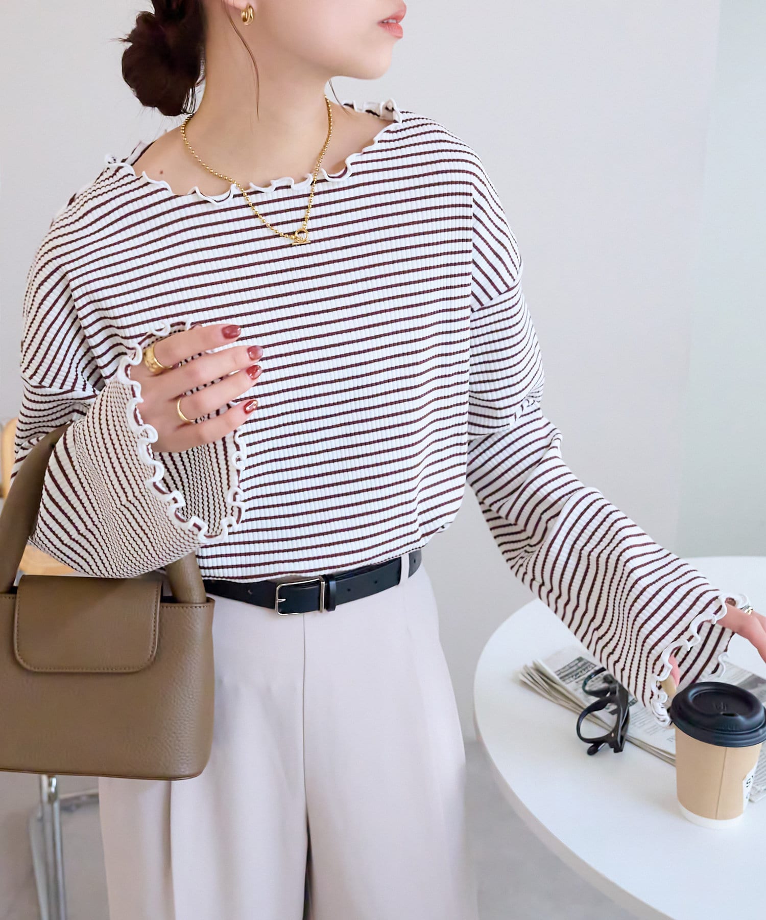 袖口、裾口、首元のメローデザインがポイントのリブトップス。