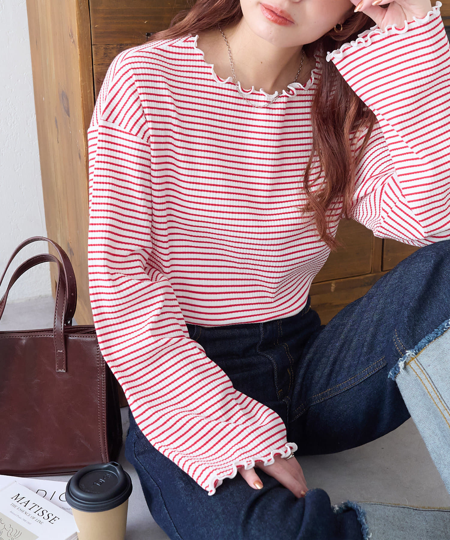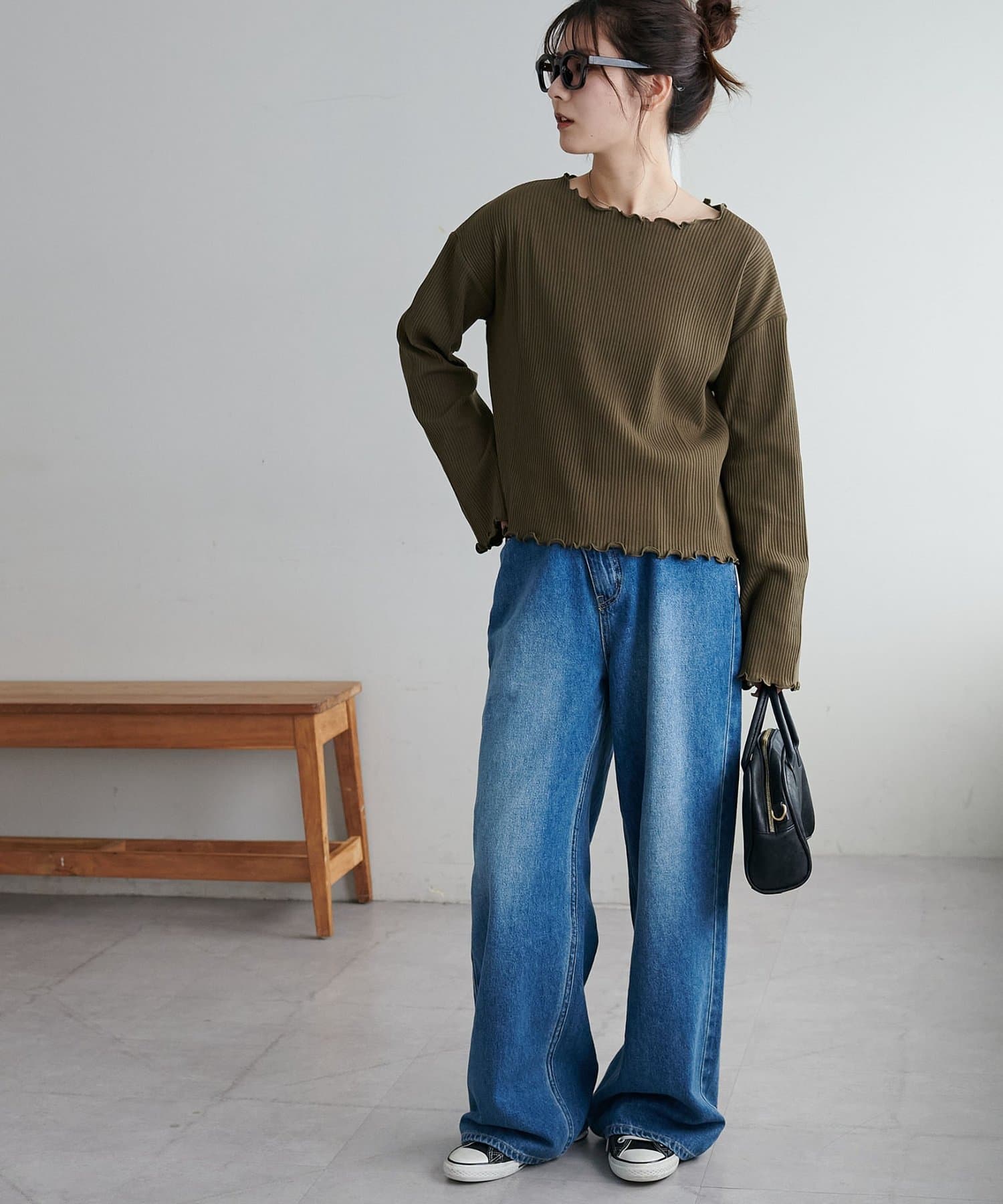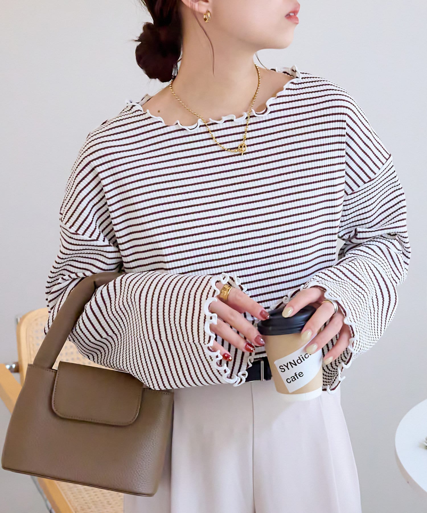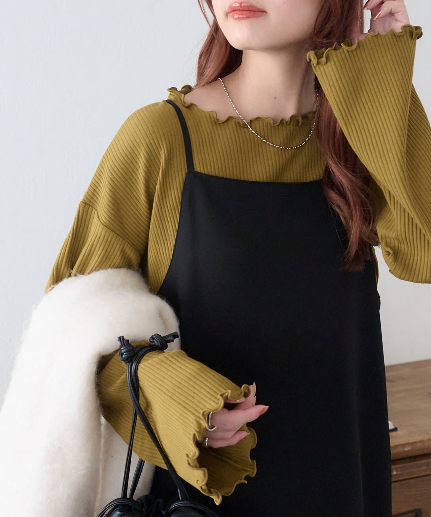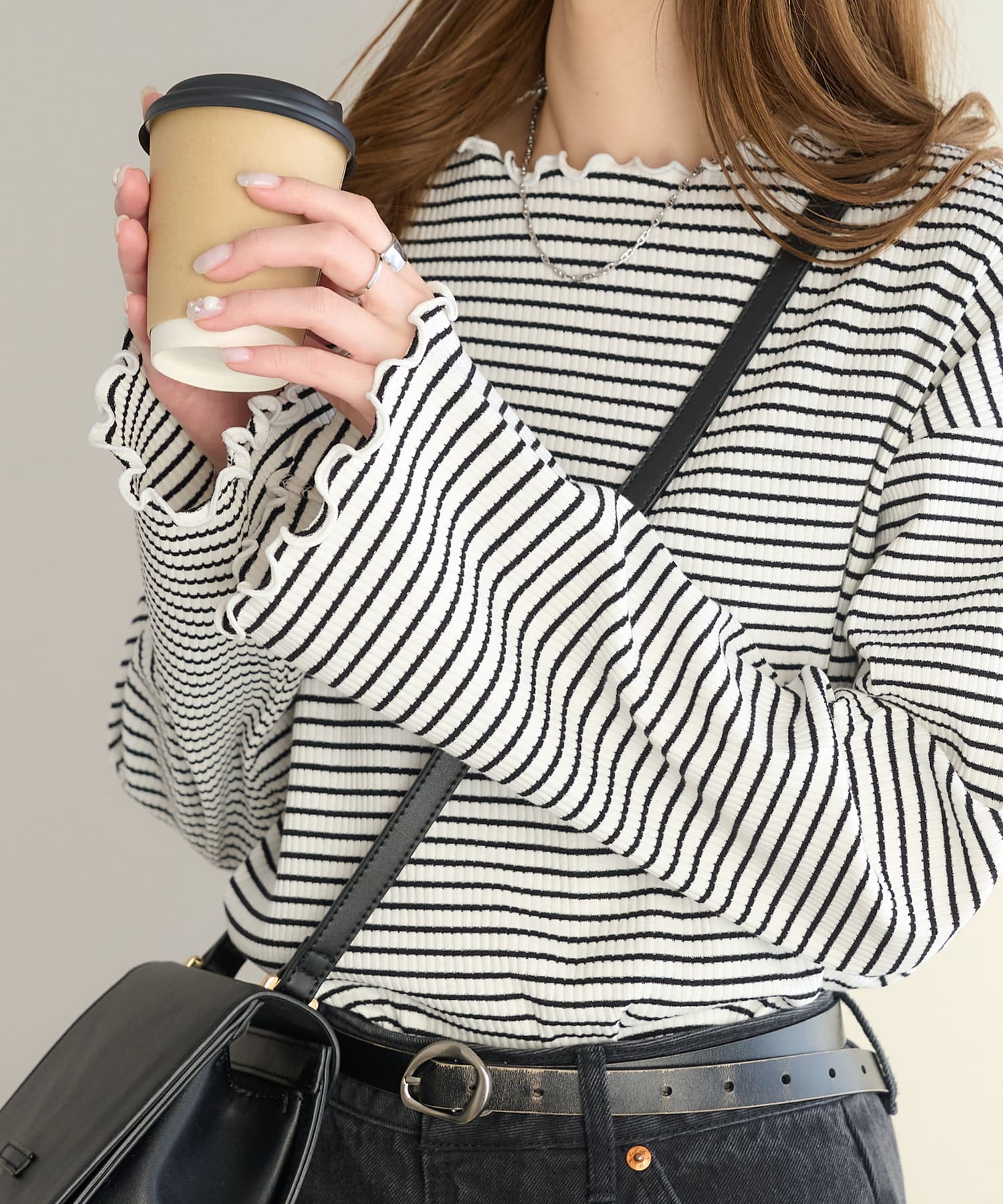 袖口、裾口、首元のメローデザインがポイントのリブトップス。