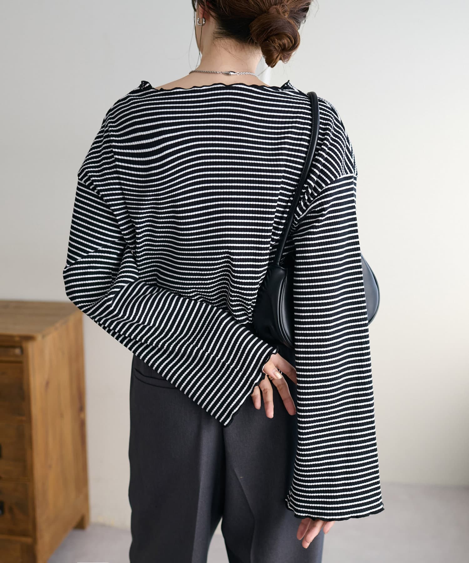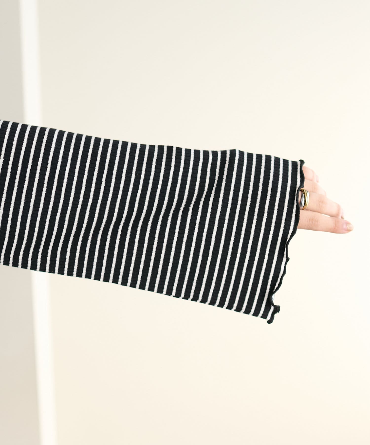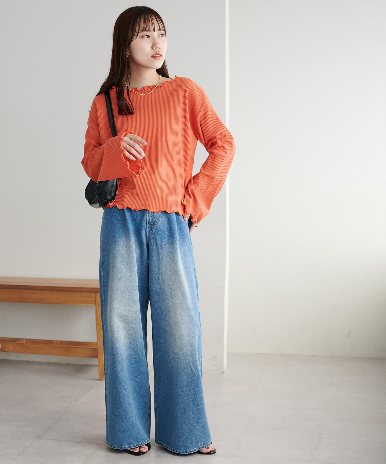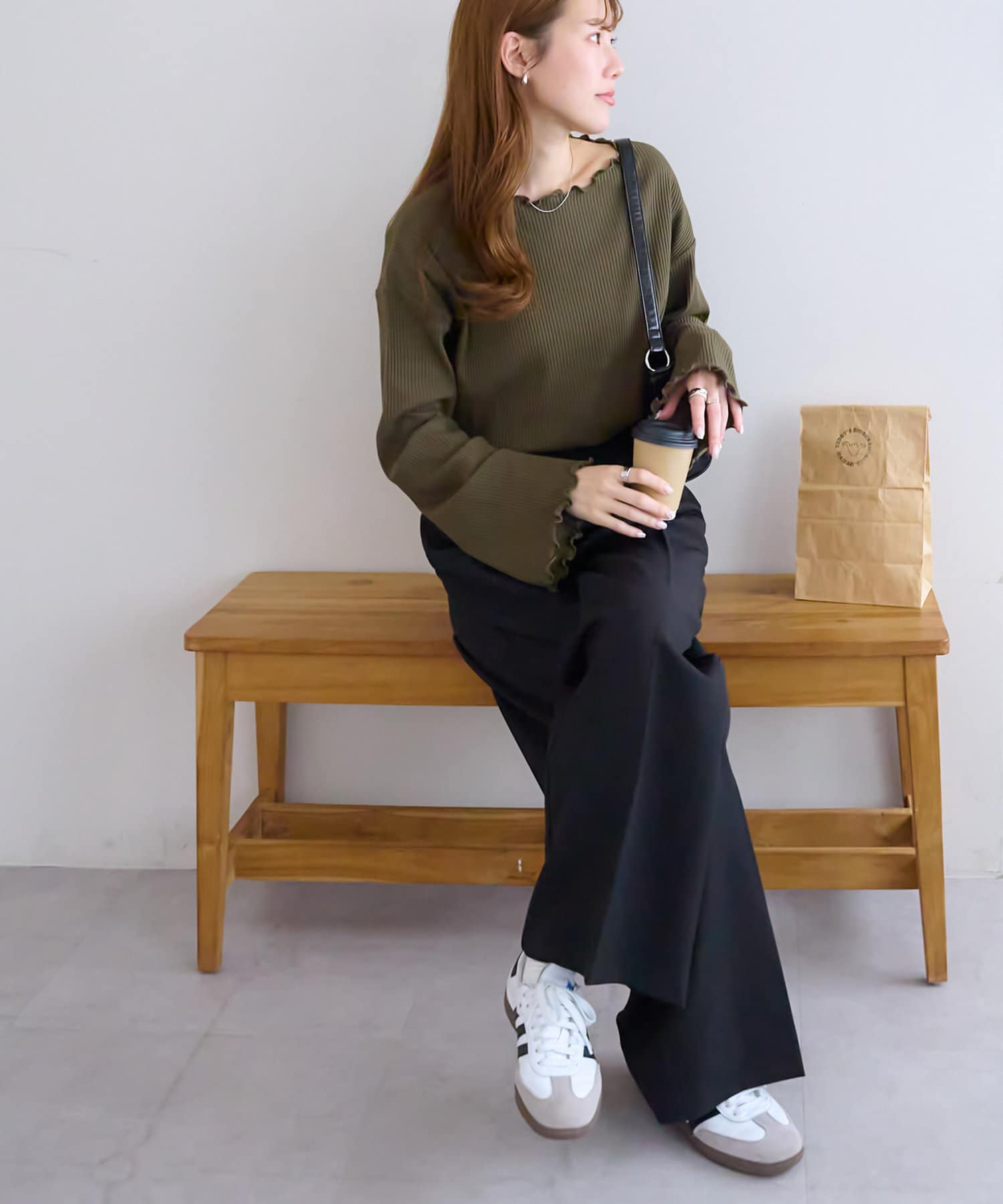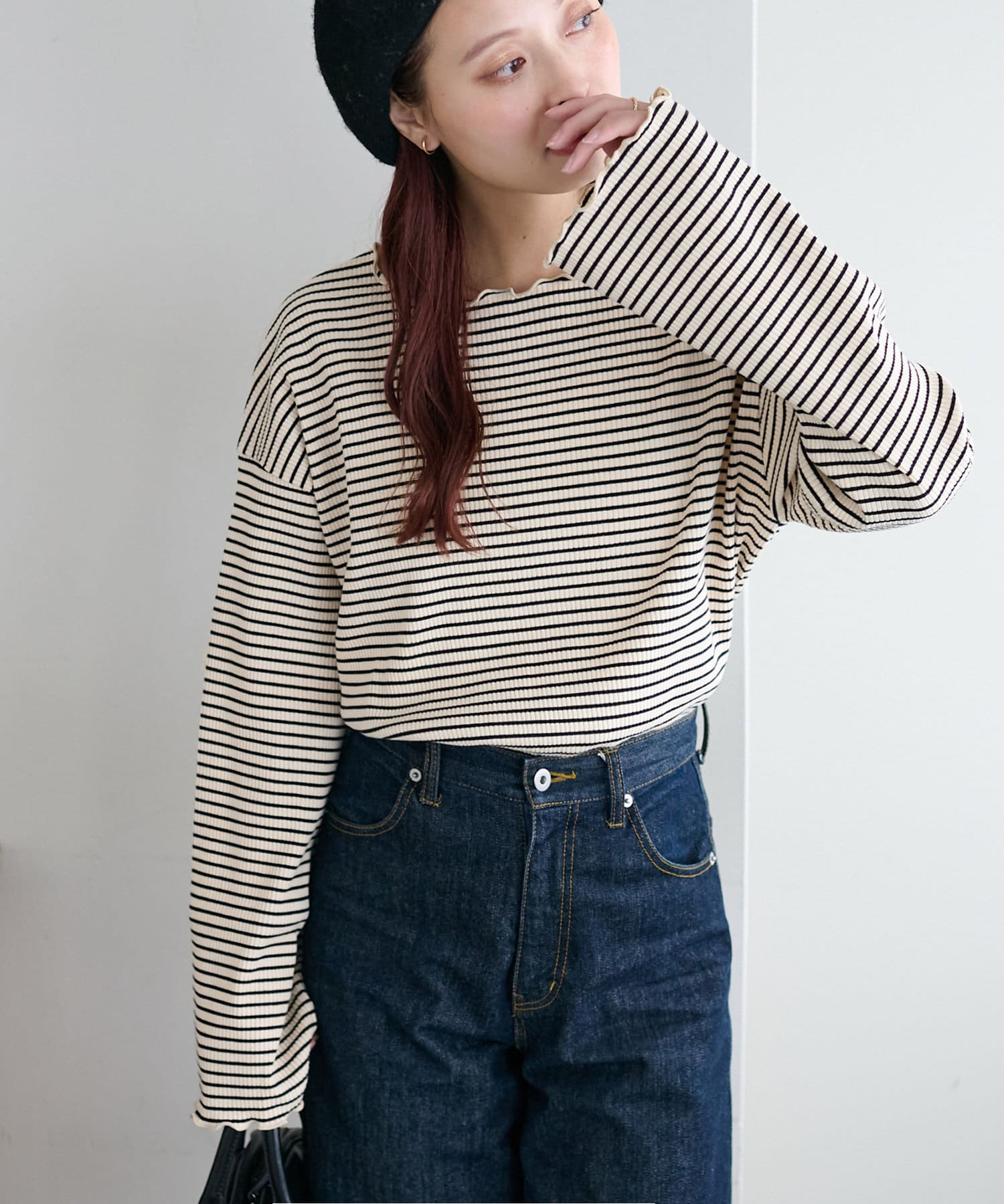 袖口、裾口、首元のメローデザインがポイントのリブトップス。