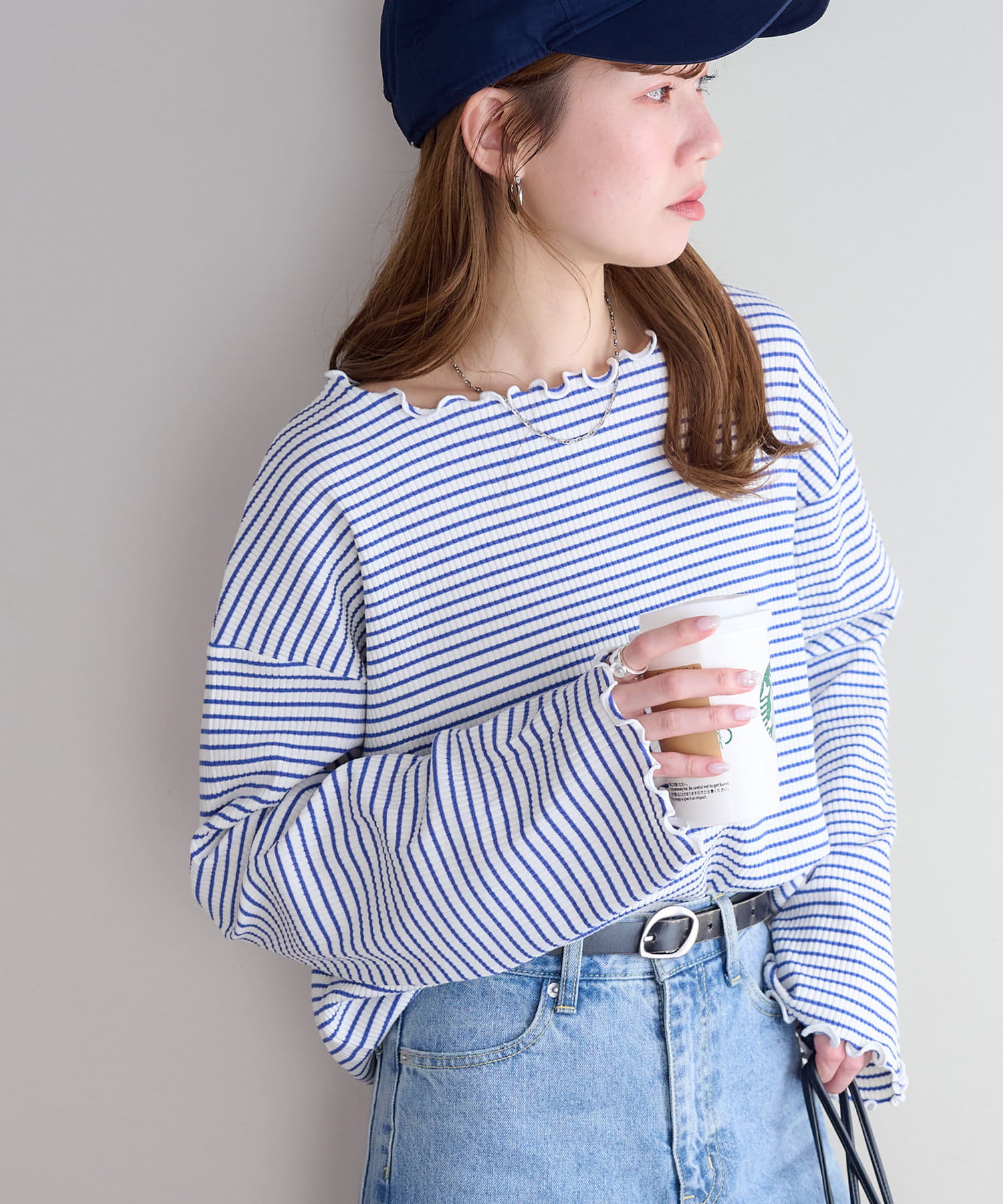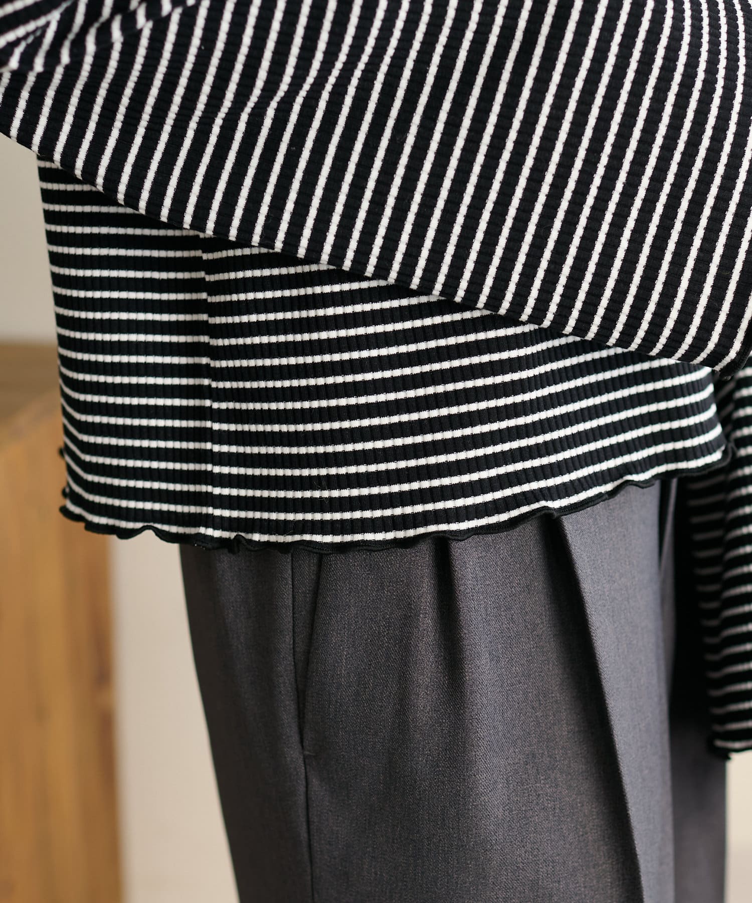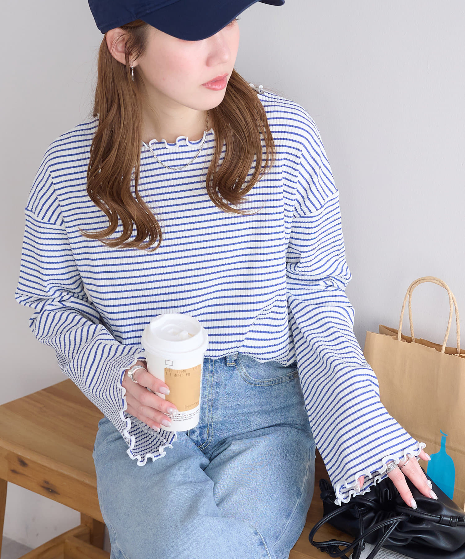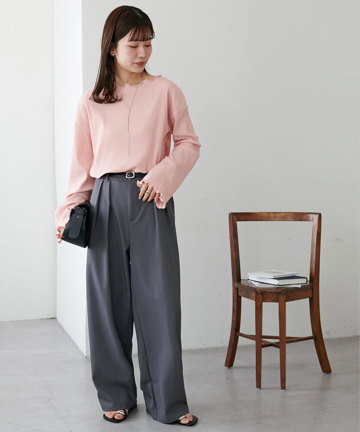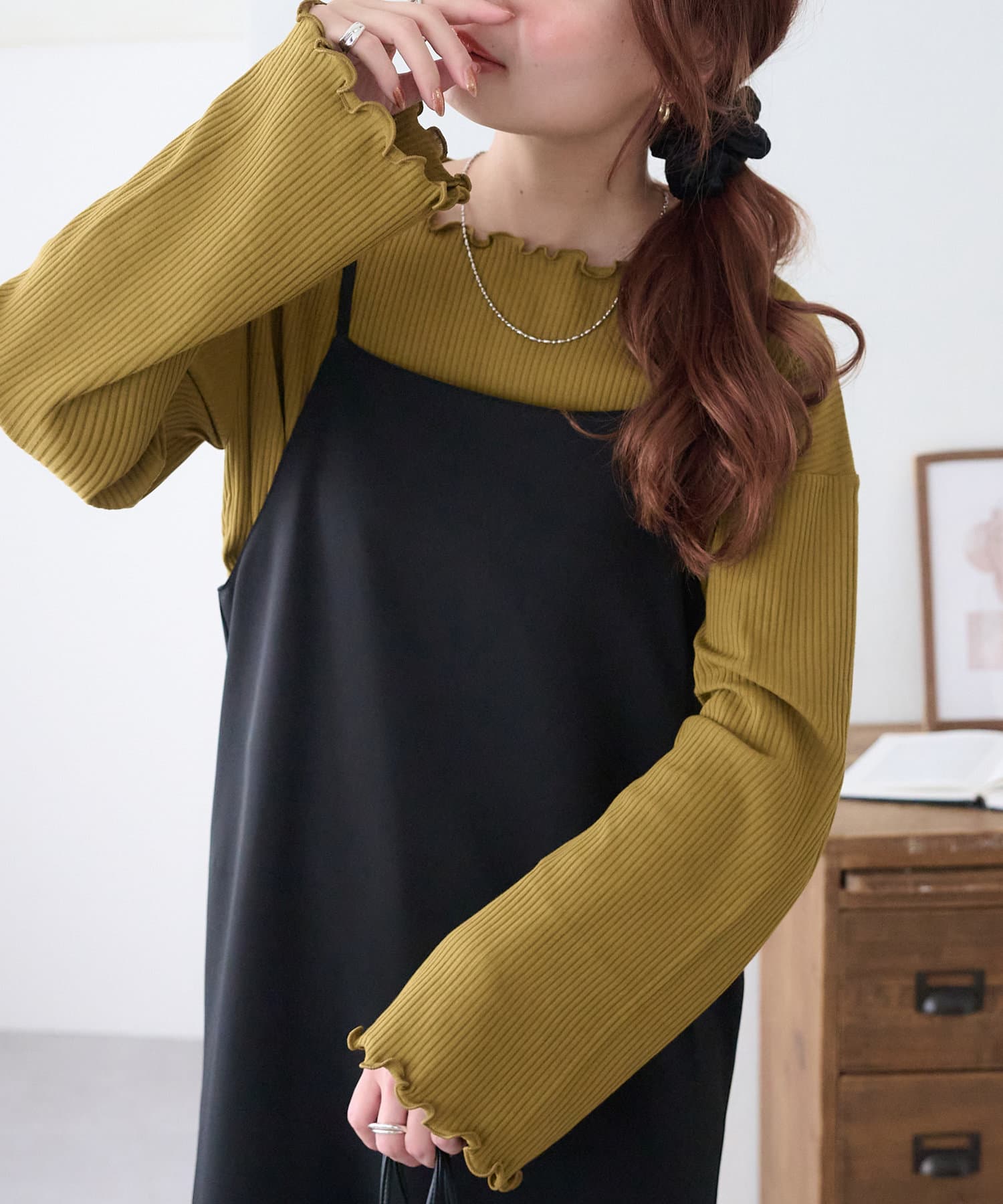 袖口、裾口、首元のメローデザインがポイントのリブトップス。