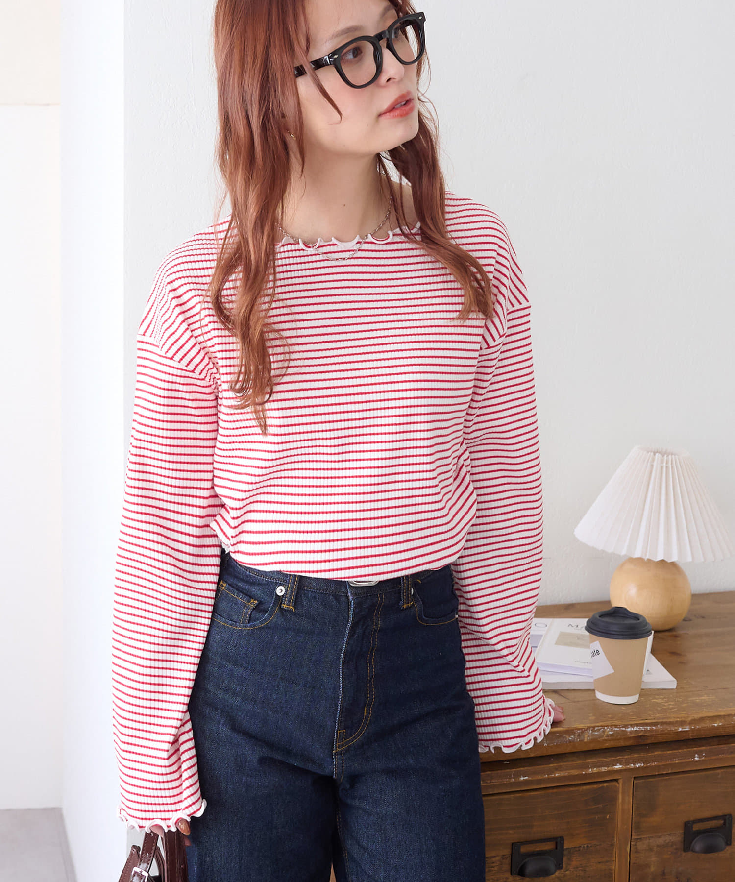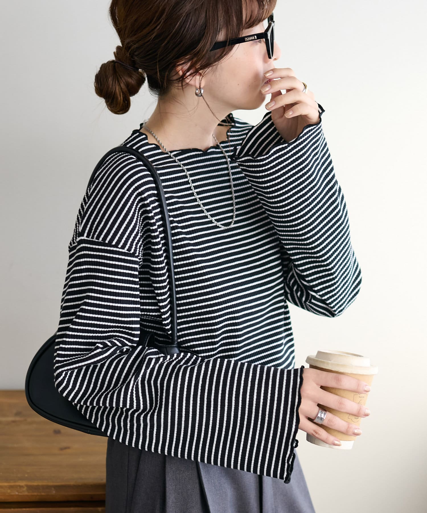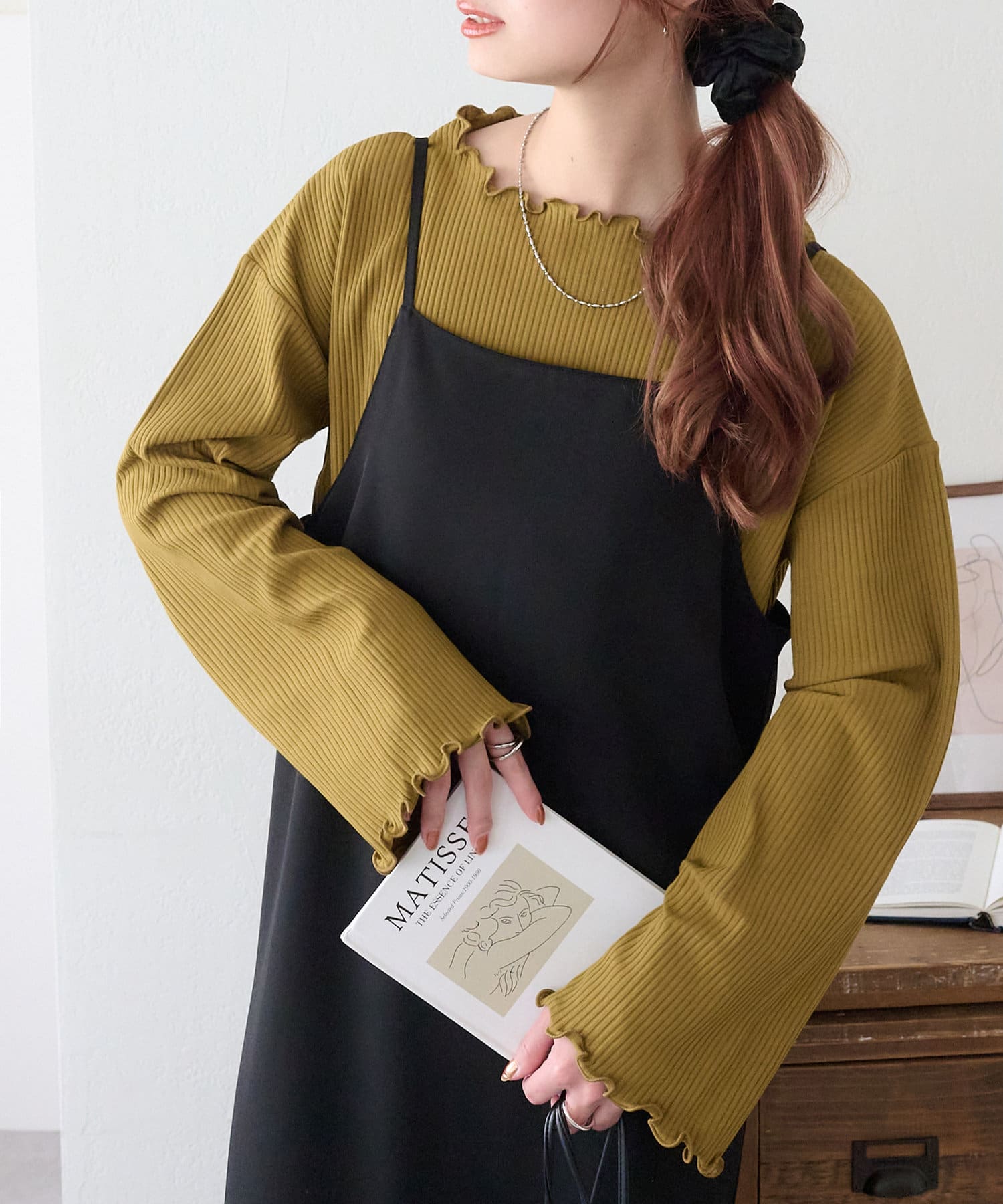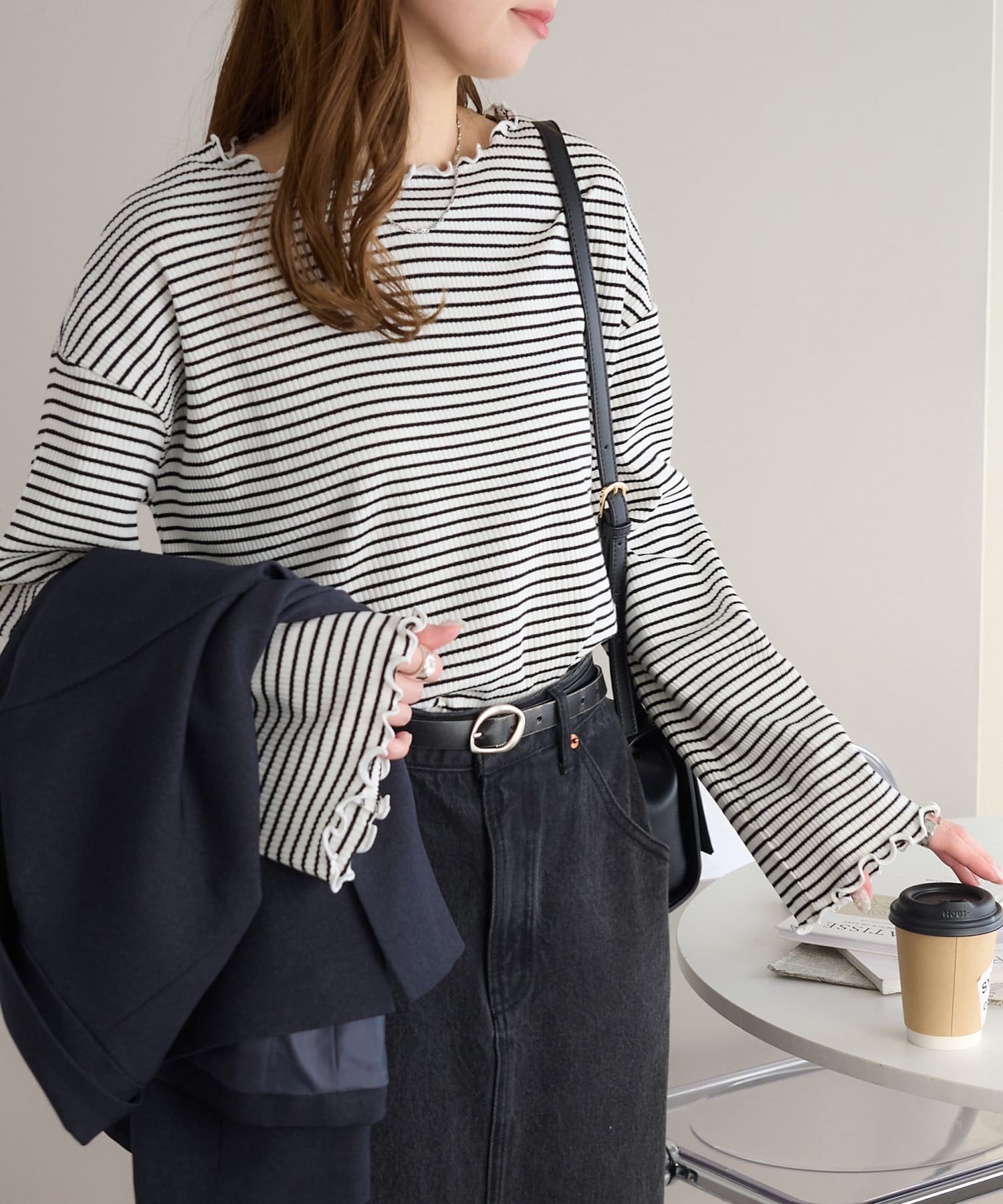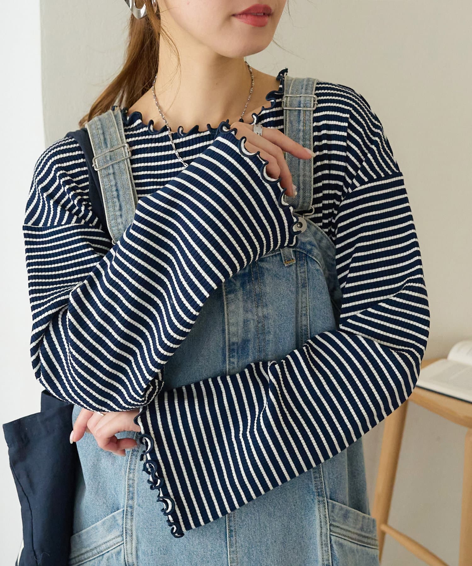 袖口、裾口、首元のメローデザインがポイントのリブトップス。