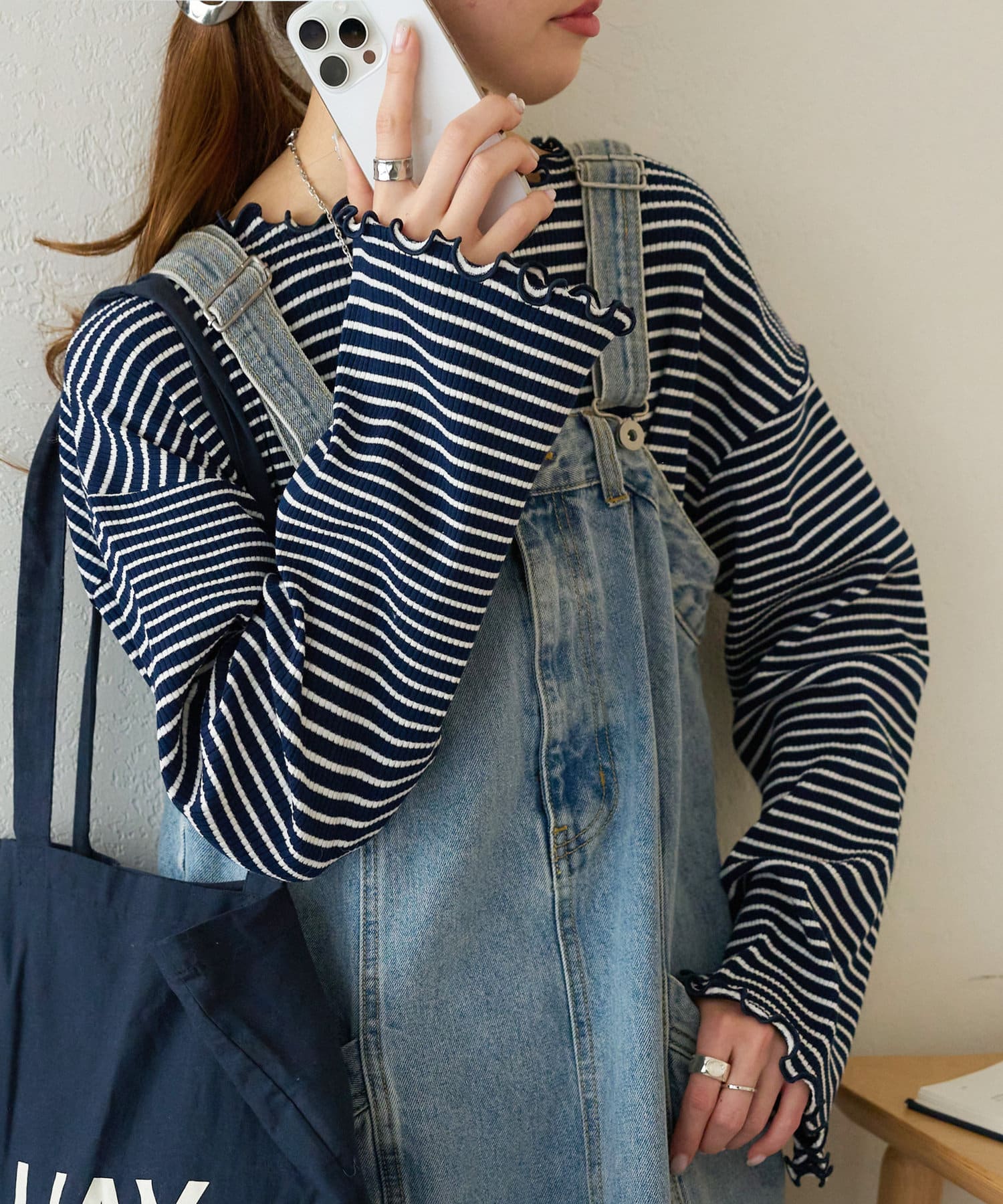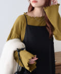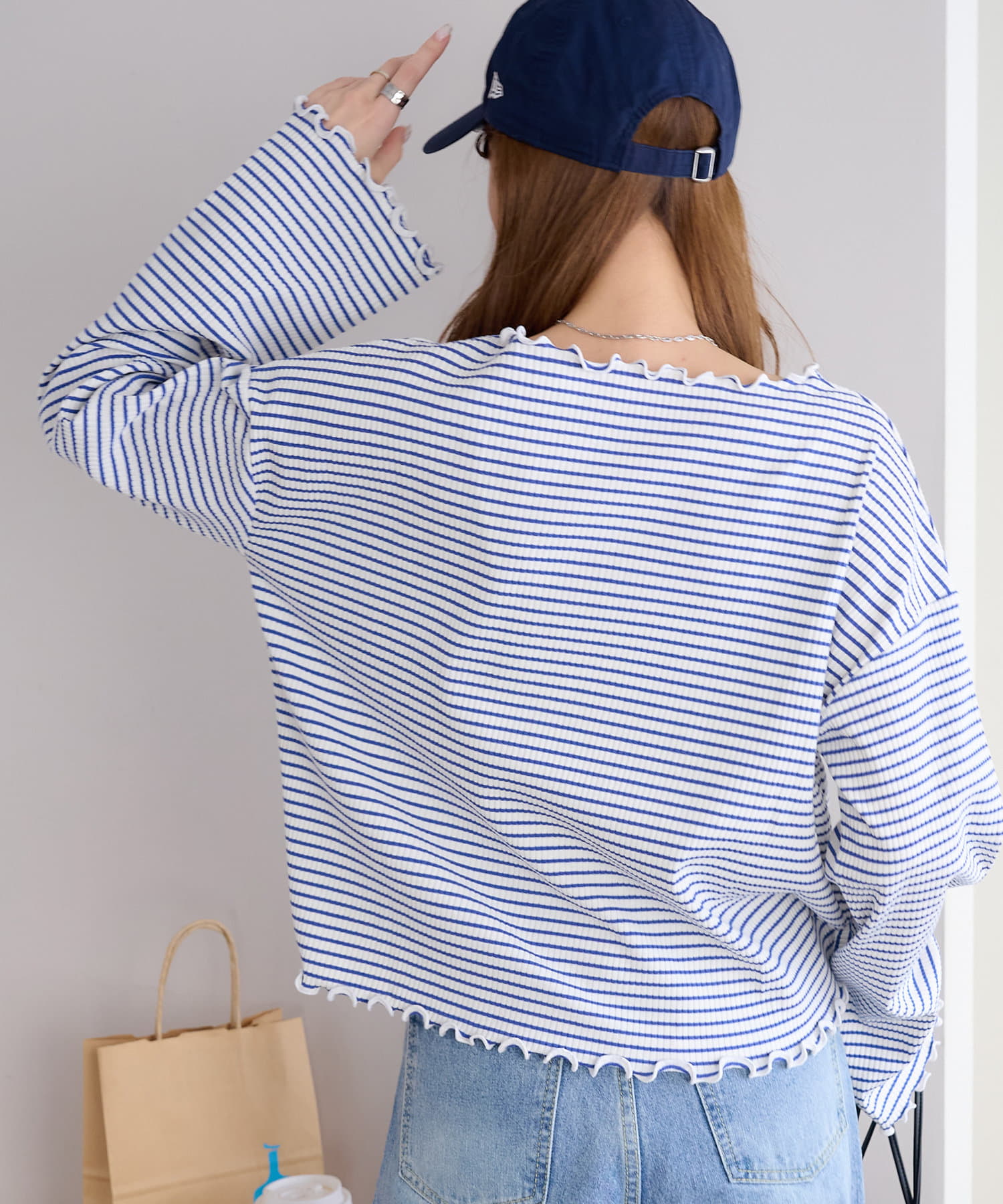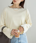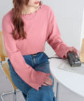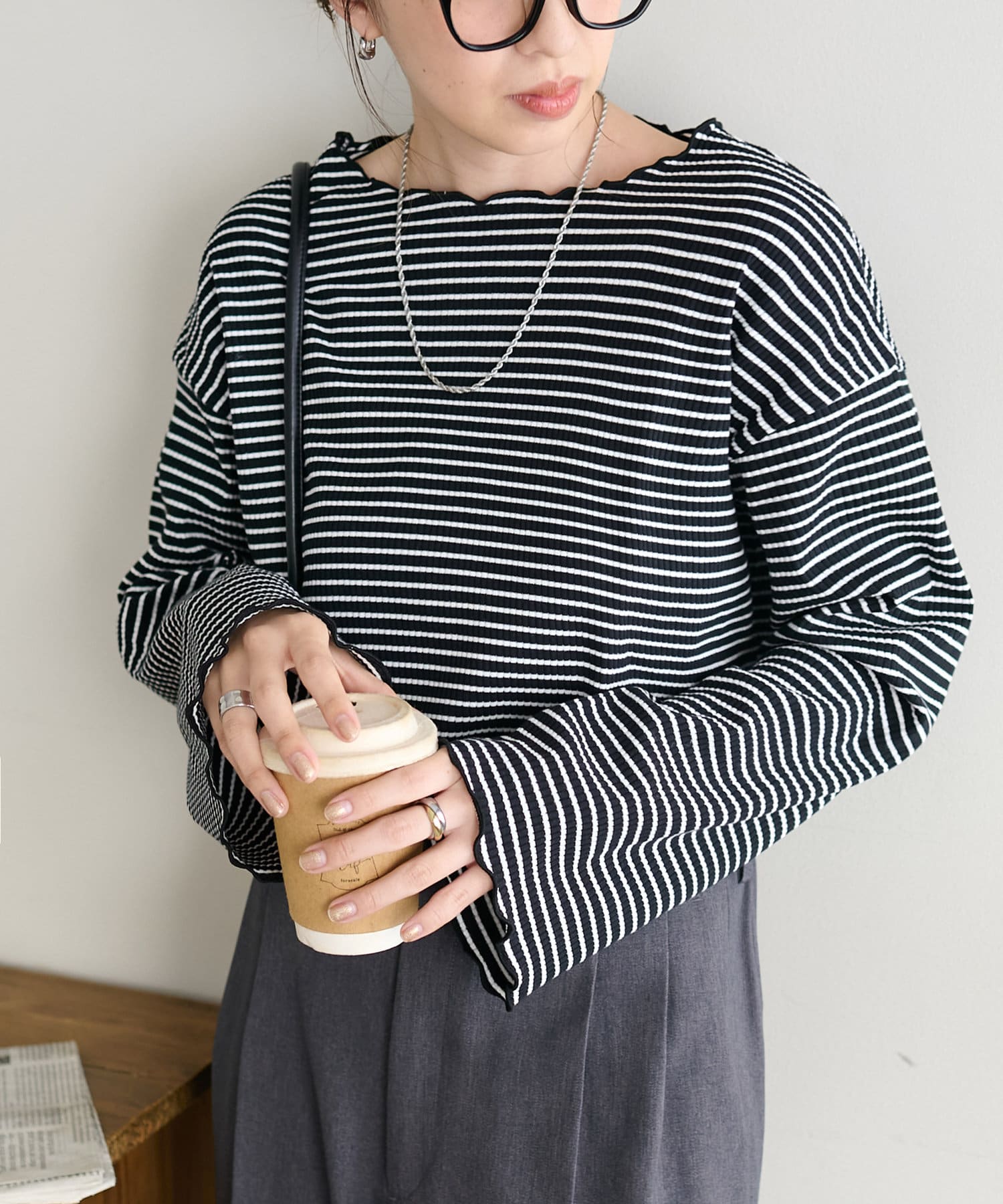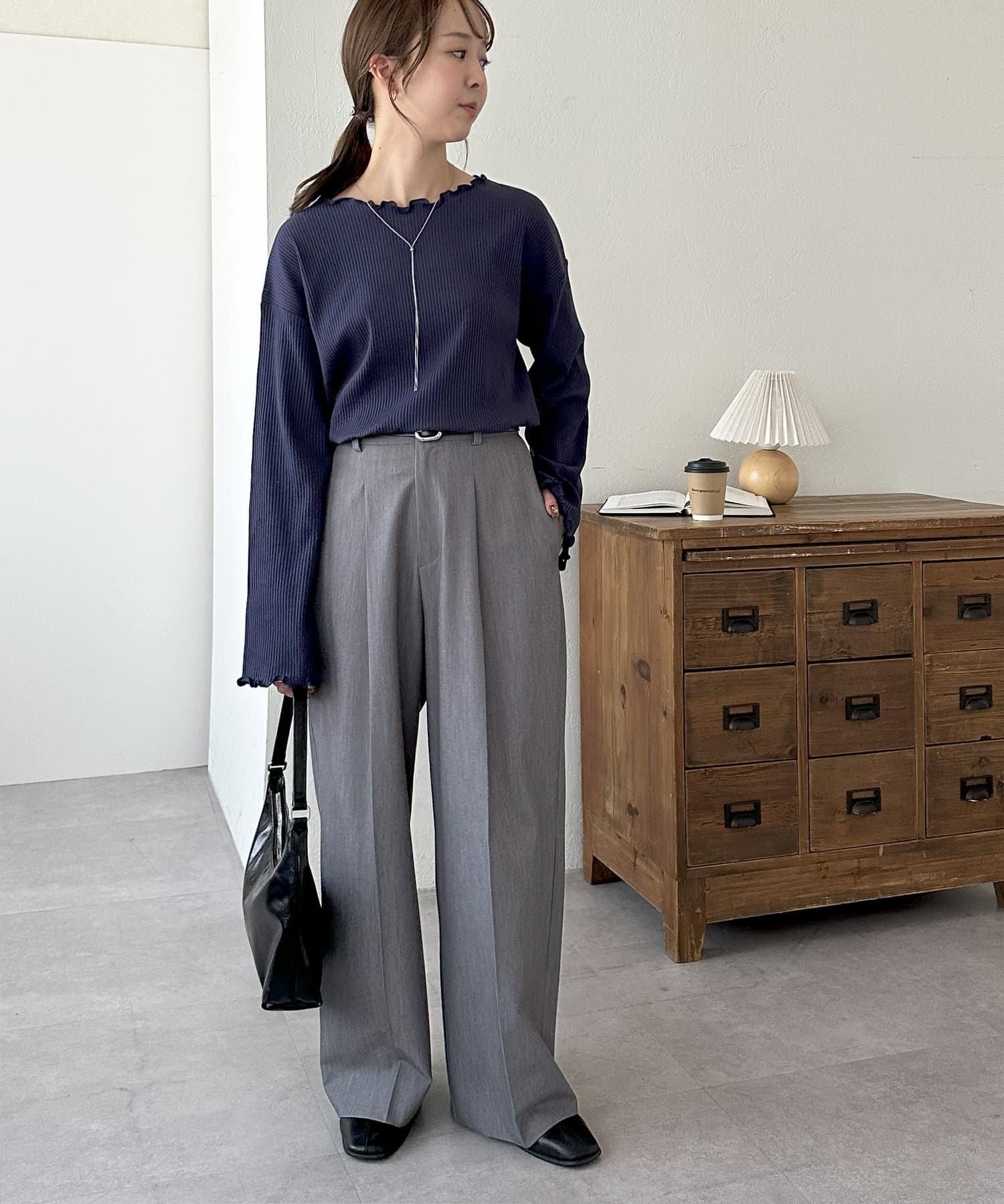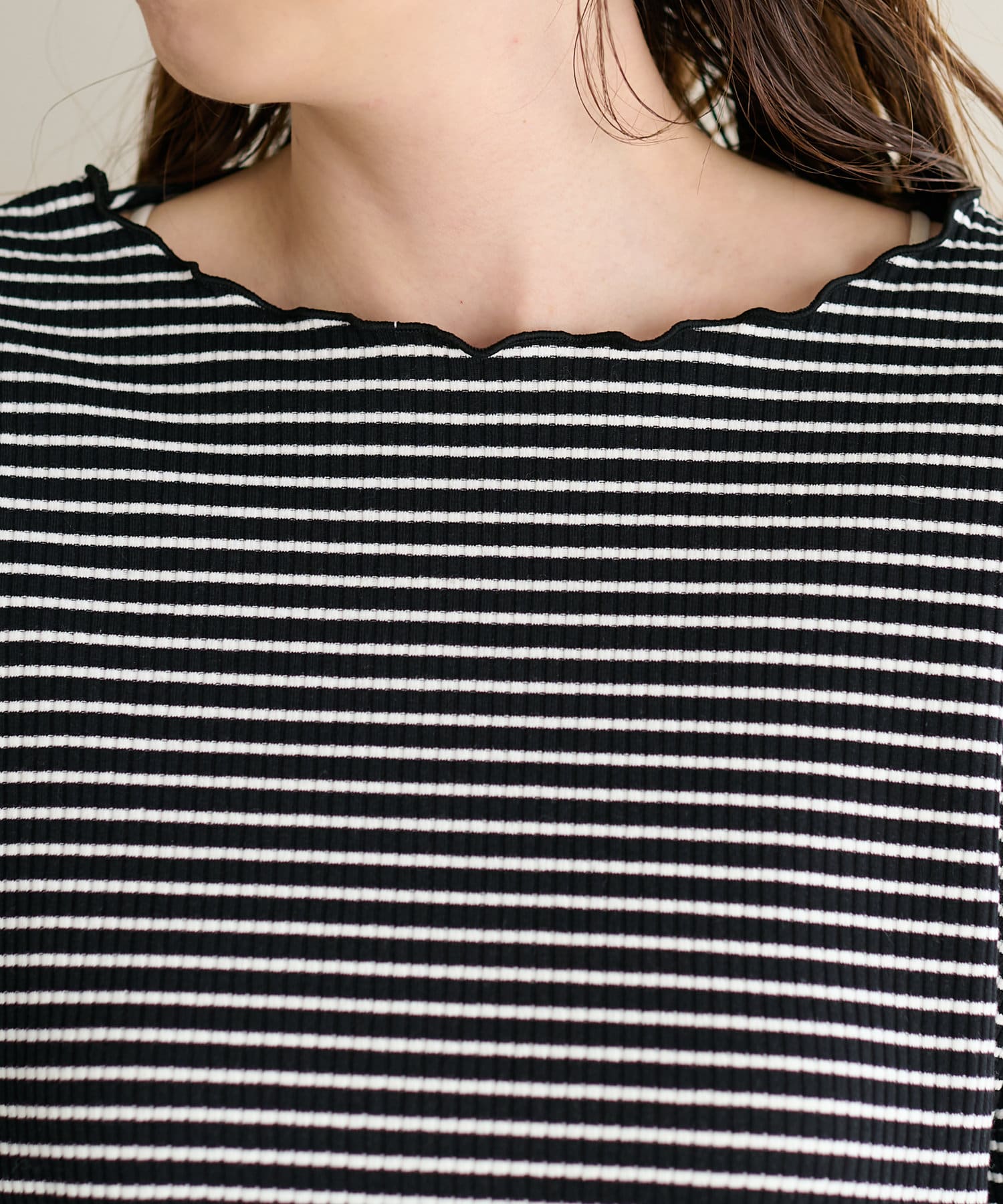 袖口、裾口、首元のメローデザインがポイントのリブトップス。