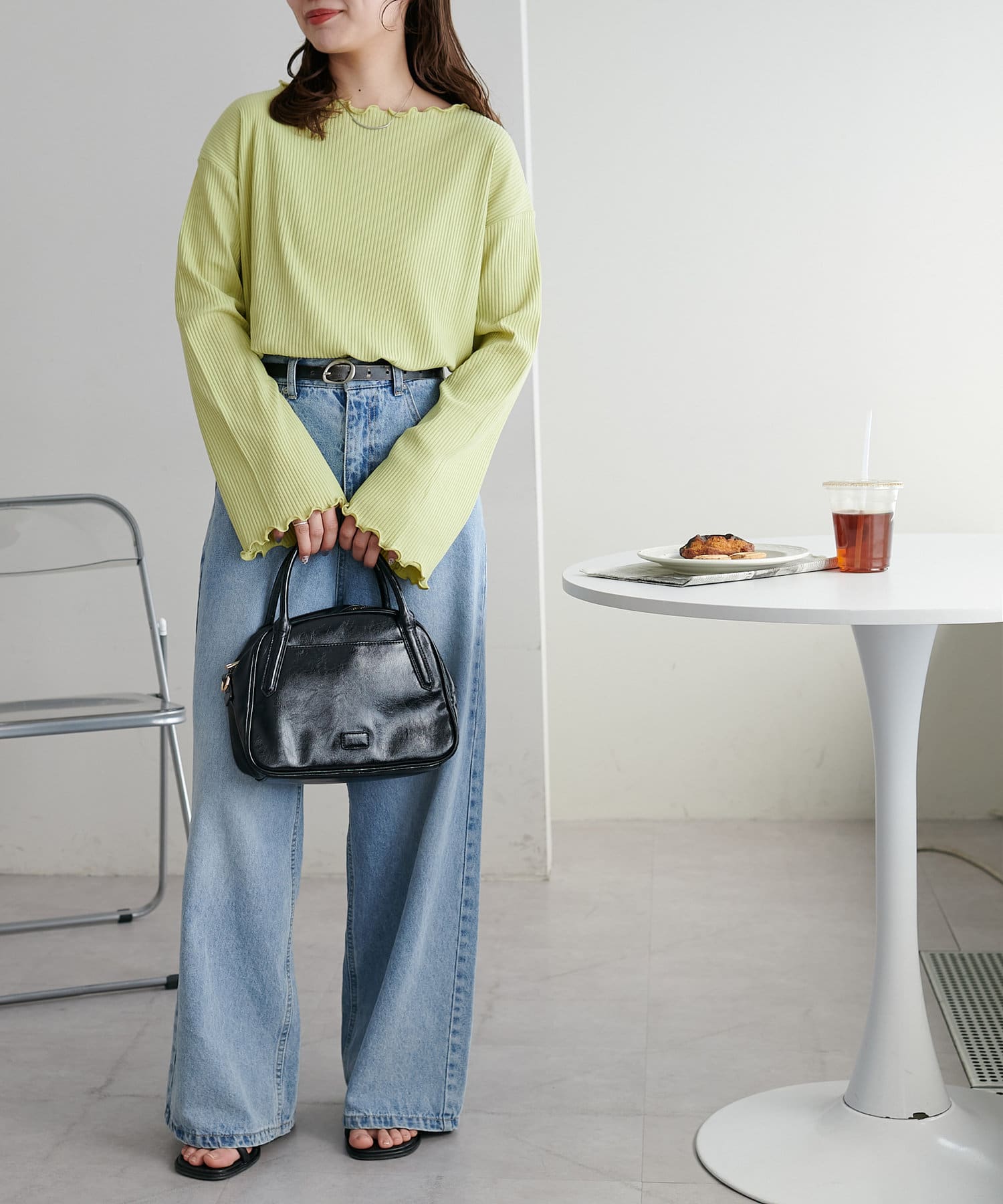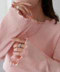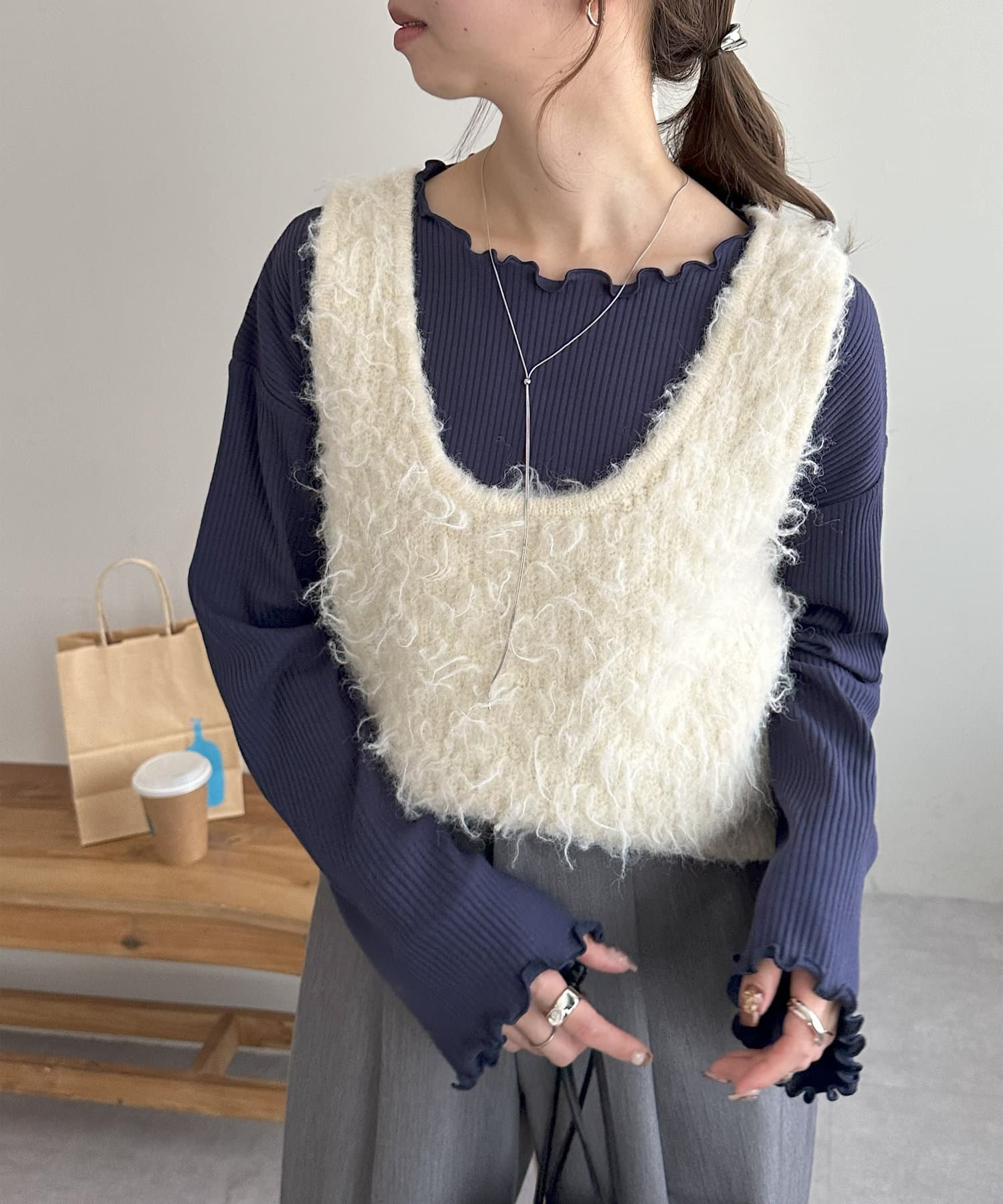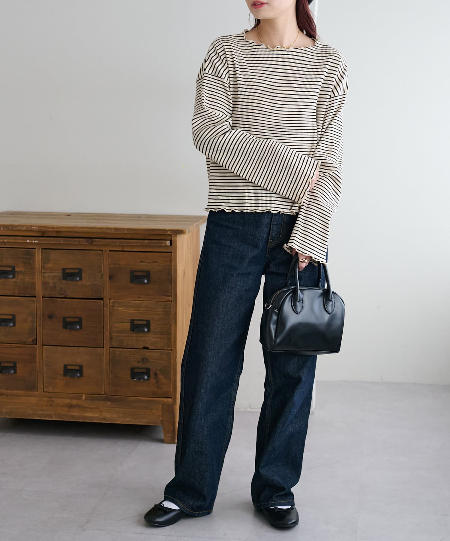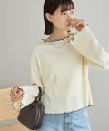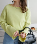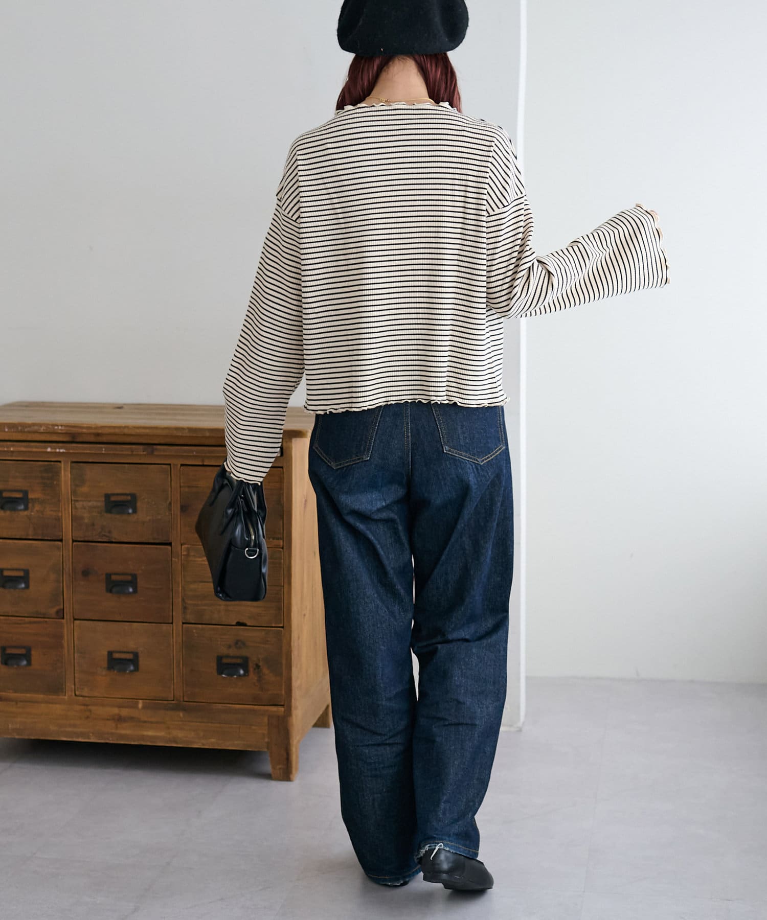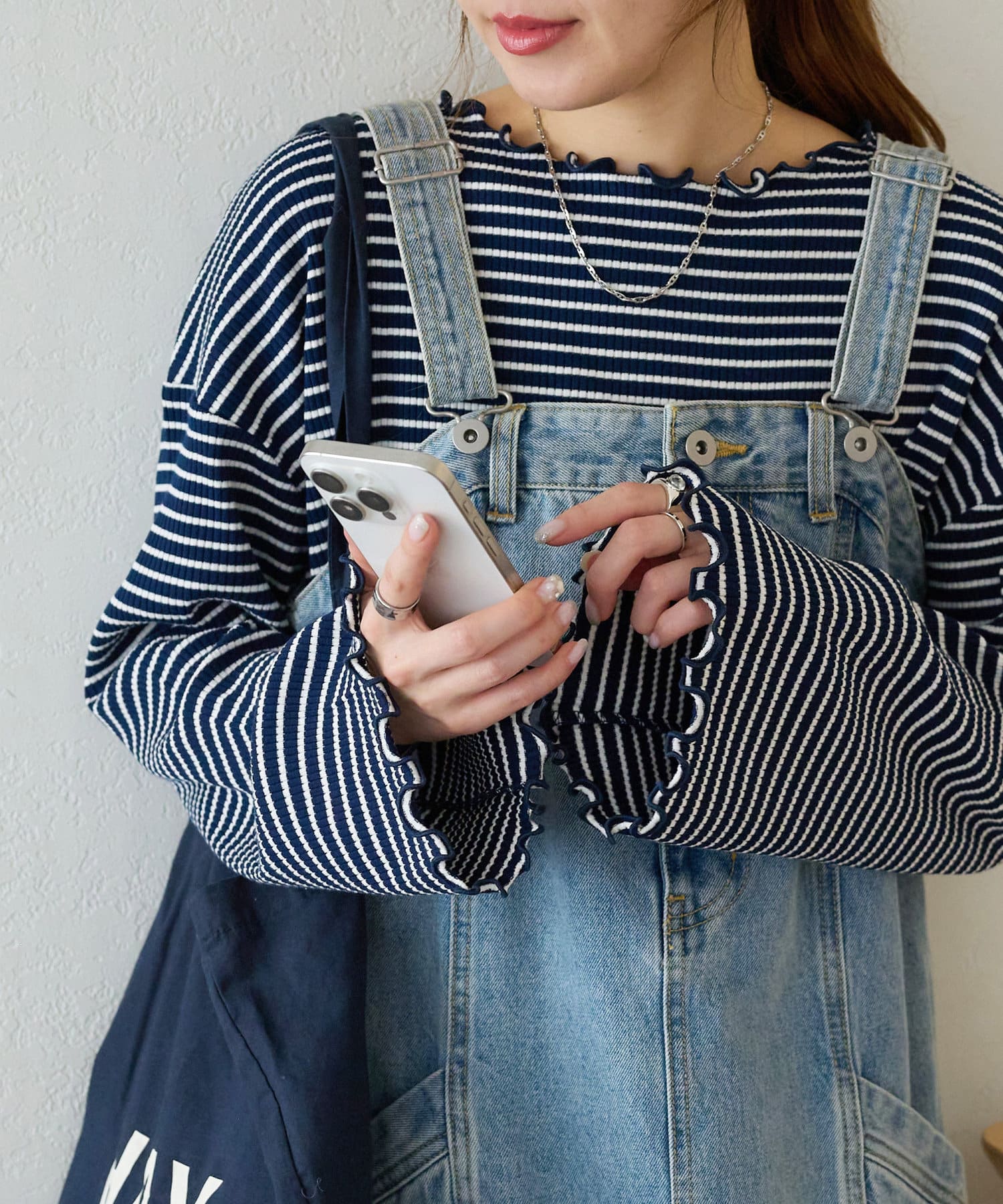 袖口、裾口、首元のメローデザインがポイントのリブトップス。