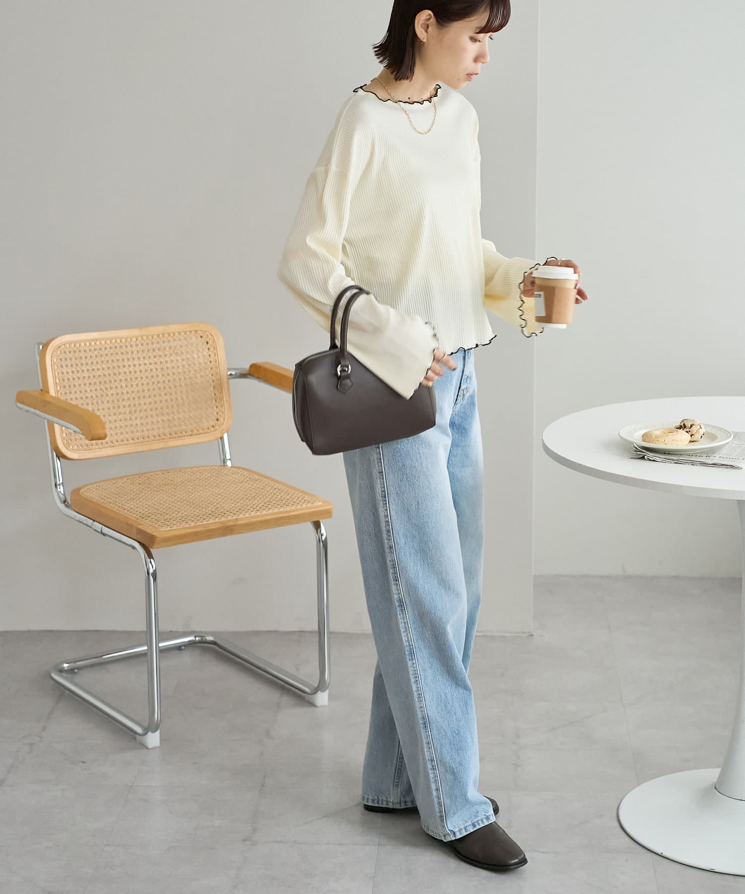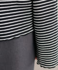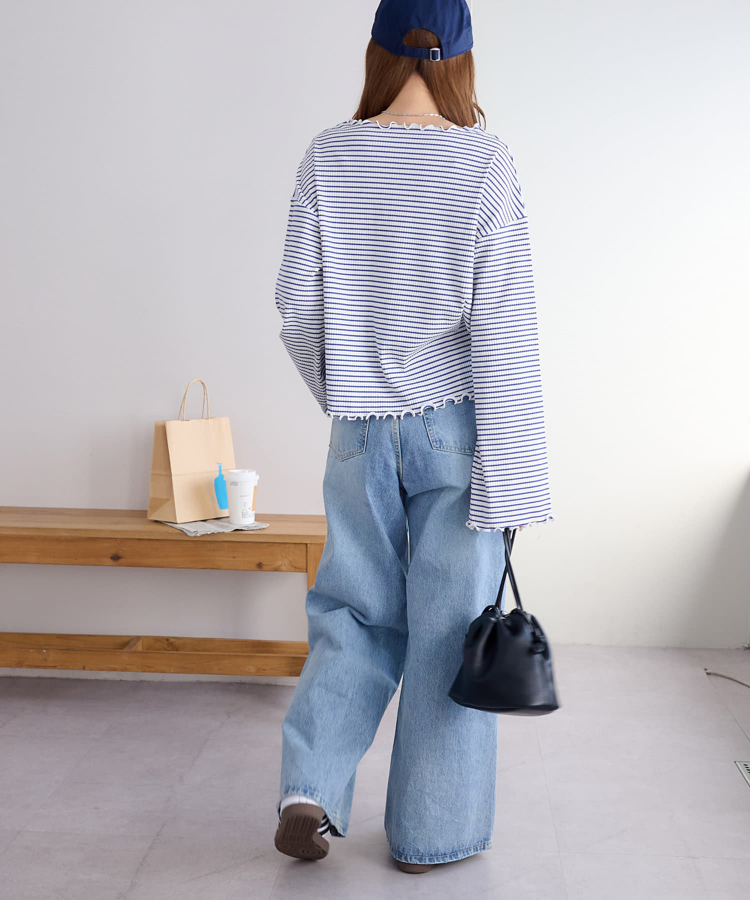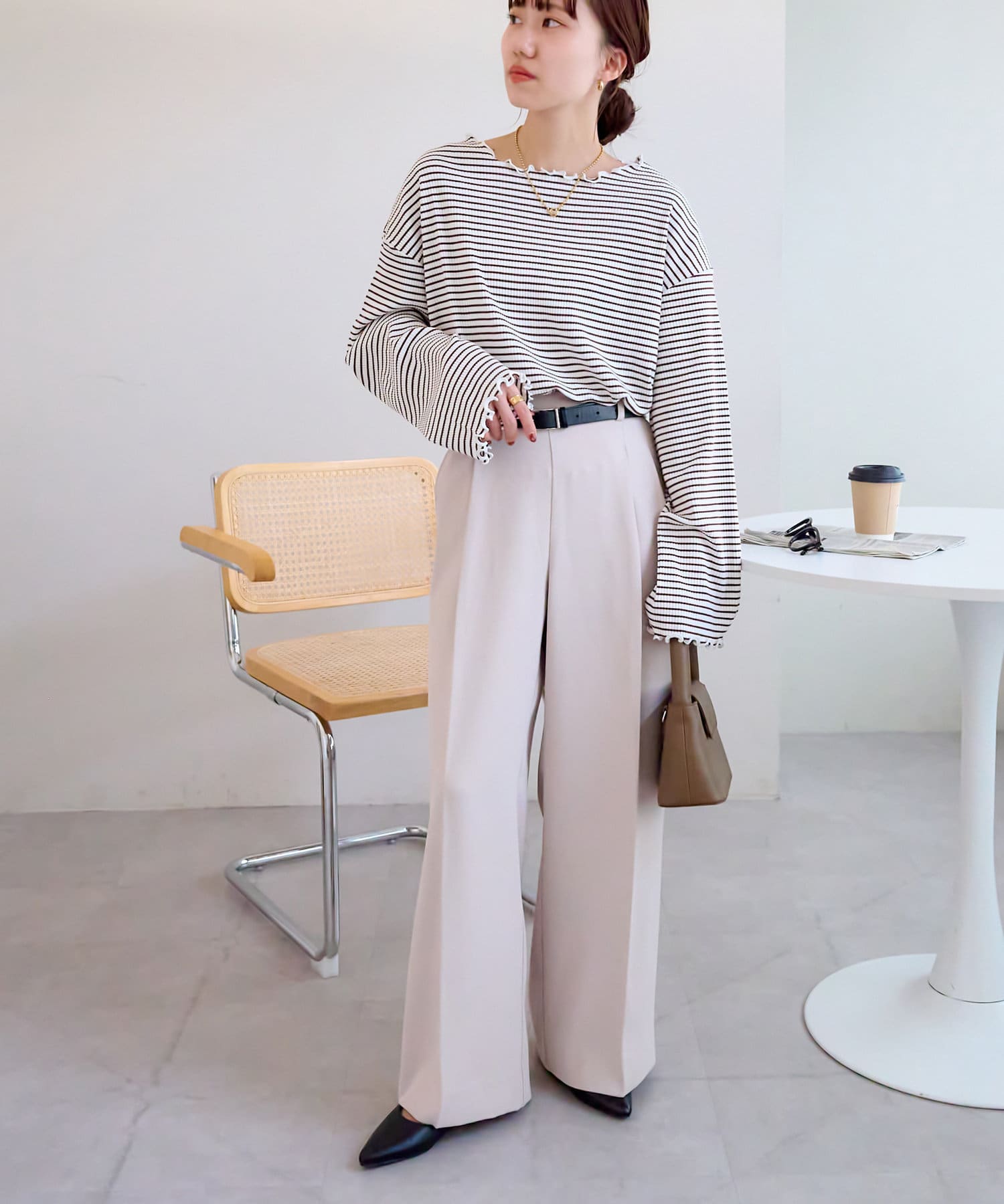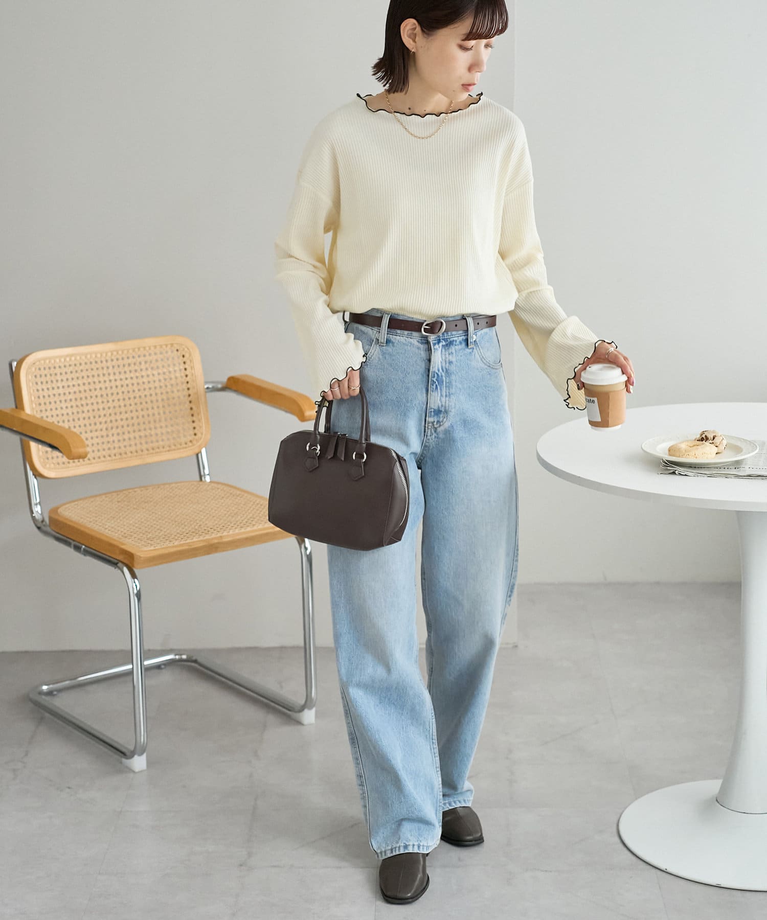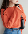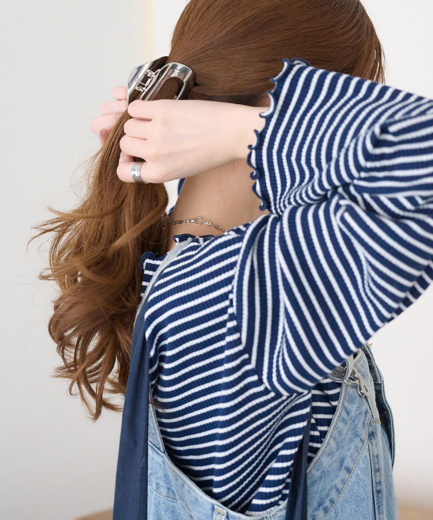 袖口、裾口、首元のメローデザインがポイントのリブトップス。