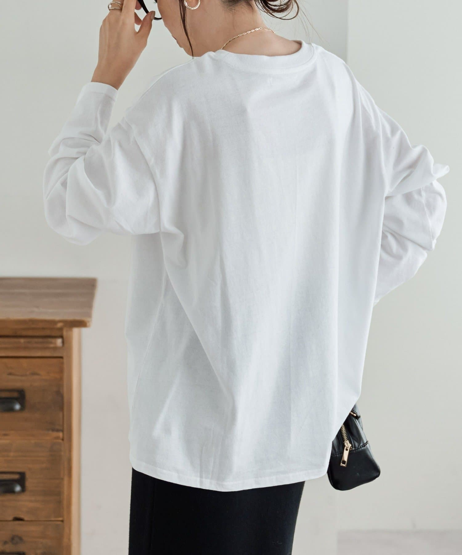 155cmスタッフ(Mサイズ着用):程よくゆとりのあるサイズ感で、ラフに着られます。お尻が少し隠れるくらいの丈感で、パンツにもスカートにも合わせやすい◎